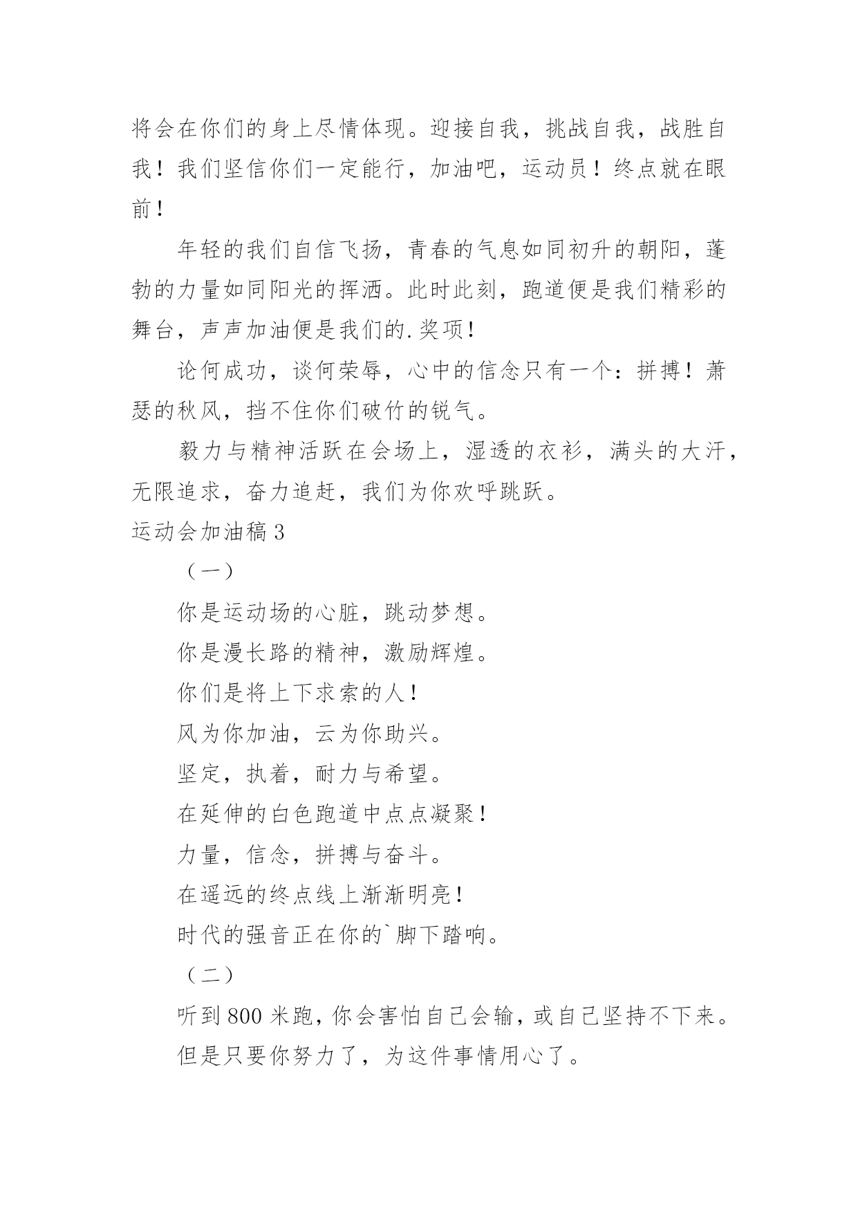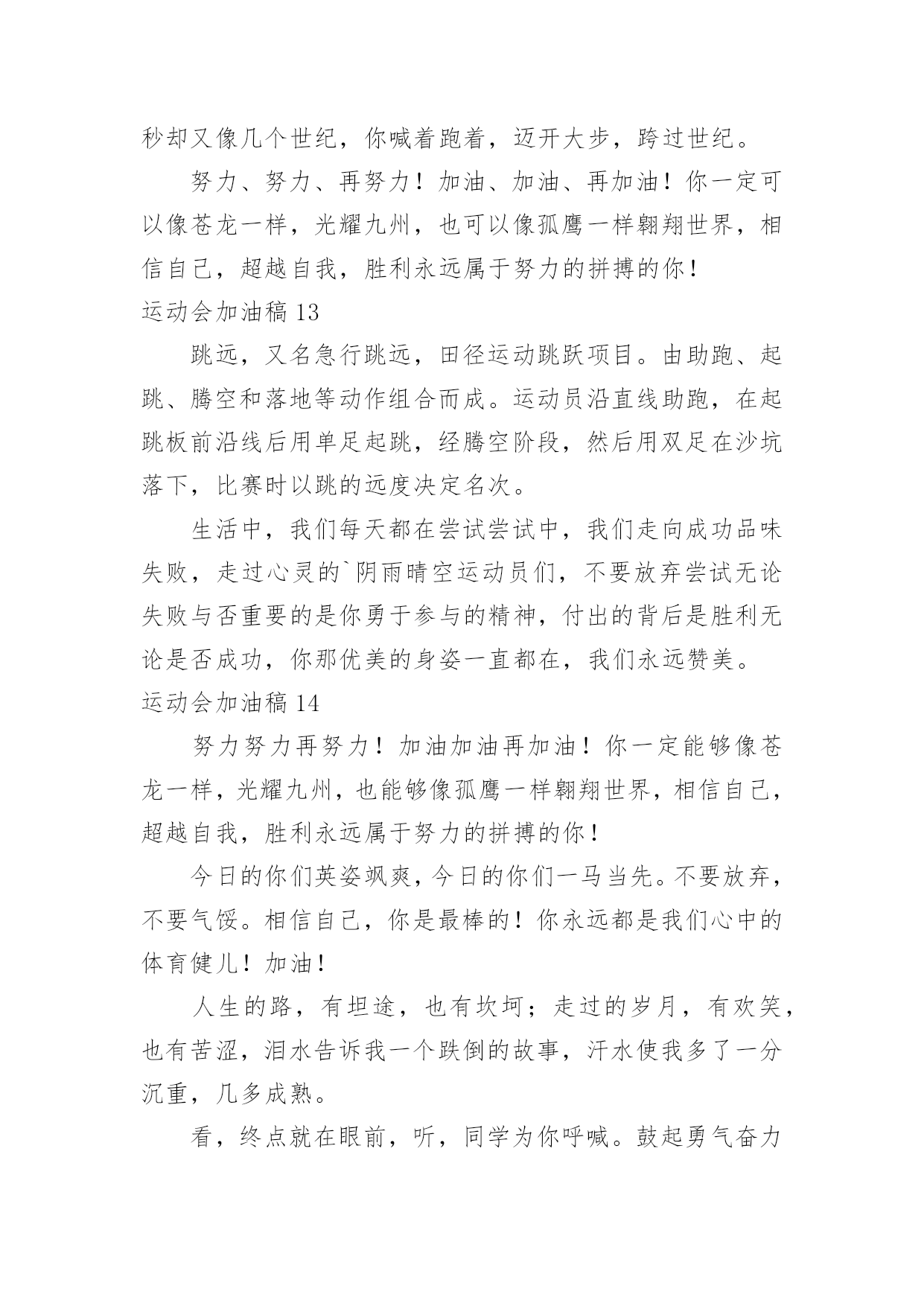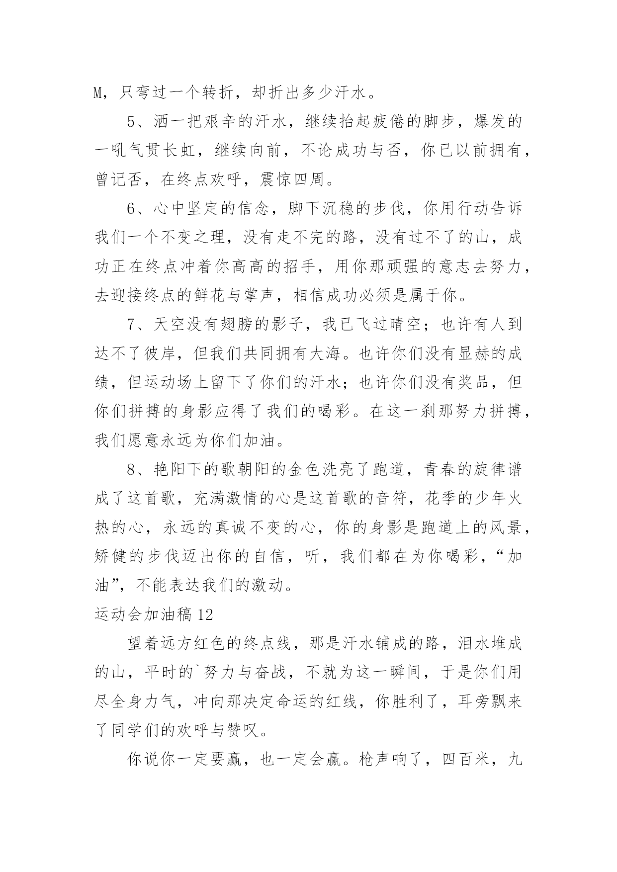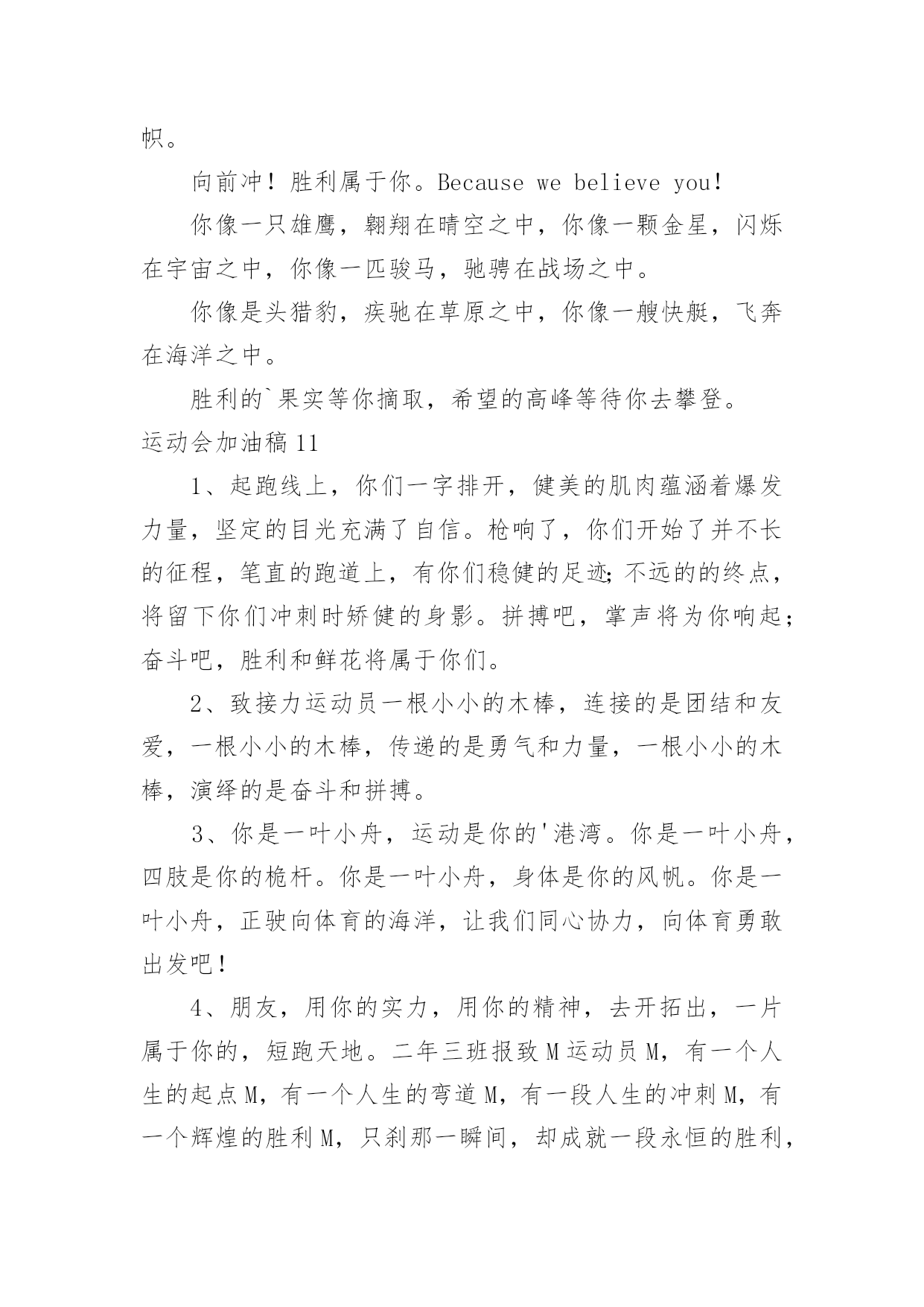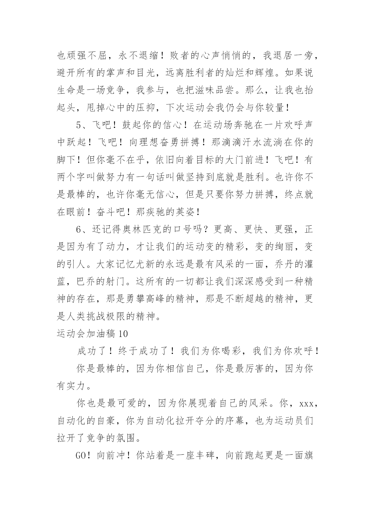 运动会加油稿运动会加油稿在社会发展不断提速的今天,越来越多人会去使用加油稿,加油稿可以增添对方必胜的勇气和信心。为了让您在写加油稿时更加简单方便,下面是小编为大家整理的运动会加油稿,仅供参考,希望能够帮助到大家。运动会加油稿1漫漫征途,加油吧!运动健儿们。不要畏惧对手的'强大,你的对手只有你自己。1000米算不得什么,付出的泪水就要得到回报。看,秋风在为你喝彩,和煦的阳光在为你加油。冲吧,运动健儿们。你所有的朋友在为你呐喊。运动会加油稿2大海如此的浩淼,鼓声多么美妙,运动员们,你们不再像平时那样渺小,我们默默的祈祷,以你们为骄傲,我们会永远为你们叫好。青春的脚步,青春的速度,青春的活力,青春的激情,将会在你们的身上尽情体现。迎接自我,挑战自我,战胜自我!我们坚信你们一定能行,加油吧,运动员!终点就在眼前!年轻的我们自信飞扬,青春的气息如同初升的朝阳,蓬勃的力量如同阳光的挥洒。此时此刻,跑道便是我们精彩的舞台,声声加油便是我们的.奖项!论何成功,谈何荣辱,心中的信念只有一个:拼搏!萧瑟的秋风,挡不住你们破竹的锐气。毅力与精神活跃在会场上,湿透的衣衫,满头的大汗,无限追求,奋力追赶,我们为你欢呼跳跃。运动会加油稿3(一)你是运动场的心脏,跳动梦想。你是漫长路的精神,激励辉煌。你们是将上下求索的人!风为你加油,云为你助兴。坚定,执着,耐力与希望。在延伸的白色跑道中点点凝聚!力量,信念,拼搏与奋斗。在遥远的终点线上渐渐明亮!时代的强音正在你的`脚下踏响。(二)听到800米跑,你会害怕自己会输,或自己坚持不下来。但是只要你努力了,为这件事情用心了。就算不是第一,就算你坚持不下来。但你赢得了自己,赢得了第一名。(三)你和红色的地面有个约定,那上面,总有你奔跑的身影。你与绿色的草坪有个约定,那上面,有着你辛劳的汗渍。你与我们有个约定,说你一定要赢,也一定会赢枪声响了。八百米,几秒,却又像几个世纪!迈开大步,跨过世纪!运动会加油稿4运动场上有你们的步伐,那是辛苦汗水的抒发,你就像天边的云端,有彩霞的绚丽色彩。奔驰的骏马,飞奔的步伐,让你的胜利在前方等待。为你们祝福,为你们喝彩!醒在梦的旁边,手指间,光线有些特别;我看得见,看见光在变,变成七彩的寓言,飞向梦的.起点。某一天,飞奔在跑道间;两腮间,汗水不断流出;我感觉到,感觉你在变,变成生活的强者,奔向成功的边缘!虽然,天阴沉沉的,虽然,有些隐隐的寒意。但是,每个人都昂首向前,每个人都精神焕发,每个人都向着终点向着胜利冲去!运动会加油稿5给予的越多,收获的越多,奋斗的.越多,收获的越多。坚定的信念,收获闪光的金牌。成功属于谁,人生的路,有坦途,也有坎坷。走过的岁月,有欢笑,也有苦涩,泪水告诉我一个跌倒的故事,汗水使我多了一分沉重,几多成熟。理想毕竟不同于现实,失败是生活的一部分,谁也无法选择,无法拒绝。人生要自己去拼搏,去奋斗,在风雨中百折不挠,勇往直前,在每个驿站上都留下一段不悔的回忆。流泪不是失落,徘徊不是迷惑,成功属于那些战胜失败,坚持不懈、勇于追求梦想的人。运动会加油稿6你和红色的地面有个约定,那上方,总有你奔跑的身影;你与绿色的草坪有个约定,那上方,浸着你辛劳的汗渍。你与我们有个约定,说你必须要赢,也必须会赢。你喊着跑着,迈开大步,跨过世纪。我们相信你——某某某。你是否感到,烈日的'照射,那是烈日对你的祝福;你是否感到,彩旗的摇摆,那是彩旗对你的呐喊;你是否感到人们的注视,那是人们对你的希望,祝福在你身边,呐喊在你耳边,希望在你心中。xx的健儿,愿你们一展雄风,勇夺桂冠!枪声响起,轻轻的一抬脚,便牵动了全场的目光,潇洒的挥挥手,便满足了那一份无言的等待。迎着朝阳,你们踏歌而去,背着希望,我们等待你们的归来。阳光不会永远灿烂,没有一成不变的幸福,磨难或许是上苍赐予我们的礼物,用来考验我们的意志,如果是这样,就让我们微笑着面对生活。你是体育宝座上的一颗灿烂夺目的珍珠,你是在蓝天中展翅飞翔的雏鹰。不要怕失败,不要怕冷落,无论何时,我们以你为荣。运动会加油稿7你用行动述说着过城的重要,没有无尽的终点,没有无法攀登的'险峰,希望载着终点在向你微笑,拼搏吧!经历是一种精彩,迸发你全部的能量,成功是你汗水的写照。漫漫长路,运动会结束了,我们班虽然没有拿到第一名,但是我依然很高兴。友谊第一,比赛第二,成绩固然重要,但是更重要的是我们大家都积极地参与了体育运动,锻炼了我们的身体和意志运动会加油稿8虽然胳膊酥了,腿也软了,手也绵了,力气没了,但你们仍然握着哑铃似的跳绳在那里一如既往,坚持不懈地跳着,即使落后,也顽强不屈,努力拼搏,永不退缩!加油吧,跳绳运动健儿们,抓住手中的绳子,就是抓住了胜利,握住手中的.绳子,就是把握了人生。让这激动人心的时刻,一直回荡在我们心中!跳吧,尽情地跳吧,拼命地跳吧,在这