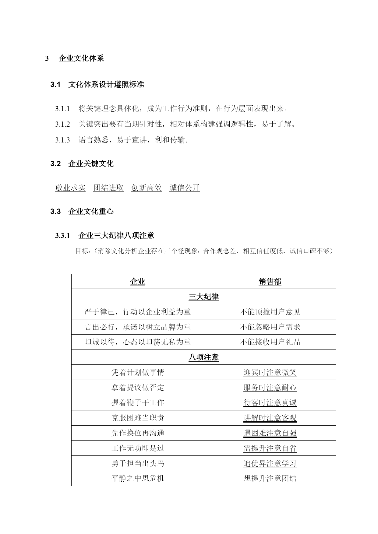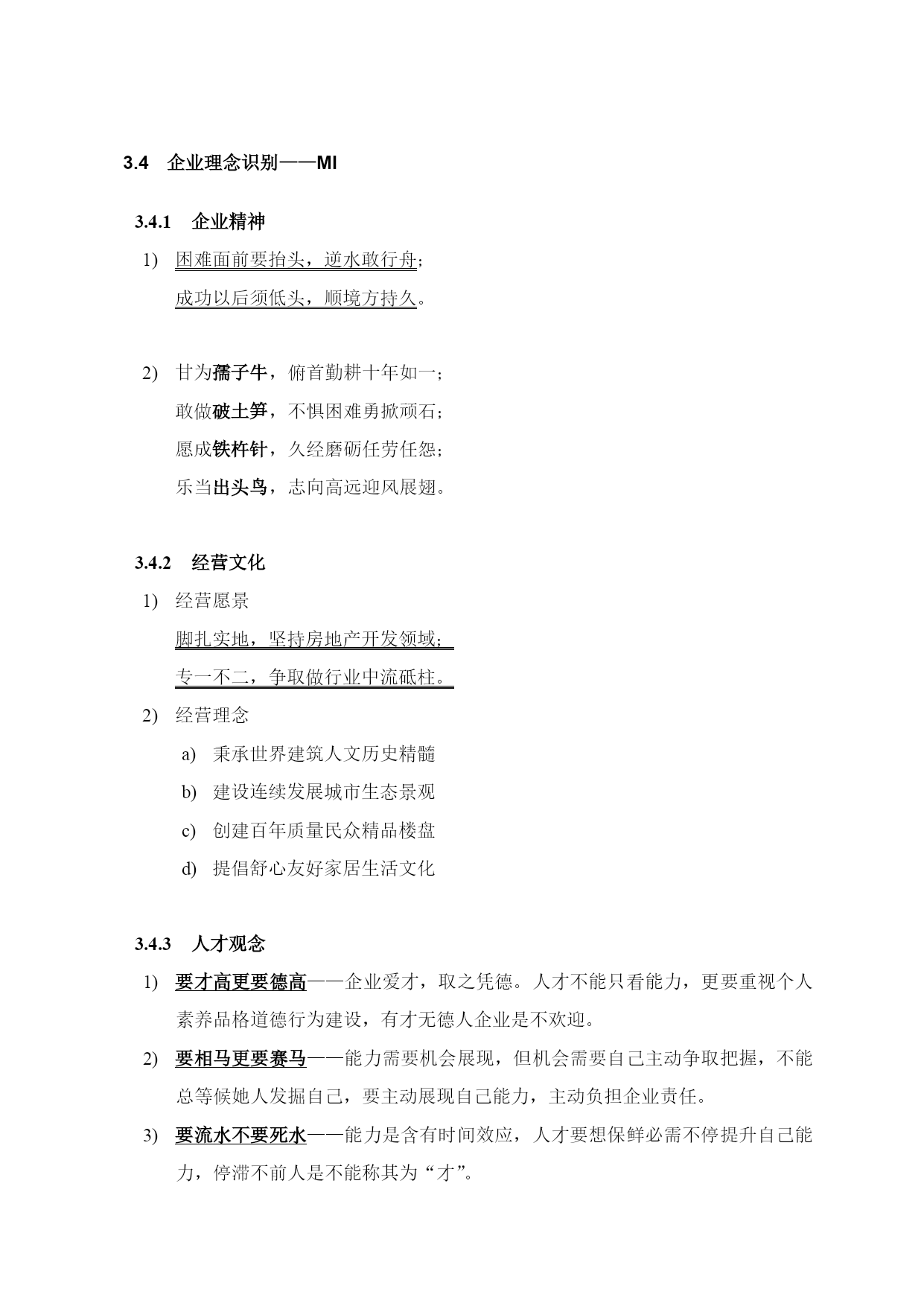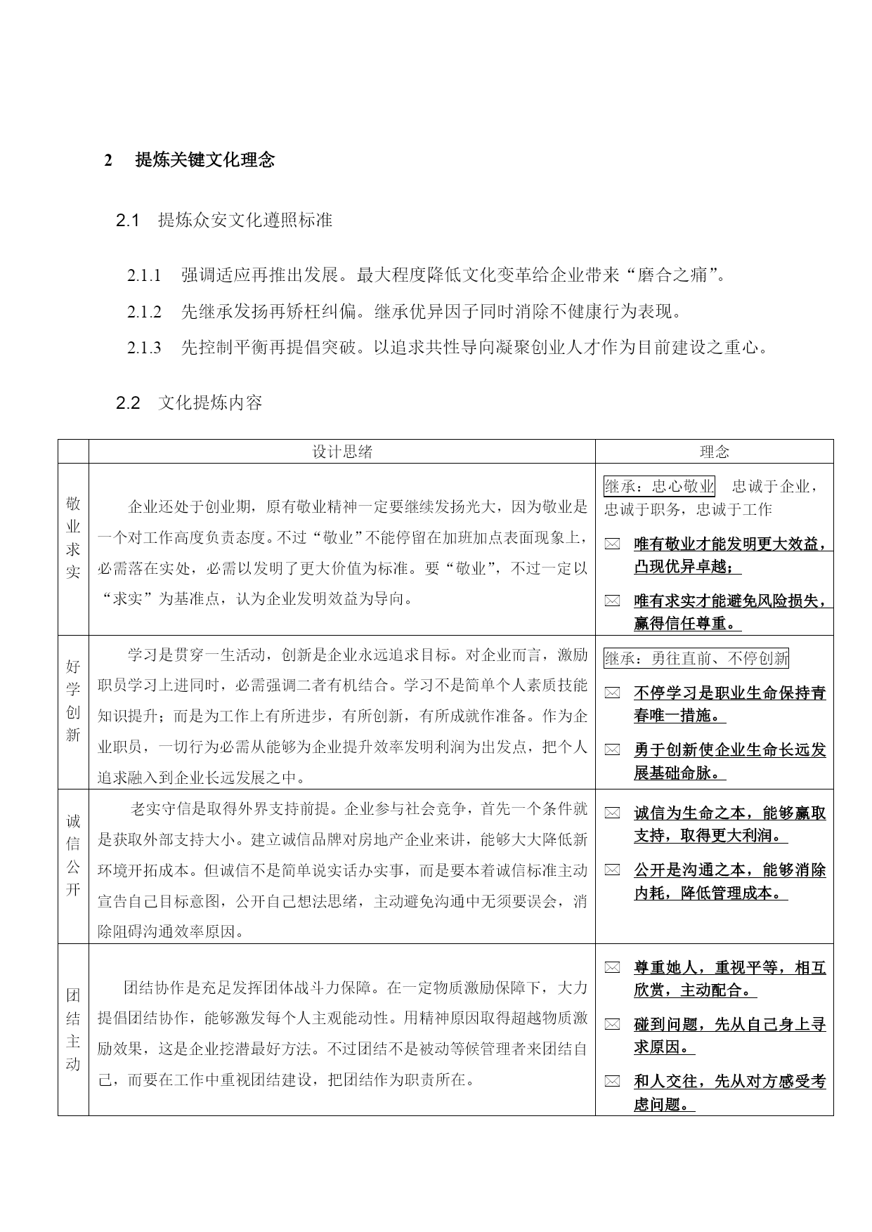 浙江众安房地产开发企业文化体系TOC\o\h\z1应继承众安隐性文化11.1文化继承时遵照标准11.2文化继承内容12提炼关键文化理念22.1提炼众安文化遵照标准22.2文化提炼内容23企业文化体系33.1文化体系设计遵照标准33.2企业关键文化33.3企业文化重心33.4企业理念识别——MI73.5企业行为识别——BI83.6文化视觉识别——VI113.7文化载体11应继承众安隐性文化文化继承时遵照标准促进企业关键经济发展;能够保障企业关键技术树立起强势品牌。促进企业职员人格健康成长;在个人素质不停提升同时保持谦和敬业。增强企业内部凝聚力;能够保障企业二次创业阶段人心稳定,运行正常。增强企业社会美誉度;能够保障企业扩大著名度,赢得社会资源和支持。文化继承内容现实状况分析及注意事项忠诚敬业忠心敬业在创业早期是企业凝聚力表现,不过伴随社会、企业发展,忠心意义应随之产生改变。其关键在于“忠”对象由企业家变为企业和工作。创业者避免陷入愚忠误区。敬业不是工作多到八小时内做不完,非要利用休息时间。假如这个岗位确实不是一个人能够在正常时间内完成,那么就应该考虑增加人事设置;假如是有些人不配合,那么应该考虑职责明确和监督考评。总而言之不能以个人加班掩盖了管理上存在不科学、不合理。勇往直前企业创业早期大家深受创业者影响,面对任何困难全部抱着肯定战胜信念。不惧困难是一个企业从一无全部走向成功关键原因。不过,不惧困难不等于轻视困难,更不等于把办事不按政府要求程序造成处罚或否决视为能够处理困难。企业在成长早期,凭弥天之勇闯风过浪,然后应该用规范步骤和制度体系处理碰到困难。提倡勇于攻坚不停创新“创新”因子是企业保持竞争优势,含有长远生命力一个前提,所以一定要继承。现在年轻人好学,和中层管理者没有时间保障、丧失学习年纪优势、从而没能立即充电形成反差。这是企业必需注意更正现象。不然一旦“老人”经验能力和“新人”知识眼界相冲突时,则是企业管理者最为难事。提炼关键文化理念提炼众安文化遵照标准强调适应再推出发展。最大程度降低文化变革给企业带来“磨合之痛”。先继承发扬再矫枉纠偏。继承优异因子同时消除不健康行为表现。先控制平衡再提倡突破。以追求共性导向凝聚创业人才作为目前建设之重心。文化提炼内容设计思绪理念敬业求实企业还处于创业期,原有敬业精神一定要继续发扬光大,因为敬业是一个对工作高度负责态度。不过“敬业”不能停留在加班加点表面现象上,必需落在实处,必需以发明了更大价值为标准。要“敬业”,不过一定以“求实”为基准点,认为企业发明效益为导向。继承:忠心敬业忠诚于企业,忠诚于职务,忠诚于工作唯有敬业才能发明更大效益,凸现优异卓越;唯有求实才能避免风险损失,赢得信任尊重。好学创新学习是贯穿一生活动,创新是企业永远追求目标。对企业而言,激励职员学习上进同时,必需强调二者有机结合。学习不是简单个人素质技能知识提升;而是为工作上有所进步,有所创新,有所成就作准备。作为企业职员,一切行为必需从能够为企业提升效率发明利润为出发点,把个人追求融入到企业长远发展之中。继承:勇往直前、不停创新不停学习是职业生命保持青春唯一措施。勇于创新使企业生命长远发展基础命脉。诚信公开老实守信是取得外界支持前提。企业参与社会竞争,首先一个条件就是获取外部支持大小。建立诚信品牌对房地产企业来讲,能够大大降低新环境开拓成本。但诚信不是简单说实话办实事,而是要本着诚信标准主动宣告自己目标意图,公开自己想法思绪,主动避免沟通中无须要误会,消除阻碍沟通效率原因。诚信为生命之本,能够赢取支持,取得更大利润。公开是沟通之本,能够消除内耗,降低管理成本。团结主动团结协作是充足发挥团体战斗力保障。在一定物质激励保障下,大力提倡团结协作,能够激发每个人主观能动性。用精神原因取得超越物质激励效果,这是企业挖潜最好方法。不过团结不是被动等候管理者来团结自己,而要在工作中重视团结建设,把团结作为职责所在。尊重她人,重视平等,相互欣赏,主动配合。碰到问题,先从自己身上寻求原因。和人交往,先从对方感受考虑问题。企业文化体系文化体系设计遵照标准将关键理念具体化,成为工作行为准则,在行为层面表现出来。关键突出要有当期针对性,相对体系构建强调逻辑性,易于了解。语言熟悉,易于宣讲,利和传输。企业关键文化敬业求实团结进取创新高效诚信公开企业文化重心企业三大纪律八项注意目标:(消除文化分析企业存在三个怪现象:合作观念差、相互信任度低、诚信口碑不够)企业销售部三大纪律严于律己,行动以企业利益为重不能顶撞用户意见言出必行,承诺以树立品牌为重不能忽略用户需求坦诚以待,心态以坦