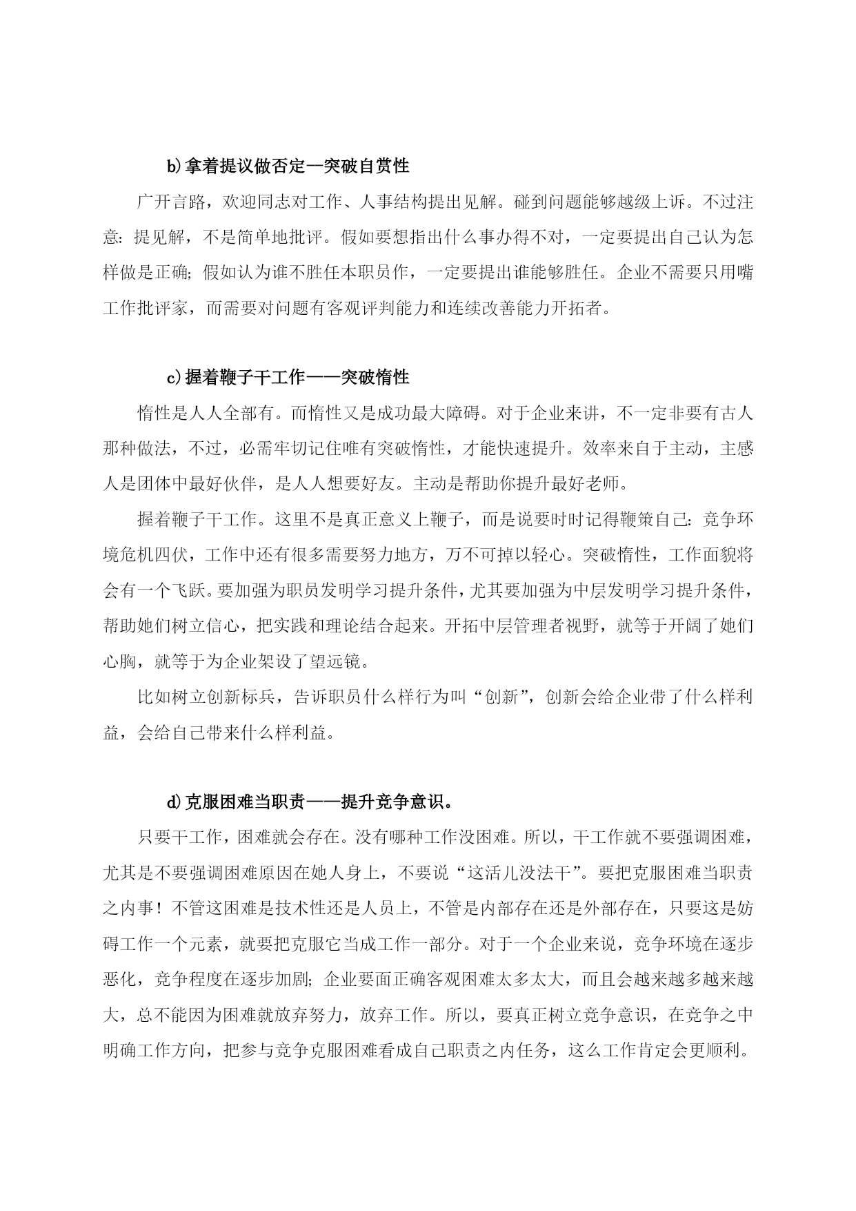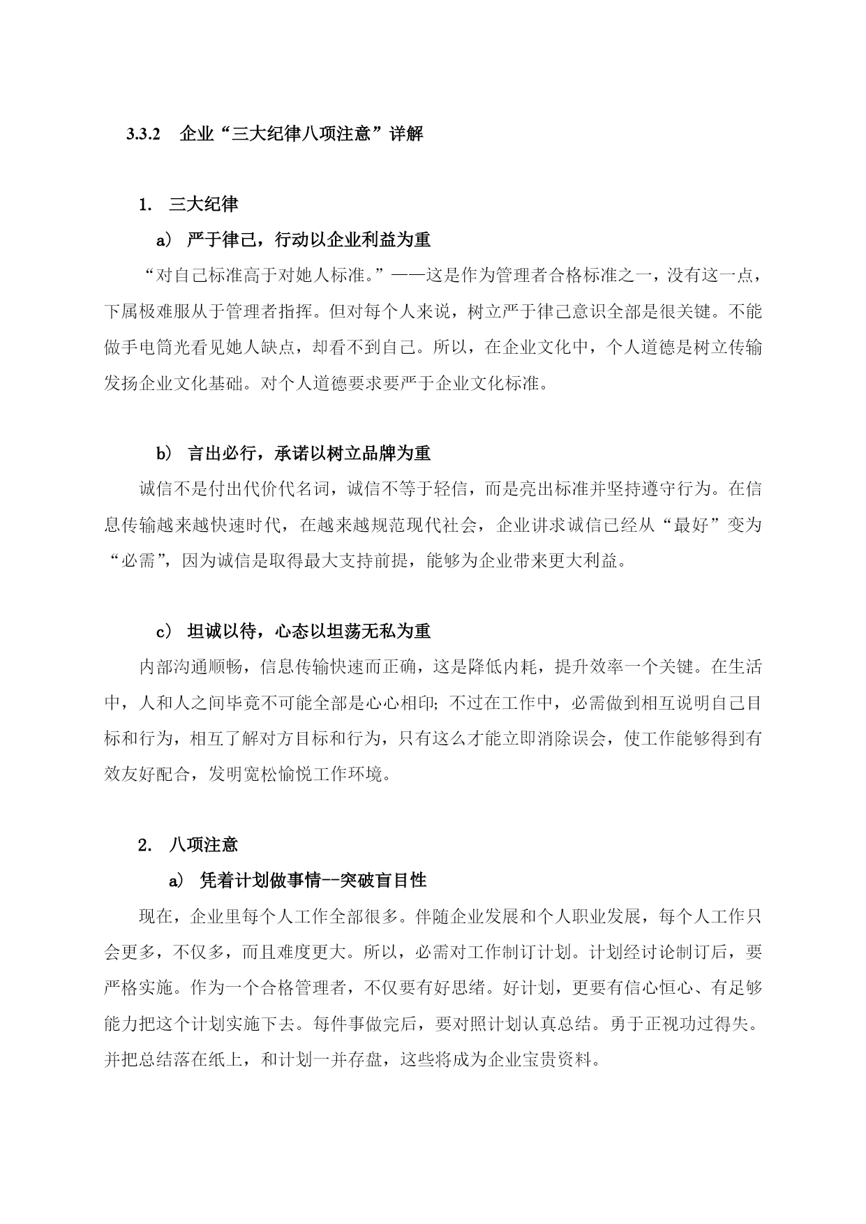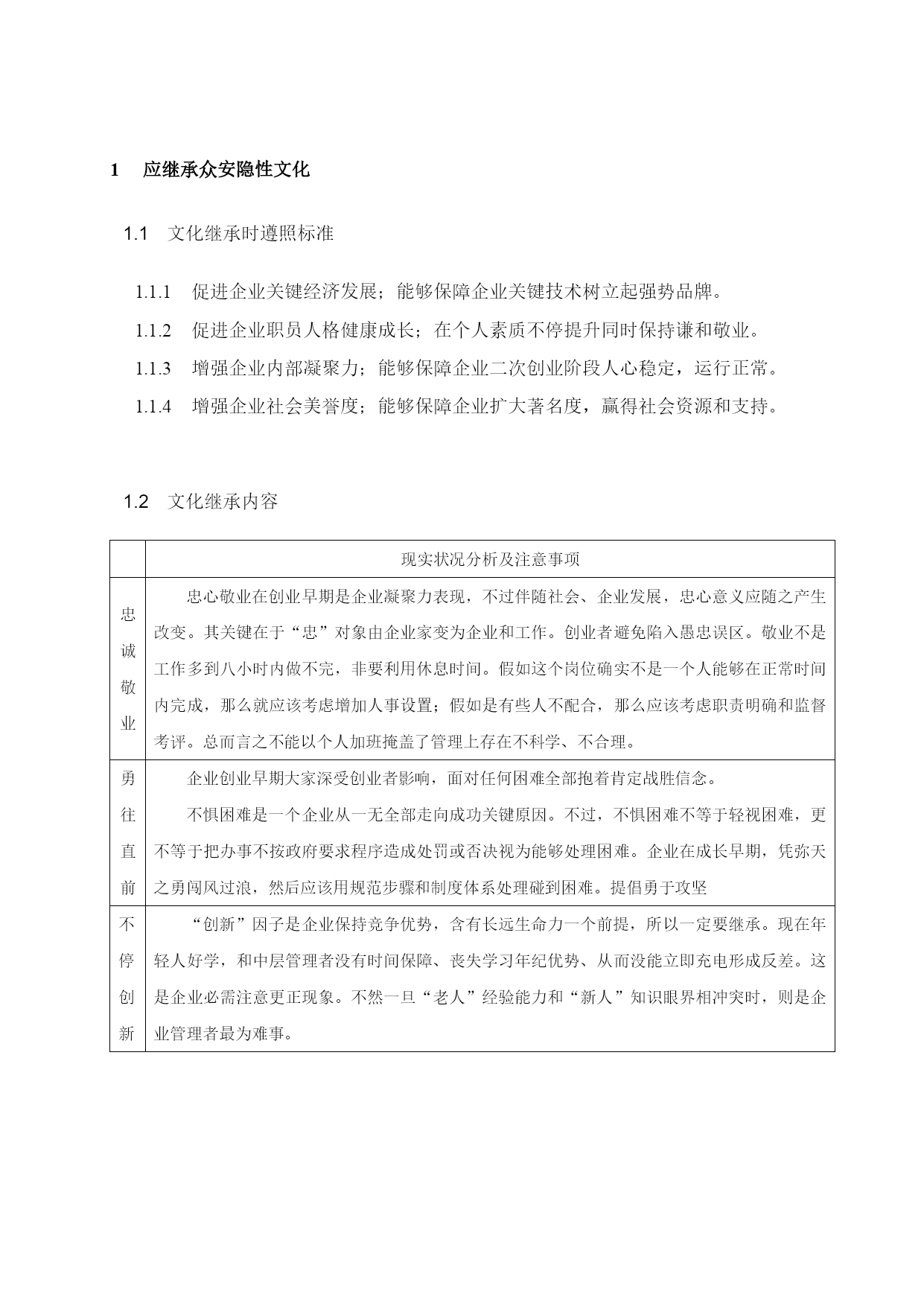浙江众安房地产开发企业文化体系TOC\o\h\z1应继承众安隐性文化11.1文化继承时遵照标准11.2文化继承内容12提炼关键文化理念22.1提炼众安文化遵照标准22.2文化提炼内容23企业文化体系33.1文化体系设计遵照标准33.2企业关键文化33.3企业文化重心33.4企业理念识别——MI73.5企业行为识别——BI83.6文化视觉识别——VI113.7文化载体11应继承众安隐性文化文化继承时遵照标准促进企业关键经济发展;能够保障企业关键技术树立起强势品牌。促进企业职员人格健康成长;在个人素质不停提升同时保持谦和敬业。增强企业内部凝聚力;能够保障企业二次创业阶段人心稳定,运行正常。增强企业社会美誉度;能够保障企业扩大著名度,赢得社会资源和支持。文化继承内容现实状况分析及注意事项忠诚敬业忠心敬业在创业早期是企业凝聚力表现,不过伴随社会、企业发展,忠心意义应随之产生改变。其关键在于“忠”对象由企业家变为企业和工作。创业者避免陷入愚忠误区。敬业不是工作多到八小时内做不完,非要利用休息时间。假如这个岗位确实不是一个人能够在正常时间内完成,那么就应该考虑增加人事设置;假如是有些人不配合,那么应该考虑职责明确和监督考评。总而言之不能以个人加班掩盖了管理上存在不科学、不合理。勇往直前企业创业早期大家深受创业者影响,面对任何困难全部抱着肯定战胜信念。不惧困难是一个企业从一无全部走向成功关键原因。不过,不惧困难不等于轻视困难,更不等于把办事不按政府要求程序造成处罚或否决视为能够处理困难。企业在成长早期,凭弥天之勇闯风过浪,然后应该用规范步骤和制度体系处理碰到困难。提倡勇于攻坚不停创新“创新”因子是企业保持竞争优势,含有长远生命力一个前提,所以一定要继承。现在年轻人好学,和中层管理者没有时间保障、丧失学习年纪优势、从而没能立即充电形成反差。这是企业必需注意更正现象。不然一旦“老人”经验能力和“新人”知识眼界相冲突时,则是企业管理者最为难事。提炼关键文化理念提炼众安文化遵照标准强调适应再推出发展。最大程度降低文化变革给企业带来“磨合之痛”。先继承发扬再矫枉纠偏。继承优异因子同时消除不健康行为表现。先控制平衡再提倡突破。以追求共性导向凝聚创业人才作为目前建设之重心。文化提炼内容设计思绪理念敬业求实企业还处于创业期,原有敬业精神一定要继续发扬光大,因为敬业是一个对工作高度负责态度。不过“敬业”不能停留在加班加点表面现象上,必需落在实处,必需以发明了更大价值为标准。要“敬业”,不过一定以“求实”为基准点,认为企业发明效益为导向。继承:忠心敬业忠诚于企业,忠诚于职务,忠诚于工作唯有敬业才能发明更大效益,凸现优异卓越;唯有求实才能避免风险损失,赢得信任尊重。好学创新学习是贯穿一生活动,创新是企业永远追求目标。对企业而言,激励职员学习上进同时,必需强调二者有机结合。学习不是简单个人素质技能知识提升;而是为工作上有所进步,有所创新,有所成就作准备。作为企业职员,一切行为必需从能够为企业提升效率发明利润为出发点,把个人追求融入到企业长远发展之中。继承:勇往直前、不停创新不停学习是职业生命保持青春唯一措施。勇于创新使企业生命长远发展基础命脉。诚信公开老实守信是取得外界支持前提。企业参与社会竞争,首先一个条件就是获取外部支持大小。建立诚信品牌对房地产企业来讲,能够大大降低新环境开拓成本。但诚信不是简单说实话办实事,而是要本着诚信标准主动宣告自己目标意图,公开自己想法思绪,主动避免沟通中无须要误会,消除阻碍沟通效率原因。诚信为生命之本,能够赢取支持,取得更大利润。公开是沟通之本,能够消除内耗,降低管理成本。团结主动团结协作是充足发挥团体战斗力保障。在一定物质激励保障下,大力提倡团结协作,能够激发每个人主观能动性。用精神原因取得超越物质激励效果,这是企业挖潜最好方法。不过团结不是被动等候管理者来团结自己,而要在工作中重视团结建设,把团结作为职责所在。尊重她人,重视平等,相互欣赏,主动配合。碰到问题,先从自己身上寻求原因。和人交往,先从对方感受考虑问题。企业文化体系文化体系设计遵照标准将关键理念具体化,成为工作行为准则,在行为层面表现出来。关键突出要有当期针对性,相对体系构建强调逻辑性,易于了解。语言熟悉,易于宣讲,利和传输。企业关键文化敬业求实团结进取创新高效诚信公开企业文化重心企业三大纪律八项注意目标:(消除文化分析企业存在三个怪现象:合作观念差、相互信任度低、诚信口碑不够)企业销售部三大纪律严于律己,行动以企业利益为重不能顶撞用户意见言出必行,承诺以树立品牌为重不能忽略用户需求坦诚以待,心态以坦