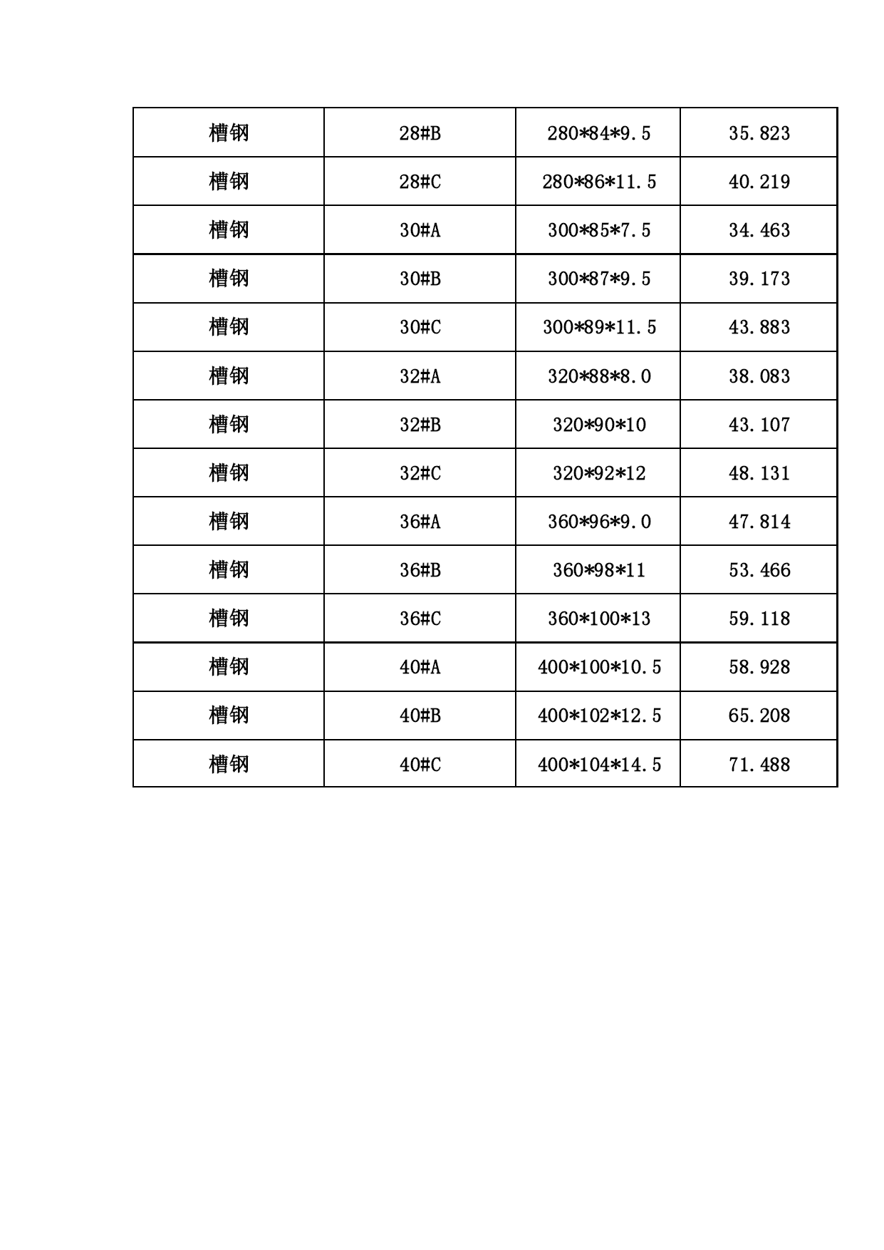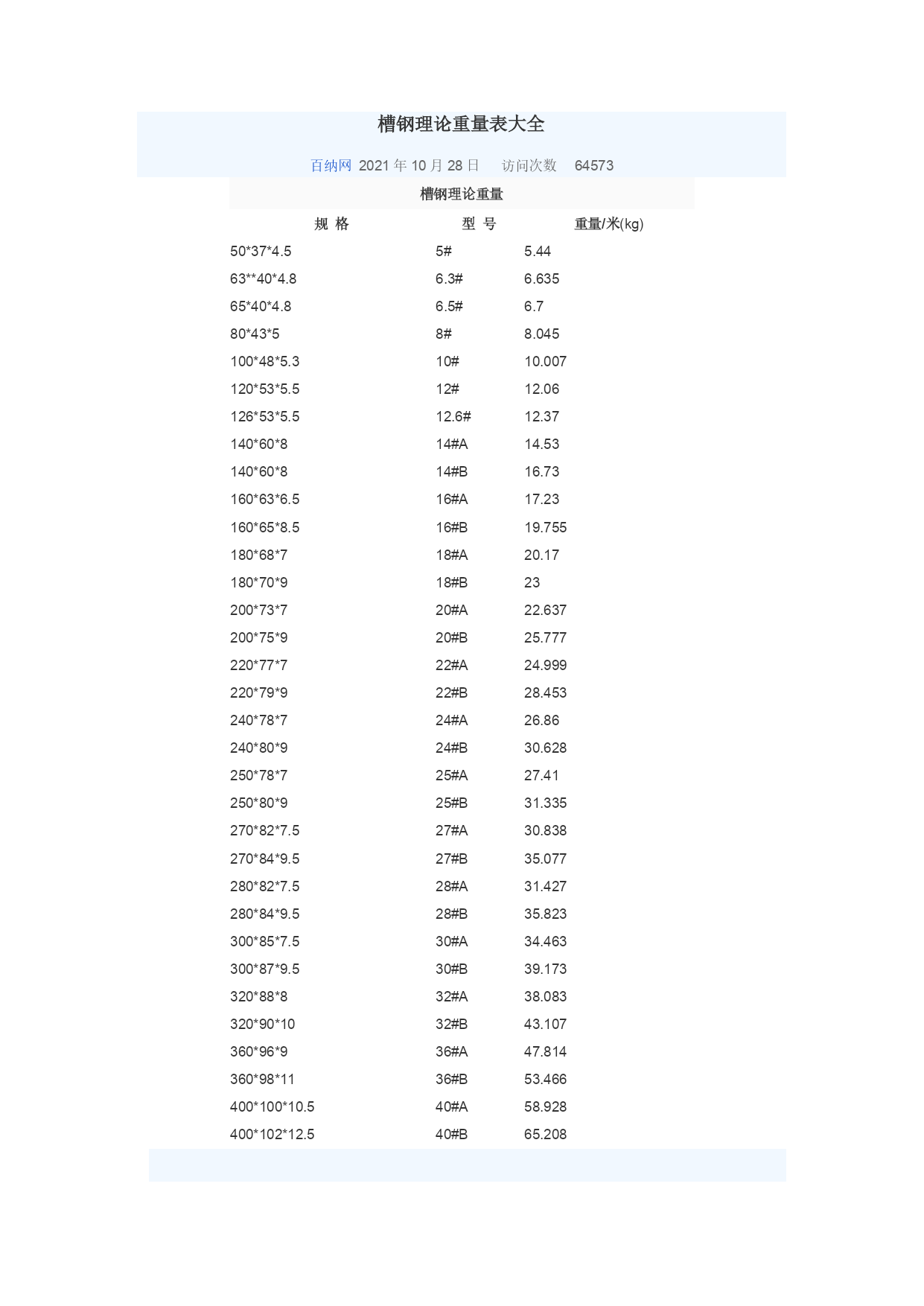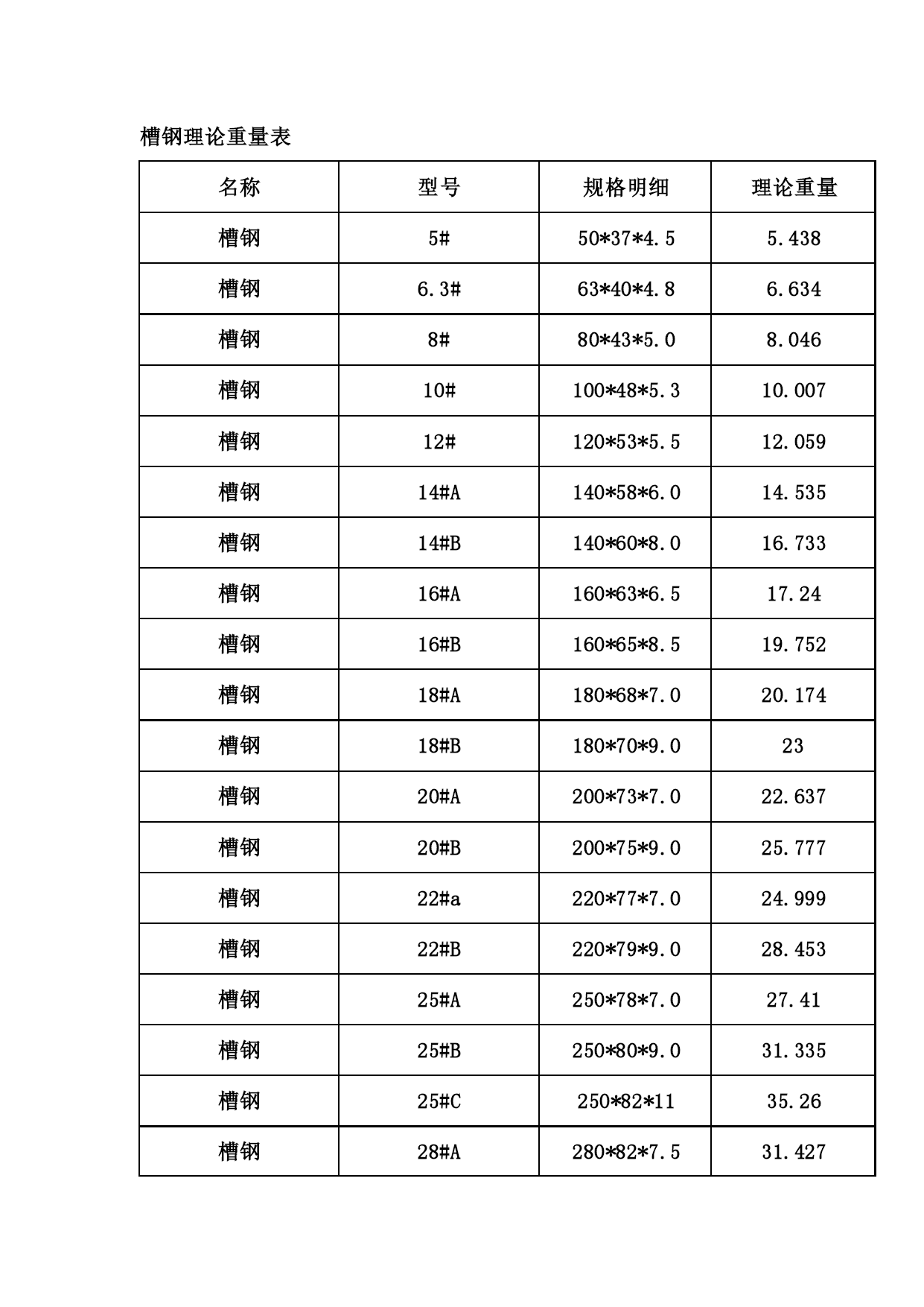 槽钢理论重量表大全价格优质资料(可以直接使用,可编辑优质资料,欢迎下载)槽钢理论重量表大全百纳网2021年10月28日访问次数64573槽钢理论重量规格型号重量/米(kg)50*37*4.55#5.4463**40*4.86.3#6.63565*40*4.86.5#6.780*43*58#8.045100*48*5.310#10.007120*53*5.512#12.06126*53*5.512.6#12.37140*60*814#A14.53140*60*814#B16.73160*63*6.516#A17.23160*65*8.516#B19.755180*68*718#A20.17180*70*918#B23200*73*720#A22.637200*75*920#B25.777220*77*722#A24.999220*79*922#B28.453240*78*724#A26.86240*80*924#B30.628250*78*725#A27.41250*80*925#B31.335270*82*7.527#A30.838270*84*9.527#B35.077280*82*7.528#A31.427280*84*9.528#B35.823300*85*7.530#A34.463300*87*9.530#B39.173320*88*832#A38.083320*90*1032#B43.107360*96*936#A47.814360*98*1136#B53.466400*100*10.540#A58.928400*102*12.540#B65.2084月17日成都型材参考价格2006-4-1711:14[关键词]成都型材价格槽钢8#Q2353220安阳槽钢14#Q2353250天津江天槽钢16#Q2353250天津江天槽钢20#Q2353250武钢槽钢30#Q2353250武钢工字钢10#Q2353350阿城工字钢12#Q2353350阿城工字钢14#Q2353350阿城工字钢25#Q2353300-3350莱钢工字钢32#Q2353380莱钢螺纹钢理论重量表2021-7-2螺纹钢理论重量表(螺纹钢的理论重量)螺纹钢d(a)理论重量80.395100.617120.888141.21161.58182202.47222.98253.85284.83326.31367.99409.877日临沂市场建筑钢材价格行情螺纹钢Φ12mmHRB335莱钢4650--螺纹钢Φ14mmHRB335莱钢4600--螺纹钢Φ16-25mmHRB335莱钢4550--螺纹钢Φ14-25mmHRB335永锋4450--螺纹钢Φ12mmHRB400莱钢4800--螺纹钢Φ14mmHRB400莱钢4750--螺纹钢Φ16-25mmHRB400莱钢4700--螺纹钢Φ14-25mmHRB400永峰4600--螺纹钢Φ16-25mmHRB400日钢4550--1回答槽钢理论重量表名称型号规格明细理论重量槽钢5#50*37*4.55.438槽钢6.3#63*40*4.86.634槽钢8#80*43*5.08.046槽钢10#100*48*5.310.007槽钢12#120*53*5.512.059槽钢14#A140*58*6.014.535槽钢14#B140*60*8.016.733槽钢16#A160*63*6.517.24槽钢16#B160*65*8.519.752槽钢18#A180*68*7.020.174槽钢18#B180*70*9.023槽钢20#A200*73*7.022.637槽钢20#B200*75*9.025.777槽钢22#a220*77*7.024.999槽钢22#B220*79*9.028.453槽钢25#A250*78*7.027.41槽钢25#B250*80*9.031.335槽钢25#C250*82*1135.26槽钢28#A280*82*7.531.427槽钢28#B280*84*9.535.823槽钢28#C280*86*11.540.219槽钢30#A300*85*7.534.463槽钢30#B300*87*9.539.173槽钢30#C300*89*11.543.883槽钢32#A320*88*8.038.083槽钢32#B320*90*1043.107槽钢32#C320*92*1248.131槽钢36#A360*96*9.047.814槽钢36#B360*98*1153.466槽钢36#C360*100*1359.118槽钢40#A400*100*10.558.928槽钢40#B400