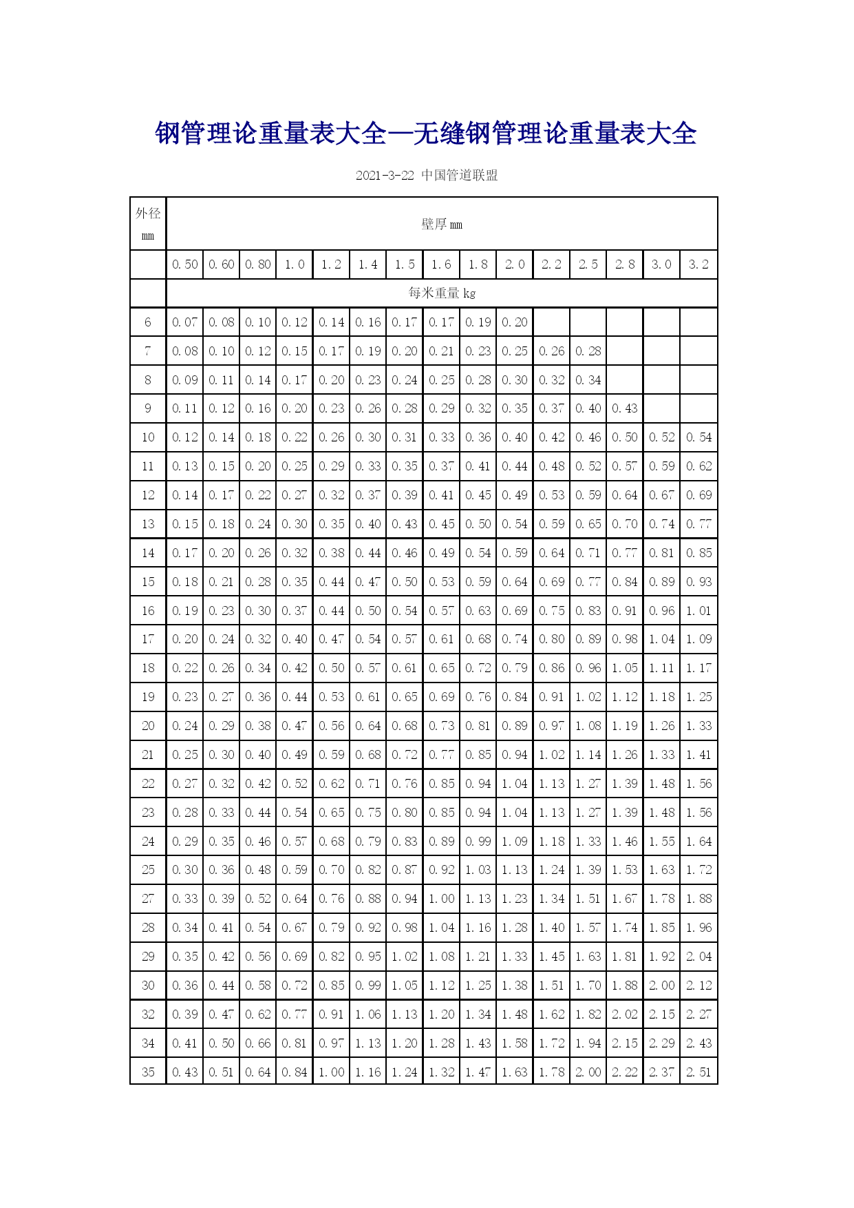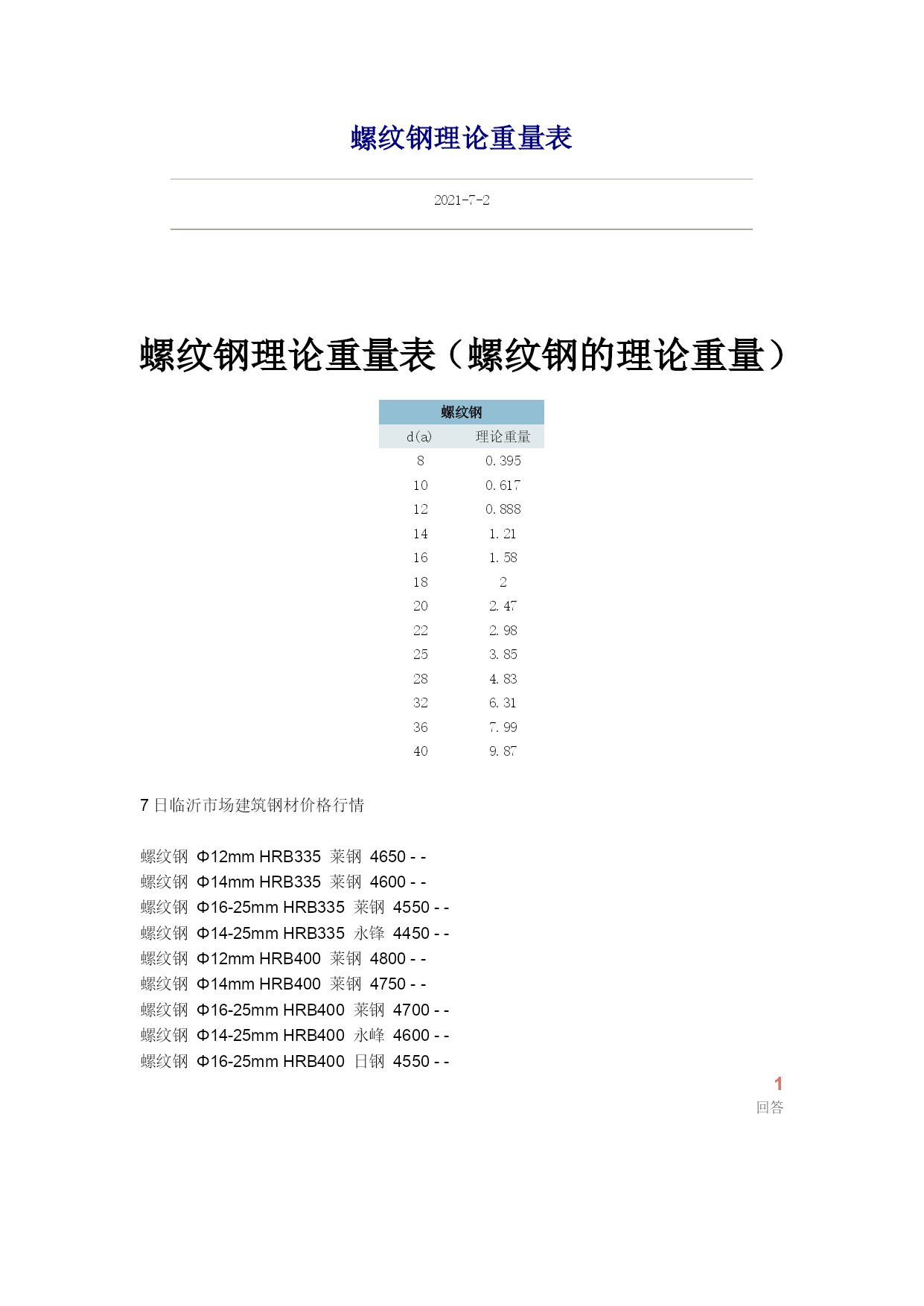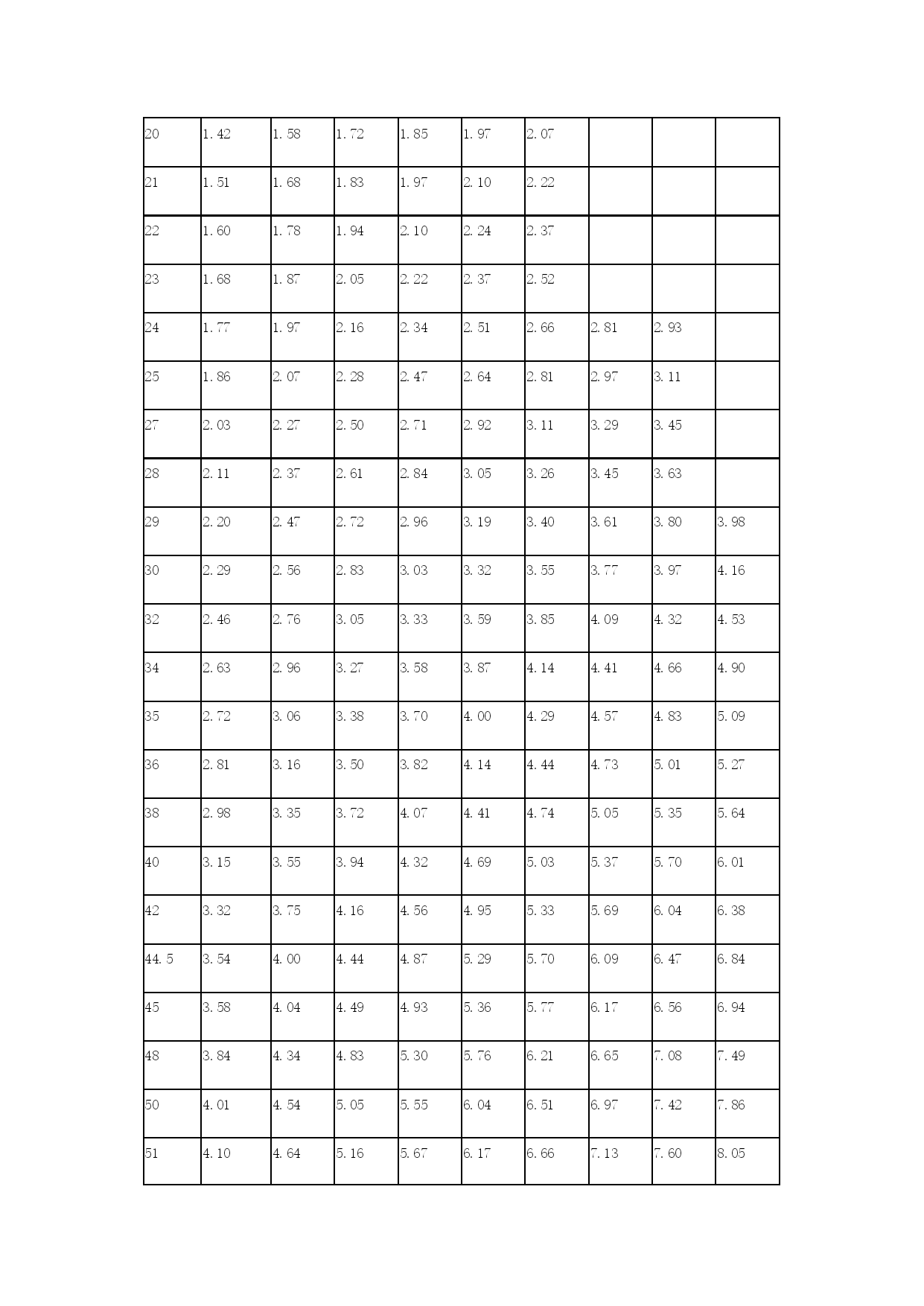 槽钢理论重量表大全价格优质资料(可以直接使用,可编辑优质资料,欢迎下载)槽钢理论重量表大全百纳网2021年10月28日访问次数64573槽钢理论重量规格型号重量/米(kg)50*37*4.55#5.4463**40*4.86.3#6.63565*40*4.86.5#6.780*43*58#8.045100*48*5.310#10.007120*53*5.512#12.06126*53*5.512.6#12.37140*60*814#A14.53140*60*814#B16.73160*63*6.516#A17.23160*65*8.516#B19.755180*68*718#A20.17180*70*918#B23200*73*720#A22.637200*75*920#B25.777220*77*722#A24.999220*79*922#B28.453240*78*724#A26.86240*80*924#B30.628250*78*725#A27.41250*80*925#B31.335270*82*7.527#A30.838270*84*9.527#B35.077280*82*7.528#A31.427280*84*9.528#B35.823300*85*7.530#A34.463300*87*9.530#B39.173320*88*832#A38.083320*90*1032#B43.107360*96*936#A47.814360*98*1136#B53.466400*100*10.540#A58.928400*102*12.540#B65.2084月17日成都型材参考价格2006-4-1711:14[关键词]成都型材价格槽钢8#Q2353220安阳槽钢14#Q2353250天津江天槽钢16#Q2353250天津江天槽钢20#Q2353250武钢槽钢30#Q2353250武钢工字钢10#Q2353350阿城工字钢12#Q2353350阿城工字钢14#Q2353350阿城工字钢25#Q2353300-3350莱钢工字钢32#Q2353380莱钢螺纹钢理论重量表2021-7-2螺纹钢理论重量表(螺纹钢的理论重量)螺纹钢d(a)理论重量80.395100.617120.888141.21161.58182202.47222.98253.85284.83326.31367.99409.877日临沂市场建筑钢材价格行情螺纹钢Φ12mmHRB335莱钢4650--螺纹钢Φ14mmHRB335莱钢4600--螺纹钢Φ16-25mmHRB335莱钢4550--螺纹钢Φ14-25mmHRB335永锋4450--螺纹钢Φ12mmHRB400莱钢4800--螺纹钢Φ14mmHRB400莱钢4750--螺纹钢Φ16-25mmHRB400莱钢4700--螺纹钢Φ14-25mmHRB400永峰4600--螺纹钢Φ16-25mmHRB400日钢4550--1回答槽钢理论重量表名称型号规格明细理论重量槽钢5#50*37*4.55.438槽钢6.3#63*40*4.86.634槽钢8#80*43*5.08.046槽钢10#100*48*5.310.007槽钢12#120*53*5.512.059槽钢14#A140*58*6.014.535槽钢14#B140*60*8.016.733槽钢16#A160*63*6.517.24槽钢16#B160*65*8.519.752槽钢18#A180*68*7.020.174槽钢18#B180*70*9.023槽钢20#A200*73*7.022.637槽钢20#B200*75*9.025.777槽钢22#a220*77*7.024.999槽钢22#B220*79*9.028.453槽钢25#A250*78*7.027.41槽钢25#B250*80*9.031.335槽钢25#C250*82*1135.26槽钢28#A280*82*7.531.427槽钢28#B280*84*9.535.823槽钢28#C280*86*11.540.219槽钢30#A300*85*7.534.463槽钢30#B300*87*9.539.173槽钢30#C300*89*11.543.883槽钢32#A320*88*8.038.083槽钢32#B320*90*1043.107槽钢32#C320*92*1248.131槽钢36#A360*96*9.047.814槽钢36#B360*98*1153.466槽钢36#C360*100*1359.118槽钢40#A400*100*10.558.928槽钢40#B400