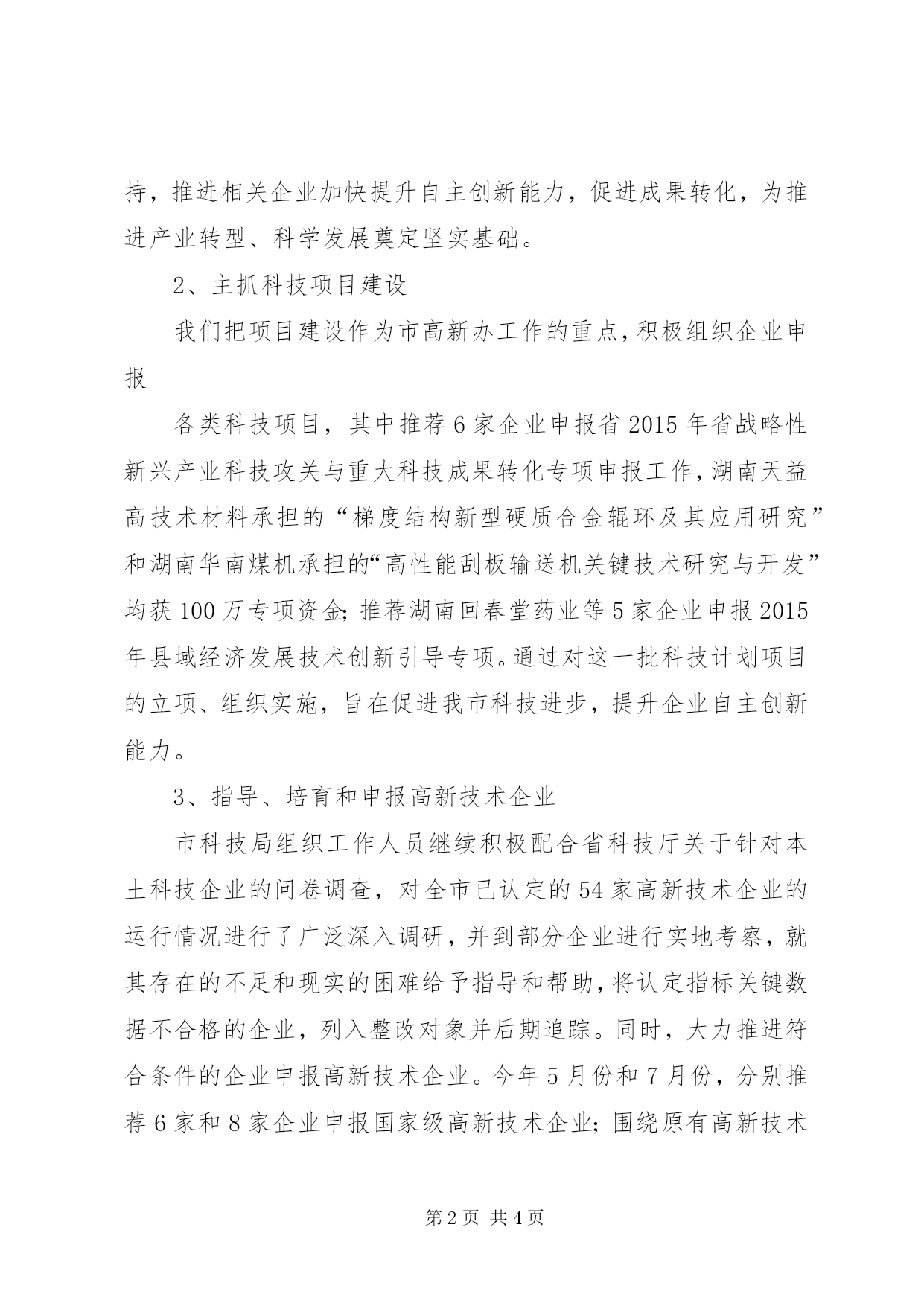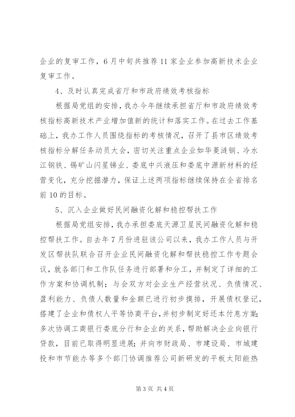 第PAGE\*Arabic\*MERGEFORMAT4页共NUMPAGES\*MERGEFORMAT4页高新技术产业管理办工作总结XX县区在市委、市政府的正确领导下,在省科技厅、市科技局的大力支持和指导下,借鉴兄弟市州成功发展经验,市高新办在2015年立足本地实际,紧跟产业技术发展步伐,努力开拓,扎实工作,使我市高新技术产业得到了健康持续快速发展。现对2015年全年工作进行总结。一、2015年全市高新技术产业发展情况总结2015年,全市高新技术产业发展速度放缓。据统计,我市前三季度累计完成高新技术总产值346.97亿元,同比增长-10.47%;实现高新技术产品增加值80.93亿元,同比增长-9.52%;高新技术产品增加值占规模工业增加值比重26.42%;预计全年高新技术总产值突破535亿,高新技术产品增加值120亿,同比增长5%。截至目前,全市高新技术企业数量已达54家,有6家企业已通过省科技厅组织专家评审且进入公示期,年底有望突破60家,基本形成新材料、先进装备制造和电子信息等高新技术产业格局。二、2015年工作总结1、研究确定全市高新技术产业发展重点领域市高新办组织开展了全市高新技术产业发展重点领域的研究工作,初步提出将新材料和先进装备制造技术作为我市高新技术产业发展的二大重点领域,将继续加大对这二大产业的重点扶持,推进相关企业加快提升自主创新能力,促进成果转化,为推进产业转型、科学发展奠定坚实基础。2、主抓科技项目建设我们把项目建设作为市高新办工作的重点,积极组织企业申报各类科技项目,其中推荐6家企业申报省2015年省战略性新兴产业科技攻关与重大科技成果转化专项申报工作,湖南天益高技术材料承担的“梯度结构新型硬质合金辊环及其应用研究”和湖南华南煤机承担的“高性能刮板输送机关键技术研究与开发”均获100万专项资金;推荐湖南回春堂药业等5家企业申报2015年县域经济发展技术创新引导专项。通过对这一批科技计划项目的立项、组织实施,旨在促进我市科技进步,提升企业自主创新能力。3、指导、培育和申报高新技术企业市科技局组织工作人员继续积极配合省科技厅关于针对本土科技企业的问卷调查,对全市已认定的54家高新技术企业的运行情况进行了广泛深入调研,并到部分企业进行实地考察,就其存在的不足和现实的困难给予指导和帮助,将认定指标关键数据不合格的企业,列入整改对象并后期追踪。同时,大力推进符合条件的企业申报高新技术企业。今年5月份和7月份,分别推荐6家和8家企业申报国家级高新技术企业;围绕原有高新技术企业的复审工作,6月中旬共推荐11家企业参加高新技术企业复审工作。4、及时认真完成省厅和市政府绩效考核指标根据局党组的安排,我办今年继续承担省厅和市政府绩效考核指标高新技术产业增加值新的统计和落实工作。在过去工作基础上,我办工作人员围绕指标的考核情况,召开了县市区绩效考核指标分解任务动员大会,密切关注重点企业如华菱涟钢、冷水江钢铁、锡矿山闪星锑业、娄底中兴液压和娄底中源新材料的经营变化,充分挖掘潜力,保证上述两项指标继续保持在全省排名前10的目标。5、沉入企业做好民间融资化解和稳控帮扶工作根据局党组安排,我办承担娄底天源卫星民间融资化解和稳控帮扶工作。自去年7月份进驻该公司以来,我办工作人员与开发区帮扶队联合召开企业民间融资化解和帮扶稳控工作专题会议,就各部门和工作队任务进行部署和分工,并制定了详细的工作方案和协调机制;与会双方对企业生产经营状况、负债情况、盈利能力、负债人数量和金额已进行初步摸排,开展债权登记,搭建了企业和债权人平等协商平台,并初步制定好还本付息方案;多次协调工商银行娄底分行和企业的关系,帮助解决企业向银行贷款,目前已取得明显进展;并向市财政局、市建设局、市城建投和市节能办等多个部门协调推荐公司新研发的平板太阳能热水器,争取将其优先纳入建筑节能政府采购工程项目。XX县区高新技术产业管理办2015年11月6日
