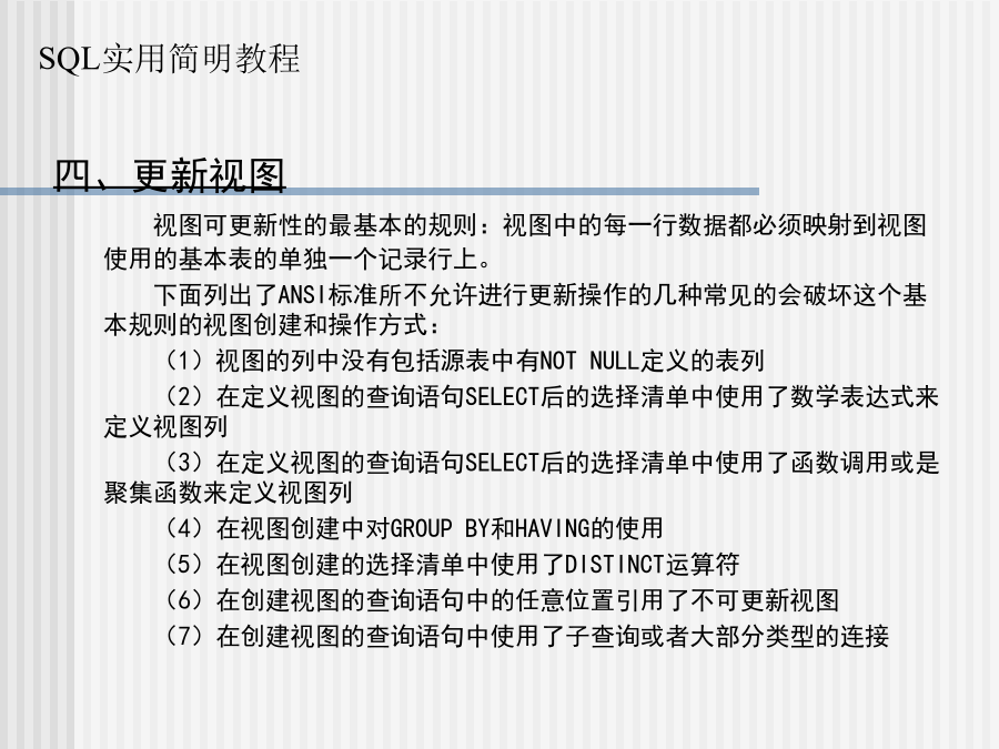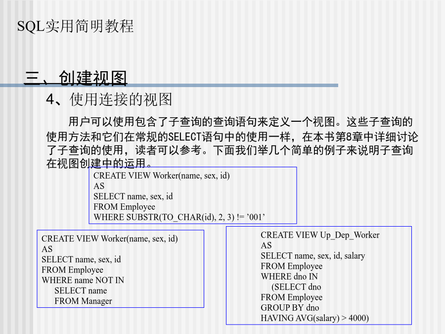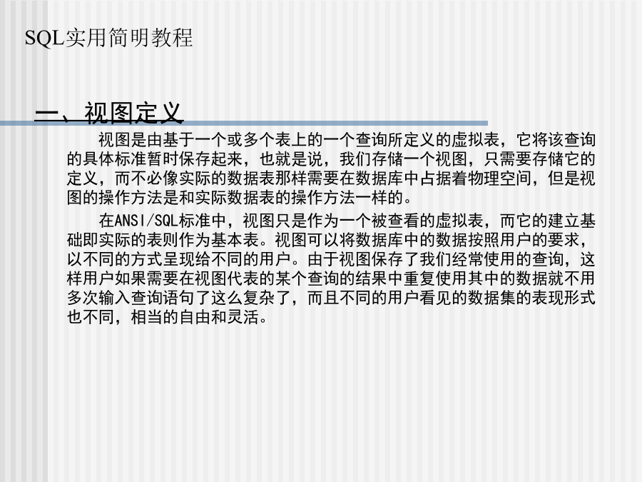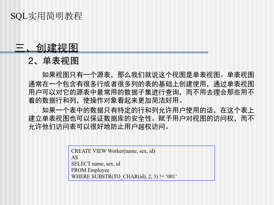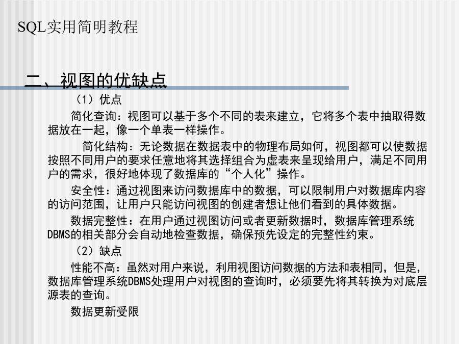 第9章视图的使用重点内容:视图的定义创建视图更新视图删除视图视图的应用一、视图定义视图是由基于一个或多个表上的一个查询所定义的虚拟表,它将该查询的具体标准暂时保存起来,也就是说,我们存储一个视图,只需要存储它的定义,而不必像实际的数据表那样需要在数据库中占据着物理空间,但是视图的操作方法是和实际数据表的操作方法一样的。在ANSI/SQL标准中,视图只是作为一个被查看的虚拟表,而它的建立基础即实际的表则作为基本表。视图可以将数据库中的数据按照用户的要求,以不同的方式呈现给不同的用户。由于视图保存了我们经常使用的查询,这样用户如果需要在视图代表的某个查询的结果中重复使用其中的数据就不用多次输入查询语句了这么复杂了,而且不同的用户看见的数据集的表现形式也不同,相当的自由和灵活。二、视图的优缺点(1)优点简化查询:视图可以基于多个不同的表来建立,它将多个表中抽取得数据放在一起,像一个单表一样操作。简化结构:无论数据在数据表中的物理布局如何,视图都可以使数据按照不同用户的要求任意地将其选择组合为虚表来呈现给用户,满足不同用户的需求,很好地体现了数据库的“个人化”操作。安全性:通过视图来访问数据库中的数据,可以限制用户对数据库内容的访问范围,让用户只能访问视图的创建者想让他们看到的具体数据。数据完整性:在用户通过视图访问或者更新数据时,数据库管理系统DBMS的相关部分会自动地检查数据,确保预先设定的完整性约束。(2)缺点性能不高:虽然对用户来说,利用视图访问数据的方法和表相同,但是,数据库管理系统DBMS处理用户对视图的查询时,必须要先将其转换为对底层源表的查询。数据更新受限三、创建视图创建视图使用命令CREATEVIEW。三、创建视图1、创建列的别名创建视图时,如果用户没有特别指定视图中的列名,视图列将继承SELECT语句中源表的列名。但是如果视图中的列是通过计算得出的或者有多个列具有相同的名称,就必须要给视图列命名,这个名称也叫源表中的列的别名。指定的列名清单放在CREATE语句的视图名称之后的括号中。三、创建视图2、单表视图如果视图只有一个源表,那么我们就说这个视图是单表视图。单表视图通常在一个包含有很多行或者很多列的表的基础上创建使用,通过单表视图用户可以对它的源表中最常用的数据子集进行查询,而不用去理会那些用不着的数据行和列,使操作对象看起来更加简洁好用。如果一个表中的数据只有特定的行和列允许用户使用的话,在这个表上建立单表视图也可以保证数据库的安全性。赋予用户对视图的访问权,而不允许他们访问表可以很好地防止用户越权访问。三、创建视图3、使用连接的视图视图可以在单表上建立,也可以在多个表的基础上创建。使用在多个表上创建的视图,用户就不必考虑自己使用的数据来自于哪个数据表或者需要在那个表中查找自己需要的数据。需要做的就是,在视图中使用这些数据,就好像它们一直就存储在同一个表上一样。下面我们介绍使用连接的视图。要创建一个使用连接的视图,只需使用多表连接查询来定义。三、创建视图4、使用连接的视图用户可以使用包含了子查询的查询语句来定义一个视图。这些子查询的使用方法和它们在常规的SELECT语句中的使用一样,在本书第8章中详细讨论了子查询的使用,读者可以参考。下面我们举几个简单的例子来说明子查询在视图创建中的运用。四、更新视图视图可更新性的最基本的规则:视图中的每一行数据都必须映射到视图使用的基本表的单独一个记录行上。下面列出了ANSI标准所不允许进行更新操作的几种常见的会破坏这个基本规则的视图创建和操作方式:(1)视图的列中没有包括源表中有NOTNULL定义的表列(2)在定义视图的查询语句SELECT后的选择清单中使用了数学表达式来定义视图列(3)在定义视图的查询语句SELECT后的选择清单中使用了函数调用或是聚集函数来定义视图列(4)在视图创建中对GROUPBY和HAVING的使用(5)在视图创建的选择清单中使用了DISTINCT运算符(6)在创建视图的查询语句中的任意位置引用了不可更新视图(7)在创建视图的查询语句中使用了子查询或者大部分类型的连接五、删除视图删除视图的操作很简单,使用DROPVIEW命令来完成这个操作。六、视图的应用1、简化复杂的查询如果我们在对数据库中的数据进行某种操作时,需要执行一系列的查询语句,会发现这么做是很复杂的,这种情况下,我们可以使用合适的视图来简化查询。2、从多个数据源汇总数据如果在创建视图的查询语句中直接连接多个数据源表,或通过其它的视图来间接连接多个数据源表,我们就可以利用该视图来汇总这些源表上的数据。使用这种方法,可以简化我们很多针对这些数据表的查询。六、视图的应用3、单位转换有时候,