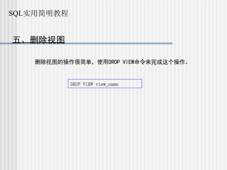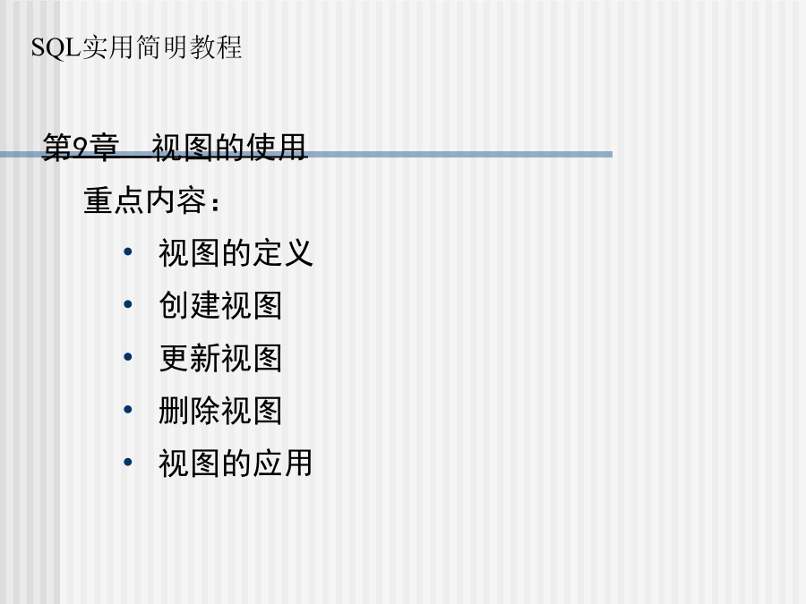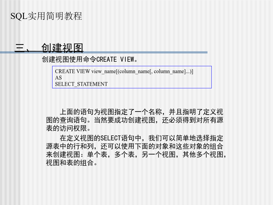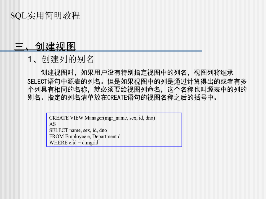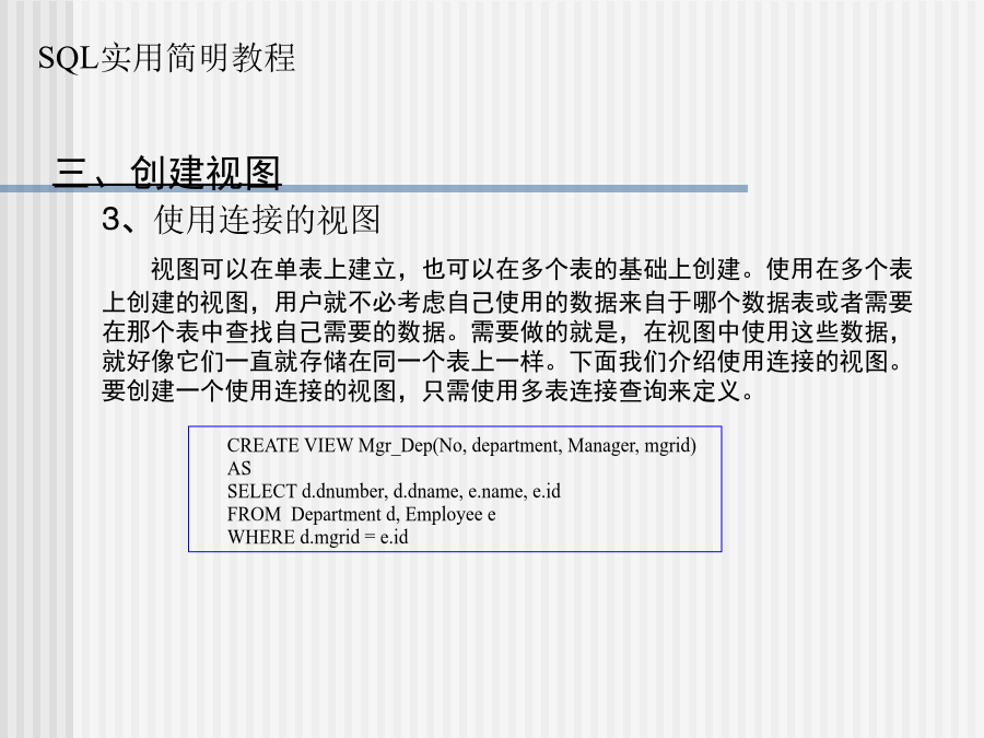 第9章视图的使用重点内容:视图的定义创建视图更新视图删除视图视图的应用一、视图定义视图是由基于一个或多个表上的一个查询所定义的虚拟表,它将该查询的具体标准暂时保存起来,也就是说,我们存储一个视图,只需要存储它的定义,而不必像实际的数据表那样需要在数据库中占据着物理空间,但是视图的操作方法是和实际数据表的操作方法一样的。在ANSI/SQL标准中,视图只是作为一个被查看的虚拟表,而它的建立基础即实际的表则作为基本表。视图可以将数据库中的数据按照用户的要求,以不同的方式呈现给不同的用户。由于视图保存了我们经常使用的查询,这样用户如果需要在视图代表的某个查询的结果中重复使用其中的数据就不用多次输入查询语句了这么复杂了,而且不同的用户看见的数据集的表现形式也不同,相当的自由和灵活。二、视图的优缺点(1)优点简化查询:视图可以基于多个不同的表来建立,它将多个表中抽取得数据放在一起,像一个单表一样操作。简化结构:无论数据在数据表中的物理布局如何,视图都可以使数据按照不同用户的要求任意地将其选择组合为虚表来呈现给用户,满足不同用户的需求,很好地体现了数据库的“个人化”操作。安全性:通过视图来访问数据库中的数据,可以限制用户对数据库内容的访问范围,让用户只能访问视图的创建者想让他们看到的具体数据。数据完整性:在用户通过视图访问或者更新数据时,数据库管理系统DBMS的相关部分会自动地检查数据,确保预先设定的完整性约束。(2)缺点性能不高:虽然对用户来说,利用视图访问数据的方法和表相同,但是,数据库管理系统DBMS处理用户对视图的查询时,必须要先将其转换为对底层源表的查询。数据更新受限三、创建视图创建视图使用命令CREATEVIEW。三、创建视图1、创建列的别名创建视图时,如果用户没有特别指定视图中的列名,视图列将继承SELECT语句中源表的列名。但是如果视图中的列是通过计算得出的或者有多个列具有相同的名称,就必须要给视图列命名,这个名称也叫源表中的列的别名。指定的列名清单放在CREATE语句的视图名称之后的括号中。三、创建视图2、单表视图如果视图只有一个源表,那么我们就说这个视图是单表视图。单表视图通常在一个包含有很多行或者很多列的表的基础上创建使用,通过单表视图用户可以对它的源表中最常用的数据子集进行查询,而不用去理会那些用不着的数据行和列,使操作对象看起来更加简洁好用。如果一个表中的数据只有特定的行和列允许用户使用的话,在这个表上建立单表视图也可以保证数据库的安全性。赋予用户对视图的访问权,而不允许他们访问表可以很好地防止用户越权访问。三、创建视图3、使用连接的视图视图可以在单表上建立,也可以在多个表的基础上创建。使用在多个表上创建的视图,用户就不必考虑自己使用的数据来自于哪个数据表或者需要在那个表中查找自己需要的数据。需要做的就是,在视图中使用这些数据,就好像它们一直就存储在同一个表上一样。下面我们介绍使用连接的视图。要创建一个使用连接的视图,只需使用多表连接查询来定义。三、创建视图4、使用连接的视图用户可以使用包含了子查询的查询语句来定义一个视图。这些子查询的使用方法和它们在常规的SELECT语句中的使用一样,在本书第8章中详细讨论了子查询的使用,读者可以参考。下面我们举几个简单的例子来说明子查询在视图创建中的运用。四、更新视图视图可更新性的最基本的规则:视图中的每一行数据都必须映射到视图使用的基本表的单独一个记录行上。下面列出了ANSI标准所不允许进行更新操作的几种常见的会破坏这个基本规则的视图创建和操作方式:(1)视图的列中没有包括源表中有NOTNULL定义的表列(2)在定义视图的查询语句SELECT后的选择清单中使用了数学表达式来定义视图列(3)在定义视图的查询语句SELECT后的选择清单中使用了函数调用或是聚集函数来定义视图列(4)在视图创建中对GROUPBY和HAVING的使用(5)在视图创建的选择清单中使用了DISTINCT运算符(6)在创建视图的查询语句中的任意位置引用了不可更新视图(7)在创建视图的查询语句中使用了子查询或者大部分类型的连接五、删除视图删除视图的操作很简单,使用DROPVIEW命令来完成这个操作。六、视图的应用1、简化复杂的查询如果我们在对数据库中的数据进行某种操作时,需要执行一系列的查询语句,会发现这么做是很复杂的,这种情况下,我们可以使用合适的视图来简化查询。2、从多个数据源汇总数据如果在创建视图的查询语句中直接连接多个数据源表,或通过其它的视图来间接连接多个数据源表,我们就可以利用该视图来汇总这些源表上的数据。使用这种方法,可以简化我们很多针对这些数据表的查询。六、视图的应用3、单位转换有时候,