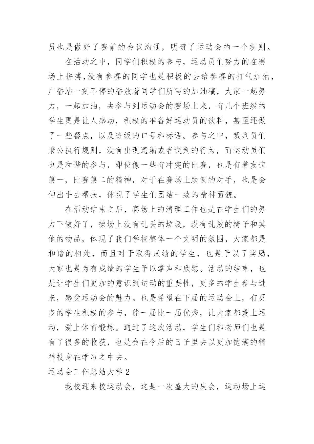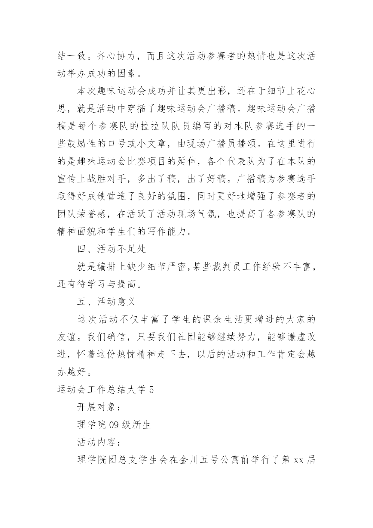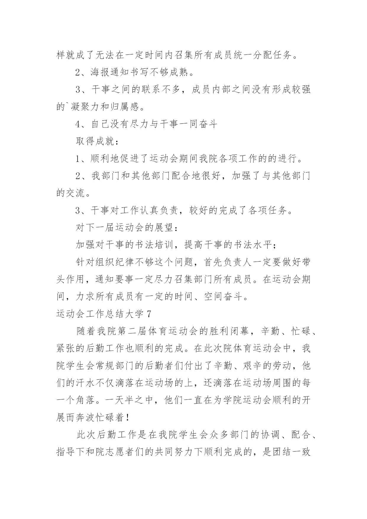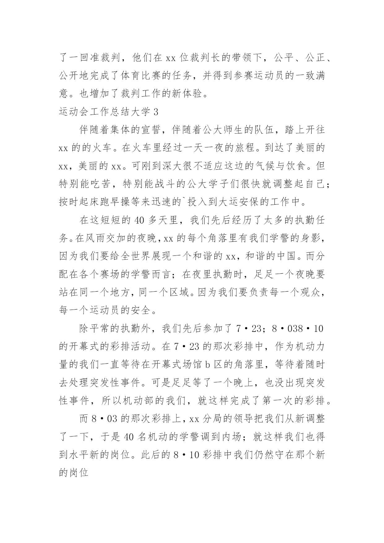 运动会工作总结大学运动会工作总结大学总结是把一定阶段内的有关情况分析研究,做出有指导性的经验方法以及结论的书面材料,它能使我们及时找出错误并改正,因此我们要做好归纳,写好总结。那么你知道总结如何写吗?下面是小编收集整理的运动会工作总结大学,仅供参考,希望能够帮助到大家。运动会工作总结大学1春季运动会结束了,回顾这次的活动,也是有很多的亮点,老师们工作认真,同学们都是积极地参与,在这次的活动之中,也是涌现了许多非常值得去颂扬的好现象,同时这次的春季运动会也是举办的很顺利,也是需要好好的去总结下。在活动开始之前,各班的老师们都是积极的准备,组织学生们报名,和往年的规模相比,也是更多的学生参与了进来,除了一些班级的确人员的问题,很多班级都是全部的项目都是有人参加,而且在这次的`运动会上,还有一些记录的产生,也是让大家感到欣喜的,准备的工作,老师们以及同学们都是做的很好,很早的时候,就确立了参赛的人员安排,并且提前去做了活动前的准备,而学校也是积极的把活动给办好,提前做好了计划,安排了活动的方案,对于裁判员也是做好了赛前的会议沟通,明确了运动会的一个规则。在活动之中,同学们积极的参与,运动员们努力的在赛场上拼搏,没有参赛的同学也是积极的去给参赛的打气加油,广播站一刻不停的播放着同学们所写的加油稿,大家一起努力,一起加油,去参与到运动会的赛场上来,有几个班级的学生更是让人感动,积极的准备好运动员的饮料,甚至还做了一些餐点,以及班级的口号和标语。参与之中,裁判员们秉公执行规则,没有出现遗漏或者误判的行为,而运动员们也是和谐的参与,即使像一些有冲突的比赛,也是有着友谊第一,比赛第二的精神,对于在赛场上跌倒的对手,也是会伸出手去帮扶,体现了学生们团结一致的精神面貌。在活动结束之后,赛场上的清理工作也是在学生们的努力下做好了,操场上没有乱丢的垃圾,没有乱放的椅子和其他的物品,体现了我们学校整体一个文明的氛围,大家都是和谐的相处,而且对于取得成绩的学生,也是予以了奖励,大家也是为有成绩的学生予以掌声和欣慰。活动的结束,也是让学生们更加的意识到运动的重要性,更多的学生参与进来,感受运动会的魅力。也是希望在下届的运动会上,有更多的学生积极的参与,能一届比一届优秀,让大家都爱上运动,爱上体育锻炼。通过了这次活动,学生们和老师们也是有了很多的收获,也是会在今后的日子里去以更加饱满的精神投身在学习之中去。运动会工作总结大学2我校迎来校运动会,这是一次盛大的庆会,运动场上运动员们充分发挥个人特色,展示自我体育方面的才能,一些教学一线的教师们也从容地担了一回准裁判,瞧他们是多么的认真啊,正是他们的努力,使这一届运动会能圆满、成功地举行。本次运动会上亮点无数可总结为以下几点:1、预备工作到位,及时开学初校行政会上校长就将此次运动会的相关工作安排提到工作日程上来,各部门工作安排就绪,校体育组的教师们积极配合,校德育处也立马在班主任例会,学生例会上将此项工作进行宣传,安排。使运动会前期工作得到顺利完成。2、发挥体育精神,不怕脏,不怕累运动会期间,xx位体育教师利用课余时间、双休日入校对学生进行训练指导,根据学校的特点、学生的特点、根据学校的场地,体育组的xx位教师发挥了体育不怕累,不怕脏的体育精神,对校运动会的`工作进行了全面的准备,这也是运动会成功开展的一个重要保证。3、发挥个人才能运动会前各班的体育骨干们,向xx等中国一代优秀的田径选手学习,发挥个人体育才能,带动班级体育爱好者一齐向更高、更快、更强努力,在秀中的田径赛场上贡献着自我的光和热,为班级争光,为团体争光。充分展示自我体育的才能。4、一次新体验运动会xx天里,身处教学一线的教师们彻彻底底地担了一回准裁判,他们在xx位裁判长的带领下,公平、公正、公开地完成了体育比赛的任务,并得到参赛运动员的一致满意。也增加了裁判工作的新体验。运动会工作总结大学3伴随着集体的宣誓,伴随着公大师生的队伍,踏上开往xx的的火车。在火车里经过一天一夜的旅程。到达了美丽的xx,美丽的xx。可刚到深大很不适应这边的气候与饮食。但特别能吃苦,特别能战斗的公大学子们很快就调整起自己;按时起床跑早操等来迅速的`投入到大运安保的工作中。在这短短的40多天里,我们先后经历了太多的执勤任务。在风雨交加的夜晚,xx的每个角落里有我们学警的身影,因为我们要给全世界展现一个和谐的xx,和谐的中国。而分配在各个赛场的学警而言;在夜里执勤时,足足一个夜晚要站在同一个地方,同一个区域。因为我们要负责每一个观众,每一个运动员的安全。除平常的执勤外,我们先后参加了7·23;8·038·10的开幕式的彩排活动。在7·23的那次彩排中,作为机动力量的我们一直等待在开幕式场馆b区的角落里,等待着随时去处理突发性事件。可是足足等了一个晚上,也没出现突发性事件,所以