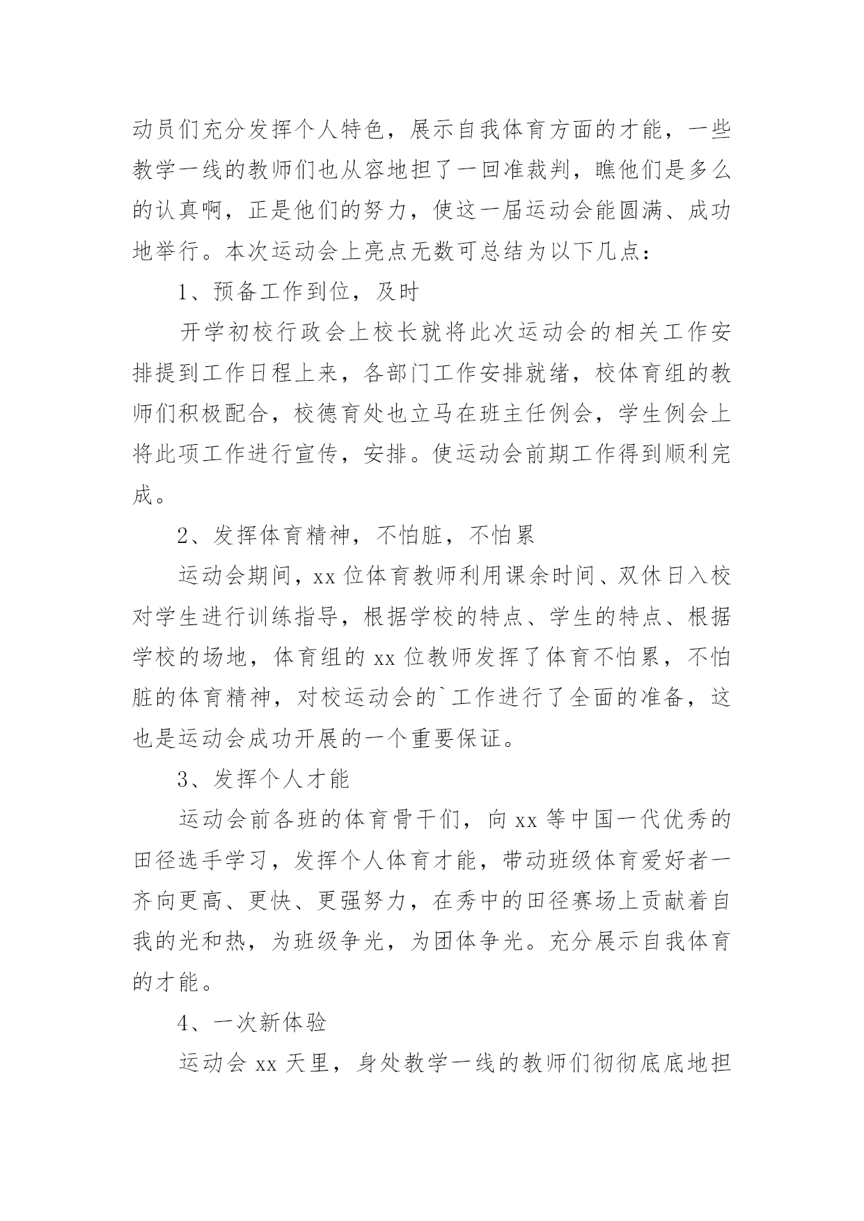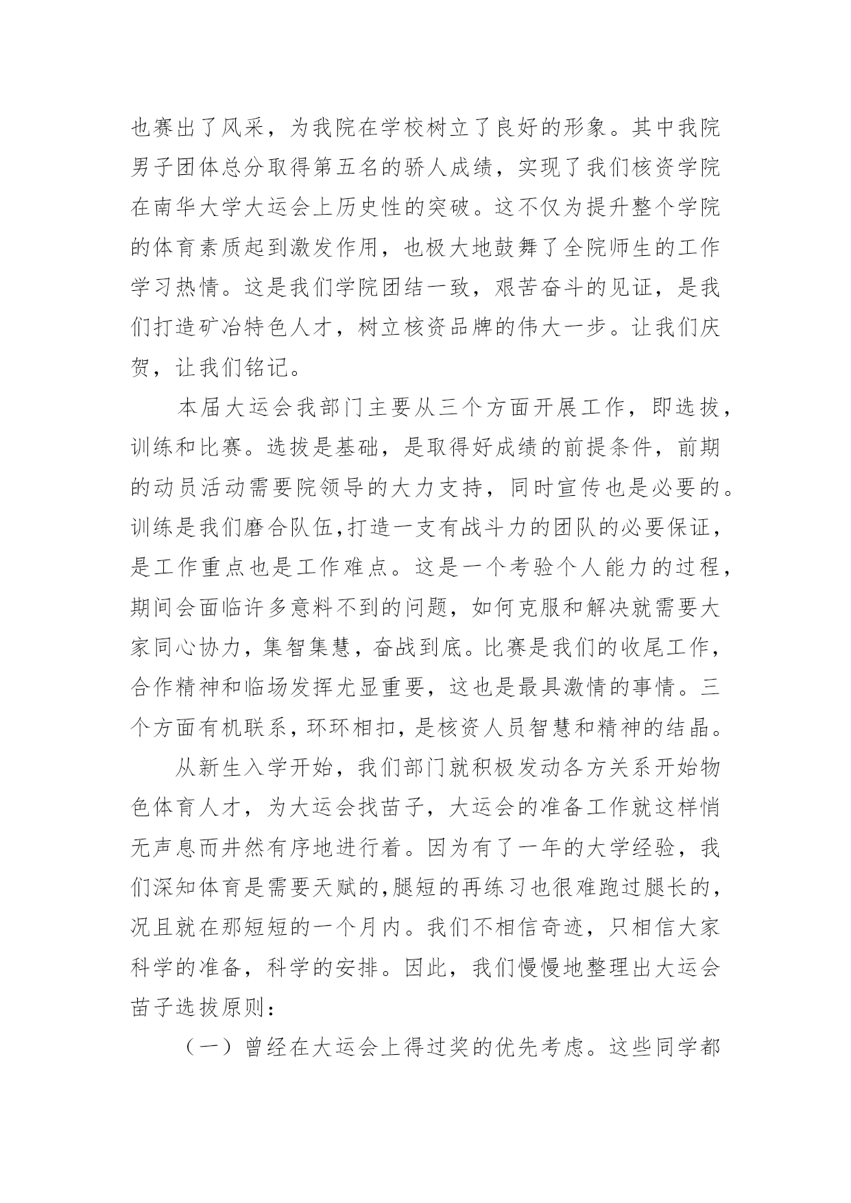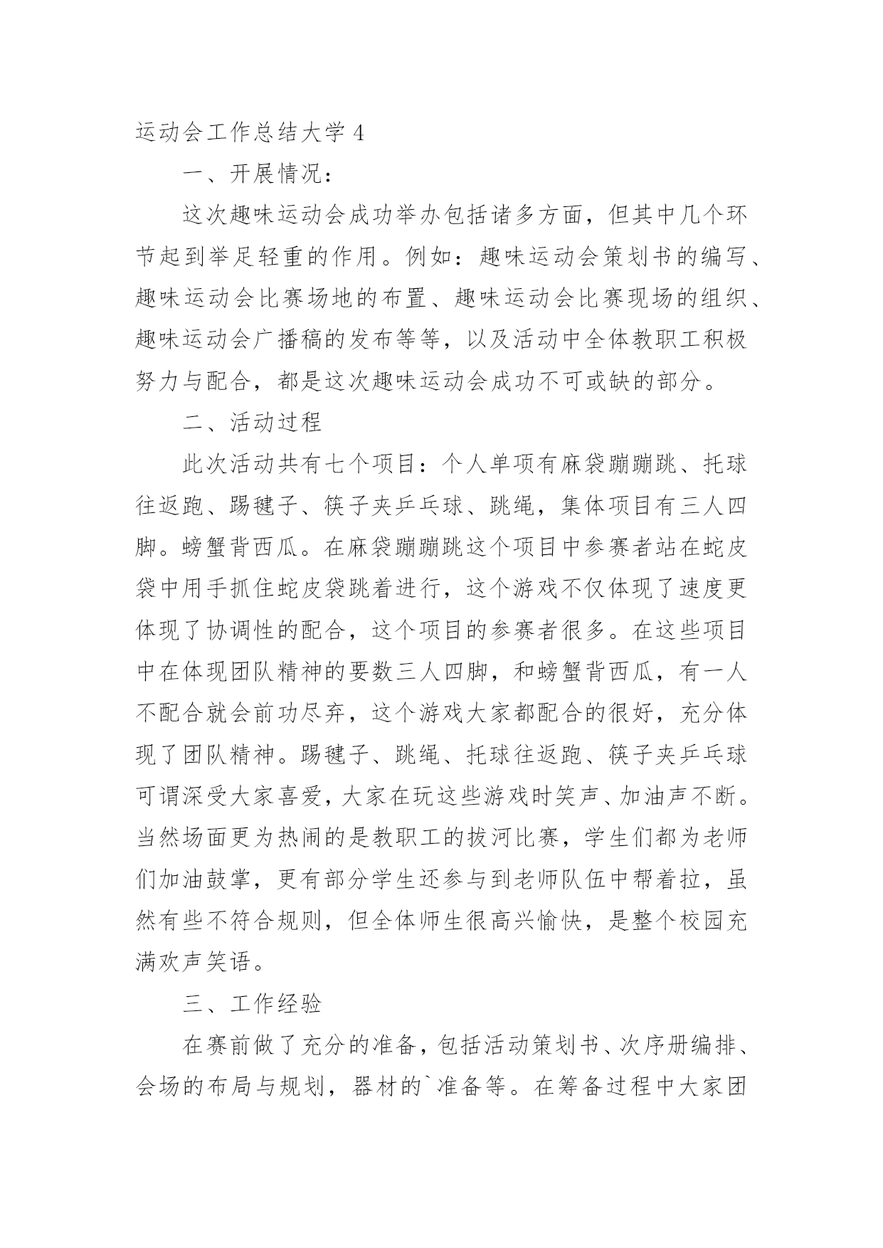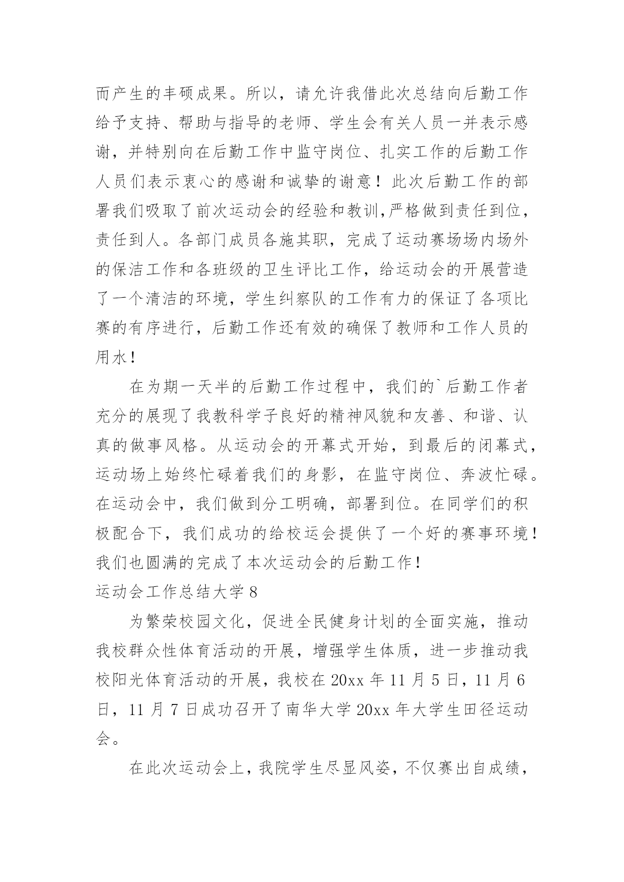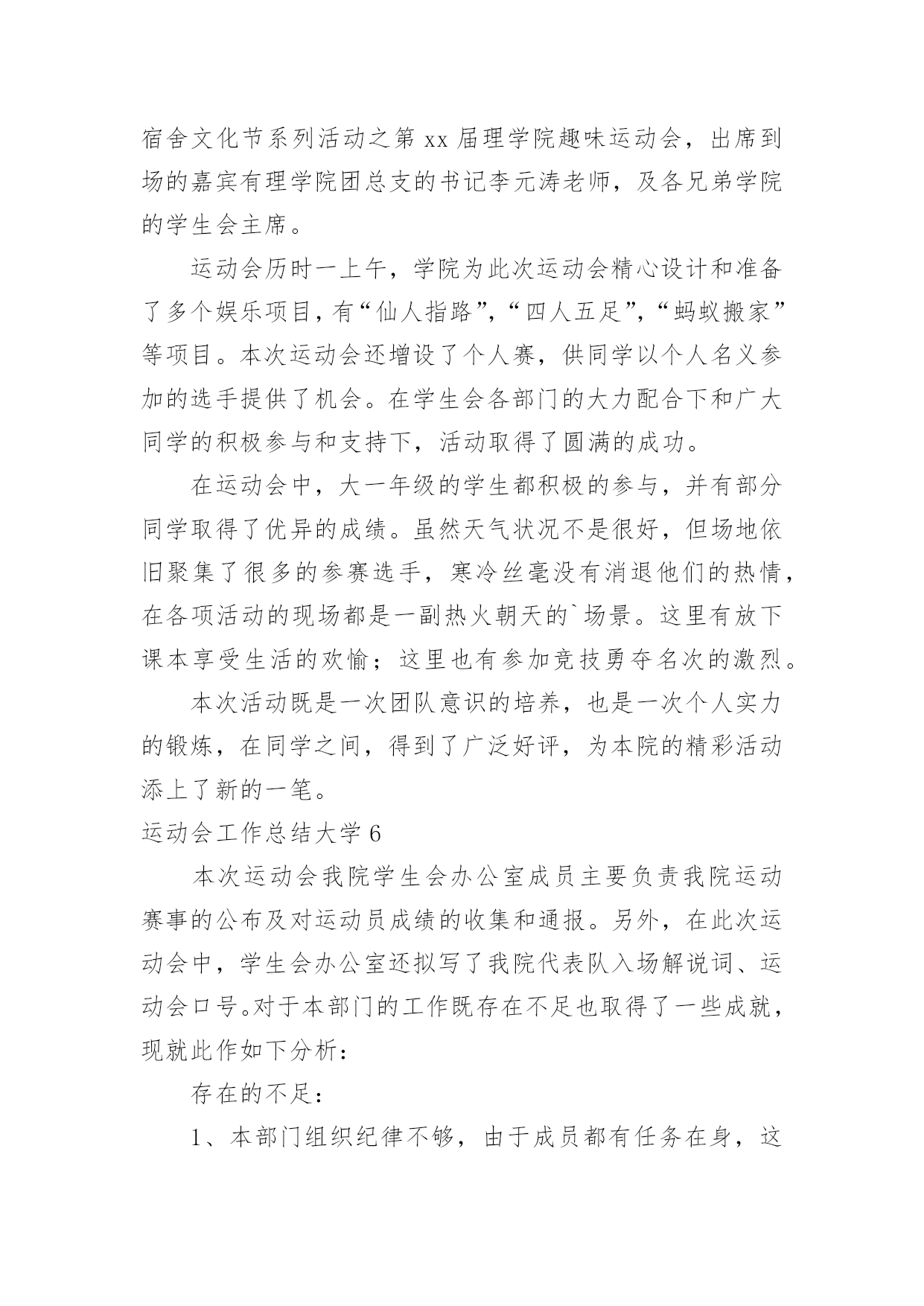 运动会工作总结大学运动会工作总结大学总结是把一定阶段内的有关情况分析研究,做出有指导性的经验方法以及结论的书面材料,它能使我们及时找出错误并改正,因此我们要做好归纳,写好总结。那么你知道总结如何写吗?下面是小编收集整理的运动会工作总结大学,仅供参考,希望能够帮助到大家。运动会工作总结大学1春季运动会结束了,回顾这次的活动,也是有很多的亮点,老师们工作认真,同学们都是积极地参与,在这次的活动之中,也是涌现了许多非常值得去颂扬的好现象,同时这次的春季运动会也是举办的很顺利,也是需要好好的去总结下。在活动开始之前,各班的老师们都是积极的准备,组织学生们报名,和往年的规模相比,也是更多的学生参与了进来,除了一些班级的确人员的问题,很多班级都是全部的项目都是有人参加,而且在这次的`运动会上,还有一些记录的产生,也是让大家感到欣喜的,准备的工作,老师们以及同学们都是做的很好,很早的时候,就确立了参赛的人员安排,并且提前去做了活动前的准备,而学校也是积极的把活动给办好,提前做好了计划,安排了活动的方案,对于裁判员也是做好了赛前的会议沟通,明确了运动会的一个规则。在活动之中,同学们积极的参与,运动员们努力的在赛场上拼搏,没有参赛的同学也是积极的去给参赛的打气加油,广播站一刻不停的播放着同学们所写的加油稿,大家一起努力,一起加油,去参与到运动会的赛场上来,有几个班级的学生更是让人感动,积极的准备好运动员的饮料,甚至还做了一些餐点,以及班级的口号和标语。参与之中,裁判员们秉公执行规则,没有出现遗漏或者误判的行为,而运动员们也是和谐的参与,即使像一些有冲突的比赛,也是有着友谊第一,比赛第二的精神,对于在赛场上跌倒的对手,也是会伸出手去帮扶,体现了学生们团结一致的精神面貌。在活动结束之后,赛场上的清理工作也是在学生们的努力下做好了,操场上没有乱丢的垃圾,没有乱放的椅子和其他的物品,体现了我们学校整体一个文明的氛围,大家都是和谐的相处,而且对于取得成绩的学生,也是予以了奖励,大家也是为有成绩的学生予以掌声和欣慰。活动的结束,也是让学生们更加的意识到运动的重要性,更多的学生参与进来,感受运动会的魅力。也是希望在下届的运动会上,有更多的学生积极的参与,能一届比一届优秀,让大家都爱上运动,爱上体育锻炼。通过了这次活动,学生们和老师们也是有了很多的收获,也是会在今后的日子里去以更加饱满的精神投身在学习之中去。运动会工作总结大学2我校迎来校运动会,这是一次盛大的庆会,运动场上运动员们充分发挥个人特色,展示自我体育方面的才能,一些教学一线的教师们也从容地担了一回准裁判,瞧他们是多么的认真啊,正是他们的努力,使这一届运动会能圆满、成功地举行。本次运动会上亮点无数可总结为以下几点:1、预备工作到位,及时开学初校行政会上校长就将此次运动会的相关工作安排提到工作日程上来,各部门工作安排就绪,校体育组的教师们积极配合,校德育处也立马在班主任例会,学生例会上将此项工作进行宣传,安排。使运动会前期工作得到顺利完成。2、发挥体育精神,不怕脏,不怕累运动会期间,xx位体育教师利用课余时间、双休日入校对学生进行训练指导,根据学校的特点、学生的特点、根据学校的场地,体育组的xx位教师发挥了体育不怕累,不怕脏的体育精神,对校运动会的`工作进行了全面的准备,这也是运动会成功开展的一个重要保证。3、发挥个人才能运动会前各班的体育骨干们,向xx等中国一代优秀的田径选手学习,发挥个人体育才能,带动班级体育爱好者一齐向更高、更快、更强努力,在秀中的田径赛场上贡献着自我的光和热,为班级争光,为团体争光。充分展示自我体育的才能。4、一次新体验运动会xx天里,身处教学一线的教师们彻彻底底地担了一回准裁判,他们在xx位裁判长的带领下,公平、公正、公开地完成了体育比赛的任务,并得到参赛运动员的一致满意。也增加了裁判工作的新体验。运动会工作总结大学3伴随着集体的宣誓,伴随着公大师生的队伍,踏上开往xx的的火车。在火车里经过一天一夜的旅程。到达了美丽的xx,美丽的xx。可刚到深大很不适应这边的气候与饮食。但特别能吃苦,特别能战斗的公大学子们很快就调整起自己;按时起床跑早操等来迅速的`投入到大运安保的工作中。在这短短的40多天里,我们先后经历了太多的执勤任务。在风雨交加的夜晚,xx的每个角落里有我们学警的身影,因为我们要给全世界展现一个和谐的xx,和谐的中国。而分配在各个赛场的学警而言;在夜里执勤时,足足一个夜晚要站在同一个地方,同一个区域。因为我们要负责每一个观众,每一个运动员的安全。除平常的执勤外,我们先后参加了7·23;8·038·10的开幕式的彩排活动。在7·23的那次彩排中,作为机动力量的我们一直等待在开幕式场馆b区的角落里,等待着随时去处理突发性事件。可是足足等了一个晚上,也没出现突发性事件,所以