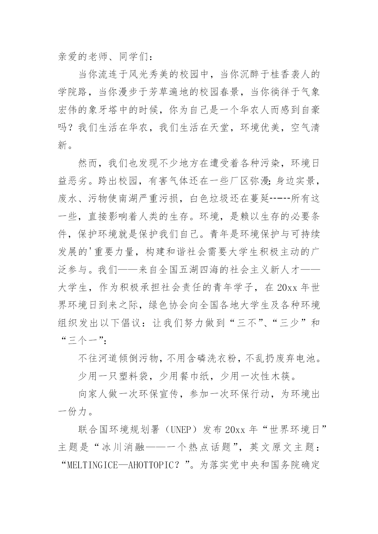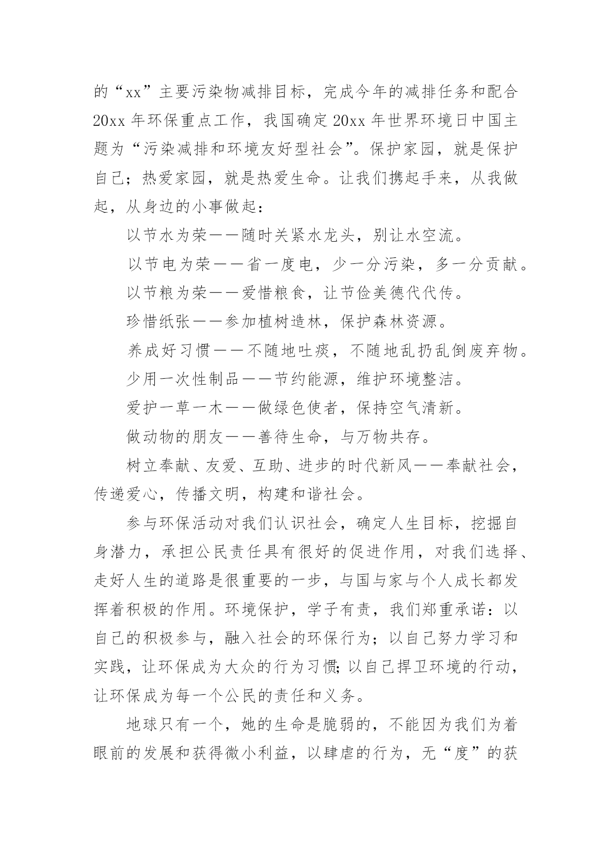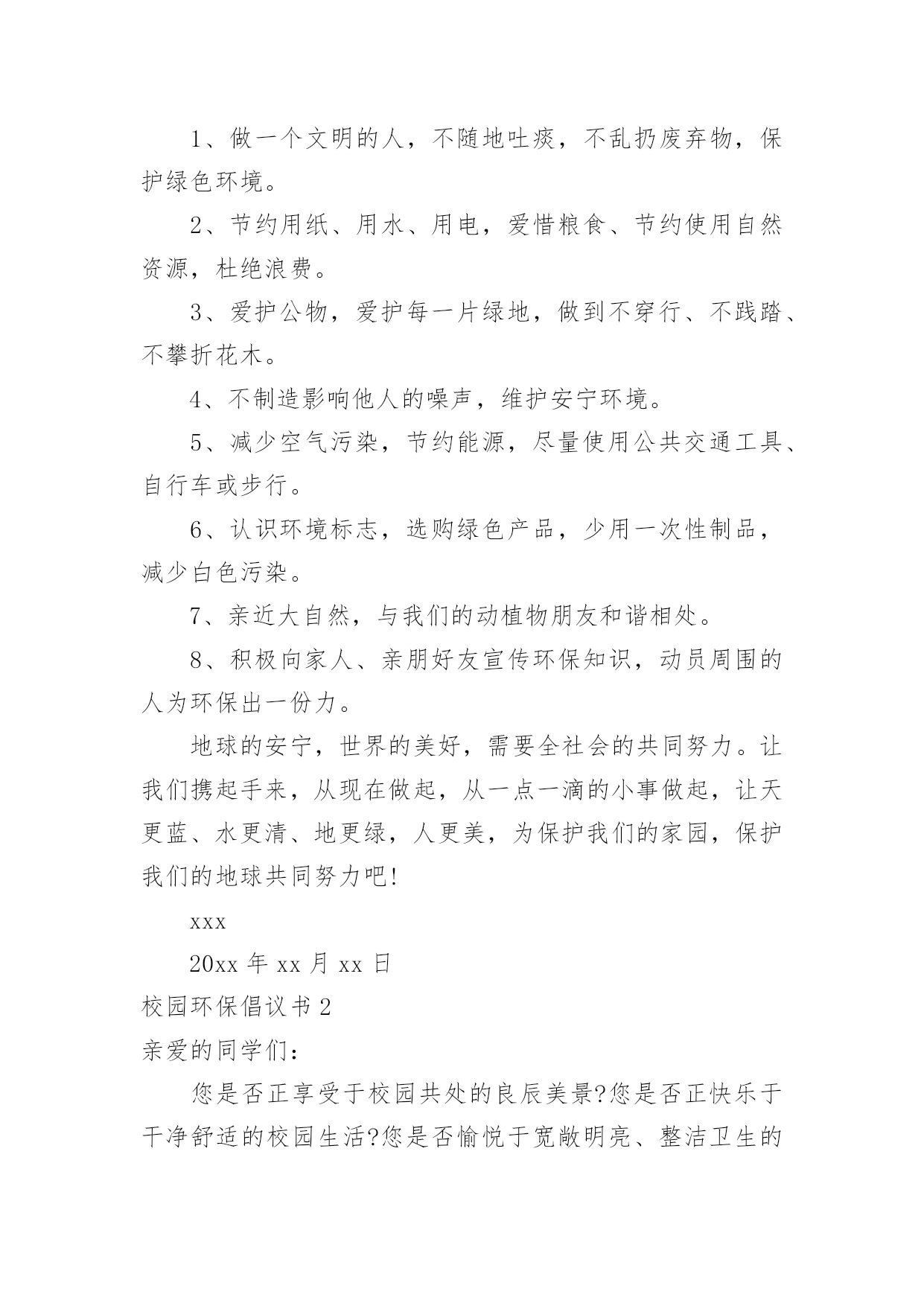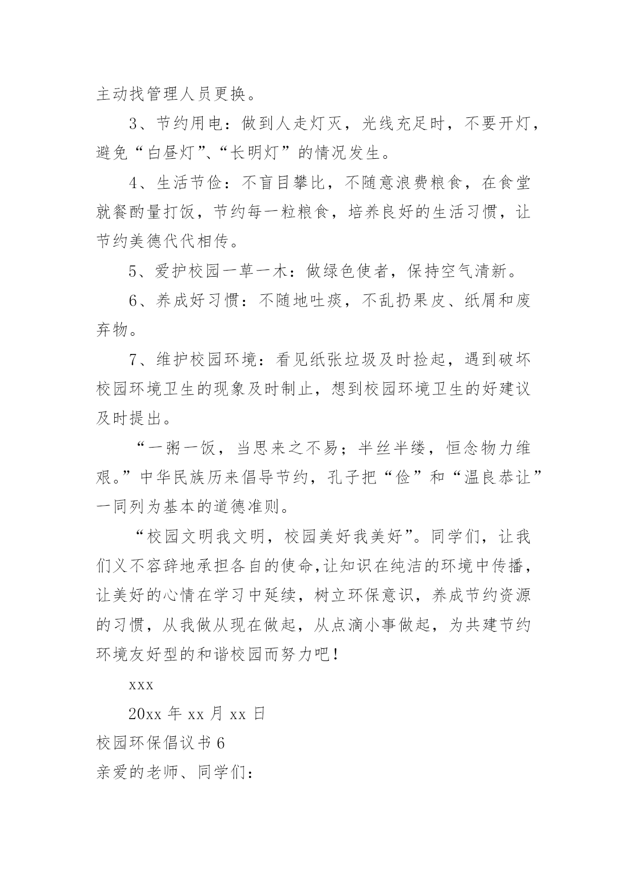 校园环保倡议书校园环保倡议书15篇(精选)在生活中,倡议书与我们的生活息息相关,使用正确的写作思路书写倡议书会更加事半功倍。还是对倡议书一筹莫展吗?以下是小编精心整理的校园环保倡议书,欢迎大家分享。校园环保倡议书1尊敬的各位家长、亲爱的小朋友们:我们每个人都希望生活在一个清洁、舒适的环境中。但是,我们共有的家园地球,却由于人类的肆意破坏、污染、浪费,已经失去了往日的美丽,环境污染已成为影响我们生活的一大问题。我们渴望美丽的地球、绿色的家园、湛蓝的天空、清新的.空气。美丽的环境需要我们共同营造,文明的习惯靠我们平时一点一滴地养成。爱护地球、保护环境,从我做起。我们开展了:爱护花草树木、保护小动物、珍惜水资源、节约用电等丰富多彩的系列专题教育活动中。孩子们知道了各种环保标志、动植物知识,了解了动植物与人类生活的关系、废物回收的有关知识。在树木认养活动中,孩子们懂得了如何保护、爱惜树木。环保小卫士活动,让孩子们成为了环境的主人,增强了自豪感和任务意识。为了让地球更美,让家园更绿,我园向广大家长、小朋友们倡议:1、做一个文明的人,不随地吐痰,不乱扔废弃物,保护绿色环境。2、节约用纸、用水、用电,爱惜粮食、节约使用自然资源,杜绝浪费。3、爱护公物,爱护每一片绿地,做到不穿行、不践踏、不攀折花木。4、不制造影响他人的噪声,维护安宁环境。5、减少空气污染,节约能源,尽量使用公共交通工具、自行车或步行。6、认识环境标志,选购绿色产品,少用一次性制品,减少白色污染。7、亲近大自然,与我们的动植物朋友和谐相处。8、积极向家人、亲朋好友宣传环保知识,动员周围的人为环保出一份力。地球的安宁,世界的美好,需要全社会的共同努力。让我们携起手来,从现在做起,从一点一滴的小事做起,让天更蓝、水更清、地更绿,人更美,为保护我们的家园,保护我们的地球共同努力吧!xxx20xx年xx月xx日校园环保倡议书2亲爱的同学们:您是否正享受于校园共处的良辰美景?您是否正快乐于干净舒适的校园生活?您是否愉悦于宽敞明亮、整洁卫生的学习环境?然而,在我们的'生活中,一个小小的行为都可能留下永久令人痛心的踪迹,看看走廊白色围墙上跳动的足迹音符,看看绿色草地上悠闲躺着的废纸果皮,再看看身着厚厚灰尘的宣传栏……相信每一位同学都不会目视校园环境被污染而无动于衷。自然万物的生长需要每个人的维持,我们的生活环境要靠大家,因此,电子工程系通信q0941班团支部、电子q1041班团支部、电子s1021班团支部向全校师生提议:以节水为荣——随时关紧水龙头,别让水空流。以节电为荣——省一度电,少一分污染,多一分贡献。养成良好习惯——不随地吐痰,不随地乱扔乱倒垃圾。少用一次性制品-节约能源,维护环境整洁。爱护一草一木——做绿色使者,保持空气清新。树立奉献、友爱、互助、进步的时代新风——奉献社会、传递爱心、传播文明、构建和谐社会,促进社会进步。让我们为良好校园环境的建设,尽一份义务吧!从身边小事做起,养成文明习惯,完善自身修养,提升自身的素质,展现学子良好的精神风貌,做好大国民,从我们做起!从学子做起!此致敬礼!倡议人:xx20xx年xx月xx日校园环保倡议书3亲爱的老师、同学们:当你流连于风光秀美的校园中,当你沉醉于桂香袭人的学院路,当你漫步于芳草遍地的校园春景,当你徜徉于气象宏伟的象牙塔中的时候,你为自己是一个华农人而感到自豪吗?我们生活在华农,我们生活在天堂,环境优美,空气清新。然而,我们也发现不少地方在遭受着各种污染,环境日益恶劣。跨出校园,有害气体还在一些厂区弥漫;身边实景,废水、污物使南湖严重污损,白色垃圾还在蔓延┄┄所有这一些,直接影响着人类的生存。环境,是赖以生存的必要条件,保护环境就是保护我们自己。青年是环境保护与可持续发展的'重要力量,构建和谐社会需要大学生积极主动的广泛参与。我们——来自全国五湖四海的社会主义新人才——大学生,作为积极承担社会责任的青年学子,在20xx年世界环境日到来之际,绿色协会向全国各地大学生及各种环境组织发出以下倡议:让我们努力做到“三不”、“三少”和“三个一”:不往河道倾倒污物,不用含磷洗衣粉,不乱扔废弃电池。少用一只塑料袋,少用餐巾纸,少用一次性木筷。向家人做一次环保宣传,参加一次环保行动,为环境出一份力。联合国环境规划署(UNEP)发布20xx年“世界环境日”主题是“冰川消融——一个热点话题”,英文原文主题:“MELTINGICE—AHOTTOPIC?”。为落实党中央和国务院确定的“xx”主要污染物减排目标,完成今年的减排任务和配合20xx年环保重点工作,我国确定20xx年世界环境日中国主题为“污染减排和环境友好型社会”。保护家园,就是保护自己;热爱家园,就是热爱生命。让我们携起手来,从我做起,从身边的小事做起:以节水为荣――随时关紧水龙头,别让水