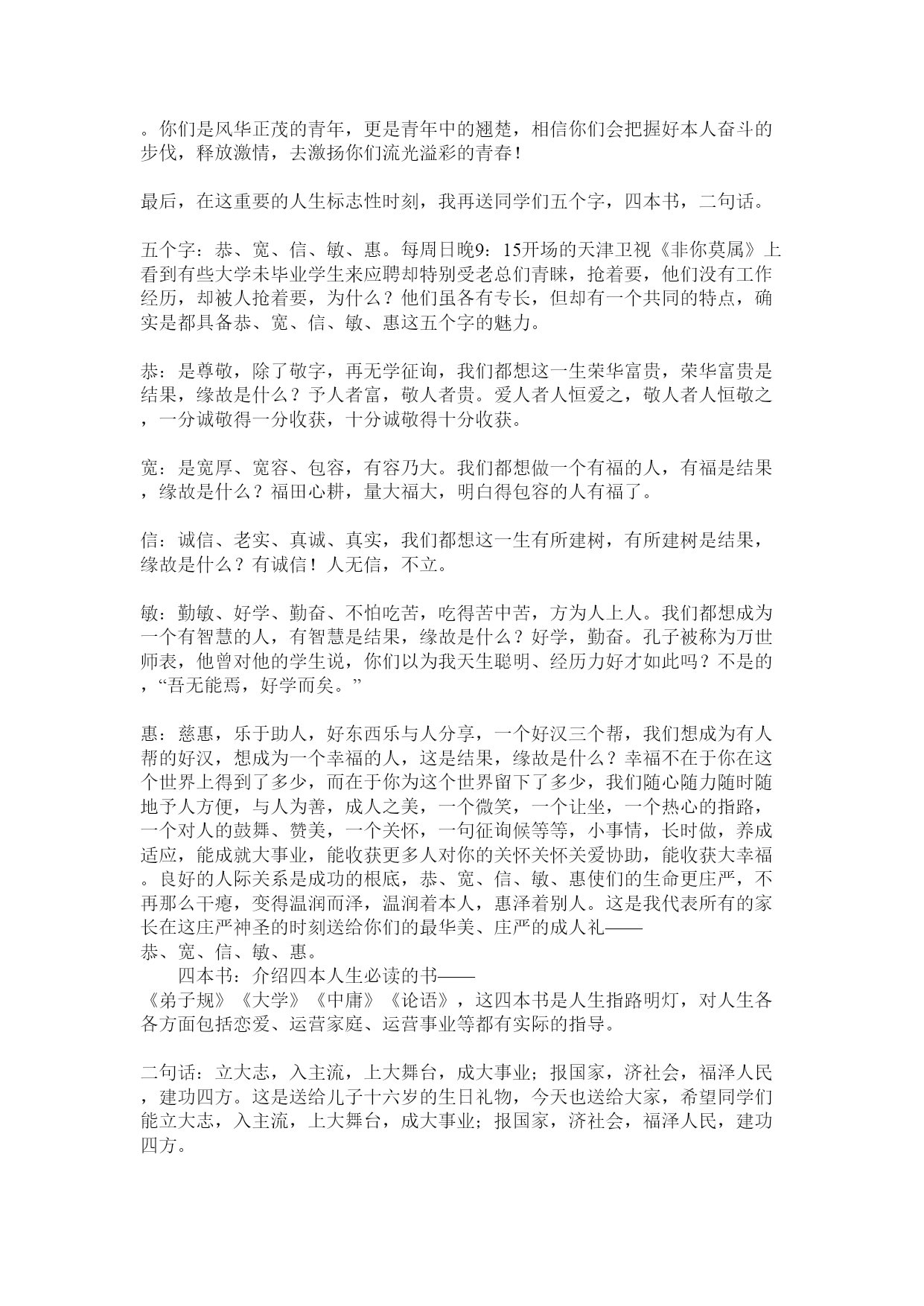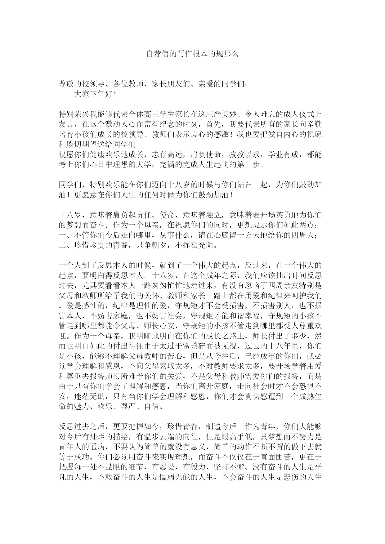 自荐信的写作根本的规那么尊敬的校领导、各位教师、家长朋友们、亲爱的同学们:大家下午好!特别荣兴我能够代表全体高三学生家长在这庄严美妙、令人难忘的成人仪式上发言。在这个激动人心而富有纪念的时刻,首先,我要代表所有的家长向辛勤培育小孩们成长的校领导、教师们表示衷心的感激!我也要把发自内心的祝愿和殷切期望送给同学们——祝愿你们健康欢乐地成长,志存高远,肩负使命,孜孜以求,学业有成,都能考上你们心目中理想的大学,完满的完成人生起飞的第一步。同学们,特别欢乐能在你们迈向十八岁的时候与你们站在一起,为你们鼓劲加油!更愿意在你们人生的任何时候为你们鼓劲加油!十八岁,意味着肩负起责任、使命,意味着独立,意味着要开场英勇地为你们的梦想而奋斗。作为一个母亲,在祝愿你们的同时,更想提示你们如此两点:一、不管你们今后走向哪里,从事什么,请在心底留一方天地给你的四周人;二、珍惜珍贵的青春,只争朝夕,不挥霍光阴。一个人到了反思本人的时候,就到了一个伟大的起点,反过来,在一个伟大的起点,要明白得反思本人。十八岁,在这个成年之际,我们应该抽出时间反思过去,尤其要看看本人一路匆匆忙忙地走过来,有没有忽略了四周亲友特别是父母和教师所给予我们的关怀。教师和家长一路上都在用爱和纪律来呵护我们。爱是感性的,纪律是理性的爱,守规矩才不会受损害,不损害别人,也不损害本人,不妨害家庭,也不妨害社会,守规矩才能和谐幸福,守规矩的小孩不管走到哪里都能令父母、师长心安,守规矩的小孩不管走到哪里都受人尊重欢迎。作为一个母亲,我明晰地明白在你们的成长之路上,师长付出了多少,然而也明白如此的付出往往由于太过平常琐碎而被无视,过去的十八年里,你们是小孩,能够不理解父母教师的苦心,但是从今往后,已经成年的你们,就必须学会理解和感恩,不向父母索取太多,不对教师要求太多,要开场学着用爱和尊重去报答师长所难予你们的关爱,不是父母和教师需要你们的报答,而是由于只有你们学会了理解和感恩,当你们离开家庭,走向社会时才不会恐惧不安,迷茫无助,只有当你们学会理解和感恩,你们才会真切感遭到一个成熟生命的魅力、欢乐、尊严、自信。反思过去之后,更要把握如今,珍惜青春,制造今后。作为青年,你们大能够对今后有灿烂的描绘,有温步云端的向往,但是眼高手低,只梦想而不努力是青年人的通病,不要认为简单的就没有意义,简单的动作不断不懈的做下去就等于成功。你们必须用奋斗来实现理想,而奋斗不仅仅在于直面困苦,更在于把握每一处不显眼的细节,有忍受、有毅力、坚持不懈。没有奋斗的人生是平凡的人生,不敢奋斗的人生是懦弱无能的人生,不会奋斗的人生是悲伤的人生。你们是风华正茂的青年,更是青年中的翘楚,相信你们会把握好本人奋斗的步伐,释放激情,去激扬你们流光溢彩的青春!最后,在这重要的人生标志性时刻,我再送同学们五个字,四本书,二句话。五个字:恭、宽、信、敏、惠。每周日晚9:15开场的天津卫视《非你莫属》上看到有些大学未毕业学生来应聘却特别受老总们青睐,抢着要,他们没有工作经历,却被人抢着要,为什么?他们虽各有专长,但却有一个共同的特点,确实是都具备恭、宽、信、敏、惠这五个字的魅力。恭:是尊敬,除了敬字,再无学征询,我们都想这一生荣华富贵,荣华富贵是结果,缘故是什么?予人者富,敬人者贵。爱人者人恒爱之,敬人者人恒敬之,一分诚敬得一分收获,十分诚敬得十分收获。宽:是宽厚、宽容、包容,有容乃大。我们都想做一个有福的人,有福是结果,缘故是什么?福田心耕,量大福大,明白得包容的人有福了。信:诚信、老实、真诚、真实,我们都想这一生有所建树,有所建树是结果,缘故是什么?有诚信!人无信,不立。敏:勤敏、好学、勤奋、不怕吃苦,吃得苦中苦,方为人上人。我们都想成为一个有智慧的人,有智慧是结果,缘故是什么?好学,勤奋。孔子被称为万世师表,他曾对他的学生说,你们以为我天生聪明、经历力好才如此吗?不是的,“吾无能焉,好学而矣。”惠:慈惠,乐于助人,好东西乐与人分享,一个好汉三个帮,我们想成为有人帮的好汉,想成为一个幸福的人,这是结果,缘故是什么?幸福不在于你在这个世界上得到了多少,而在于你为这个世界留下了多少,我们随心随力随时随地予人方便,与人为善,成人之美,一个微笑,一个让坐,一个热心的指路,一个对人的鼓舞、赞美,一个关怀,一句征询候等等,小事情,长时做,养成适应,能成就大事业,能收获更多人对你的关怀关怀关爱协助,能收获大幸福。良好的人际关系是成功的根底,恭、宽、信、敏、惠使们的生命更庄严,不再那么干瘪,变得温润而泽,温润着本人,惠泽着别人。这是我代表所有的家长在这庄严神圣的时刻送给你们的最华美、庄严的成人礼——恭、宽、信、敏、惠。四本书:介绍四本人生必读的书——《弟子规》《大学》《中庸》《论语》,这四本书是人生指路明灯,对人生各