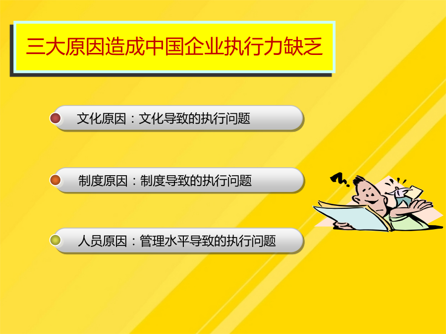 案例一:我们周围是否有这种现象?约哈里窗内部客户vs外部客户公司价值链内部客户完成执行的能力和手段三大原因造成中国企业执行力缺乏惠普执行力模型企业文化建立匿名的同事反馈系统WBS会被分成4致7个大类高效执行力的七种领导行为TARGET/GOAL(Metrics)把小区业主的满意度从50%,提高到75%企业文化是企业在经营活动中形成的经营理念、经营目的、经营方针、价值观念、经营行为、社会责任、经营形象等的总和这个事件发生之后,报纸与电视对李文哲的勇敢表现大肆宣扬,将他捧为英雄。面对现实/体纳现状4、不知道干好了有什么好处风险控制矩阵RiskManagement前总统艾森豪威尔主要业务问题分析CBI“观乎天文,以察时变”上级必须知道你正在做什么上级必须知道可以期望你什么DEPARTMENT:企业文化的三个层面第二章执行人才修炼—三意Committed承担者Victim牺牲者执行的内涵主动性层级执行的层次管理者的角色某日晚上九点半左右,某大卖场出纳员李文哲正在清点现金存量。一个身体魁梧的匪徒突然持枪指令他交出全部现金。李文哲照办。匪徒在无任何阻碍之下冲出大卖场大门,并跳进一部在外接应的车子。李文哲一俟该匪徒冲出大门,立刻按警铃,并且在几十秒之内跳上停放在大卖场门口那辆属于自己的摩托车,死命地追逐匪车。在某一铁道路口,适逢火车经过,匪车不得不停下来,李文哲就在这个时候赶到。说时迟那时快,李文哲逮住其中的一个匪徒。纠缠中,李文哲的左腿挨了一枪,但他仍不放弃。就在那千钧一发的时候,警车开到了,不但替李文哲解了围,而且也逮捕了两个匪徒。这个事件发生之后,报纸与电视对李文哲的勇敢表现大肆宣扬,将他捧为英雄。但是,大卖场的高阶主管却为这事件伤透脑筋。该大卖场对付抢劫的一贯是:1、完全依照匪徒的要求行事,以避免员工或在场的顾客受到伤害;2、在无安全顾虑时立即按警铃;3、等待警方及公司前来处理善后事宜。违反这个任一者,一律开除。该大卖场总经理认为,李文哲既然违反了上的要求,按规定应予开除。人事处处长认为,李文哲忠于职守的英勇表现,应该可以抵销他违反之过失。公共关系处处长认为,一旦李文哲被开除,则社会大众对大卖场之作为将难以谅解。训练处处长认为,假如大卖场的既定不能贯彻,则势必将导致纪律废驰之后果。立法从?(宽or严)执法从?(宽or严)讲师说明:有情的领导无情的管理绝情的制度万科成功的关键36目标管理目标管理的由来及理论基础目标的层次体系企业年度经营管理计划书企业战略规划十步法:内在关系模型PREPAREDBY:计划的作用凡事预则立,不预则废。《礼记▪中庸》工作计划工作计划包含的基本要素如何从目标到工作计划的模型某物业公司目标计划制定OGSM是?OGSM举例OGSM的关系OGSM的对应关系OGSM层次关系构想措施的方法头脑风暴支配原则制定工作计划的一般流程工作计划制定工具逻辑树分析逻辑树的关键原则逻辑树练习工作任务分解结构(WorkBreakdownStructure)为顺利完成项目所需要的所有任务和活动的逻辑组成关系WBS范例产品研发,技术,系统开发在工作或作业中存在着产品加工或服务的提供与被提供关系意外是一种大失面子的羞耻高效执行力的七种领导行为“我不能…“,“假如…,则.A,事情发生后,立即辞退了李文哲建立匿名的同事反馈系统高效执行的七种领导行为领导布置了一项工作,自己已提交了方案计划,并报领导审批。Objectives目的确定明确的目标和实现目标的顺序B,一周后,公司工会主席前往李文哲家中慰问,送去Step7:财务分析TARGET/GOAL(Metrics)4、不知道干好了有什么好处Empathy,仔细聆听,善意回应(同理心)把小区业主的满意度从50%,提高到75%将问题的各个部分解决好,即可解决整个问题工作任务分解结构的要求练习:办公室搬家识别并评价风险的严重程度(高H,中M,低L)OGSM计划表为什么员工的工作结果跟领导的期望总是有差距?委派沟通的步骤满足个人需要的基本原则KeyPrinciples,KP步骤与技巧行动跟踪表现场督导两方法员工是问题的解决者,领导是做决定的人!员工寻求帮助的SOS法人们不会做你希望的,只会做你检查的——郭士纳如何与上级相处决不要辩解凡是已经决定了的,就是对的让领导做选择题让上级按自己的方式行事及时向上级汇报情况提交报告vs汇报不要让上级感到意外高效执行力的七种领导行为小结谢谢观看