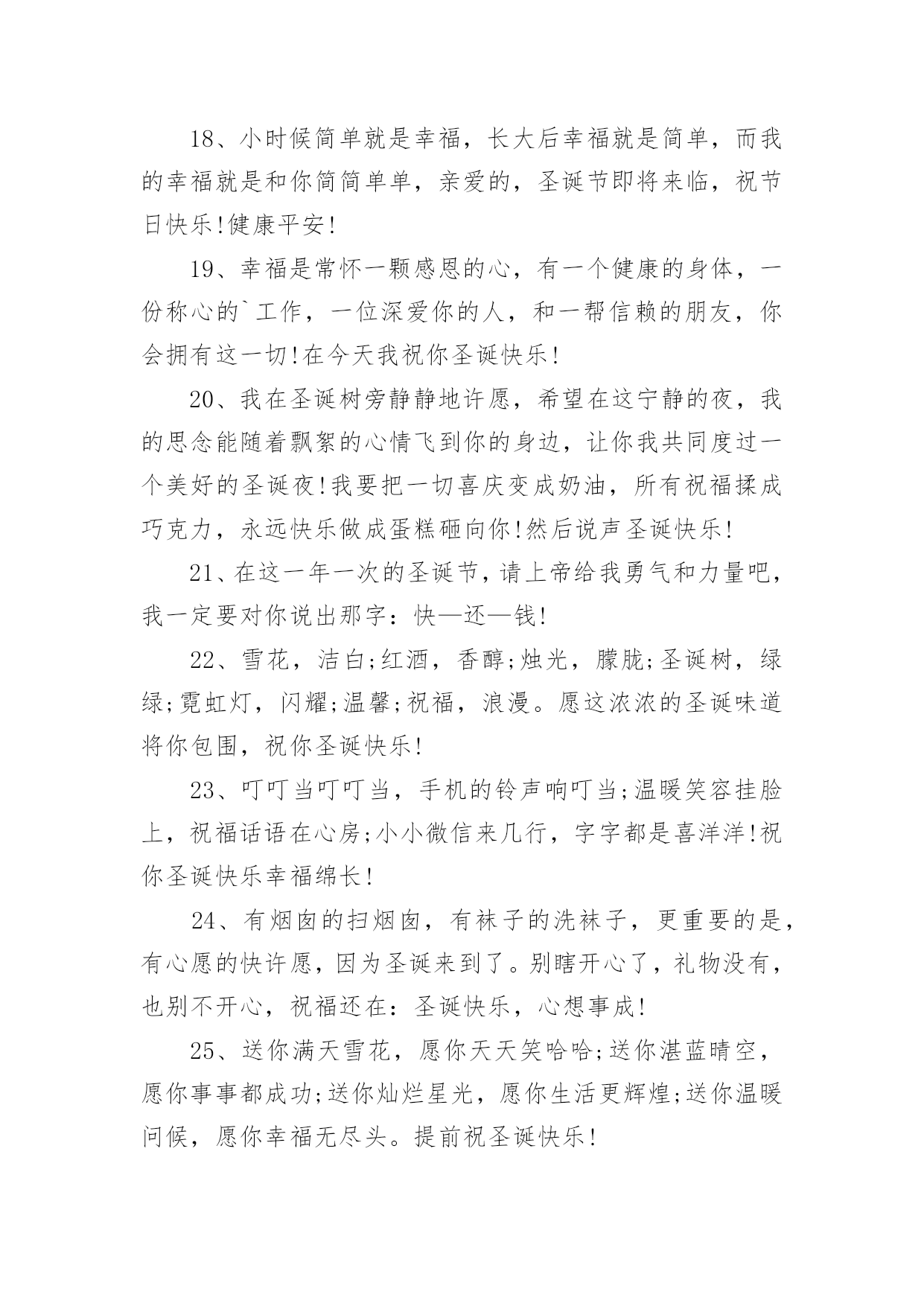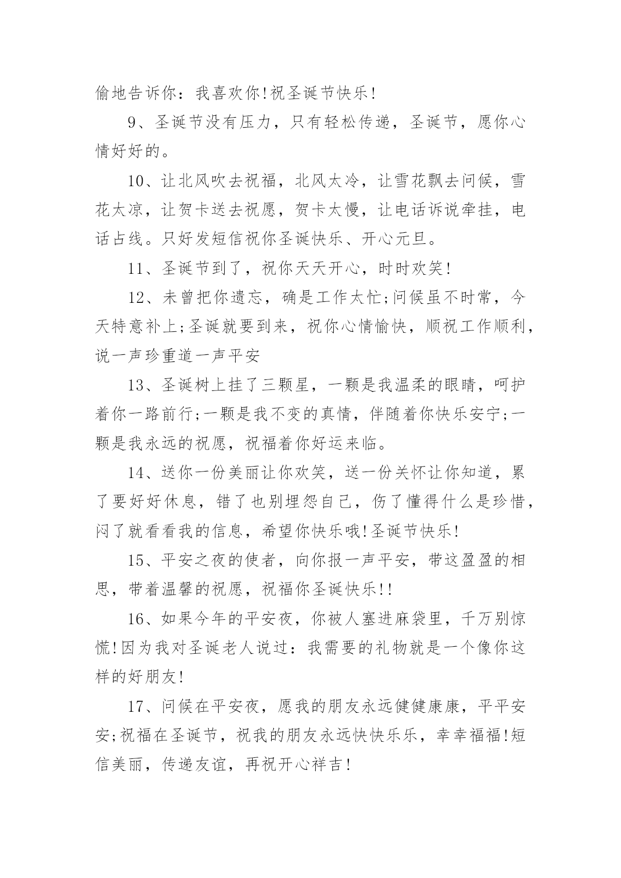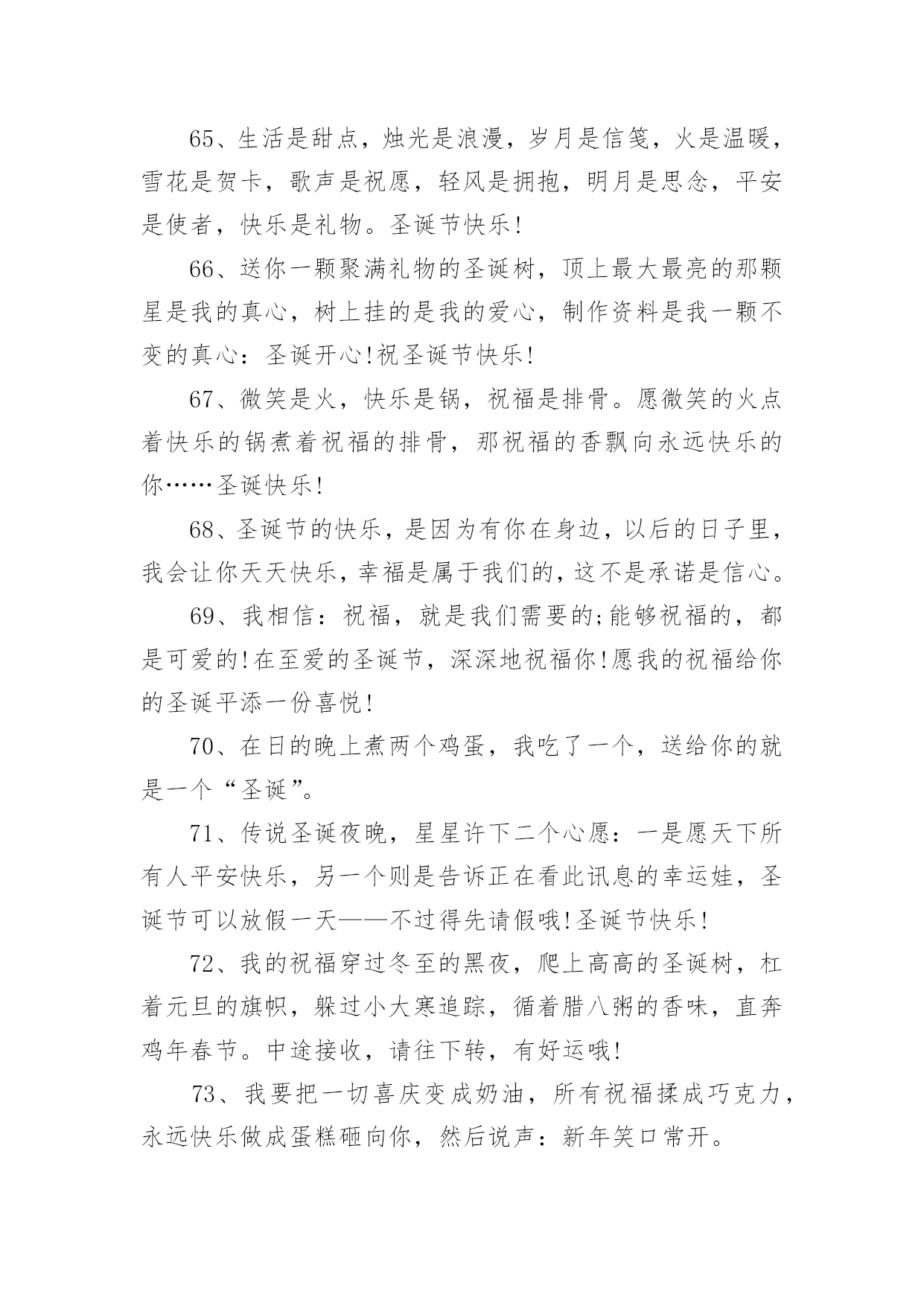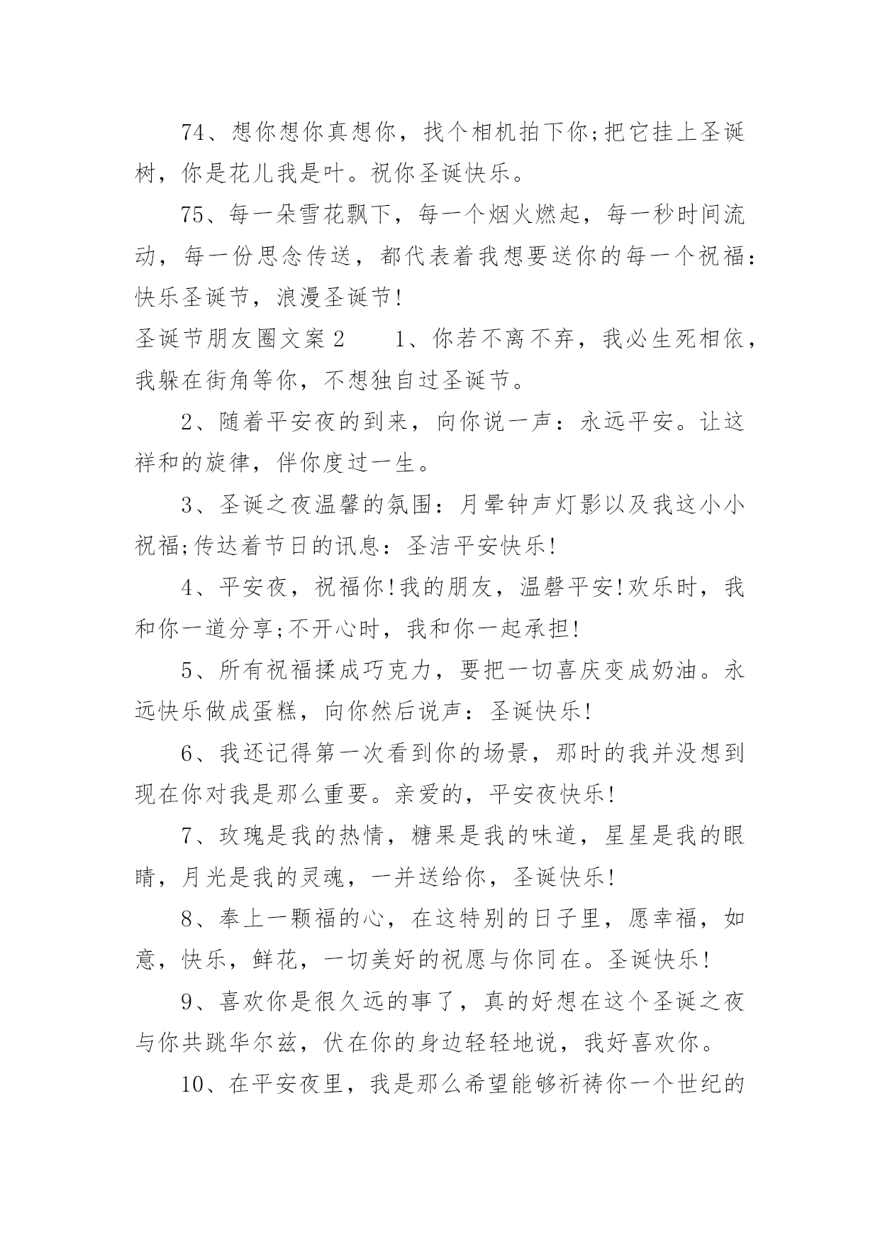 圣诞节朋友圈文案[必备]圣诞节朋友圈文案在学习、工作、生活中,大家都接触过很多优秀的文案吧,文案在生活中是比较重要的一种宣传形式。那什么样的文案才算得上是经典呢?以下是小编收集整理的圣诞节朋友圈文案,希望对大家有所帮助。圣诞节朋友圈文案11、爱情的道路上,爱情是美丽的传奇,是平凡的故事;也正如我与你相见时的哪一瞬间,一见钟情,一世倾心;圣诞节,我愿固守我俩的爱情天长地久,祝节日快乐!2、请记住这个微笑,那是我对你的祝福,圣诞快乐!3、如果有个胖红衣老人从窗户爬进你屋子把你装进口袋不要怕因为我对圣诞老人说“想要你这样的朋友”。4、悦耳的钟声迎来圣诞,快乐时分爱上了坏蛋。在这幸福的夜晚,我是要圣诞,还是要坏蛋?请你告诉我,坏蛋!5、圣诞节快快乐乐!心境开开心心!生意红红火火!好运由我的祝福扎堆!恭祝冬日快乐!6、你还没收到礼物吗?那就快去睡吧!你的饱嗝声吓着圣诞老人了。7、在这平安的夜晚你就是我的圣诞老人请不要吝啬你的金钱快把礼物拿来我会把最诚挚的祝福送给你圣诞节快乐8、今天圣诞老人送给我的礼物就是让我遇见到你!想偷偷地告诉你:我喜欢你!祝圣诞节快乐!9、圣诞节没有压力,只有轻松传递,圣诞节,愿你心情好好的。10、让北风吹去祝福,北风太冷,让雪花飘去问候,雪花太凉,让贺卡送去祝愿,贺卡太慢,让电话诉说牵挂,电话占线。只好发短信祝你圣诞快乐、开心元旦。11、圣诞节到了,祝你天天开心,时时欢笑!12、未曾把你遗忘,确是工作太忙;问候虽不时常,今天特意补上;圣诞就要到来,祝你心情愉快,顺祝工作顺利,说一声珍重道一声平安13、圣诞树上挂了三颗星,一颗是我温柔的眼睛,呵护着你一路前行;一颗是我不变的真情,伴随着你快乐安宁;一颗是我永远的祝愿,祝福着你好运来临。14、送你一份美丽让你欢笑,送一份关怀让你知道,累了要好好休息,错了也别埋怨自己,伤了懂得什么是珍惜,闷了就看看我的信息,希望你快乐哦!圣诞节快乐!15、平安之夜的使者,向你报一声平安,带这盈盈的相思,带着温馨的祝愿,祝福你圣诞快乐!!16、如果今年的平安夜,你被人塞进麻袋里,千万别惊慌!因为我对圣诞老人说过:我需要的礼物就是一个像你这样的好朋友!17、问候在平安夜,愿我的朋友永远健健康康,平平安安;祝福在圣诞节,祝我的朋友永远快快乐乐,幸幸福福!短信美丽,传递友谊,再祝开心祥吉!18、小时候简单就是幸福,长大后幸福就是简单,而我的幸福就是和你简简单单,亲爱的,圣诞节即将来临,祝节日快乐!健康平安!19、幸福是常怀一颗感恩的心,有一个健康的身体,一份称心的`工作,一位深爱你的人,和一帮信赖的朋友,你会拥有这一切!在今天我祝你圣诞快乐!20、我在圣诞树旁静静地许愿,希望在这宁静的夜,我的思念能随着飘絮的心情飞到你的身边,让你我共同度过一个美好的圣诞夜!我要把一切喜庆变成奶油,所有祝福揉成巧克力,永远快乐做成蛋糕砸向你!然后说声圣诞快乐!21、在这一年一次的圣诞节,请上帝给我勇气和力量吧,我一定要对你说出那字:快—还—钱!22、雪花,洁白;红酒,香醇;烛光,朦胧;圣诞树,绿绿;霓虹灯,闪耀;温馨;祝福,浪漫。愿这浓浓的圣诞味道将你包围,祝你圣诞快乐!23、叮叮当叮叮当,手机的铃声响叮当;温暖笑容挂脸上,祝福话语在心房;小小微信来几行,字字都是喜洋洋!祝你圣诞快乐幸福绵长!24、有烟囱的扫烟囱,有袜子的洗袜子,更重要的是,有心愿的快许愿,因为圣诞来到了。别瞎开心了,礼物没有,也别不开心,祝福还在:圣诞快乐,心想事成!25、送你满天雪花,愿你天天笑哈哈;送你湛蓝晴空,愿你事事都成功;送你灿烂星光,愿你生活更辉煌;送你温暖问候,愿你幸福无尽头。提前祝圣诞快乐!26、我默默地祈祷,愿圣诞老人能在这个即将到来的圣诞之夜,送我一个同我牵手同伴共同度过这奇妙的圣诞夜,结果它将你送给了我。27、圣诞节到来,送你一首歌,歌唱生活,送你一首诗,诗化梦想,送你一束花,花色爱情,送你一杯茶,茶香希望,送你一句祝福,祝你安康,送你一条短信,愿你圣诞喜洋洋。28、送你白色雪花,祝你开心乐哈哈;送你蓝色天空,祝你爱情甜味浓;送你金色月光,祝你幸福心飞扬。愿你的生活五光十色,天天HAPPY欢畅!祝你圣诞快乐!29、平安夜升起的烟花,是我对你深深地思念;圣诞节飘落的雪花,是我对你真正地牵挂;寒气中流露着的冷冷清风,都有我对你满满地祝福。祝朋友节日快乐!30、在这一年一次的圣诞节,请上帝给我勇气和力量吧,我一定要对你说出那字:你真美!31、圣诞节快乐!为提倡节约用纸,今日就不用送我圣诞贺卡了,只需要把祝福的话语写在尽可能大的纸币上直接给我就行了!还省了买贺卡的钱,多实在!32、为了适应环保节省纸张,在圣诞节不要送我圣诞卡了,请直接在尽可能大的纸币上写你的祝词就行了!33、如果圣诞老人给我一个机会,我会对你说:圣诞快乐!如