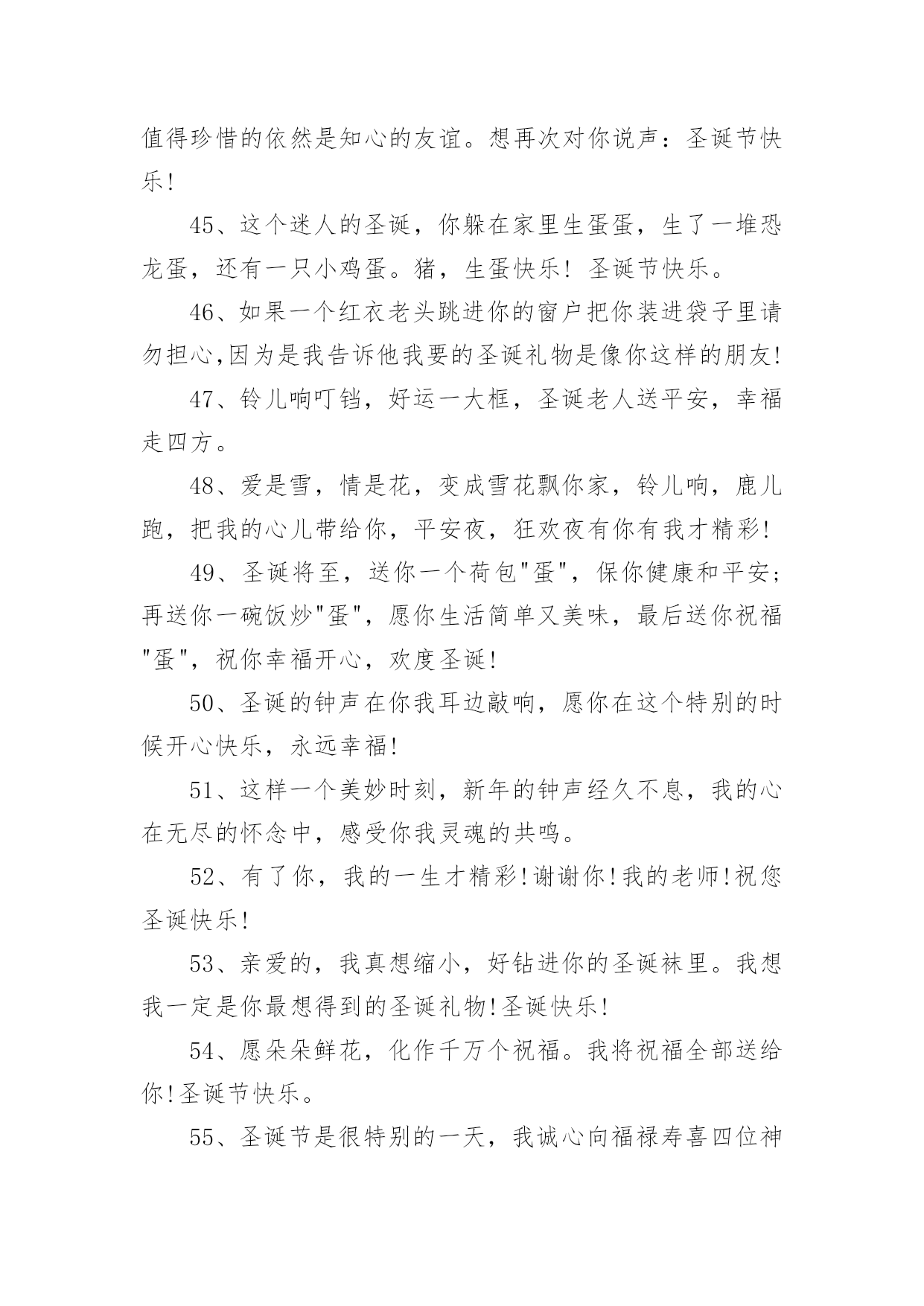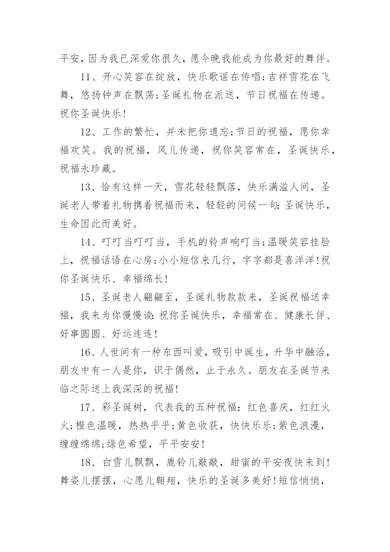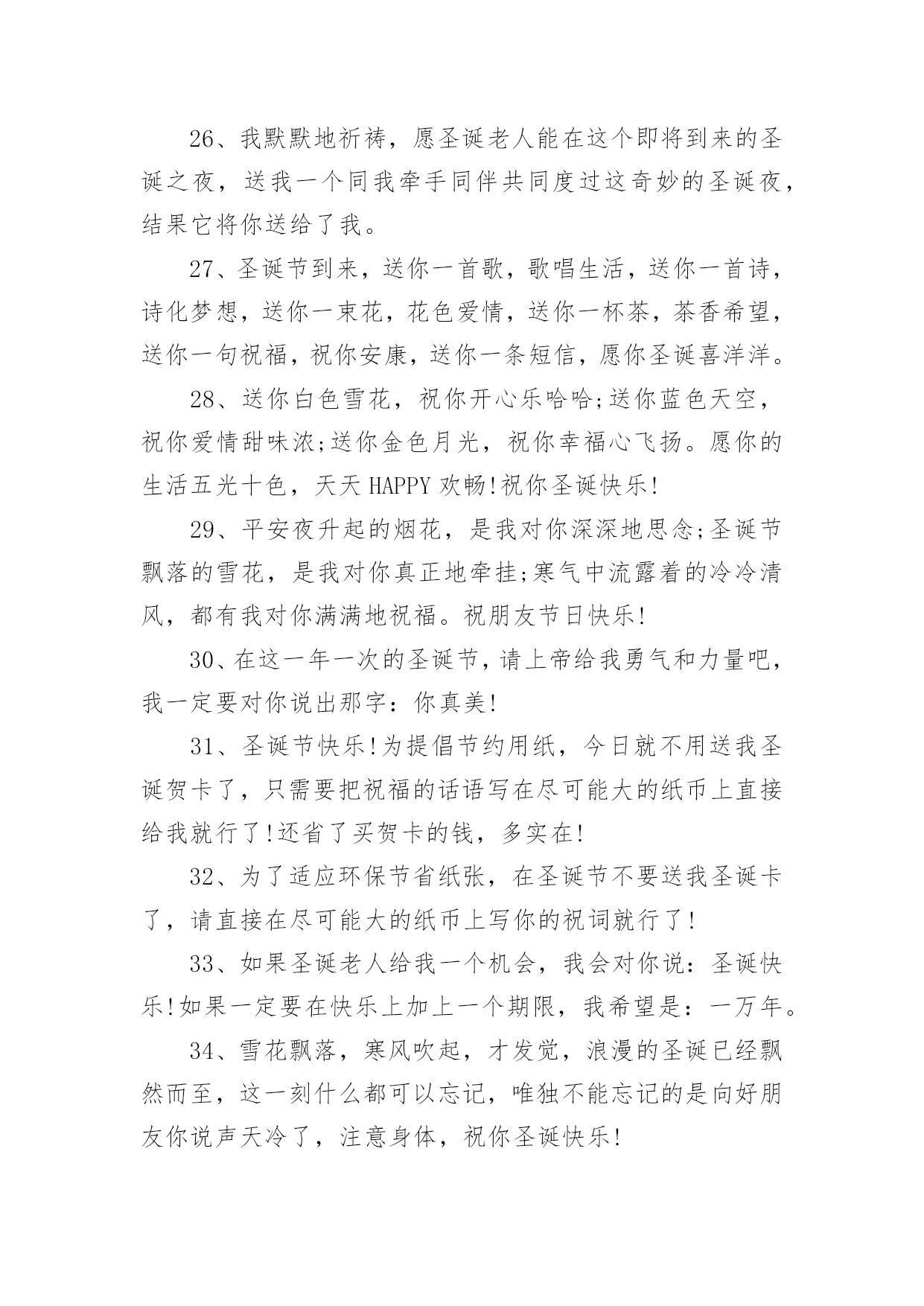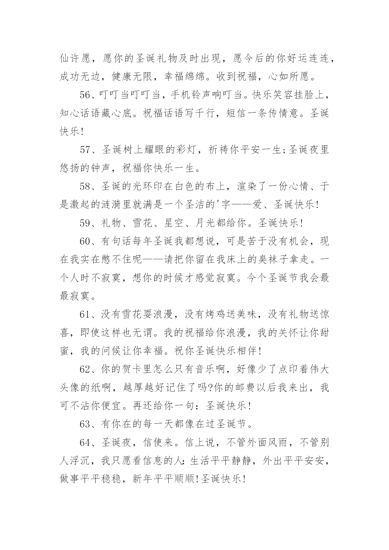 圣诞节朋友圈文案[必备]圣诞节朋友圈文案在学习、工作、生活中,大家都接触过很多优秀的文案吧,文案在生活中是比较重要的一种宣传形式。那什么样的文案才算得上是经典呢?以下是小编收集整理的圣诞节朋友圈文案,希望对大家有所帮助。圣诞节朋友圈文案11、爱情的道路上,爱情是美丽的传奇,是平凡的故事;也正如我与你相见时的哪一瞬间,一见钟情,一世倾心;圣诞节,我愿固守我俩的爱情天长地久,祝节日快乐!2、请记住这个微笑,那是我对你的祝福,圣诞快乐!3、如果有个胖红衣老人从窗户爬进你屋子把你装进口袋不要怕因为我对圣诞老人说“想要你这样的朋友”。4、悦耳的钟声迎来圣诞,快乐时分爱上了坏蛋。在这幸福的夜晚,我是要圣诞,还是要坏蛋?请你告诉我,坏蛋!5、圣诞节快快乐乐!心境开开心心!生意红红火火!好运由我的祝福扎堆!恭祝冬日快乐!6、你还没收到礼物吗?那就快去睡吧!你的饱嗝声吓着圣诞老人了。7、在这平安的夜晚你就是我的圣诞老人请不要吝啬你的金钱快把礼物拿来我会把最诚挚的祝福送给你圣诞节快乐8、今天圣诞老人送给我的礼物就是让我遇见到你!想偷偷地告诉你:我喜欢你!祝圣诞节快乐!9、圣诞节没有压力,只有轻松传递,圣诞节,愿你心情好好的。10、让北风吹去祝福,北风太冷,让雪花飘去问候,雪花太凉,让贺卡送去祝愿,贺卡太慢,让电话诉说牵挂,电话占线。只好发短信祝你圣诞快乐、开心元旦。11、圣诞节到了,祝你天天开心,时时欢笑!12、未曾把你遗忘,确是工作太忙;问候虽不时常,今天特意补上;圣诞就要到来,祝你心情愉快,顺祝工作顺利,说一声珍重道一声平安13、圣诞树上挂了三颗星,一颗是我温柔的眼睛,呵护着你一路前行;一颗是我不变的真情,伴随着你快乐安宁;一颗是我永远的祝愿,祝福着你好运来临。14、送你一份美丽让你欢笑,送一份关怀让你知道,累了要好好休息,错了也别埋怨自己,伤了懂得什么是珍惜,闷了就看看我的信息,希望你快乐哦!圣诞节快乐!15、平安之夜的使者,向你报一声平安,带这盈盈的相思,带着温馨的祝愿,祝福你圣诞快乐!!16、如果今年的平安夜,你被人塞进麻袋里,千万别惊慌!因为我对圣诞老人说过:我需要的礼物就是一个像你这样的好朋友!17、问候在平安夜,愿我的朋友永远健健康康,平平安安;祝福在圣诞节,祝我的朋友永远快快乐乐,幸幸福福!短信美丽,传递友谊,再祝开心祥吉!18、小时候简单就是幸福,长大后幸福就是简单,而我的幸福就是和你简简单单,亲爱的,圣诞节即将来临,祝节日快乐!健康平安!19、幸福是常怀一颗感恩的心,有一个健康的身体,一份称心的`工作,一位深爱你的人,和一帮信赖的朋友,你会拥有这一切!在今天我祝你圣诞快乐!20、我在圣诞树旁静静地许愿,希望在这宁静的夜,我的思念能随着飘絮的心情飞到你的身边,让你我共同度过一个美好的圣诞夜!我要把一切喜庆变成奶油,所有祝福揉成巧克力,永远快乐做成蛋糕砸向你!然后说声圣诞快乐!21、在这一年一次的圣诞节,请上帝给我勇气和力量吧,我一定要对你说出那字:快—还—钱!22、雪花,洁白;红酒,香醇;烛光,朦胧;圣诞树,绿绿;霓虹灯,闪耀;温馨;祝福,浪漫。愿这浓浓的圣诞味道将你包围,祝你圣诞快乐!23、叮叮当叮叮当,手机的铃声响叮当;温暖笑容挂脸上,祝福话语在心房;小小微信来几行,字字都是喜洋洋!祝你圣诞快乐幸福绵长!24、有烟囱的扫烟囱,有袜子的洗袜子,更重要的是,有心愿的快许愿,因为圣诞来到了。别瞎开心了,礼物没有,也别不开心,祝福还在:圣诞快乐,心想事成!25、送你满天雪花,愿你天天笑哈哈;送你湛蓝晴空,愿你事事都成功;送你灿烂星光,愿你生活更辉煌;送你温暖问候,愿你幸福无尽头。提前祝圣诞快乐!26、我默默地祈祷,愿圣诞老人能在这个即将到来的圣诞之夜,送我一个同我牵手同伴共同度过这奇妙的圣诞夜,结果它将你送给了我。27、圣诞节到来,送你一首歌,歌唱生活,送你一首诗,诗化梦想,送你一束花,花色爱情,送你一杯茶,茶香希望,送你一句祝福,祝你安康,送你一条短信,愿你圣诞喜洋洋。28、送你白色雪花,祝你开心乐哈哈;送你蓝色天空,祝你爱情甜味浓;送你金色月光,祝你幸福心飞扬。愿你的生活五光十色,天天HAPPY欢畅!祝你圣诞快乐!29、平安夜升起的烟花,是我对你深深地思念;圣诞节飘落的雪花,是我对你真正地牵挂;寒气中流露着的冷冷清风,都有我对你满满地祝福。祝朋友节日快乐!30、在这一年一次的圣诞节,请上帝给我勇气和力量吧,我一定要对你说出那字:你真美!31、圣诞节快乐!为提倡节约用纸,今日就不用送我圣诞贺卡了,只需要把祝福的话语写在尽可能大的纸币上直接给我就行了!还省了买贺卡的钱,多实在!32、为了适应环保节省纸张,在圣诞节不要送我圣诞卡了,请直接在尽可能大的纸币上写你的祝词就行了!33、如果圣诞老人给我一个机会,我会对你说:圣诞快乐!如