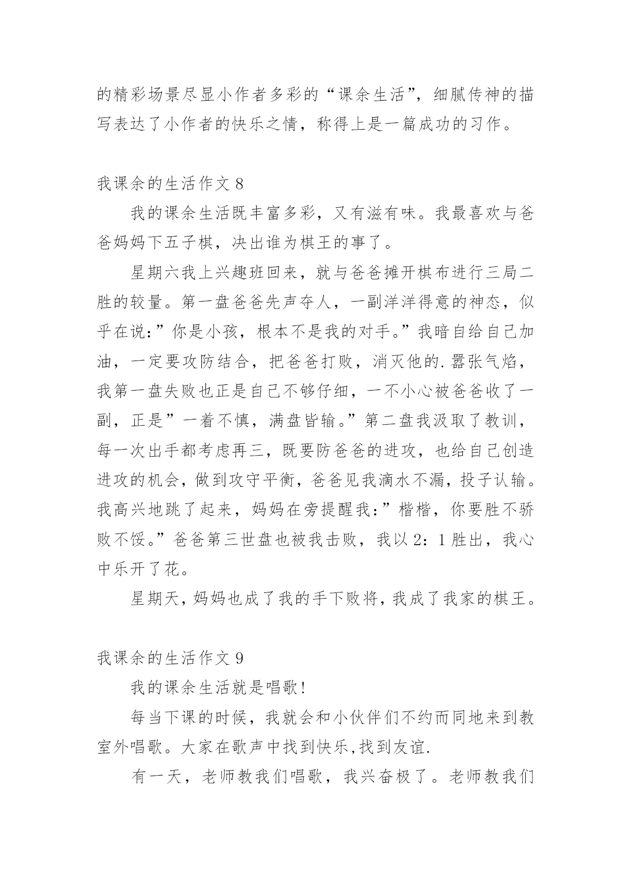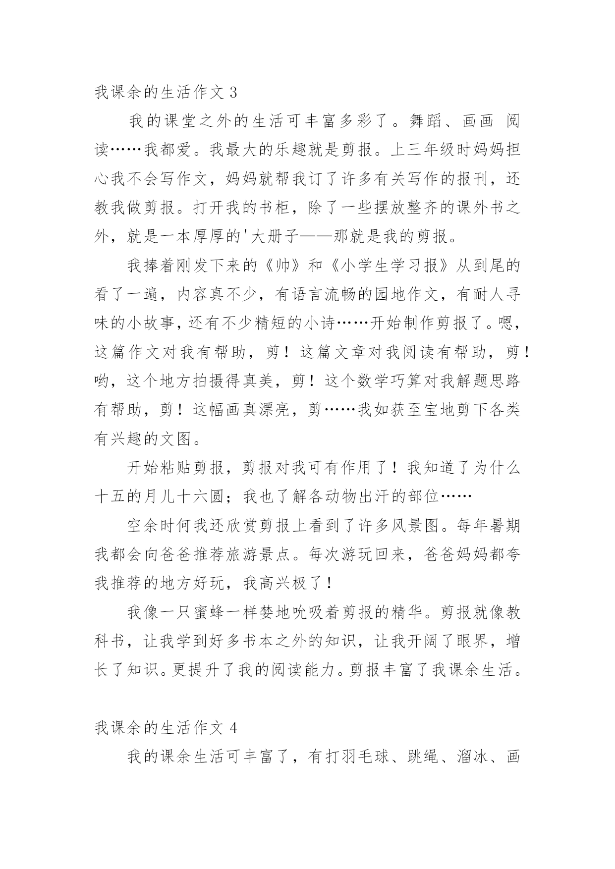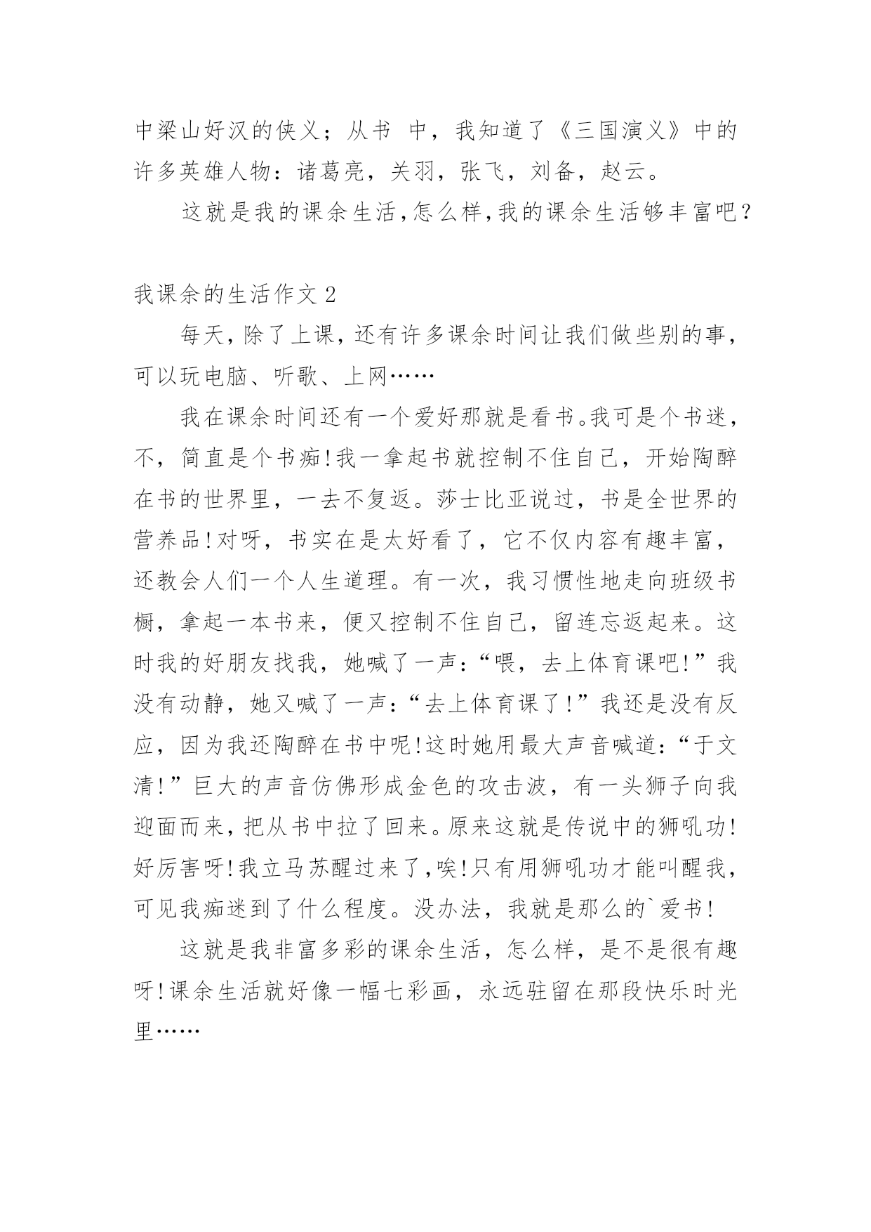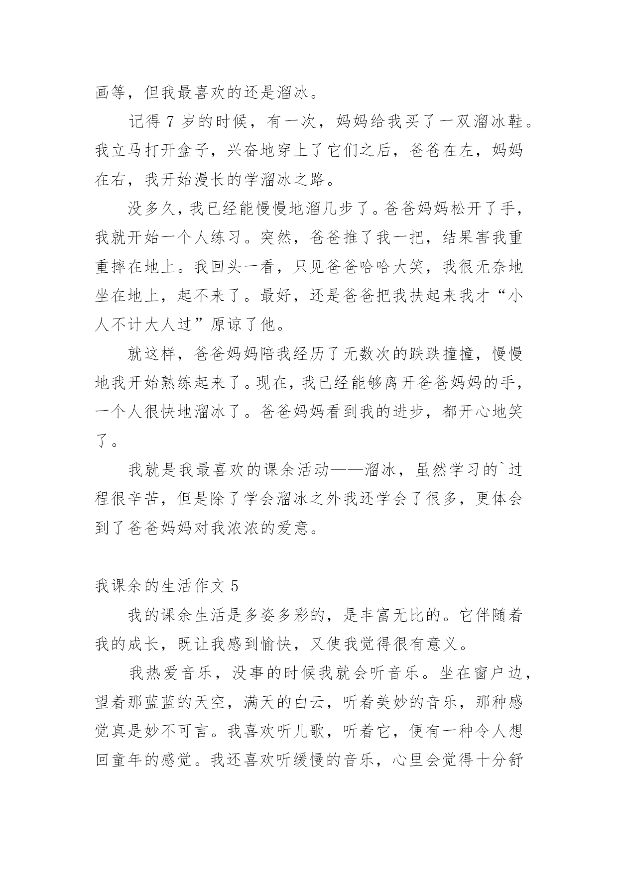 我课余的生活作文1我课余的生活作文在平日的学习、工作和生活里,许多人都写过作文吧,借助作文可以宣泄心中的情感,调节自己的心情。如何写一篇有思想、有文采的作文呢?下面是小编为大家整理的我课余的生活作文,仅供参考,希望能够帮助到大家。我课余的生活作文1我的课余生活可丰富了!有写毛笔字,学篆刻,学英语,打羽毛球。我最喜欢的还是练书法和看书。每天晚上,吃好晚饭,学校里的作业做完以后,我就会来到爸爸的书桌前,开始练习书法。这时候,爸爸总会先给我写个范字,我就会照着这个字练,当我写的不像时,爸爸就会让我把这个字裁下来放在纸下描几遍,不一会儿,我就会和爸爸写得差不多了,每次爸爸总会夸奖我进步真快。当星期五,星期天的时候,我又会到爸爸的书法教室和同学们一起练习,每次都要练习两个小时。经过学习书法,让我学到了更多的'知识。我知道了颜真卿,赵孟頫,苏东坡,我还知道了隶书,草书,行书和楷书。看书也是我最喜欢的一种课余生活。“书中自有黄金屋,书中自有颜如玉”。从书中,我知道了《西游记》中的唐僧师徒去西天取经的艰难曲折;从书中,我知道了《水浒传》中梁山好汉的侠义;从书中,我知道了《三国演义》中的许多英雄人物:诸葛亮,关羽,张飞,刘备,赵云。这就是我的课余生活,怎么样,我的课余生活够丰富吧?我课余的生活作文2每天,除了上课,还有许多课余时间让我们做些别的事,可以玩电脑、听歌、上网……我在课余时间还有一个爱好那就是看书。我可是个书迷,不,简直是个书痴!我一拿起书就控制不住自己,开始陶醉在书的世界里,一去不复返。莎士比亚说过,书是全世界的营养品!对呀,书实在是太好看了,它不仅内容有趣丰富,还教会人们一个人生道理。有一次,我习惯性地走向班级书橱,拿起一本书来,便又控制不住自己,留连忘返起来。这时我的好朋友找我,她喊了一声:“喂,去上体育课吧!”我没有动静,她又喊了一声:“去上体育课了!”我还是没有反应,因为我还陶醉在书中呢!这时她用最大声音喊道:“于文清!”巨大的声音仿佛形成金色的攻击波,有一头狮子向我迎面而来,把从书中拉了回来。原来这就是传说中的狮吼功!好厉害呀!我立马苏醒过来了,唉!只有用狮吼功才能叫醒我,可见我痴迷到了什么程度。没办法,我就是那么的`爱书!这就是我非富多彩的课余生活,怎么样,是不是很有趣呀!课余生活就好像一幅七彩画,永远驻留在那段快乐时光里……我课余的生活作文3我的课堂之外的生活可丰富多彩了。舞蹈、画画阅读……我都爱。我最大的乐趣就是剪报。上三年级时妈妈担心我不会写作文,妈妈就帮我订了许多有关写作的报刊,还教我做剪报。打开我的书柜,除了一些摆放整齐的课外书之外,就是一本厚厚的'大册子——那就是我的剪报。我捧着刚发下来的《帅》和《小学生学习报》从到尾的看了一遍,内容真不少,有语言流畅的园地作文,有耐人寻味的小故事,还有不少精短的小诗……开始制作剪报了。嗯,这篇作文对我有帮助,剪!这篇文章对我阅读有帮助,剪!哟,这个地方拍摄得真美,剪!这个数学巧算对我解题思路有帮助,剪!这幅画真漂亮,剪……我如获至宝地剪下各类有兴趣的文图。开始粘贴剪报,剪报对我可有作用了!我知道了为什么十五的月儿十六圆;我也了解各动物出汗的部位……空余时何我还欣赏剪报上看到了许多风景图。每年暑期我都会向爸爸推荐旅游景点。每次游玩回来,爸爸妈妈都夸我推荐的地方好玩,我高兴极了!我像一只蜜蜂一样婪地吮吸着剪报的精华。剪报就像教科书,让我学到好多书本之外的知识,让我开阔了眼界,增长了知识。更提升了我的阅读能力。剪报丰富了我课余生活。我课余的生活作文4我的课余生活可丰富了,有打羽毛球、跳绳、溜冰、画画等,但我最喜欢的还是溜冰。记得7岁的时候,有一次,妈妈给我买了一双溜冰鞋。我立马打开盒子,兴奋地穿上了它们之后,爸爸在左,妈妈在右,我开始漫长的学溜冰之路。没多久,我已经能慢慢地溜几步了。爸爸妈妈松开了手,我就开始一个人练习。突然,爸爸推了我一把,结果害我重重摔在地上。我回头一看,只见爸爸哈哈大笑,我很无奈地坐在地上,起不来了。最好,还是爸爸把我扶起来我才“小人不计大人过”原谅了他。就这样,爸爸妈妈陪我经历了无数次的跌跌撞撞,慢慢地我开始熟练起来了。现在,我已经能够离开爸爸妈妈的手,一个人很快地溜冰了。爸爸妈妈看到我的进步,都开心地笑了。我就是我最喜欢的课余活动——溜冰,虽然学习的`过程很辛苦,但是除了学会溜冰之外我还学会了很多,更体会到了爸爸妈妈对我浓浓的爱意。我课余的生活作文5我的课余生活是多姿多彩的,是丰富无比的。它伴随着我的成长,既让我感到愉快,又使我觉得很有意义。我热爱音乐,没事的时候我就会听音乐。坐在窗户边,望着那蓝蓝的天空,满天的白云,听着美妙的音乐,那种感觉真是妙不可言。我喜欢听儿歌,听着它,便有一种令人想回童年的感觉。我还喜欢听缓慢的音乐,心里会觉得十分舒畅。我也