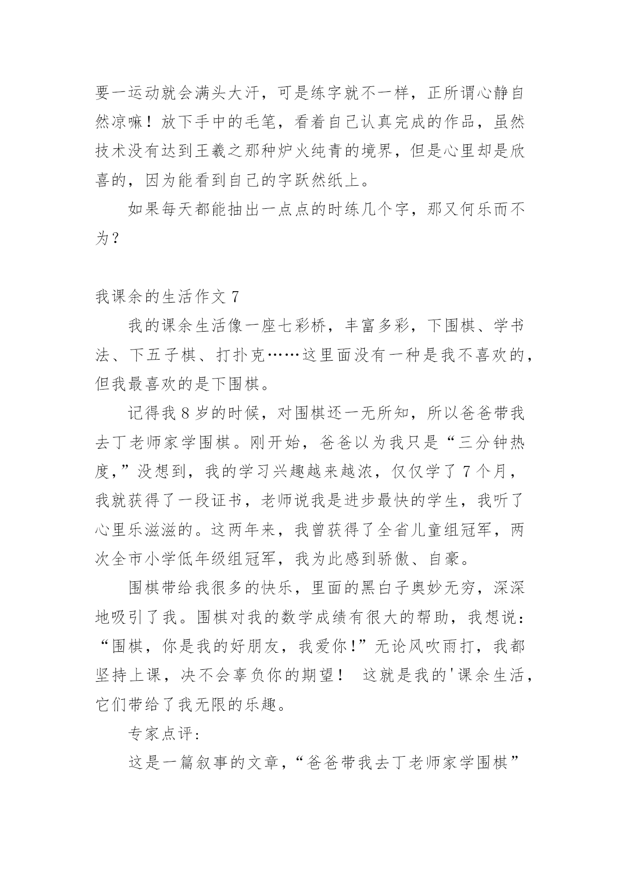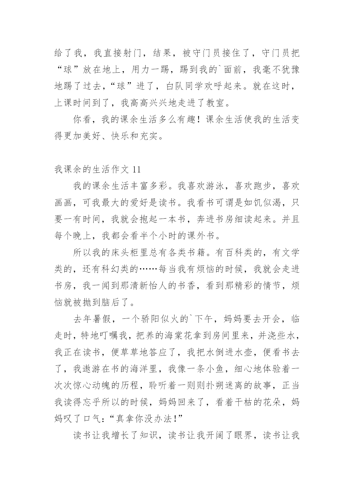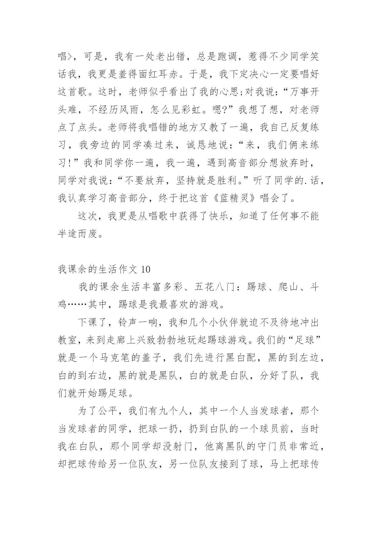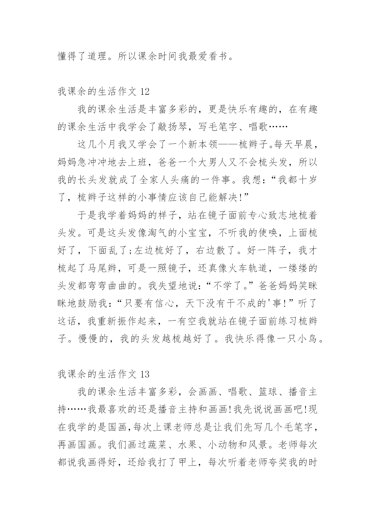 我课余的生活作文1我课余的生活作文在平日的学习、工作和生活里,许多人都写过作文吧,借助作文可以宣泄心中的情感,调节自己的心情。如何写一篇有思想、有文采的作文呢?下面是小编为大家整理的我课余的生活作文,仅供参考,希望能够帮助到大家。我课余的生活作文1我的课余生活可丰富了!有写毛笔字,学篆刻,学英语,打羽毛球。我最喜欢的还是练书法和看书。每天晚上,吃好晚饭,学校里的作业做完以后,我就会来到爸爸的书桌前,开始练习书法。这时候,爸爸总会先给我写个范字,我就会照着这个字练,当我写的不像时,爸爸就会让我把这个字裁下来放在纸下描几遍,不一会儿,我就会和爸爸写得差不多了,每次爸爸总会夸奖我进步真快。当星期五,星期天的时候,我又会到爸爸的书法教室和同学们一起练习,每次都要练习两个小时。经过学习书法,让我学到了更多的'知识。我知道了颜真卿,赵孟頫,苏东坡,我还知道了隶书,草书,行书和楷书。看书也是我最喜欢的一种课余生活。“书中自有黄金屋,书中自有颜如玉”。从书中,我知道了《西游记》中的唐僧师徒去西天取经的艰难曲折;从书中,我知道了《水浒传》中梁山好汉的侠义;从书中,我知道了《三国演义》中的许多英雄人物:诸葛亮,关羽,张飞,刘备,赵云。这就是我的课余生活,怎么样,我的课余生活够丰富吧?我课余的生活作文2每天,除了上课,还有许多课余时间让我们做些别的事,可以玩电脑、听歌、上网……我在课余时间还有一个爱好那就是看书。我可是个书迷,不,简直是个书痴!我一拿起书就控制不住自己,开始陶醉在书的世界里,一去不复返。莎士比亚说过,书是全世界的营养品!对呀,书实在是太好看了,它不仅内容有趣丰富,还教会人们一个人生道理。有一次,我习惯性地走向班级书橱,拿起一本书来,便又控制不住自己,留连忘返起来。这时我的好朋友找我,她喊了一声:“喂,去上体育课吧!”我没有动静,她又喊了一声:“去上体育课了!”我还是没有反应,因为我还陶醉在书中呢!这时她用最大声音喊道:“于文清!”巨大的声音仿佛形成金色的攻击波,有一头狮子向我迎面而来,把从书中拉了回来。原来这就是传说中的狮吼功!好厉害呀!我立马苏醒过来了,唉!只有用狮吼功才能叫醒我,可见我痴迷到了什么程度。没办法,我就是那么的`爱书!这就是我非富多彩的课余生活,怎么样,是不是很有趣呀!课余生活就好像一幅七彩画,永远驻留在那段快乐时光里……我课余的生活作文3我的课堂之外的生活可丰富多彩了。舞蹈、画画阅读……我都爱。我最大的乐趣就是剪报。上三年级时妈妈担心我不会写作文,妈妈就帮我订了许多有关写作的报刊,还教我做剪报。打开我的书柜,除了一些摆放整齐的课外书之外,就是一本厚厚的'大册子——那就是我的剪报。我捧着刚发下来的《帅》和《小学生学习报》从到尾的看了一遍,内容真不少,有语言流畅的园地作文,有耐人寻味的小故事,还有不少精短的小诗……开始制作剪报了。嗯,这篇作文对我有帮助,剪!这篇文章对我阅读有帮助,剪!哟,这个地方拍摄得真美,剪!这个数学巧算对我解题思路有帮助,剪!这幅画真漂亮,剪……我如获至宝地剪下各类有兴趣的文图。开始粘贴剪报,剪报对我可有作用了!我知道了为什么十五的月儿十六圆;我也了解各动物出汗的部位……空余时何我还欣赏剪报上看到了许多风景图。每年暑期我都会向爸爸推荐旅游景点。每次游玩回来,爸爸妈妈都夸我推荐的地方好玩,我高兴极了!我像一只蜜蜂一样婪地吮吸着剪报的精华。剪报就像教科书,让我学到好多书本之外的知识,让我开阔了眼界,增长了知识。更提升了我的阅读能力。剪报丰富了我课余生活。我课余的生活作文4我的课余生活可丰富了,有打羽毛球、跳绳、溜冰、画画等,但我最喜欢的还是溜冰。记得7岁的时候,有一次,妈妈给我买了一双溜冰鞋。我立马打开盒子,兴奋地穿上了它们之后,爸爸在左,妈妈在右,我开始漫长的学溜冰之路。没多久,我已经能慢慢地溜几步了。爸爸妈妈松开了手,我就开始一个人练习。突然,爸爸推了我一把,结果害我重重摔在地上。我回头一看,只见爸爸哈哈大笑,我很无奈地坐在地上,起不来了。最好,还是爸爸把我扶起来我才“小人不计大人过”原谅了他。就这样,爸爸妈妈陪我经历了无数次的跌跌撞撞,慢慢地我开始熟练起来了。现在,我已经能够离开爸爸妈妈的手,一个人很快地溜冰了。爸爸妈妈看到我的进步,都开心地笑了。我就是我最喜欢的课余活动——溜冰,虽然学习的`过程很辛苦,但是除了学会溜冰之外我还学会了很多,更体会到了爸爸妈妈对我浓浓的爱意。我课余的生活作文5我的课余生活是多姿多彩的,是丰富无比的。它伴随着我的成长,既让我感到愉快,又使我觉得很有意义。我热爱音乐,没事的时候我就会听音乐。坐在窗户边,望着那蓝蓝的天空,满天的白云,听着美妙的音乐,那种感觉真是妙不可言。我喜欢听儿歌,听着它,便有一种令人想回童年的感觉。我还喜欢听缓慢的音乐,心里会觉得十分舒畅。我也