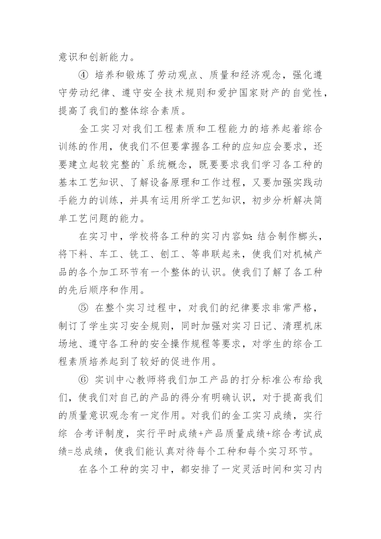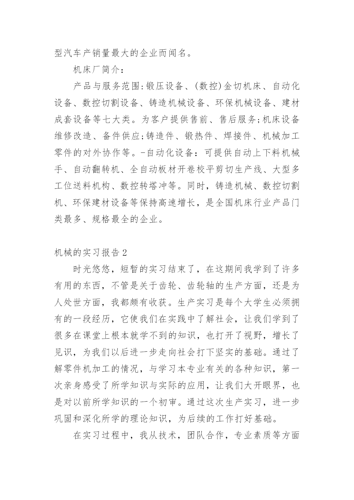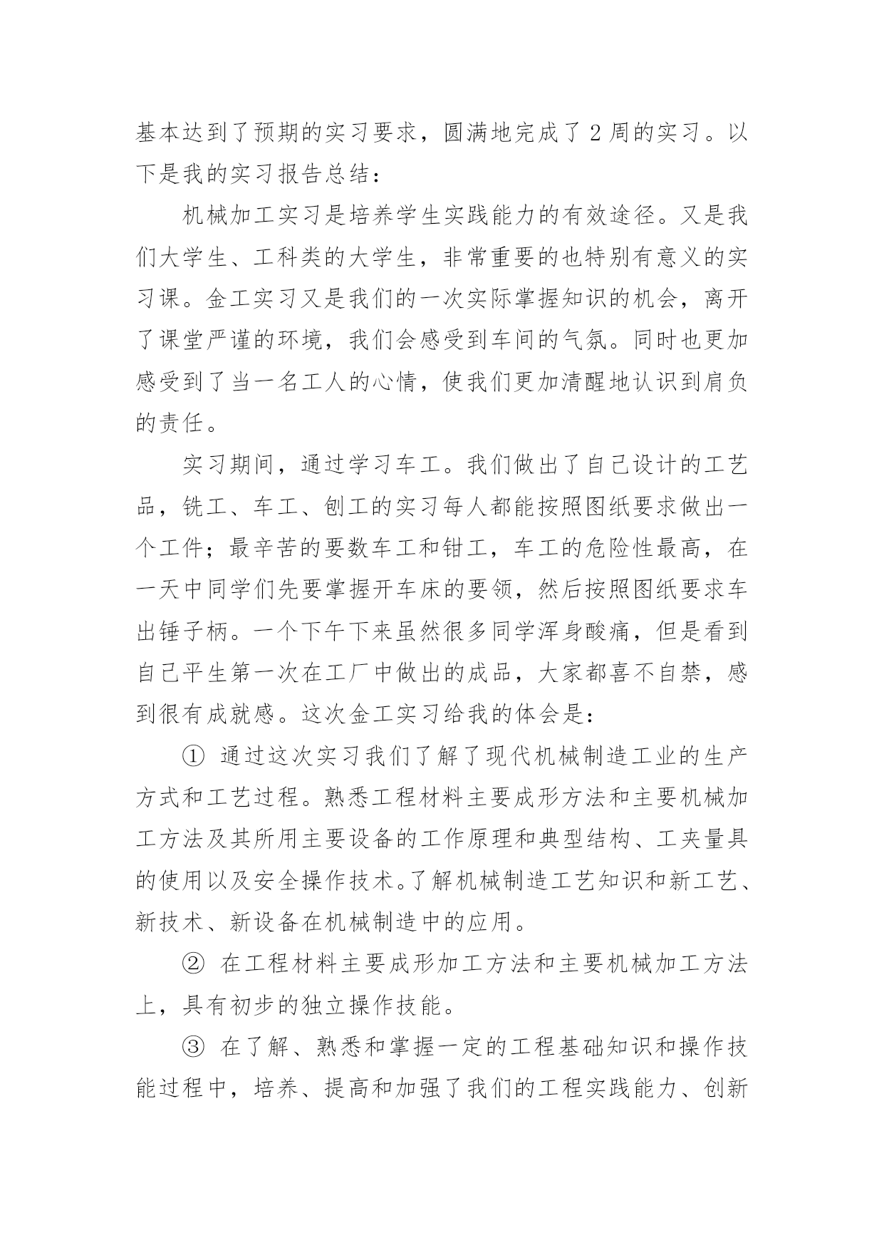 机械的实习报告在生活中,需要使用报告的情况越来越多,报告成为了一种新兴产业。一听到写报告就拖延症懒癌齐复发?以下是小编为大家整理的机械的实习报告,希望能够帮助到大家。机械的实习报告1实习的目的及意义1、实习目的本次实习我们主要去三家企业,中国**汽集团、机床集团和精工机械厂,在公司中采取了听讲座、到车间观摩学习等各种各样的形式学习机械制造,对机械制造有一个整体的认识。2、实习单位简介中国汽车集团简介:中国汽车集团前身是原xx汽车制造总厂。原**汽车制造总厂始建于1935年,主要生产汽车零部件。该厂于1956年开始自主研发设计制造汽车,步入汽车制造企业。1960年4月试制出了中国第一辆**型汽车-黄河牌jn150型8吨**型汽车,结束了中国不能生产xx型汽车的历史。总部坐落于山东省**市,是国内主要的xx型载xx汽车生产基地,也是我国xx型汽车工业的.摇篮,以开发和制造中国第一辆**型汽车(黄河jn150)、成功引进斯太尔**型汽车生产项目和与沃尔沃合资生产项目、自主研发howo产品是目前中国**型汽车产销量最大的企业而闻名。机床厂简介:产品与服务范围:锻压设备、(数控)金切机床、自动化设备、数控切割设备、铸造机械设备、环保机械设备、建材成套设备等七大类。为客户提供售前、售后服务;机床设备维修改造、备件供应;铸造件、锻热件、焊接件、机械加工零件的对外协作等。-自动化设备:可提供自动上下料机械手、自动翻转机、全自动板材开卷校平剪切生产线、大型多工位送料机构、数控转塔冲等。同时,铸造机械、数控切割机、环保建材设备等保持高速增长,是全国机床行业产品门类最多、规格最全的企业。机械的实习报告2时光悠悠,短暂的实习结束了,在这期间我学到了许多有用的东西,不管是关于齿轮、齿轮轴的生产方面,还是为人处世方面,我都颇有收获。生产实习是每个大学生必须拥有的一段经历,它使我们在实践中了解社会,让我们学到了很多在课堂上根本就学不到的知识,也打开了视野,增长了见识,为我们以后进一步走向社会打下坚实的基础。通过了解零件机加工的情况,与学习本专业有关的各种知识,第一次亲身感受了所学知识与实际的应用,让我们大开眼界,也是对以前所学知识的一个初审。通过这次生产实习,进一步巩固和深化所学的理论知识,为后续的工作打好基础。在实习过程中,我从技术,团队合作,专业素质等方面都有了极大的收获。从技术方面来说,这次实习给了一次我将所学知识进行运用来解决实际问题的机会,在实习过程中,许多原来并不熟练的知识逐渐被清晰的理解,许多原来没有重视的方面也得到了巩固,更在发现及解决问题的过程中学习到了不少新东西。其实我认为生产实习另一个目的`是在实践中初识社会,了解社会,即将走出校门的我们,往往对社会缺乏足够的认识,甚至感到迷茫,需要时间去积累。在实习中,我体会到为人处事的重要,学会了与人真诚沟通,平时与工友和师傅交流互换工作上的意见,来彼此产生同事间的信任,对我来说是一笔财富,让我在进入社会后就学到了重要的一课,也经历了社会的残酷。在生产实习中我还充分体会到了吃苦耐劳的精神,只是空想空谈吃苦耐劳精神,是不实际的,容易在挫折面前低头泄气,所以让我学会不管做什么事,首先自己的态度要明确要端正,才能承受客观存在和战胜自我的勇气。机械的实习报告3xxx年xx月,我们在xx工程实训中心进行了为期2周的机械加工实习。期间,我们接触了车、铣、刨、等工种的基本操作技能和安全技术教程。每隔几天,大家都要学习一项新的技术,并在规定的实习时间里,完成从对各项工种的一无所知到制作出一件成品的过程。在老师们耐心细致地讲授和在我们的积极的配合下,我们没有发生一例伤害事故,基本达到了预期的实习要求,圆满地完成了2周的实习。以下是我的实习报告总结:机械加工实习是培养学生实践能力的有效途径。又是我们大学生、工科类的大学生,非常重要的也特别有意义的实习课。金工实习又是我们的一次实际掌握知识的机会,离开了课堂严谨的环境,我们会感受到车间的气氛。同时也更加感受到了当一名工人的心情,使我们更加清醒地认识到肩负的责任。实习期间,通过学习车工。我们做出了自己设计的工艺品,铣工、车工、刨工的实习每人都能按照图纸要求做出一个工件;最辛苦的要数车工和钳工,车工的危险性最高,在一天中同学们先要掌握开车床的要领,然后按照图纸要求车出锤子柄。一个下午下来虽然很多同学浑身酸痛,但是看到自己平生第一次在工厂中做出的成品,大家都喜不自禁,感到很有成就感。这次金工实习给我的体会是:①通过这次实习我们了解了现代机械制造工业的生产方式和工艺过程。熟悉工程材料主要成形方法和主要机械加工方法及其所用主要设备的工作原理和典型结构、工夹量具的使用以及安全操作技术。了解机械制造工艺知识和新工艺、新技术、新设备在机械制造中的应用。②在工程材料主要成形加工方法和