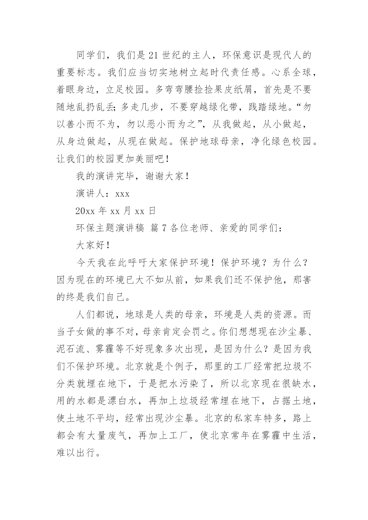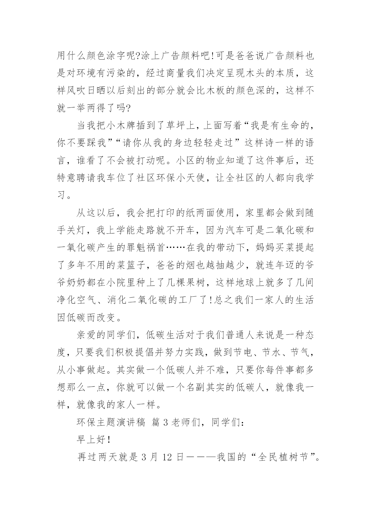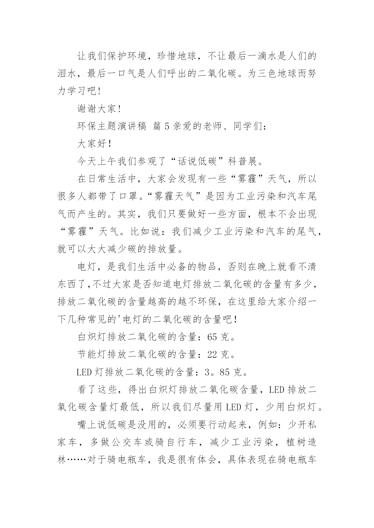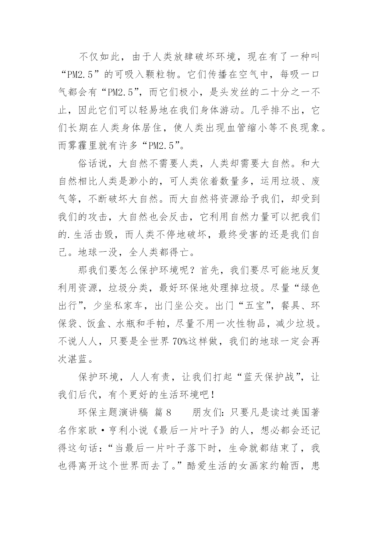 环保主题演讲稿环保主题演讲稿合集14篇演讲稿可以帮助发言者更好的表达。在日常生活和工作中,演讲稿在我们的视野里出现的频率越来越高,那么,怎么去写演讲稿呢?以下是小编为大家整理的环保主题演讲稿,欢迎大家借鉴与参考,希望对大家有所帮助。环保主题演讲稿篇1同学们:大家好!你知道全国每天节约一张纸,一年可以节约多少张纸吗?4745亿张纸。一年就可以少砍伐158。1666万棵树。“158。1666万”这个天文数字多么惊人啊!从这个意义上来说,节约用纸,也就是制造森林。汽车也是破坏环保的一大罪人:它每天排放的尾气中,含有大量的二氧化碳,会使地球产生“温室效应”:气温渐渐变暖,冰川渐渐融化,海平面徐徐上升,陆地面积也随之逐渐减少。预计,到20xx年,中国有48个城市,9。2万平方公里的土地,将受到淹没的威胁。在我们的周围,还有许多许多的不环保现象不断发生……因此保护环境刻不容缓。那么,我们现在应该怎么(保护自然呢?让我来告诉你吧。用纸时,一面用完不要扔掉,背面还可以用来打草稿。做了草稿纸以后,还可以用来折纸。即使是废纸,也还能送到造纸厂循环利用。开车也一样,少开一天汽车,多骑一天自行车,这样既能使空气更清新,又能使我们的身体得到了锻炼。塑料袋的'焚烧会产生很多的毒气,污染了大气,而且不容易降解,会破坏我们的土地。所以我们要尽量使用环保袋,不使用塑料袋。同时我们也要节约用水,节约用电等等……同学们,再小的力量也是一种支持,从我做起,从点点滴滴做起,一根筷子易折断,那三根、五根呢?环保也一样,光靠一个人的力量是不够的,要大家一起讲究环保,我们的家园才会更美丽!环保主题演讲稿篇2尊敬的评委老师,各位朋友:大家好!提起低碳生活,绿色生活,我可是再熟悉不过了,我不仅是学校的环保宣传员,也因此成为了社区里的小名人,拥有众多的粉丝,这到底是怎么回事呢?还要从一块小小的提示牌说起。春天来了,柳树抽出了细细的柳丝,缀满了黄色的嫩叶,小草打了个哈欠,就连小花也探出了小脑袋,多美的景色呀!尤其是我们小区了那一片片毛茸茸的绿草地更是惹人怜爱,这么美的草坪应该写个牌子号召大家都来爱护它。回到家我和爸爸妈妈商量起来,写什么呢?用什么写呢?有了!我们用礼品包装、食品包装、菜叶包装还有月饼包装盒里的小木板修修改改做成了小牌子,又用废旧的墩布把锯成了把用胶将小木牌固定住。爸爸还拿出了专业的'木工刀具,教我学起了木刻,在我的精心雕刻下,一块块小木牌就做好了!那么用什么颜色涂字呢?涂上广告颜料吧!可是爸爸说广告颜料也是对环境有污染的,经过商量我们决定呈现木头的本质,这样风吹日晒以后刻出的部分就会比木板的颜色深的,这样不就一举两得了吗?当我把小木牌插到了草坪上,上面写着“我是有生命的,你不要踩我”“请你从我的身边轻轻走过”这样诗一样的语言,谁看了不会被打动呢。小区的物业知道了这件事后,还特意聘请我车位了社区环保小天使,让全社区的人都向我学习。从这以后,我会把打印的纸两面使用,家里都会做到随手关灯,我上学能走路就不开车,因为汽车可是二氧化碳和一氧化碳产生的罪魁祸首……在我的带动下,妈妈买菜提起了多年不用的菜篮子,爸爸的烟也越抽越少,就连年迈的爷爷奶奶都在小院里种上了几棵果树,这样地球上就多了几间净化空气、消化二氧化碳的工厂了!总之我们一家人的生活因低碳而改变。亲爱的同学们,低碳生活对于我们普通人来说是一种态度,只要我们积极提倡并努力实践,做到节电、节水、节气,从小事做起。其实做一个低碳人并不难,只要你每件事都多想那么一点,你就可以做一个名副其实的低碳人,就像我一样,就像我的家人一样。环保主题演讲稿篇3老师们,同学们:早上好!再过两天就是3月12日――—我国的“全民植树节”。中华民族自古就有“爱树、育树”的传统,爱白杨的挺拔,爱垂柳的柔美,爱松树不屈的风骨。有了树,才会有和谐美丽的大自然;有了树,才有清爽、新鲜的空气;有了树,才会有人类美好的生活。植树节的意义并不在于每个人在植树节这天去种一棵树,而是通过植树,使我们大家更加关注绿化、环保等问题。众所周知:地球正在沙化,沙漠的`覆盖面积正在逐年增加。相信我们所有人都不愿看到,美丽的地球成为终日沙尘滚滚的地狱。也许我们不能像林业工人那样大面积的栽树,但我们可以管住自己的手,节约纸张,远离一次性筷子;也许我们不能把荒漠变成绿洲,但是我们可以管住自己的脚,不要把绿油油的小草踩在脚下,不把校道两旁整整齐齐的灌木丛当作练习跳高的栏杆;如果我们不能亲手种下一棵树苗,那么就让我们扶植它,保护它,直到长成参天大树。作为一个地球人,中国人,中学生,祖国的下一代。我想我们有这个义务和责任来保护环境。即使我们还是学生,我们可以随手关灯,省一度电,就少一份污染。即使我们还是学生,我们可以少用空调来降低能源消耗。即使我们还是学生,我们可以维护安宁的环境从自