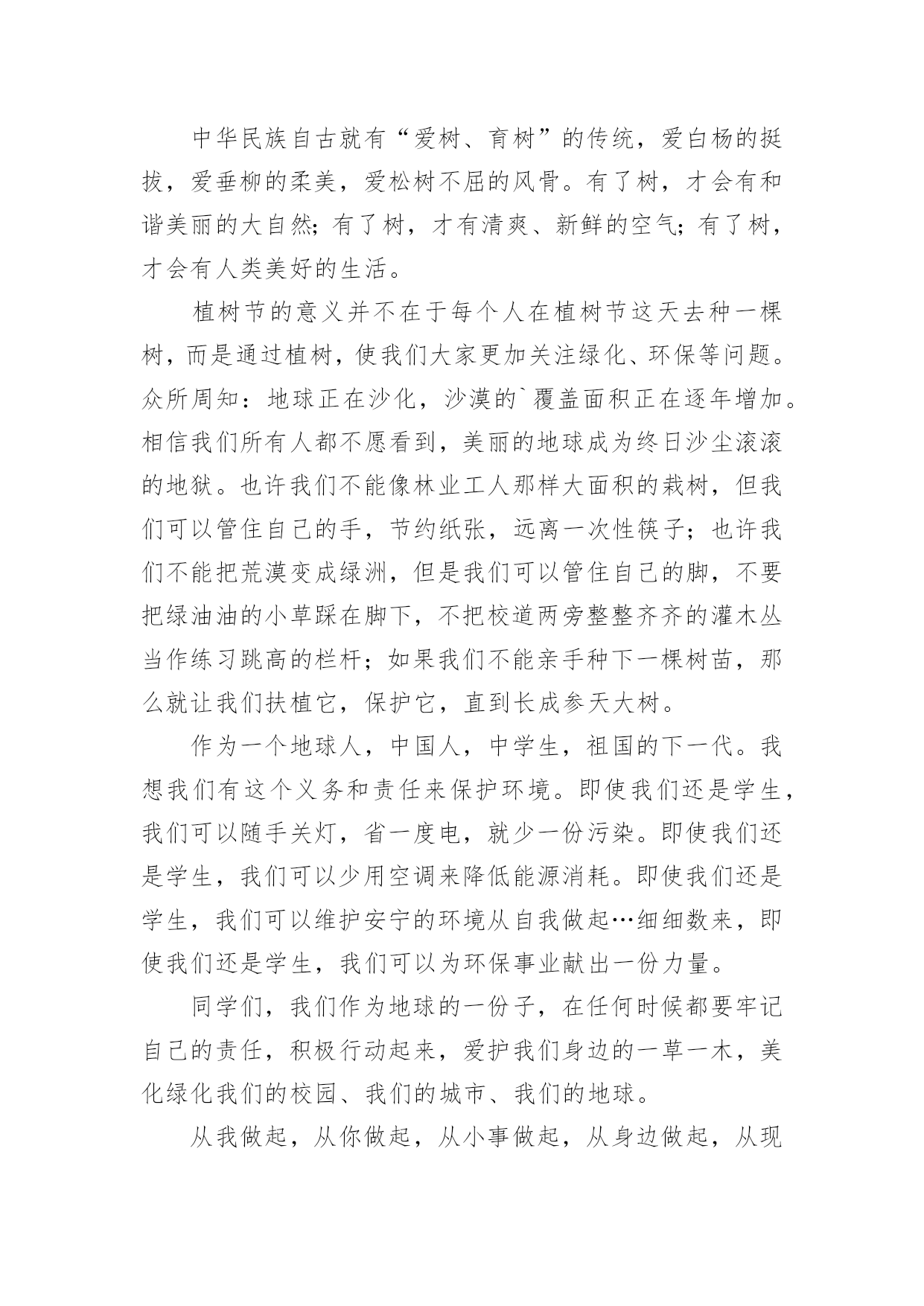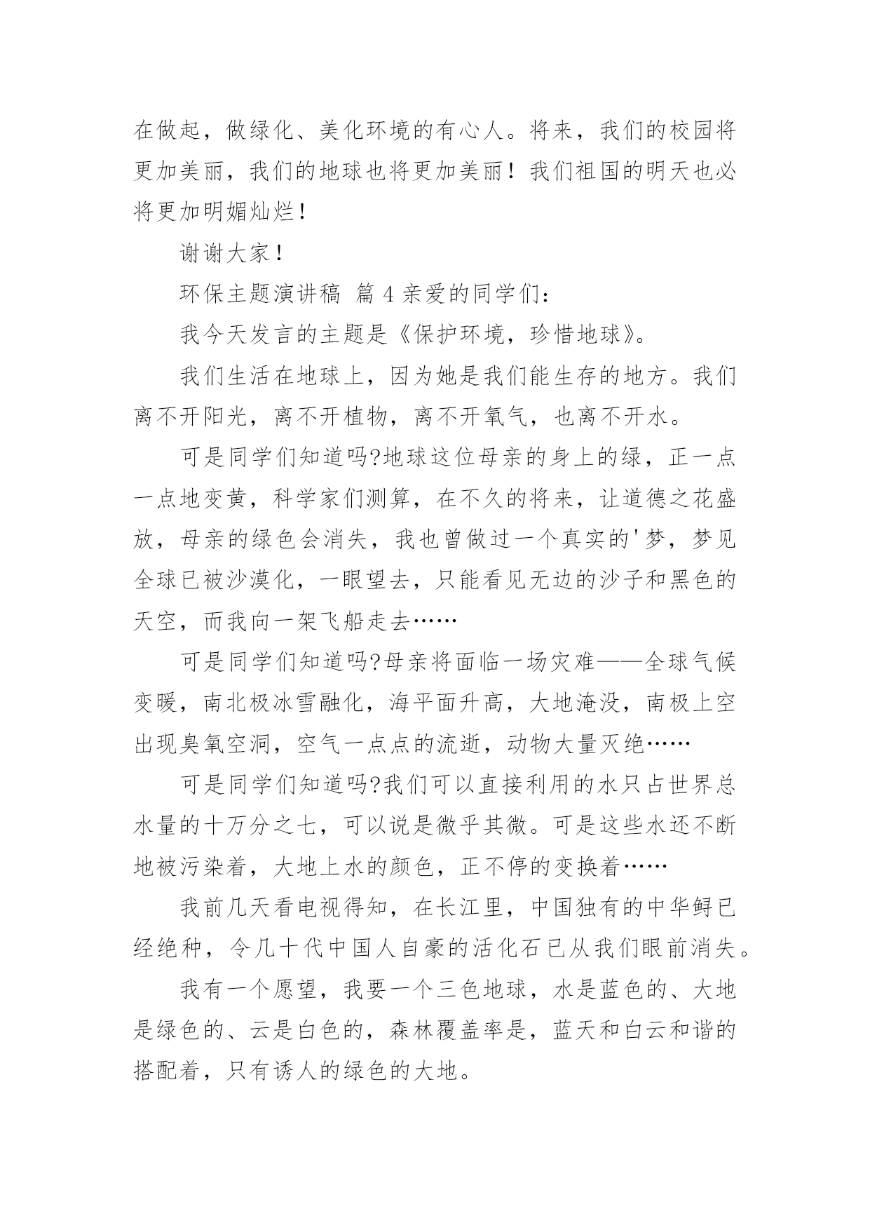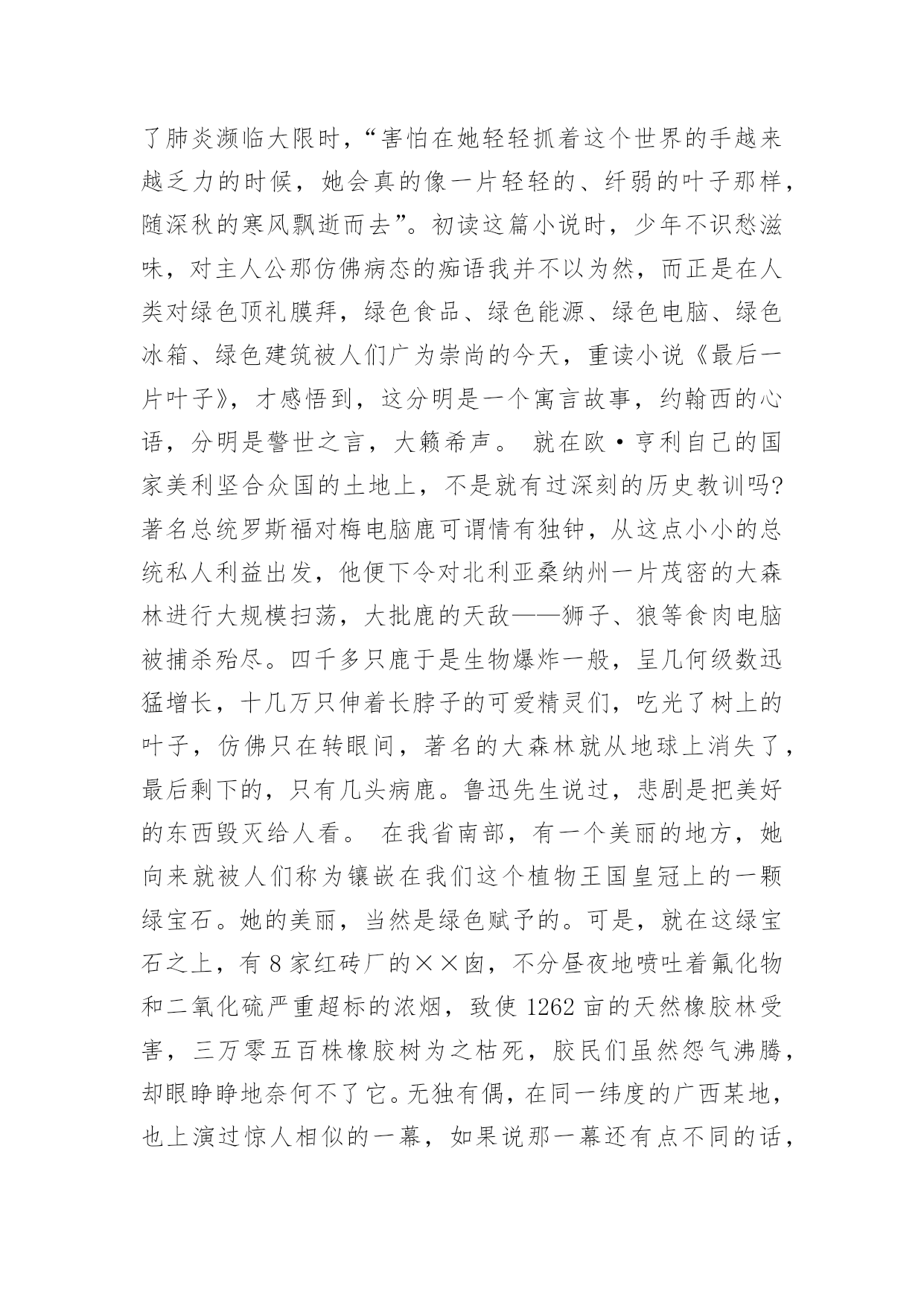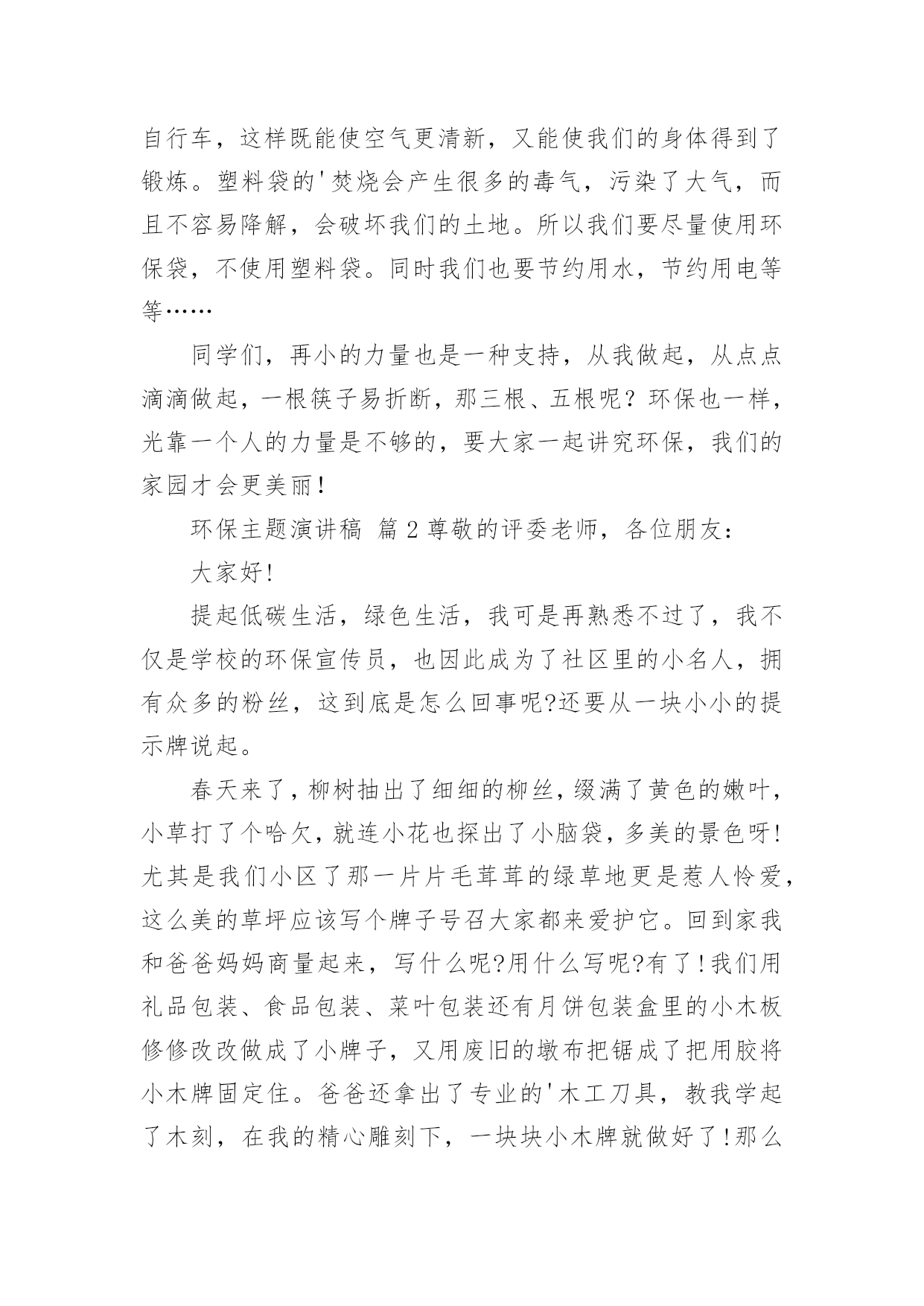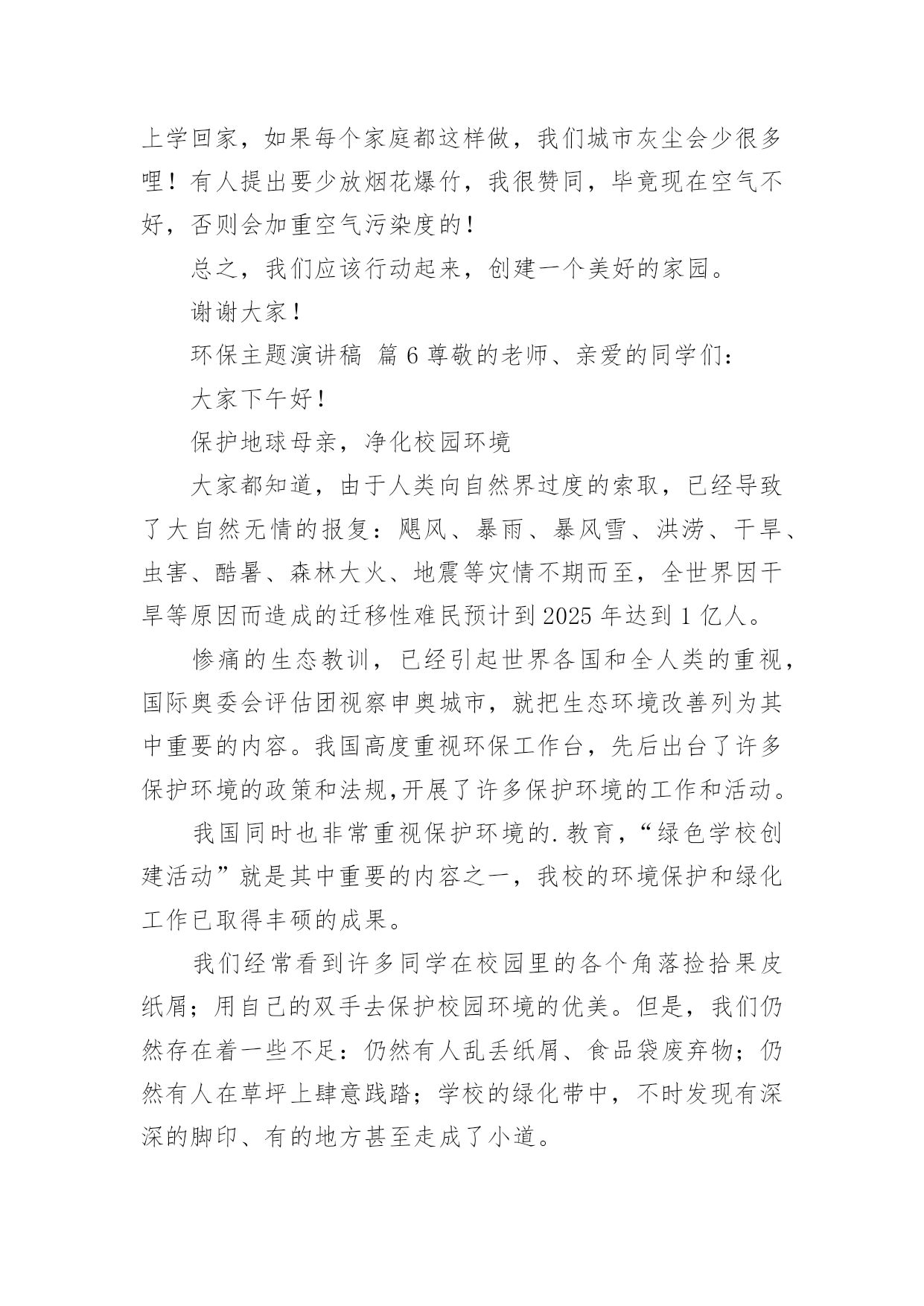 环保主题演讲稿环保主题演讲稿合集14篇演讲稿可以帮助发言者更好的表达。在日常生活和工作中,演讲稿在我们的视野里出现的频率越来越高,那么,怎么去写演讲稿呢?以下是小编为大家整理的环保主题演讲稿,欢迎大家借鉴与参考,希望对大家有所帮助。环保主题演讲稿篇1同学们:大家好!你知道全国每天节约一张纸,一年可以节约多少张纸吗?4745亿张纸。一年就可以少砍伐158。1666万棵树。“158。1666万”这个天文数字多么惊人啊!从这个意义上来说,节约用纸,也就是制造森林。汽车也是破坏环保的一大罪人:它每天排放的尾气中,含有大量的二氧化碳,会使地球产生“温室效应”:气温渐渐变暖,冰川渐渐融化,海平面徐徐上升,陆地面积也随之逐渐减少。预计,到20xx年,中国有48个城市,9。2万平方公里的土地,将受到淹没的威胁。在我们的周围,还有许多许多的不环保现象不断发生……因此保护环境刻不容缓。那么,我们现在应该怎么(保护自然呢?让我来告诉你吧。用纸时,一面用完不要扔掉,背面还可以用来打草稿。做了草稿纸以后,还可以用来折纸。即使是废纸,也还能送到造纸厂循环利用。开车也一样,少开一天汽车,多骑一天自行车,这样既能使空气更清新,又能使我们的身体得到了锻炼。塑料袋的'焚烧会产生很多的毒气,污染了大气,而且不容易降解,会破坏我们的土地。所以我们要尽量使用环保袋,不使用塑料袋。同时我们也要节约用水,节约用电等等……同学们,再小的力量也是一种支持,从我做起,从点点滴滴做起,一根筷子易折断,那三根、五根呢?环保也一样,光靠一个人的力量是不够的,要大家一起讲究环保,我们的家园才会更美丽!环保主题演讲稿篇2尊敬的评委老师,各位朋友:大家好!提起低碳生活,绿色生活,我可是再熟悉不过了,我不仅是学校的环保宣传员,也因此成为了社区里的小名人,拥有众多的粉丝,这到底是怎么回事呢?还要从一块小小的提示牌说起。春天来了,柳树抽出了细细的柳丝,缀满了黄色的嫩叶,小草打了个哈欠,就连小花也探出了小脑袋,多美的景色呀!尤其是我们小区了那一片片毛茸茸的绿草地更是惹人怜爱,这么美的草坪应该写个牌子号召大家都来爱护它。回到家我和爸爸妈妈商量起来,写什么呢?用什么写呢?有了!我们用礼品包装、食品包装、菜叶包装还有月饼包装盒里的小木板修修改改做成了小牌子,又用废旧的墩布把锯成了把用胶将小木牌固定住。爸爸还拿出了专业的'木工刀具,教我学起了木刻,在我的精心雕刻下,一块块小木牌就做好了!那么用什么颜色涂字呢?涂上广告颜料吧!可是爸爸说广告颜料也是对环境有污染的,经过商量我们决定呈现木头的本质,这样风吹日晒以后刻出的部分就会比木板的颜色深的,这样不就一举两得了吗?当我把小木牌插到了草坪上,上面写着“我是有生命的,你不要踩我”“请你从我的身边轻轻走过”这样诗一样的语言,谁看了不会被打动呢。小区的物业知道了这件事后,还特意聘请我车位了社区环保小天使,让全社区的人都向我学习。从这以后,我会把打印的纸两面使用,家里都会做到随手关灯,我上学能走路就不开车,因为汽车可是二氧化碳和一氧化碳产生的罪魁祸首……在我的带动下,妈妈买菜提起了多年不用的菜篮子,爸爸的烟也越抽越少,就连年迈的爷爷奶奶都在小院里种上了几棵果树,这样地球上就多了几间净化空气、消化二氧化碳的工厂了!总之我们一家人的生活因低碳而改变。亲爱的同学们,低碳生活对于我们普通人来说是一种态度,只要我们积极提倡并努力实践,做到节电、节水、节气,从小事做起。其实做一个低碳人并不难,只要你每件事都多想那么一点,你就可以做一个名副其实的低碳人,就像我一样,就像我的家人一样。环保主题演讲稿篇3老师们,同学们:早上好!再过两天就是3月12日――—我国的“全民植树节”。中华民族自古就有“爱树、育树”的传统,爱白杨的挺拔,爱垂柳的柔美,爱松树不屈的风骨。有了树,才会有和谐美丽的大自然;有了树,才有清爽、新鲜的空气;有了树,才会有人类美好的生活。植树节的意义并不在于每个人在植树节这天去种一棵树,而是通过植树,使我们大家更加关注绿化、环保等问题。众所周知:地球正在沙化,沙漠的`覆盖面积正在逐年增加。相信我们所有人都不愿看到,美丽的地球成为终日沙尘滚滚的地狱。也许我们不能像林业工人那样大面积的栽树,但我们可以管住自己的手,节约纸张,远离一次性筷子;也许我们不能把荒漠变成绿洲,但是我们可以管住自己的脚,不要把绿油油的小草踩在脚下,不把校道两旁整整齐齐的灌木丛当作练习跳高的栏杆;如果我们不能亲手种下一棵树苗,那么就让我们扶植它,保护它,直到长成参天大树。作为一个地球人,中国人,中学生,祖国的下一代。我想我们有这个义务和责任来保护环境。即使我们还是学生,我们可以随手关灯,省一度电,就少一份污染。即使我们还是学生,我们可以少用空调来降低能源消耗。即使我们还是学生,我们可以维护安宁的环境从自