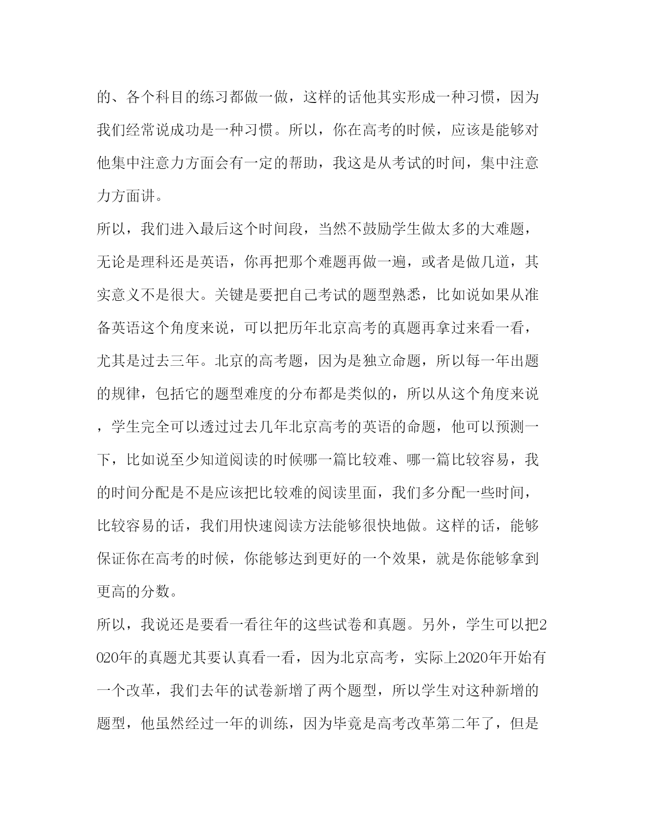 PAGE此资料由网络收集而来,如有侵权请告知上传者立即删除。资料共分享,我们负责传递知识。高考英语学习计划高考前三天正好赶上端午节假期,因为往年的经验是这样的,高三的学生可能到最后一个阶段,有一部分人是选择了在家彻底地休息了,我也知道往年的学生最后几天大家聚在一起,一起出去玩,或者有的学生在家打游戏。当然我不是说这些不可以,因为确实有学生的确是很厉害,真的是问过他们高考前,他们自己那几天在做什么,可能好多人都是在家休息,或者说出去玩。当然这些学生本身很厉害,他对高考已经胜券在握了,就没有问题。卓越教育小编整理了相关资料,以供参考:其实从我个人角度而言,对于大多数的学生,这几天的话,除了适当休息之外,我们还是应该把自己的作息时间调整。第一个需要注意的就是,在高考的这几天,我们知道考试的时间是上午一个时间段、下午一个时间段。所以,在这个时间段能不能保证自己能够有最大的集中注意力的时间段,其实你在考前的这几天、休息的这三四天的时间里面,你可以充分地去调整。比如说举个例子,当然我们休息可能是第一位的,一定要保证充足的睡眠。在此基础上,我们可以在考前三四天,休息的这几天,我们把做练习的时间都集中在和我们高考,正好是上下午那个时间段一样。这样的话,学生在这两三个小时里面,能够集中注意力去把自己相应的、各个科目的练习都做一做,这样的话他其实形成一种习惯,因为我们经常说成功是一种习惯。所以,你在高考的时候,应该是能够对他集中注意力方面会有一定的帮助,我这是从考试的时间,集中注意力方面讲。所以,我们进入最后这个时间段,当然不鼓励学生做太多的大难题,无论是理科还是英语,你再把那个难题再做一遍,或者是做几道,其实意义不是很大。关键是要把自己考试的题型熟悉,比如说如果从准备英语这个角度来说,可以把历年北京高考的真题再拿过来看一看,尤其是过去三年。北京的高考题,因为是独立命题,所以每一年出题的规律,包括它的题型难度的分布都是类似的,所以从这个角度来说,学生完全可以透过过去几年北京高考的英语的命题,他可以预测一下,比如说至少知道阅读的时候哪一篇比较难、哪一篇比较容易,我的时间分配是不是应该把比较难的阅读里面,我们多分配一些时间,比较容易的话,我们用快速阅读方法能够很快地做。这样的话,能够保证你在高考的时候,你能够达到更好的一个效果,就是你能够拿到更高的分数。所以,我说还是要看一看往年的这些试卷和真题。另外,学生可以把2020年的真题尤其要认真看一看,因为北京高考,实际上2020年开始有一个改革,我们去年的试卷新增了两个题型,所以学生对这种新增的题型,他虽然经过一年的训练,因为毕竟是高考改革第二年了,但是从去年的试卷,我们至少可以知道这种新增的题型,包括题型增加了,他的考试的时间分配,你做题的时候就应该有所改善。所以,这种分配透过去年的试卷,会有更好的一个借鉴作用。