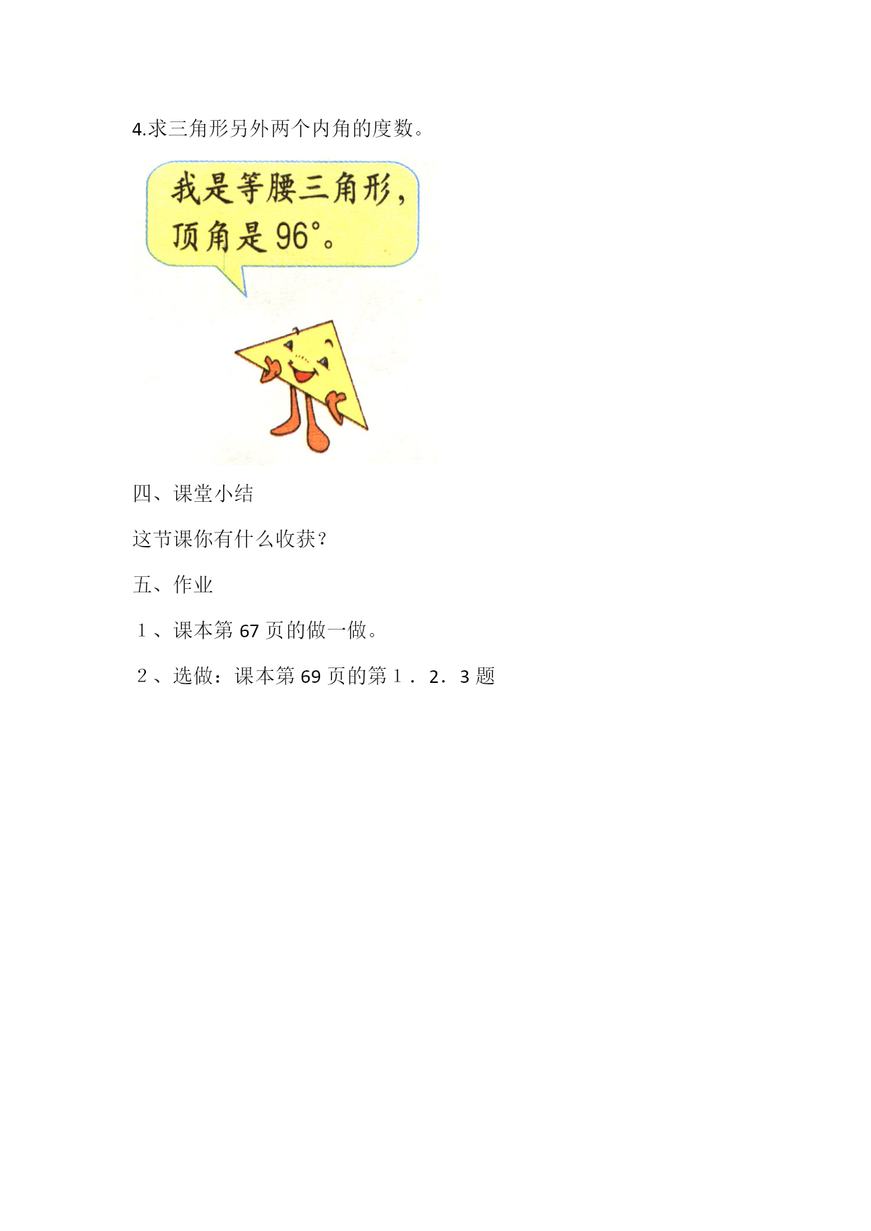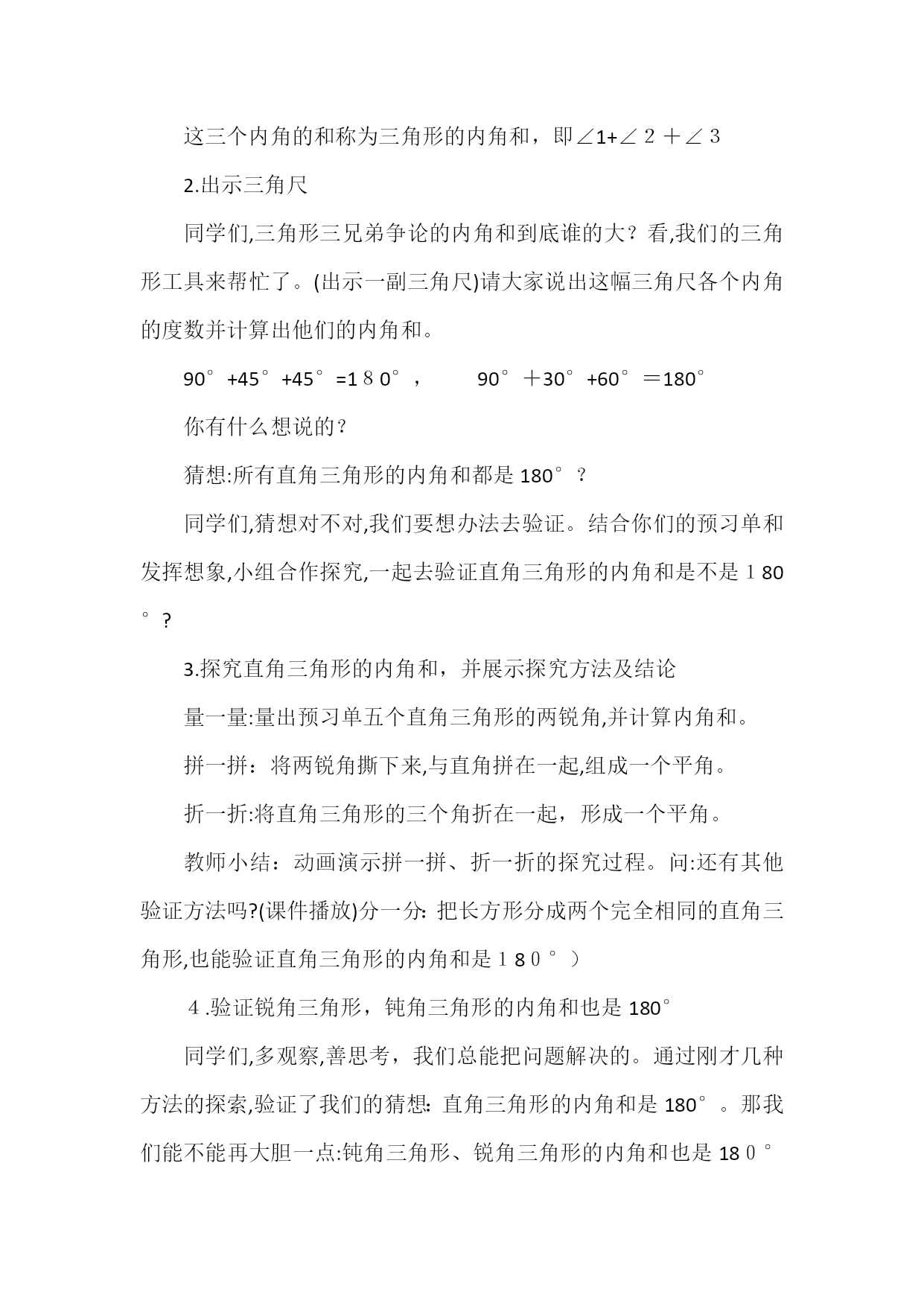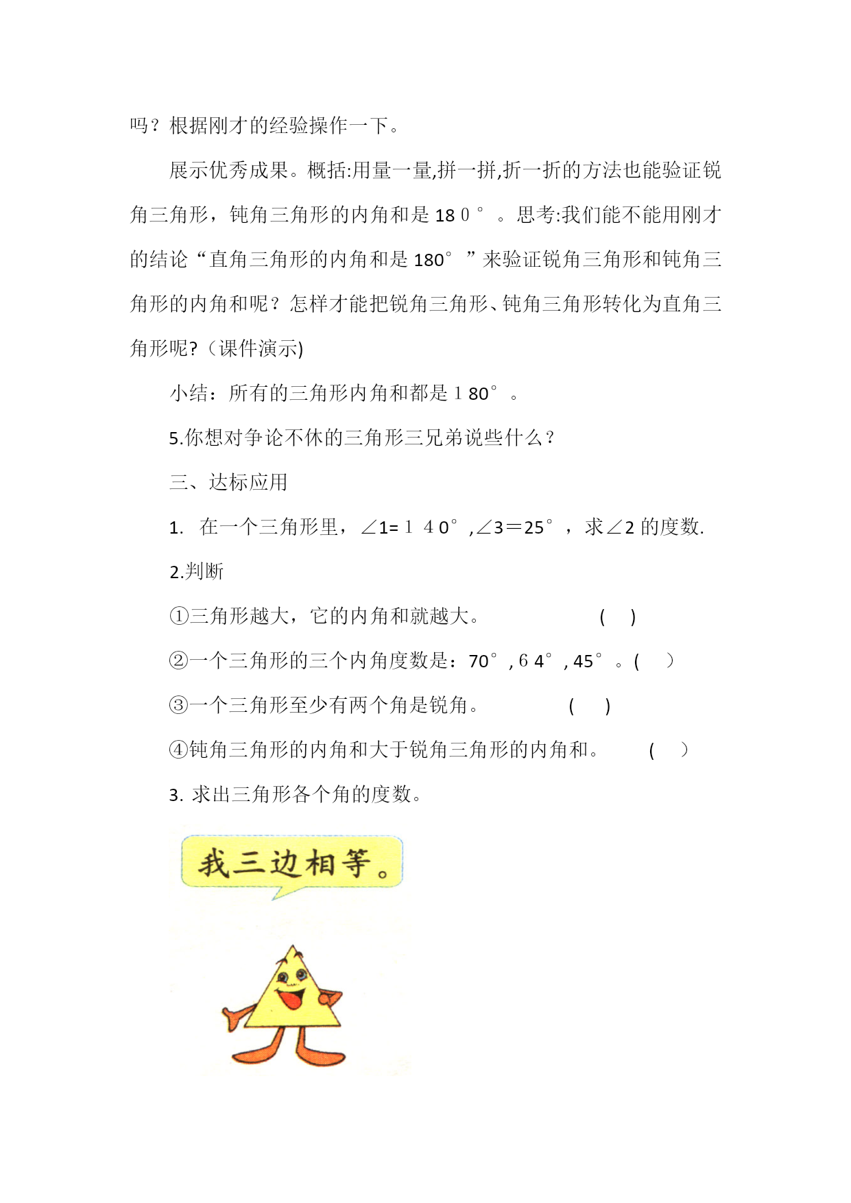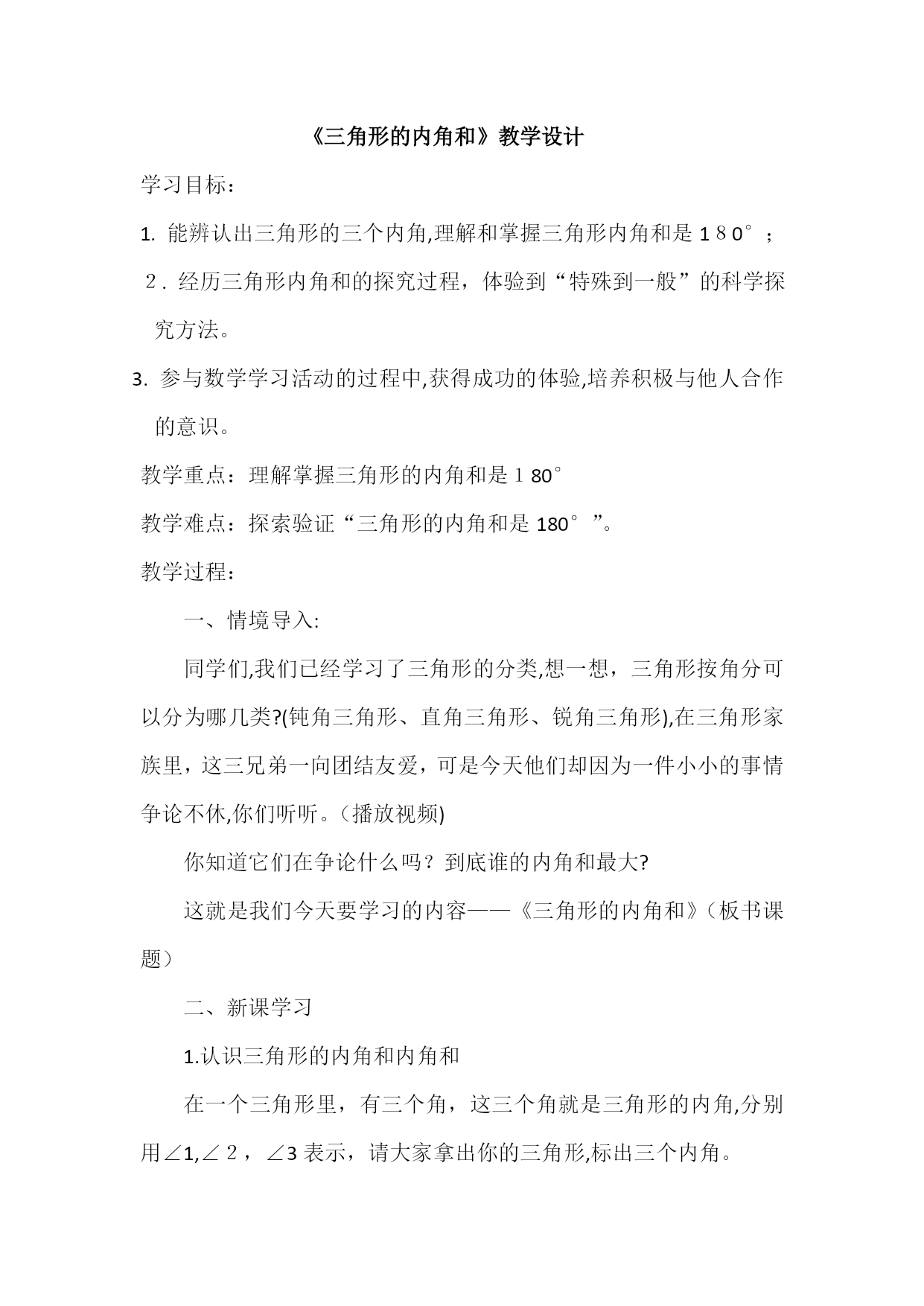 《三角形的内角和》教学设计学习目标:1.能辨认出三角形的三个内角,理解和掌握三角形内角和是180°;2.经历三角形内角和的探究过程,体验到“特殊到一般”的科学探究方法。3.参与数学学习活动的过程中,获得成功的体验,培养积极与他人合作的意识。教学重点:理解掌握三角形的内角和是180°教学难点:探索验证“三角形的内角和是180°”。教学过程:一、情境导入:同学们,我们已经学习了三角形的分类,想一想,三角形按角分可以分为哪几类?(钝角三角形、直角三角形、锐角三角形),在三角形家族里,这三兄弟一向团结友爱,可是今天他们却因为一件小小的事情争论不休,你们听听。(播放视频)你知道它们在争论什么吗?到底谁的内角和最大?这就是我们今天要学习的内容——《三角形的内角和》(板书课题)二、新课学习1.认识三角形的内角和内角和在一个三角形里,有三个角,这三个角就是三角形的内角,分别用∠1,∠2,∠3表示,请大家拿出你的三角形,标出三个内角。这三个内角的和称为三角形的内角和,即∠1+∠2+∠32.出示三角尺同学们,三角形三兄弟争论的内角和到底谁的大?看,我们的三角形工具来帮忙了。(出示一副三角尺)请大家说出这幅三角尺各个内角的度数并计算出他们的内角和。90°+45°+45°=180°,90°+30°+60°=180°你有什么想说的?猜想:所有直角三角形的内角和都是180°?同学们,猜想对不对,我们要想办法去验证。结合你们的预习单和发挥想象,小组合作探究,一起去验证直角三角形的内角和是不是180°?3.探究直角三角形的内角和,并展示探究方法及结论量一量:量出预习单五个直角三角形的两锐角,并计算内角和。拼一拼:将两锐角撕下来,与直角拼在一起,组成一个平角。折一折:将直角三角形的三个角折在一起,形成一个平角。教师小结:动画演示拼一拼、折一折的探究过程。问:还有其他验证方法吗?(课件播放)分一分:把长方形分成两个完全相同的直角三角形,也能验证直角三角形的内角和是180°)4.验证锐角三角形,钝角三角形的内角和也是180°同学们,多观察,善思考,我们总能把问题解决的。通过刚才几种方法的探索,验证了我们的猜想:直角三角形的内角和是180°。那我们能不能再大胆一点:钝角三角形、锐角三角形的内角和也是180°吗?根据刚才的经验操作一下。展示优秀成果。概括:用量一量,拼一拼,折一折的方法也能验证锐角三角形,钝角三角形的内角和是180°。思考:我们能不能用刚才的结论“直角三角形的内角和是180°”来验证锐角三角形和钝角三角形的内角和呢?怎样才能把锐角三角形、钝角三角形转化为直角三角形呢?(课件演示)小结:所有的三角形内角和都是180°。5.你想对争论不休的三角形三兄弟说些什么?三、达标应用1.在一个三角形里,∠1=140°,∠3=25°,求∠2的度数.2.判断①三角形越大,它的内角和就越大。()②一个三角形的三个内角度数是:70°,64°,45°。()③一个三角形至少有两个角是锐角。()④钝角三角形的内角和大于锐角三角形的内角和。()3.求出三角形各个角的度数。4.求三角形另外两个内角的度数。四、课堂小结这节课你有什么收获?五、作业1、课本的做一做。2、选做:课本的第1.2.3题