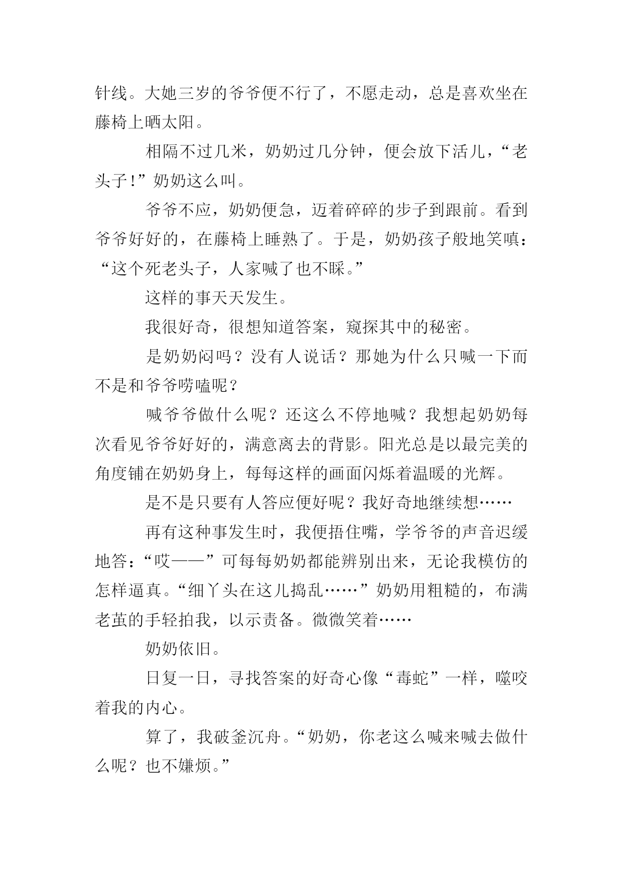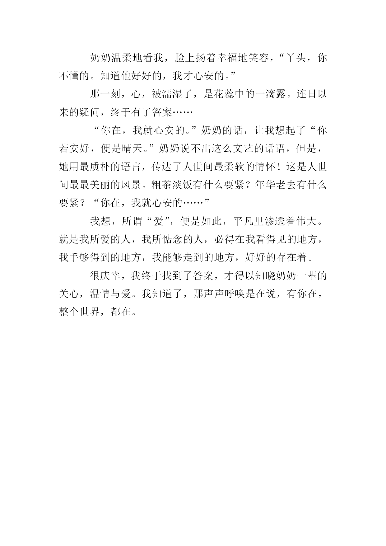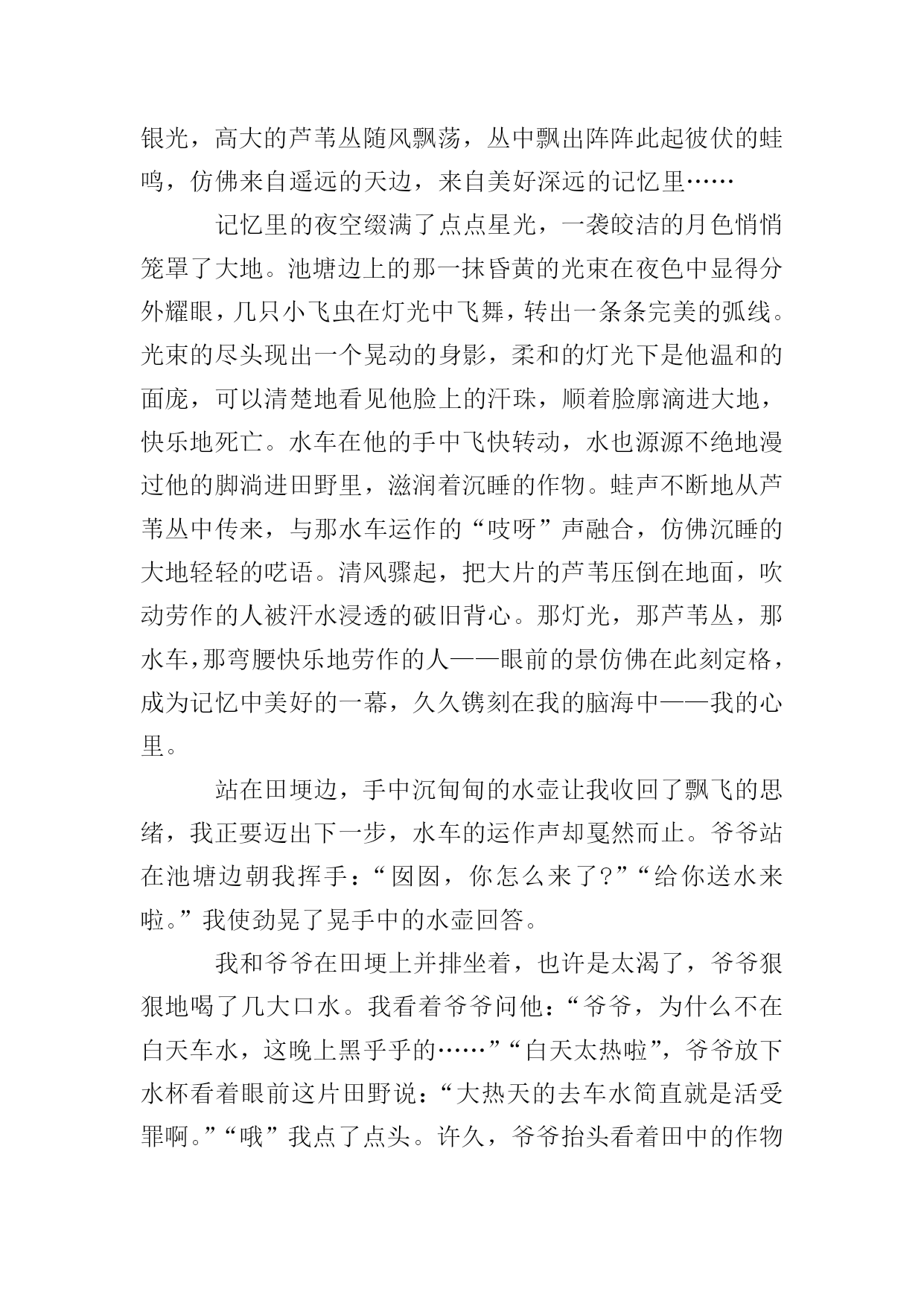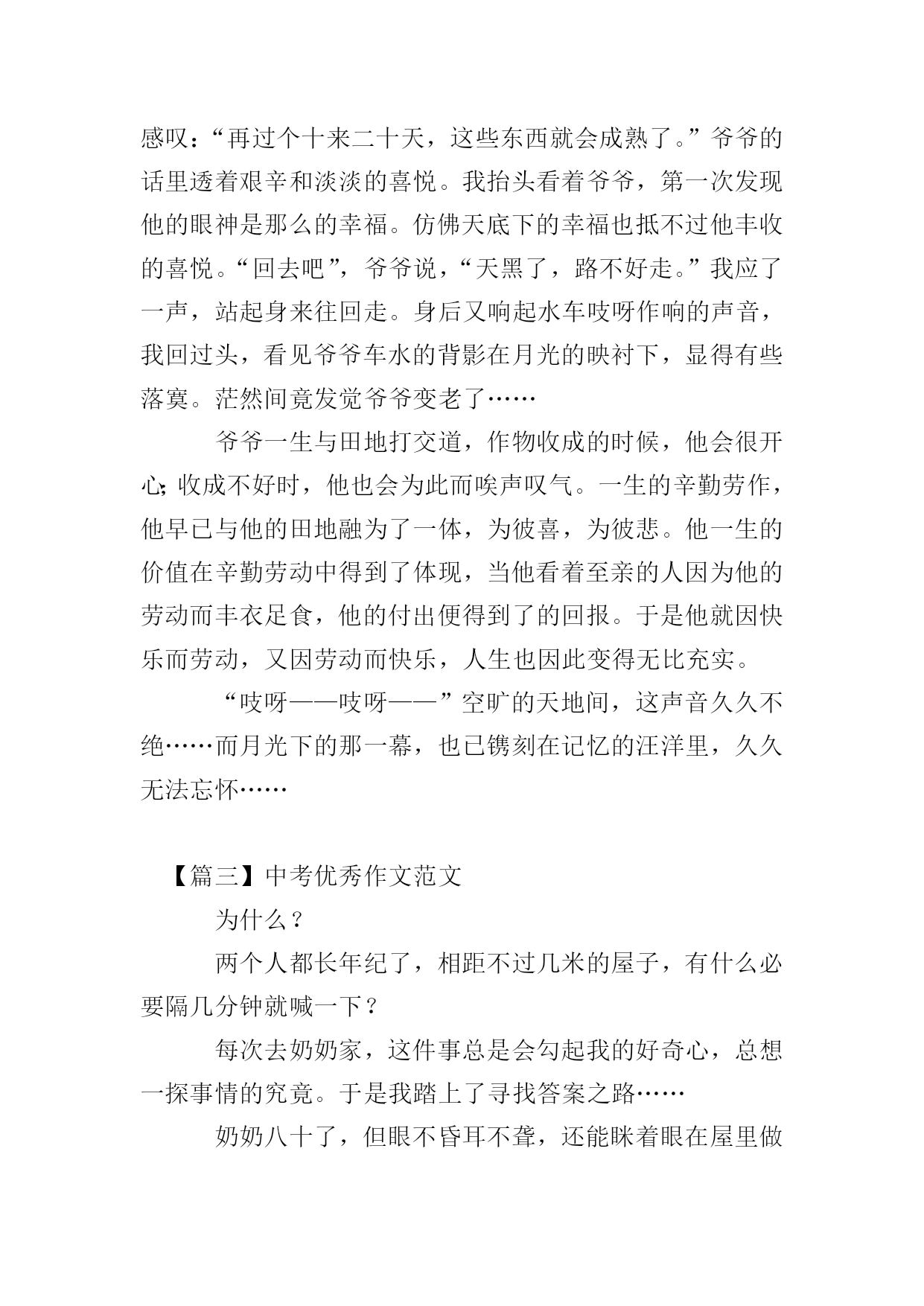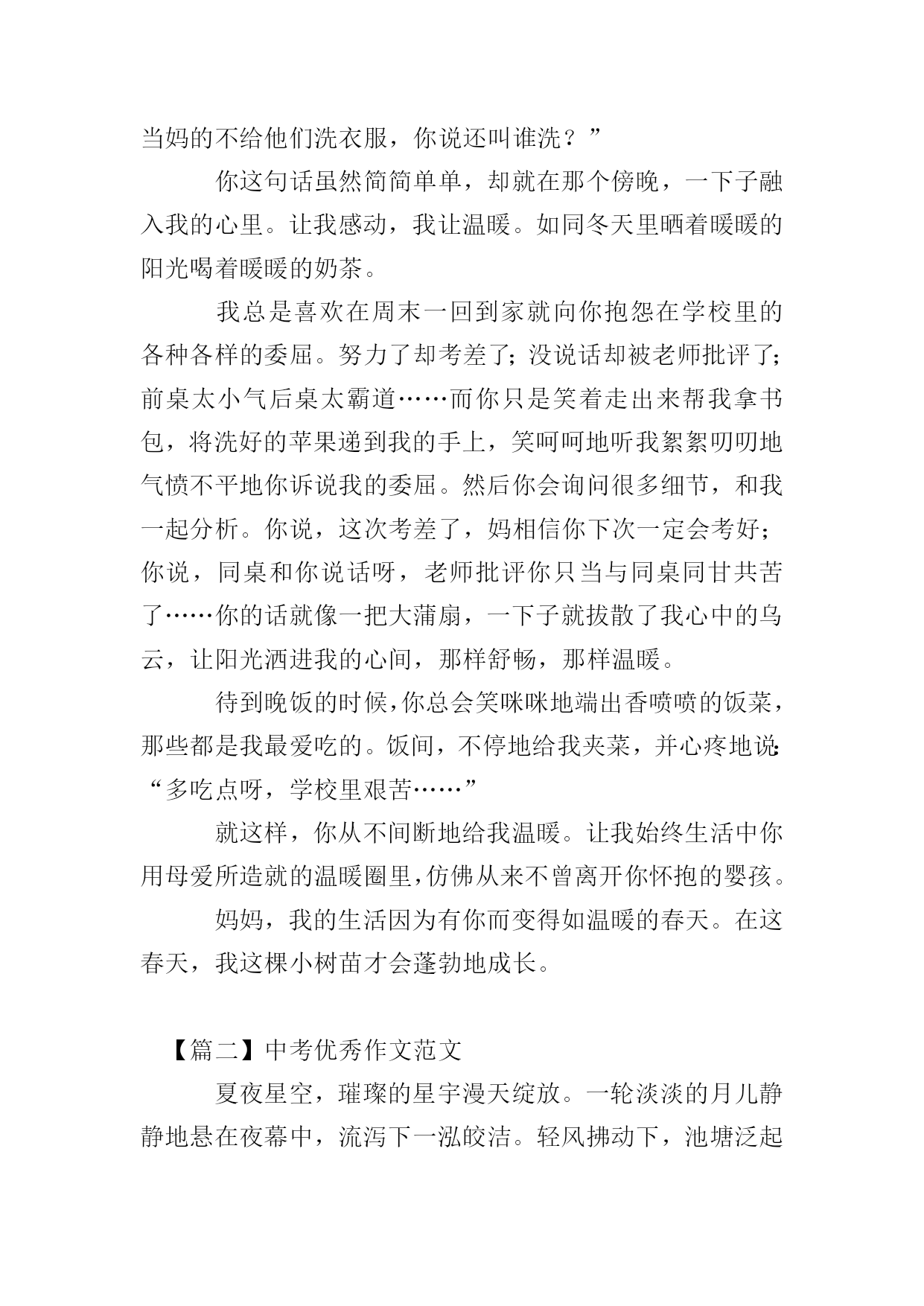 中考优秀作文范文:亲情温暖【篇一】中考优秀作文范文生活中,你一直是简简单单朴实无华,但这并不妨碍你给我带来无尽的感动。平凡的生活因为有你而变得春光无限,温暖如春。你总是穿着那件已发白的外套,手上早已磨出了厚厚的茧,深浅分明的裂痕如同那因干涸而炸裂的土地。可是每次为我买衣服时,你却是极尽大方。你总是笑呵呵地说:“姑娘,你已经是初中生,不能再像小时候那样穿得随便了。不然同学们会笑话的。”然后,你伸着那干裂的手为我挑选那些红的黄的绿的服饰。你说,姑娘家就应该穿得像朵花似的。穿着你挑的衣服,镜子里的那个女孩子果然如开在春天里的花儿,在你慈爱的目光中,感受着来自你的温暖与爱意。你是否还记得那一天你同别人说的那一句话?或许你早已忘记。因为你总是眷顾着女儿却忘了自己。但是它却深深地留在我的脑海里,那样清晰。那天,你才忙完了农田里的活,回到家里。本想休息一下,可是一眼却看到了木盆里装满了我换下的衣裳,你摇摇头叹了一回气,却还是搬来了那个小木凳在木盆边坐了下来。这时,邻居刘姨来找你聊天,看你刚忙完了农活,却又回来洗衣服。不禁连连夸你勤快。并说:“我天天洗衣服都洗烦了!”可你却笑呵呵地说:“哎,有什么勤快不勤快的,当妈的不给他们洗衣服,你说还叫谁洗?”你这句话虽然简简单单,却就在那个傍晚,一下子融入我的心里。让我感动,我让温暖。如同冬天里晒着暖暖的阳光喝着暖暖的奶茶。我总是喜欢在周末一回到家就向你抱怨在学校里的各种各样的委屈。努力了却考差了;没说话却被老师批评了;前桌太小气后桌太霸道……而你只是笑着走出来帮我拿书包,将洗好的苹果递到我的手上,笑呵呵地听我絮絮叨叨地气愤不平地你诉说我的委屈。然后你会询问很多细节,和我一起分析。你说,这次考差了,妈相信你下次一定会考好;你说,同桌和你说话呀,老师批评你只当与同桌同甘共苦了……你的话就像一把大蒲扇,一下子就拔散了我心中的乌云,让阳光洒进我的心间,那样舒畅,那样温暖。待到晚饭的时候,你总会笑咪咪地端出香喷喷的饭菜,那些都是我最爱吃的。饭间,不停地给我夹菜,并心疼地说:“多吃点呀,学校里艰苦……”就这样,你从不间断地给我温暖。让我始终生活中你用母爱所造就的温暖圈里,仿佛从来不曾离开你怀抱的婴孩。妈妈,我的生活因为有你而变得如温暖的春天。在这春天,我这棵小树苗才会蓬勃地成长。【篇二】中考优秀作文范文夏夜星空,璀璨的星宇漫天绽放。一轮淡淡的月儿静静地悬在夜幕中,流泻下一泓皎洁。轻风拂动下,池塘泛起银光,高大的芦苇丛随风飘荡,丛中飘出阵阵此起彼伏的蛙鸣,仿佛来自遥远的天边,来自美好深远的记忆里……记忆里的夜空缀满了点点星光,一袭皎洁的月色悄悄笼罩了大地。池塘边上的那一抹昏黄的光束在夜色中显得分外耀眼,几只小飞虫在灯光中飞舞,转出一条条完美的弧线。光束的尽头现出一个晃动的身影,柔和的灯光下是他温和的面庞,可以清楚地看见他脸上的汗珠,顺着脸廓滴进大地,快乐地死亡。水车在他的手中飞快转动,水也源源不绝地漫过他的脚淌进田野里,滋润着沉睡的作物。蛙声不断地从芦苇丛中传来,与那水车运作的“吱呀”声融合,仿佛沉睡的大地轻轻的呓语。清风骤起,把大片的芦苇压倒在地面,吹动劳作的人被汗水浸透的破旧背心。那灯光,那芦苇丛,那水车,那弯腰快乐地劳作的人——眼前的景仿佛在此刻定格,成为记忆中美好的一幕,久久镌刻在我的脑海中——我的心里。站在田埂边,手中沉甸甸的水壶让我收回了飘飞的思绪,我正要迈出下一步,水车的运作声却戛然而止。爷爷站在池塘边朝我挥手:“囡囡,你怎么来了?”“给你送水来啦。”我使劲晃了晃手中的水壶回答。我和爷爷在田埂上并排坐着,也许是太渴了,爷爷狠狠地喝了几大口水。我看着爷爷问他:“爷爷,为什么不在白天车水,这晚上黑乎乎的……”“白天太热啦”,爷爷放下水杯看着眼前这片田野说:“大热天的去车水简直就是活受罪啊。”“哦”我点了点头。许久,爷爷抬头看着田中的作物感叹:“再过个十来二十天,这些东西就会成熟了。”爷爷的话里透着艰辛和淡淡的喜悦。我抬头看着爷爷,第一次发现他的眼神是那么的幸福。仿佛天底下的幸福也抵不过他丰收的喜悦。“回去吧”,爷爷说,“天黑了,路不好走。”我应了一声,站起身来往回走。身后又响起水车吱呀作响的声音,我回过头,看见爷爷车水的背影在月光的映衬下,显得有些落寞。茫然间竟发觉爷爷变老了……爷爷一生与田地打交道,作物收成的时候,他会很开心;收成不好时,他也会为此而唉声叹气。一生的辛勤劳作,他早已与他的田地融为了一体,为彼喜,为彼悲。他一生的价值在辛勤劳动中得到了体现,当他看着至亲的人因为他的劳动而丰衣足食,他的付出便得到了的回报。于是他就因快乐而劳动,又因劳动而快乐,人生也因此变得无比充实。“吱呀——吱呀——”空旷的天地间,这声音久久不绝…