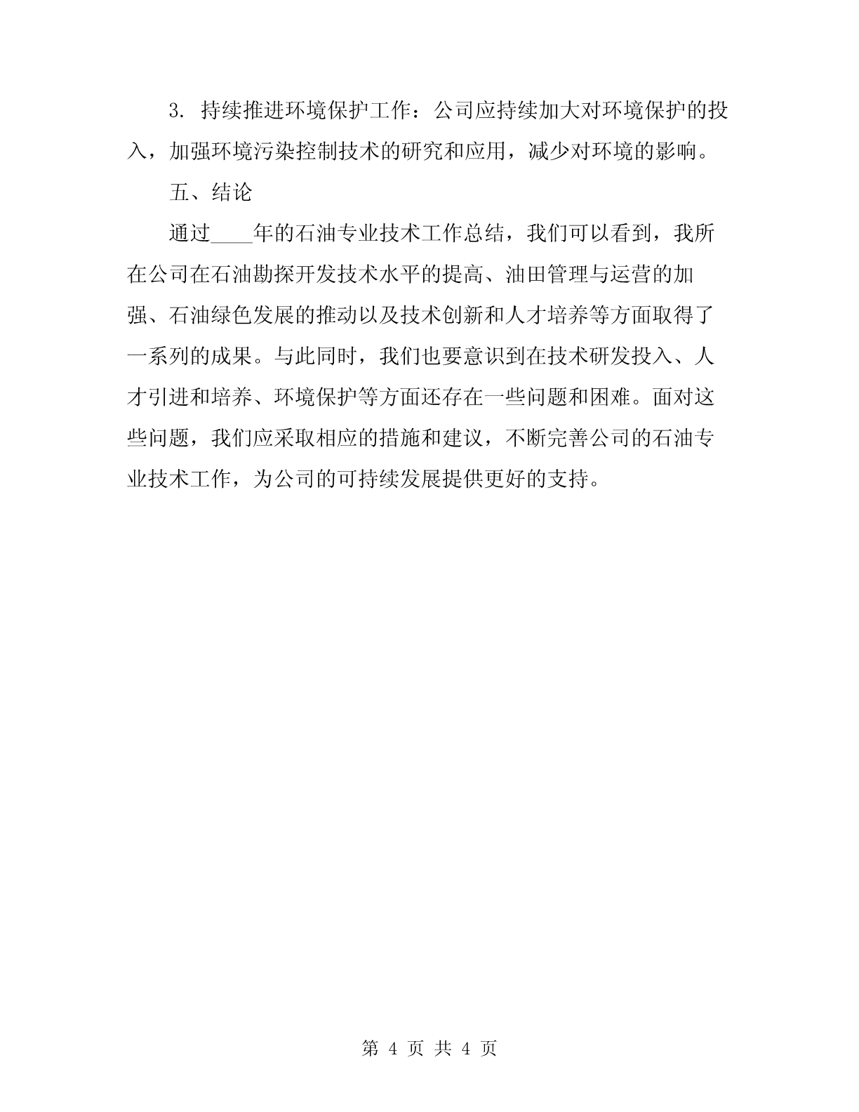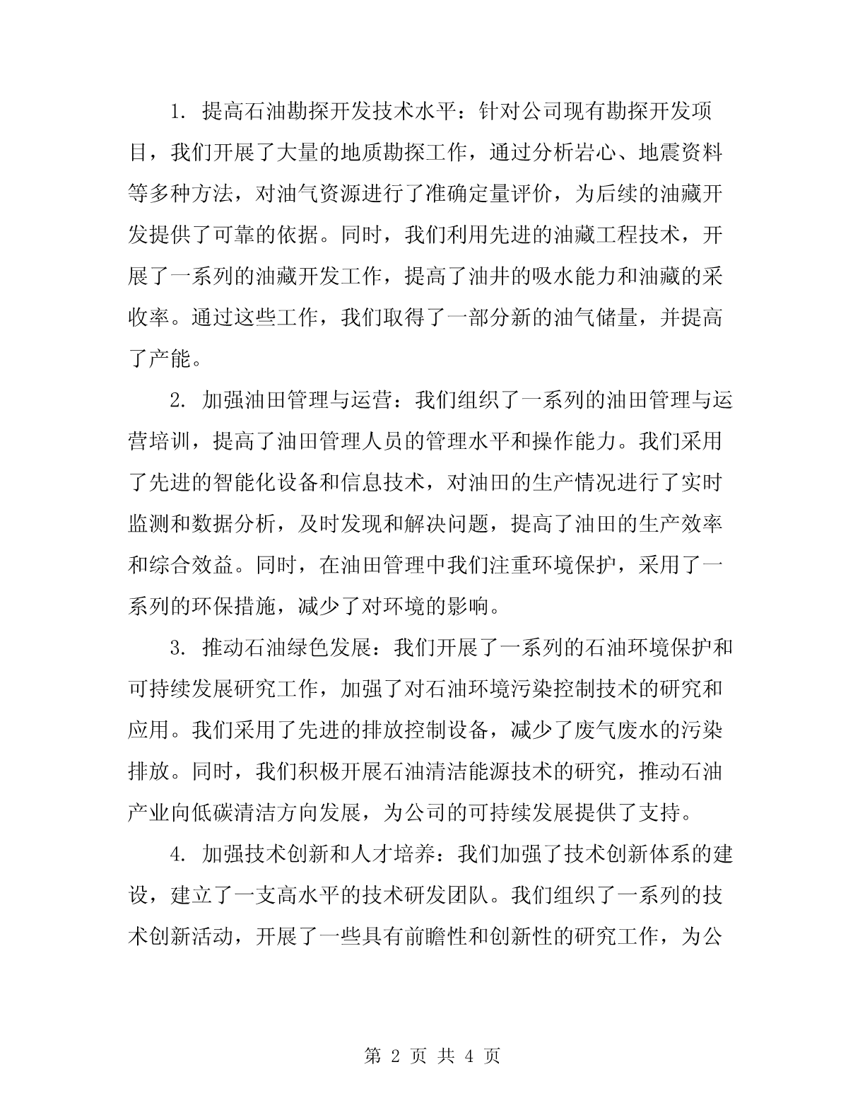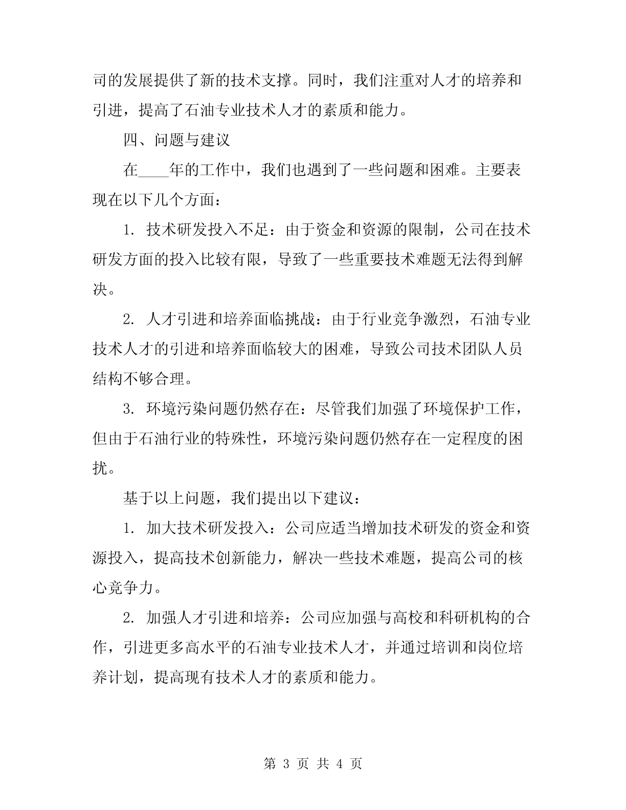 2024年石油专业技术工作总结范文____年石油专业技术工作总结一、引言近年来,随着全球石油需求的不断增长和能源产业的快速发展,石油专业技术工作的重要性逐渐凸显出来。作为石油行业的中坚力量,我们石油专业技术工作者在____年的工作中取得了一系列的成果和进展。本文将对我所在公司____年的石油专业技术工作总结进行详细阐述。二、目标与任务____年,我所在公司的石油专业技术工作主要围绕以下目标展开:1.提高石油勘探开发技术水平:通过开展油气勘探、储层评价、油藏开发等技术研究,提高勘探开发成功率和产能。2.加强油田管理与运营:通过研究和应用油田管理与运营技术,提高油田综合效益和生产效率。3.推动石油绿色发展:加强对石油环境保护和可持续发展的研究,推动石油产业向低碳清洁方向发展。4.加强技术创新和人才培养:积极开展技术创新,培养高素质的石油专业技术人才。三、工作内容与成果在____年的工作中,我所在公司在以上目标的指导下,开展了一系列的石油专业技术工作,并取得了一定的成果。1.提高石油勘探开发技术水平:针对公司现有勘探开发项目,我们开展了大量的地质勘探工作,通过分析岩心、地震资料等多种方法,对油气资源进行了准确定量评价,为后续的油藏开发提供了可靠的依据。同时,我们利用先进的油藏工程技术,开展了一系列的油藏开发工作,提高了油井的吸水能力和油藏的采收率。通过这些工作,我们取得了一部分新的油气储量,并提高了产能。2.加强油田管理与运营:我们组织了一系列的油田管理与运营培训,提高了油田管理人员的管理水平和操作能力。我们采用了先进的智能化设备和信息技术,对油田的生产情况进行了实时监测和数据分析,及时发现和解决问题,提高了油田的生产效率和综合效益。同时,在油田管理中我们注重环境保护,采用了一系列的环保措施,减少了对环境的影响。3.推动石油绿色发展:我们开展了一系列的石油环境保护和可持续发展研究工作,加强了对石油环境污染控制技术的研究和应用。我们采用了先进的排放控制设备,减少了废气废水的污染排放。同时,我们积极开展石油清洁能源技术的研究,推动石油产业向低碳清洁方向发展,为公司的可持续发展提供了支持。4.加强技术创新和人才培养:我们加强了技术创新体系的建设,建立了一支高水平的技术研发团队。我们组织了一系列的技术创新活动,开展了一些具有前瞻性和创新性的研究工作,为公司的发展提供了新的技术支撑。同时,我们注重对人才的培养和引进,提高了石油专业技术人才的素质和能力。四、问题与建议在____年的工作中,我们也遇到了一些问题和困难。主要表现在以下几个方面:1.技术研发投入不足:由于资金和资源的限制,公司在技术研发方面的投入比较有限,导致了一些重要技术难题无法得到解决。2.人才引进和培养面临挑战:由于行业竞争激烈,石油专业技术人才的引进和培养面临较大的困难,导致公司技术团队人员结构不够合理。3.环境污染问题仍然存在:尽管我们加强了环境保护工作,但由于石油行业的特殊性,环境污染问题仍然存在一定程度的困扰。基于以上问题,我们提出以下建议:1.加大技术研发投入:公司应适当增加技术研发的资金和资源投入,提高技术创新能力,解决一些技术难题,提高公司的核心竞争力。2.加强人才引进和培养:公司应加强与高校和科研机构的合作,引进更多高水平的石油专业技术人才,并通过培训和岗位培养计划,提高现有技术人才的素质和能力。3.持续推进环境保护工作:公司应持续加大对环境保护的投入,加强环境污染控制技术的研究和应用,减少对环境的影响。五、结论通过____年的石油专业技术工作总结,我们可以看到,我所在公司在石油勘探开发技术水平的提高、油田管理与运营的加强、石油绿色发展的推动以及技术创新和人才培养等方面取得了一系列的成果。与此同时,我们也要意识到在技术研发投入、人才引进和培养、环境保护等方面还存在一些问题和困难。面对这些问题,我们应采取相应的措施和建议,不断完善公司的石油专业技术工作,为公司的可持续发展提供更好的支持。
