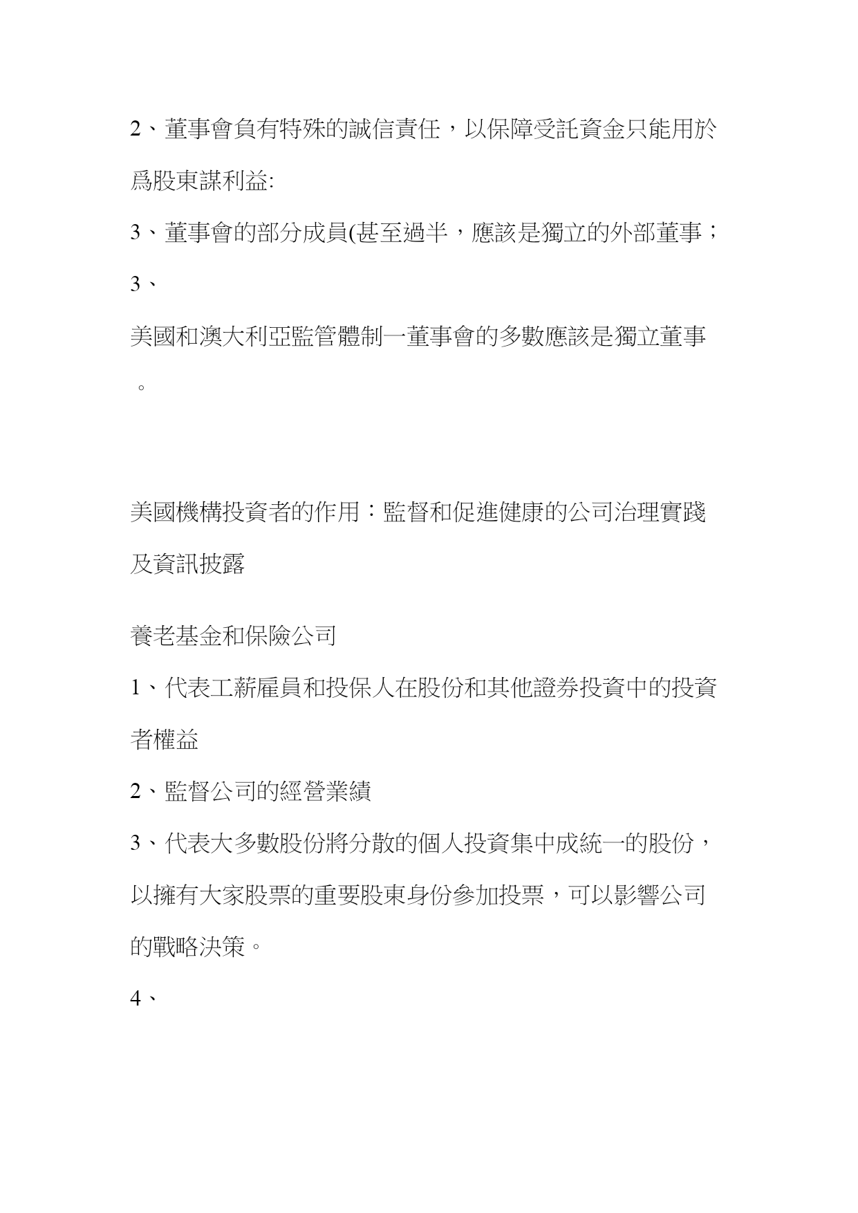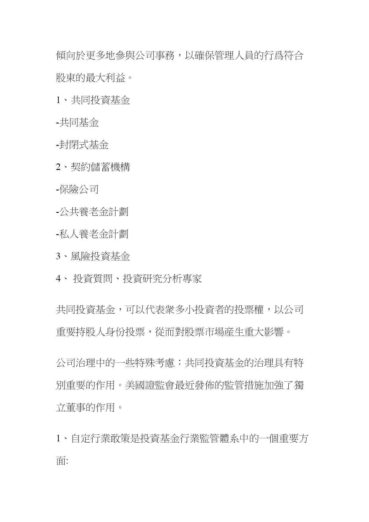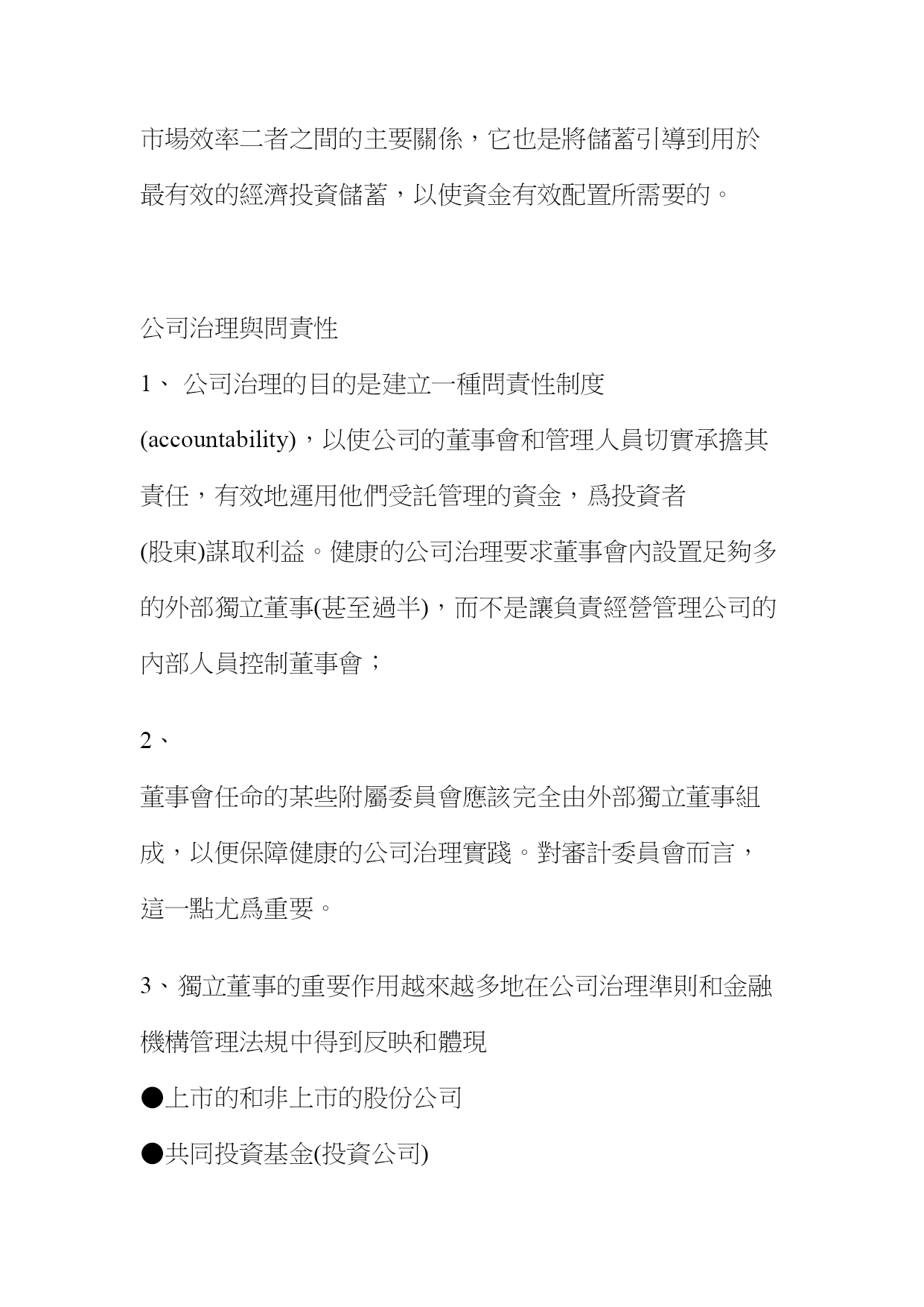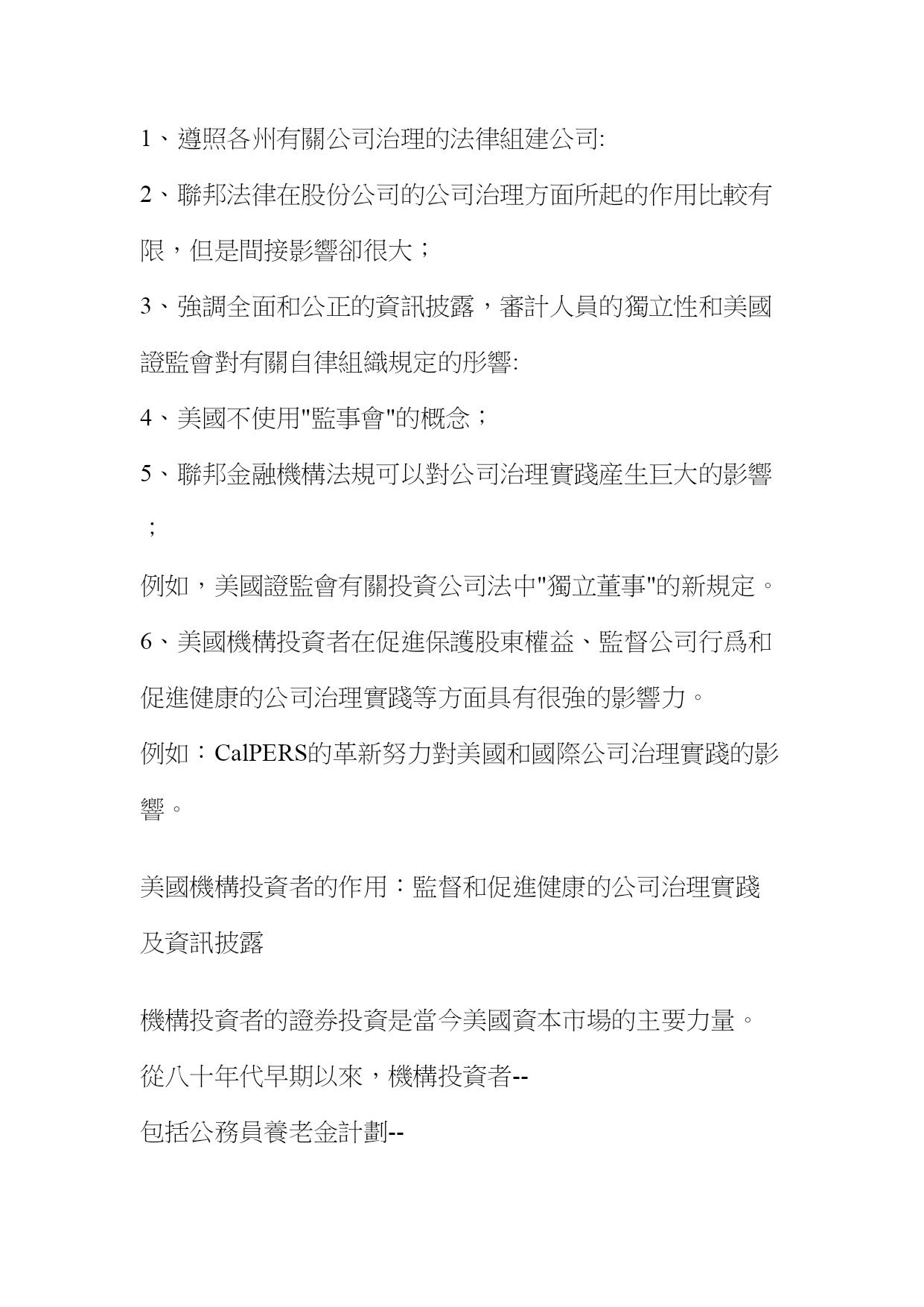 公司治理和獨立董事的作用——美國的經驗有效公司治理的基礎有效的公司治理必須具備某些重要的條件,以便股東行使其權利和對公司的經營業績施加積極影響,實現股東價值最大化。有效的公司治理基礎應該包括以下重要的基本條件:1、適用的法律法規、監管體系和會計準則;2、比較有效的資本市場和作爲其支柱或主要力量的機構投資者,實現資本的有效配置以實現股東(包括國家股東)投資回報的最大化;3、由於管理水平高而盈利的公司應該受到鼓勵,可以更優惠的條件進入資本市場融資籌資,而效率低的公司則很困難或根本不可能從市場上融資籌資。在公司治理中,獨立董事的作用爲建立有效的資本代理構架提供了基礎1、股東有權選擇董事會成員和影響董事會的決策對於保證企業增進股東(出資人)利益爲目的而進行經營,而不是單純從管理人員即"內部人"利益出發行事,這一點至爲關鍵。獨立董事對於現代公司治理制度能否成功也同樣很關鍵。2、健康的公司治理實踐與有效的資本市場(尤其是公司股票市場的發展有著直接和強固的聯繫。健康的公司治理實踐對於促進資金流動和可持續的經濟發展具有重要意義,因爲它使管理良好的企業得以低成本從資本市場融資。爲此,公司必須願意和能夠向潛在的投資者提供充分的資訊,使其能夠做出明智的投資或貸款決定。3、對於有外部公衆持股的公司,運用股東權利對董事會及公司管理層進行控制和監督,使其切實對自己的行爲承擔起責任,這就需要一個比較有效的公司股票市場。而有效的股票市場又依賴於那些應當能夠及時獲得可靠資訊的投資者(股東)。這就是體現在企業層次上的有效公司治理與資本市場效率二者之間的主要關係,它也是將儲蓄引導到用於最有效的經濟投資儲蓄,以使資金有效配置所需要的。公司治理與問責性1、公司治理的目的是建立一種問責性制度(accountability),以使公司的董事會和管理人員切實承擔其責任,有效地運用他們受託管理的資金,爲投資者(股東)謀取利益。健康的公司治理要求董事會內設置足夠多的外部獨立董事(甚至過半),而不是讓負責經營管理公司的內部人員控制董事會;2、董事會任命的某些附屬委員會應該完全由外部獨立董事組成,以便保障健康的公司治理實踐。對審計委員會而言,這一點尤爲重要。3、獨立董事的重要作用越來越多地在公司治理準則和金融機構管理法規中得到反映和體現●上市的和非上市的股份公司●共同投資基金(投資公司)◆公共和私人養老金計劃●銀行和保險法規國際慣例有效公司治理的原則在國際最佳慣例指引中的體現1、證監會國際組織(IOSCO)的證券監管原則2、經合組織(OECD)公司治理原則3、各國最佳實踐法規-澳大利亞Bossch委員會準則-倫教交易所委員會公司治理條例4、美國最佳實踐指引-加利福尼亞公務員退休基金(CalPERS)-商務圓桌會議組織-全國公司董事協會-通用汽車董事會的公司治理指引美國在公司治理方面的特色1、遵照各州有關公司治理的法律組建公司:2、聯邦法律在股份公司的公司治理方面所起的作用比較有限,但是間接影響卻很大;3、強調全面和公正的資訊披露,審計人員的獨立性和美國證監會對有關自律組織規定的彤響:4、美國不使用"監事會"的概念;5、聯邦金融機構法規可以對公司治理實踐産生巨大的影響;例如,美國證監會有關投資公司法中"獨立董事"的新規定。6、美國機構投資者在促進保護股東權益、監督公司行爲和促進健康的公司治理實踐等方面具有很強的影響力。例如:CalPERS的革新努力對美國和國際公司治理實踐的影響。美國機構投資者的作用:監督和促進健康的公司治理實踐及資訊披露機構投資者的證券投資是當今美國資本市場的主要力量。從八十年代早期以來,機構投資者--包括公務員養老金計劃--傾向於更多地參與公司事務,以確保管理人員的行爲符合股東的最大利益。1、共同投資基金-共同基金-封閉式基金2、契約儲蓄機構-保險公司-公共養老金計劃-私人養老金計劃3、風險投資基金4、投資質問、投資研究分析專家共同投資基金,可以代表衆多小投資者的投票權,以公司重要持股人身份投票,從而對股票市場産生重大影響。公司治理中的一些特殊考慮:共同投資基金的治理具有特別重要的作用。美國證監會最近發佈的監管措施加強了獨立董事的作用。1、自定行業敢策是投資基金行業監管體系中的一個重要方面:2、董事會負有特殊的誠信責任,以保障受託資金只能用於爲股東謀利益:3、董事會的部分成員(甚至過半,應該是獨立的外部董事;3、美國和澳大利亞監管體制一董事會的多數應該是獨立董事。美國機構投資者的作用:監督和促進健康的公司治理實踐及資訊披露養老基金和保險公司1、代表工薪雇員和投保人在股份和其他證券投資中的投資者權益2、監督公司的經營業績3、代表大多數股份將分散的個人投資集中成統一的股份,以擁有大家股票的重要股東身份參加投票,可以影響公司的戰略決