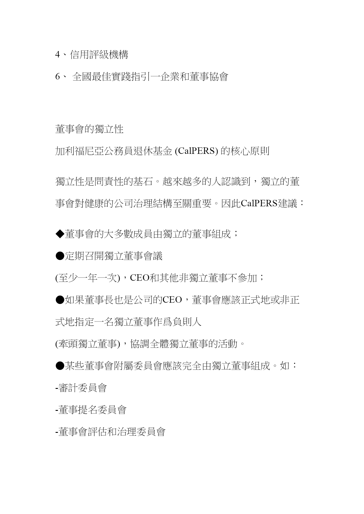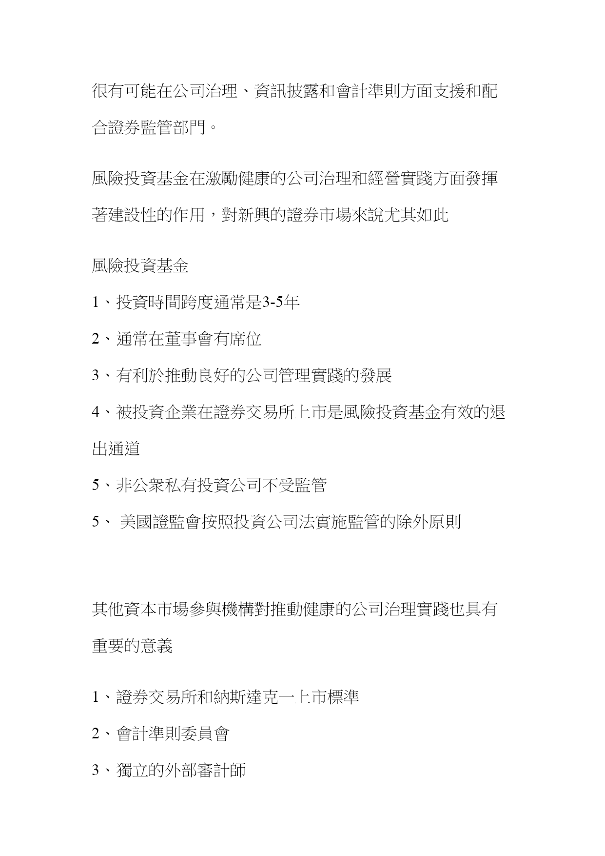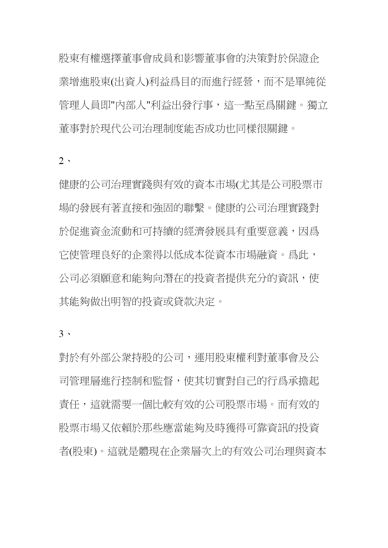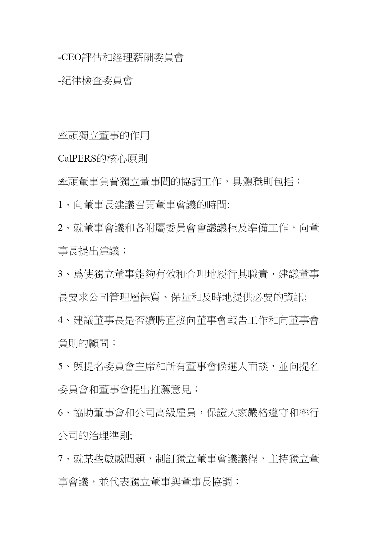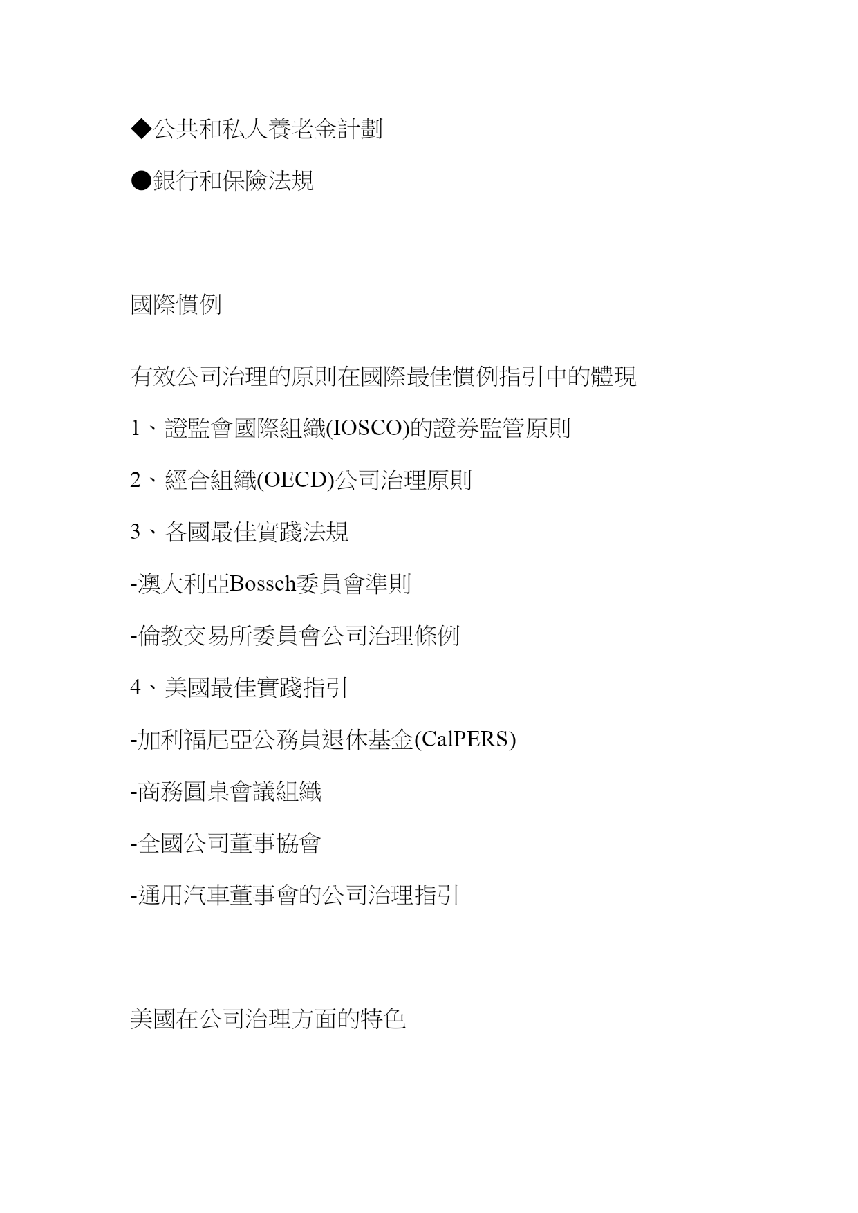 公司治理和獨立董事的作用——美國的經驗有效公司治理的基礎有效的公司治理必須具備某些重要的條件,以便股東行使其權利和對公司的經營業績施加積極影響,實現股東價值最大化。有效的公司治理基礎應該包括以下重要的基本條件:1、適用的法律法規、監管體系和會計準則;2、比較有效的資本市場和作爲其支柱或主要力量的機構投資者,實現資本的有效配置以實現股東(包括國家股東)投資回報的最大化;3、由於管理水平高而盈利的公司應該受到鼓勵,可以更優惠的條件進入資本市場融資籌資,而效率低的公司則很困難或根本不可能從市場上融資籌資。在公司治理中,獨立董事的作用爲建立有效的資本代理構架提供了基礎1、股東有權選擇董事會成員和影響董事會的決策對於保證企業增進股東(出資人)利益爲目的而進行經營,而不是單純從管理人員即"內部人"利益出發行事,這一點至爲關鍵。獨立董事對於現代公司治理制度能否成功也同樣很關鍵。2、健康的公司治理實踐與有效的資本市場(尤其是公司股票市場的發展有著直接和強固的聯繫。健康的公司治理實踐對於促進資金流動和可持續的經濟發展具有重要意義,因爲它使管理良好的企業得以低成本從資本市場融資。爲此,公司必須願意和能夠向潛在的投資者提供充分的資訊,使其能夠做出明智的投資或貸款決定。3、對於有外部公衆持股的公司,運用股東權利對董事會及公司管理層進行控制和監督,使其切實對自己的行爲承擔起責任,這就需要一個比較有效的公司股票市場。而有效的股票市場又依賴於那些應當能夠及時獲得可靠資訊的投資者(股東)。這就是體現在企業層次上的有效公司治理與資本市場效率二者之間的主要關係,它也是將儲蓄引導到用於最有效的經濟投資儲蓄,以使資金有效配置所需要的。公司治理與問責性1、公司治理的目的是建立一種問責性制度(accountability),以使公司的董事會和管理人員切實承擔其責任,有效地運用他們受託管理的資金,爲投資者(股東)謀取利益。健康的公司治理要求董事會內設置足夠多的外部獨立董事(甚至過半),而不是讓負責經營管理公司的內部人員控制董事會;2、董事會任命的某些附屬委員會應該完全由外部獨立董事組成,以便保障健康的公司治理實踐。對審計委員會而言,這一點尤爲重要。3、獨立董事的重要作用越來越多地在公司治理準則和金融機構管理法規中得到反映和體現●上市的和非上市的股份公司●共同投資基金(投資公司)◆公共和私人養老金計劃●銀行和保險法規國際慣例有效公司治理的原則在國際最佳慣例指引中的體現1、證監會國際組織(IOSCO)的證券監管原則2、經合組織(OECD)公司治理原則3、各國最佳實踐法規-澳大利亞Bossch委員會準則-倫教交易所委員會公司治理條例4、美國最佳實踐指引-加利福尼亞公務員退休基金(CalPERS)-商務圓桌會議組織-全國公司董事協會-通用汽車董事會的公司治理指引美國在公司治理方面的特色1、遵照各州有關公司治理的法律組建公司:2、聯邦法律在股份公司的公司治理方面所起的作用比較有限,但是間接影響卻很大;3、強調全面和公正的資訊披露,審計人員的獨立性和美國證監會對有關自律組織規定的彤響:4、美國不使用"監事會"的概念;5、聯邦金融機構法規可以對公司治理實踐産生巨大的影響;例如,美國證監會有關投資公司法中"獨立董事"的新規定。6、美國機構投資者在促進保護股東權益、監督公司行爲和促進健康的公司治理實踐等方面具有很強的影響力。例如:CalPERS的革新努力對美國和國際公司治理實踐的影響。美國機構投資者的作用:監督和促進健康的公司治理實踐及資訊披露機構投資者的證券投資是當今美國資本市場的主要力量。從八十年代早期以來,機構投資者--包括公務員養老金計劃--傾向於更多地參與公司事務,以確保管理人員的行爲符合股東的最大利益。1、共同投資基金-共同基金-封閉式基金2、契約儲蓄機構-保險公司-公共養老金計劃-私人養老金計劃3、風險投資基金4、投資質問、投資研究分析專家共同投資基金,可以代表衆多小投資者的投票權,以公司重要持股人身份投票,從而對股票市場産生重大影響。公司治理中的一些特殊考慮:共同投資基金的治理具有特別重要的作用。美國證監會最近發佈的監管措施加強了獨立董事的作用。1、自定行業敢策是投資基金行業監管體系中的一個重要方面:2、董事會負有特殊的誠信責任,以保障受託資金只能用於爲股東謀利益:3、董事會的部分成員(甚至過半,應該是獨立的外部董事;3、美國和澳大利亞監管體制一董事會的多數應該是獨立董事。美國機構投資者的作用:監督和促進健康的公司治理實踐及資訊披露養老基金和保險公司1、代表工薪雇員和投保人在股份和其他證券投資中的投資者權益2、監督公司的經營業績3、代表大多數股份將分散的個人投資集中成統一的股份,以擁有大家股票的重要股東身份參加投票,可以影響公司的戰略決
