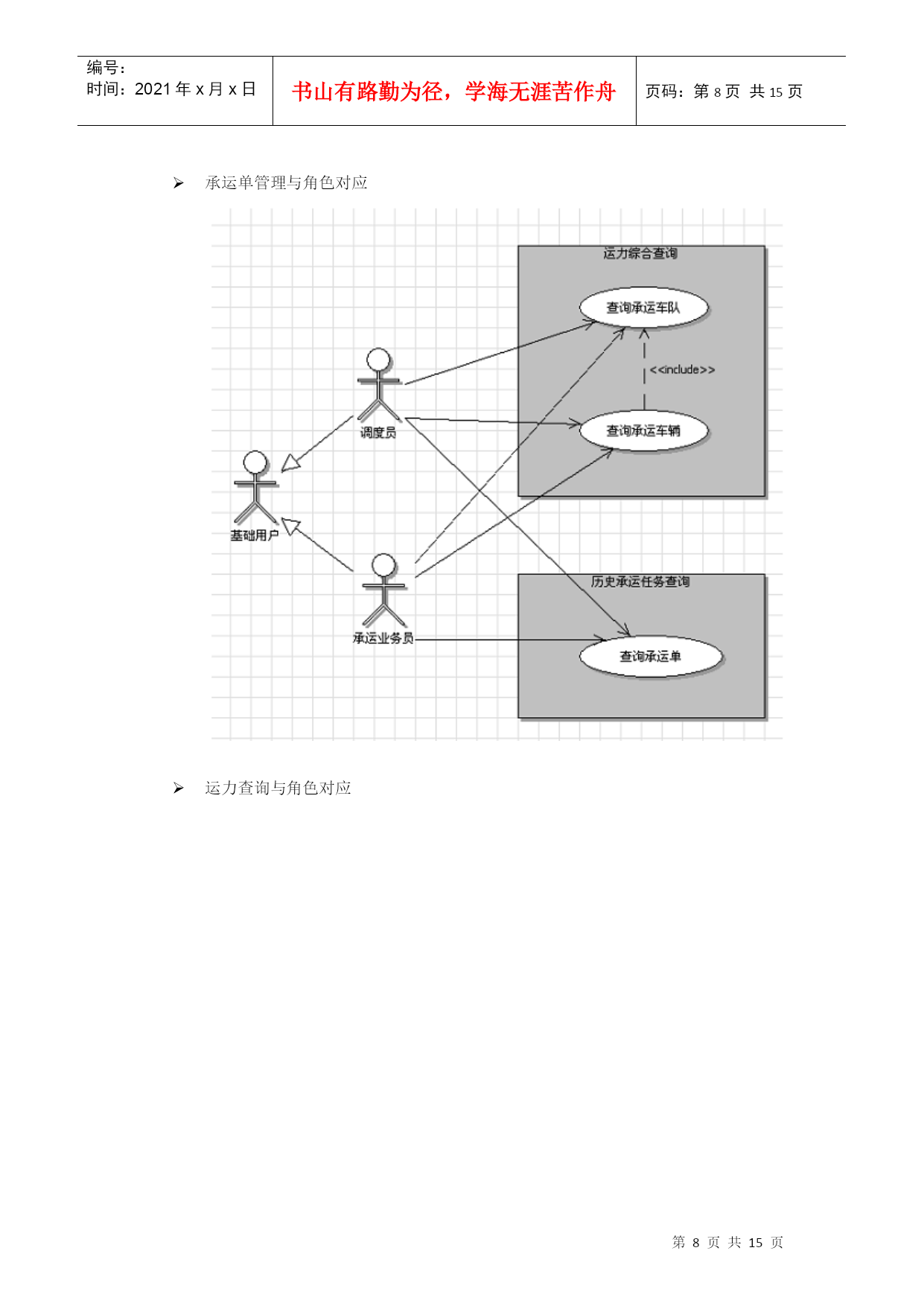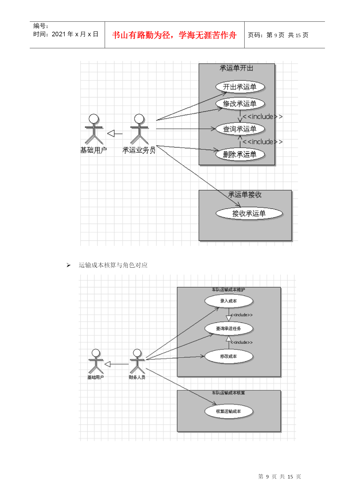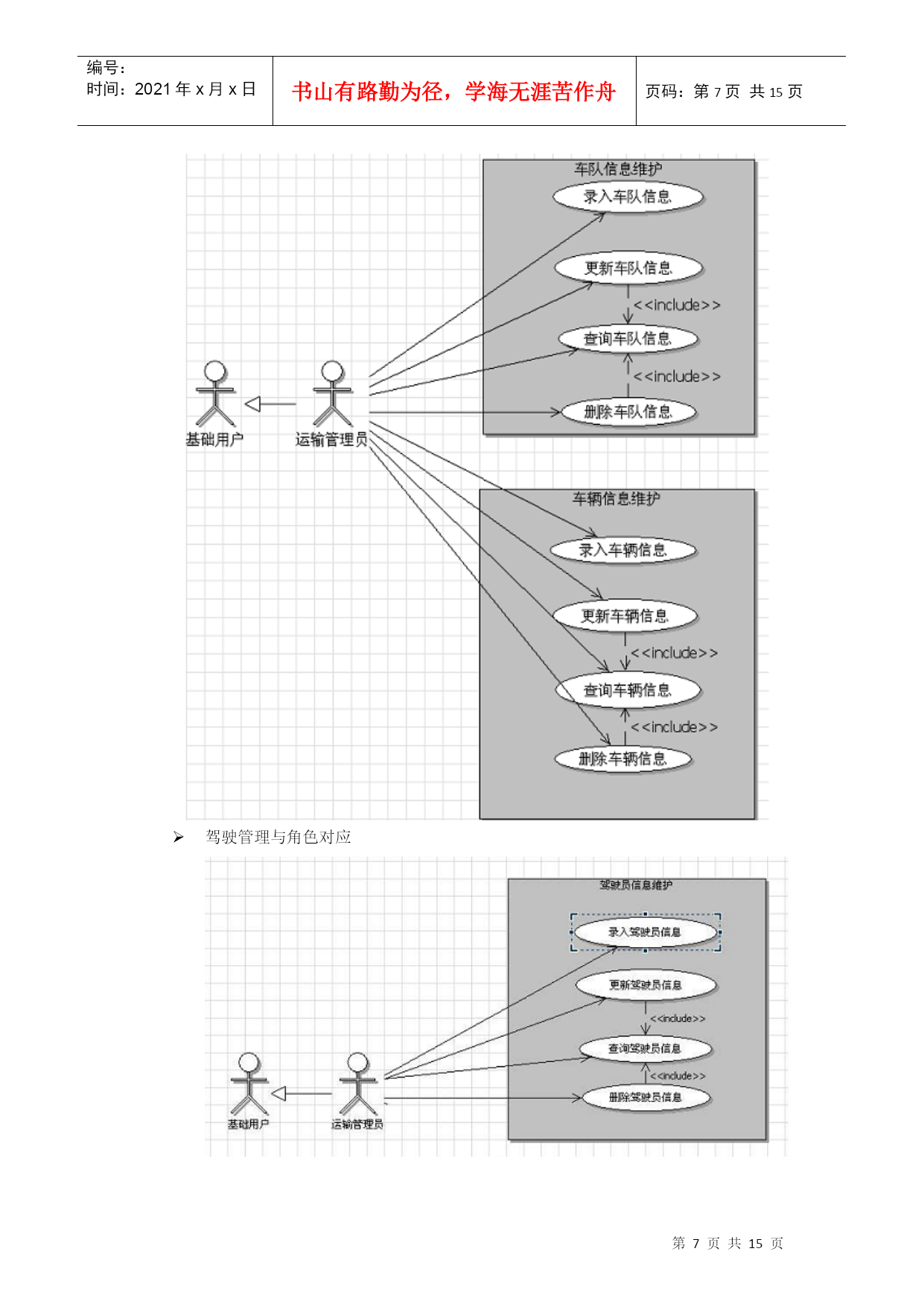 物流管理系统需求规格说明书修订历史记录日期版本说明作者2009-07-151.0万汉清TOC\o"1-3"\h\z\u编号:时间:2021年x月x日书山有路勤为径,学海无涯苦作舟页码:第PAGE15页共NUMPAGES15页第PAGE\*MERGEFORMAT15页共NUMPAGES\*MERGEFORMAT15页1引言1.1编写目的编写该文档目的在于明确系统范围,明确物流管理系统的业务流程,并规范化的记录该系统的功能需求和非功能性需求。本文档主要供以下人员阅读和使用:为软件开发团队,包括项目开发人员和测试人员项目开发参考用其它相关用户,了解系统的需求范围和实现目标,目的在于更好的使用系统1.2背景1.2.1背景说明物流管理系统主要为物流公司解决日常办公和项目管理的需求,协助工作人员进行日常物流管理和人员管理,提高管理效率,降低运作成本,增强企业长期竞争力。通过该系统,物流公司运输管理人员能实现对车队、车辆的动态管理;调度人员能随时了解车辆动向和使用情况;承运业务员能开出和接收承运单;财务人员也能通过该系统进行运输成本的核算。1.2.2系统名称定义与目标对象:本案例中系统名为“物流管理系统”,主要供物流公司内部使用。1.2.3系统面向的用户群体系统面向物流公司的工作人员,包括财务人员、运输管理人员、调度人员、承运业务员等。1.2.3.1用户的特征用户大都具备以下特征:有IE使用经验了解网络了解办公自动化1.2.3.2用户环境用户的计算机环境大致如下:WindowsXP简体中文版IE浏览器MSOffice办公软件Outlook或Foxmail邮件管理1.3术语定义序号名称说明1LMS物流管理系统1.4参考资料序号文档版本说明1《企业物流管理》2005-1-1本系统查阅了本书的相关资料2业务概述2.1业务场景和约束2.1.1概述物流管理系统主要为物流公司解决日常办公和项目管理的需求,协助工作人员进行日常物流管理和人员管理,提高管理效率,降低运作成本,增强企业长期竞争力。通过该系统,物流公司运输管理人员能实现对车队、车辆的动态管理;调度人员能随时了解车辆动向和使用情况;承运业务员能开出和接收承运单;财务人员也能通过该系统进行。简单示意图如下:2.1.2业务流程车辆管理模块:车辆管理模块分车队信息维护和车辆信息维护。在车队信息维护中,由运输管理员新增车队、更新车队、查询车队和删除车队。其中,查询车队分按车队编号查询、按车队名称查询、按车辆柜型查询、按车辆容积查询、按车辆状态查询。在车辆信息维护中,由运输管理员新增车辆、更新车辆、查询车辆和删除车辆。其中,查询车辆分按车牌号码查询、按车辆类型查询、按车辆载重查询、按车辆使用状态查询、按车辆所属车队查询、按车辆当前任务查询、按车辆计划任务查询;在新增车辆时,运输管理员填入车辆详细信息,并在车队列表中选择所属车队。驾驶员管理模块:本模块由运输管理员新增驾驶员,更新驾驶员,查询驾驶员及删除驾驶员。其中,查询驾驶员分按姓名查询、按政治面貌查询、按所属车队ID查询、按状态查询。运力查询模块:本模块分为运力综合查询和历史承运任务查询。运力综合查询分车队查询和车辆查询。其中,车队查询分按车队状态查询、按车队ID查询、按车队名字查询、按柜型查询;车辆查询按车辆状态查询、按车牌查询、按所属车队查询。历史承运任务分按客户名称查询、按取货时间查询、按车牌号码查询、按主驾驶员查询、按交货地点查询、按托运单查询、按预定车型查询。承运任务管理模块:本模块分为开出承运单、承运单管理、承运单接收。承运单管理中,分查询承运单,更新承运单,删除承运单及承运单派车,其中,承运单查询分按客户名称查询、按取货时间查询、按车牌号码查询、按主驾驶员查询、按交货地点查询、按托运单查询、按预定车型查询。承运单派车通过选择未派车承运单并选取车辆。承运单接收中,通过客户名称、取货时间、交货地点查询未接收承运单。车队运输成本维护模块:本模块分为查询承运单、插入成本、修改成本。由财务人员查询出承运单,并对相应承运单插入成本用户管理模块:本模块由注册用户、修改用户、删除用户组成。由拥有用户管理角色人员负责录入,查询,修改及删除用户。2.2系统角色分析综合客户的业务流程并进行用户分析后,可以把用户分成如下的几类角色。这样可以基于这些角色进行系统流程的权限控制,并且这种基于角色的权限管理使业务系统更加灵活可扩展。角色中文名称角色名称权限用户管理administrators用户管理员,可做用户相