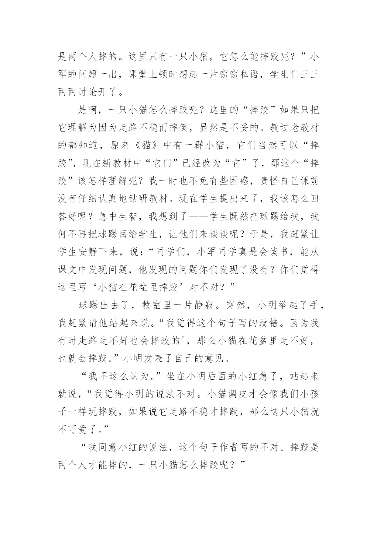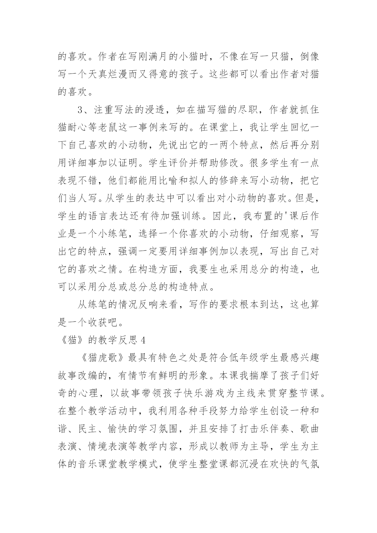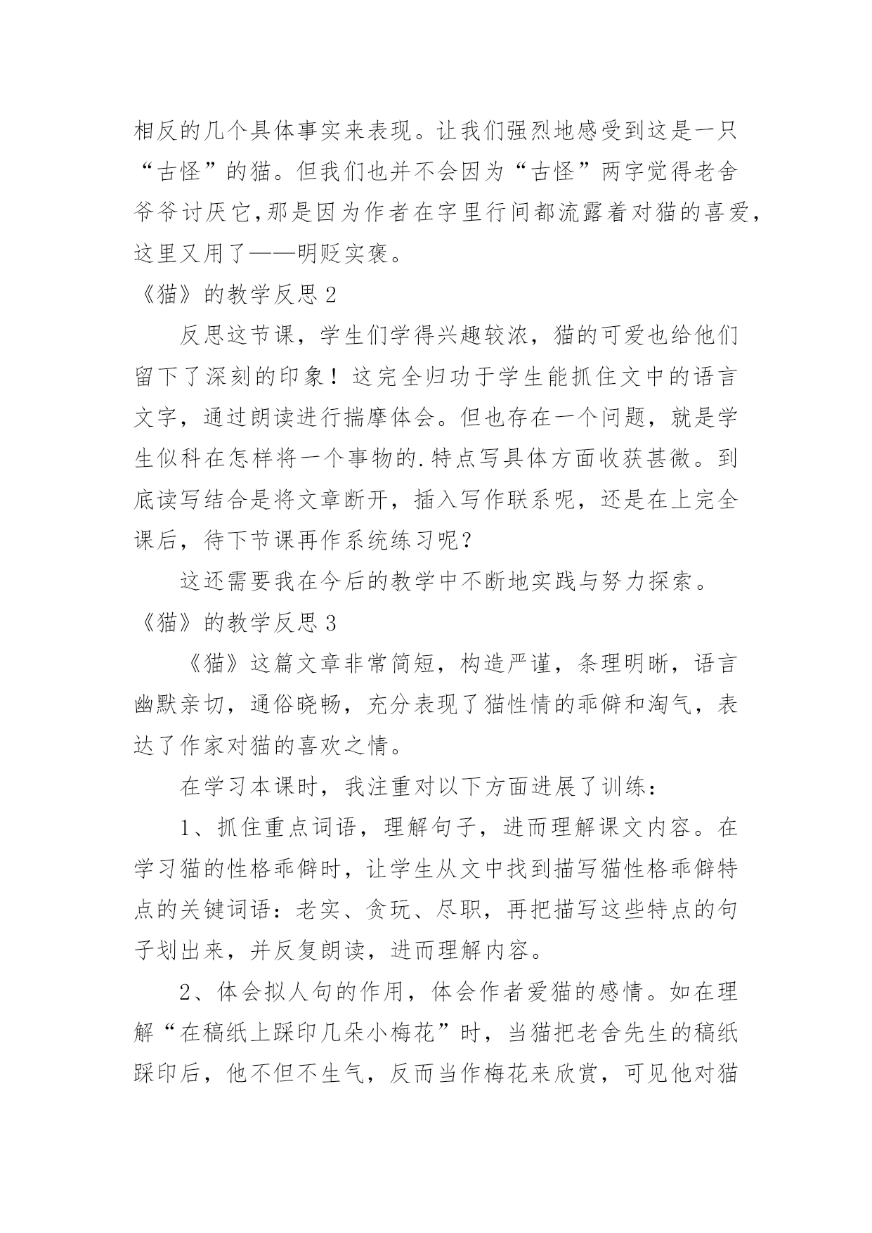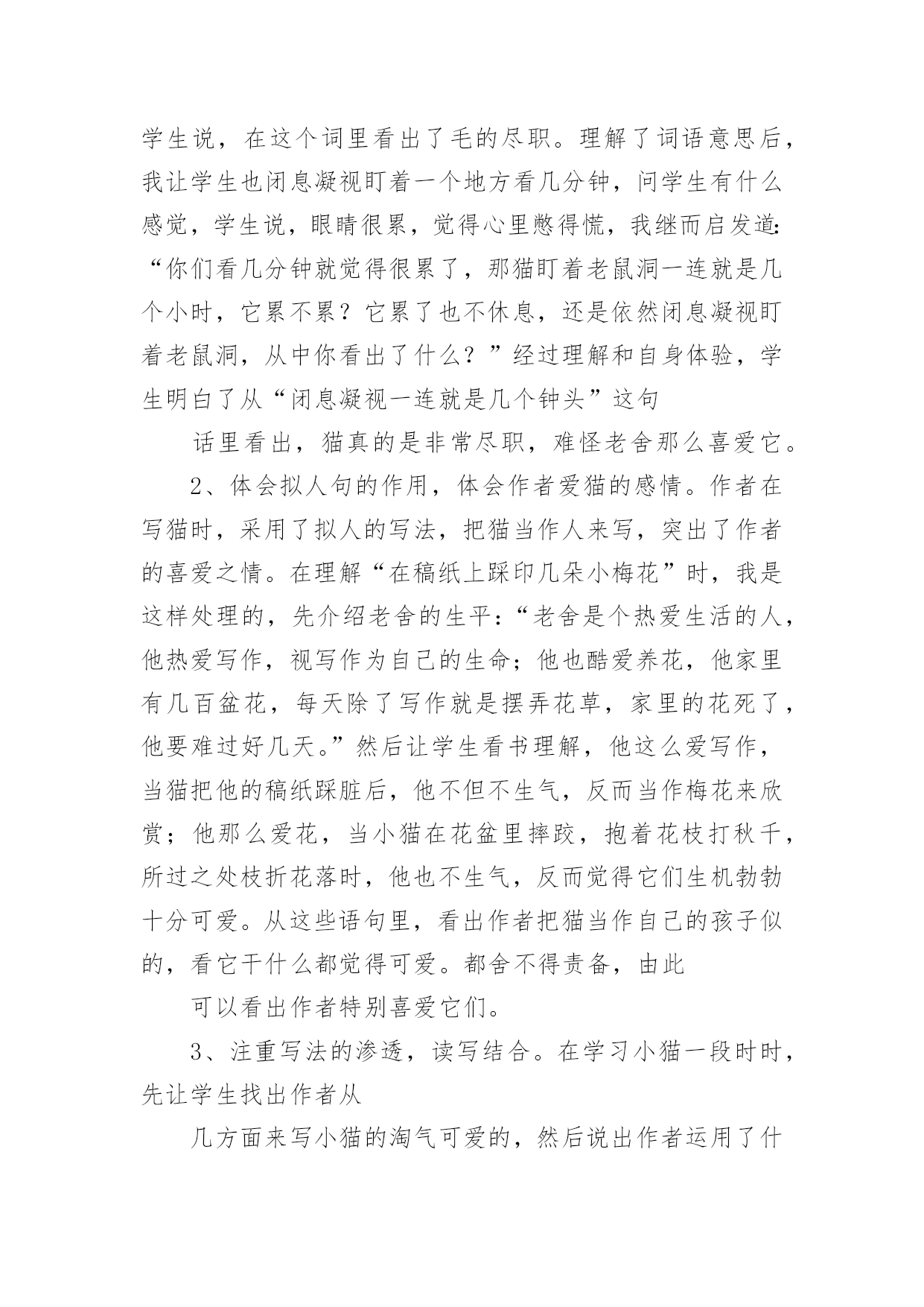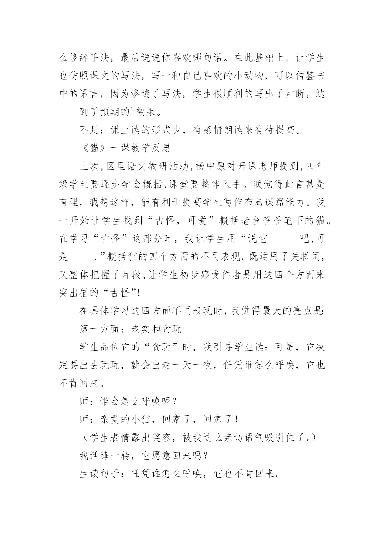 《猫》的教学反思《猫》的教学反思作为一名优秀的教师,我们要在课堂教学中快速成长,通过教学反思可以快速积累我们的教学经验,那么应当如何写教学反思呢?以下是小编为大家整理的《猫》的教学反思,欢迎大家借鉴与参考,希望对大家有所帮助。《猫》的教学反思1西拉科学校刘海香《猫》是老舍先生的一篇文章,文章简短,作者写了大猫的性格古怪和小猫的淘气可爱,字里行间流露出对猫的喜爱之情,表达了作者爱猫爱生活的情感,在教学中我注重对以下方面进行训练:1、抓词语理解句子进而理解课文内容。在学习大猫性格古怪一段时,我抓住了“闭息凝视”这个词,先让学生说说这个词是什么意思,有的学生说,是闭住呼吸,有的学生说是抑制呼吸,我让学生去查字典,知道“闭”是。。。。,“凝视”是专注的盯着一个地方看,让学生把这两个词连起来理解就是“有意识的抑制呼吸,眼睛专注的盯着一个地方看”,让学生明白,猫为了等老鼠的出现,怕自己的呼吸声吓跑了老鼠,所以有意识的抑住自己的呼吸,眼睛专注的看着老鼠洞,生怕老鼠跑了,让学生说,从这个词里你看出了什么?学生说,在这个词里看出了毛的尽职。理解了词语意思后,我让学生也闭息凝视盯着一个地方看几分钟,问学生有什么感觉,学生说,眼睛很累,觉得心里憋得慌,我继而启发道:“你们看几分钟就觉得很累了,那猫盯着老鼠洞一连就是几个小时,它累不累?它累了也不休息,还是依然闭息凝视盯着老鼠洞,从中你看出了什么?”经过理解和自身体验,学生明白了从“闭息凝视一连就是几个钟头”这句话里看出,猫真的是非常尽职,难怪老舍那么喜爱它。2、体会拟人句的作用,体会作者爱猫的感情。作者在写猫时,采用了拟人的写法,把猫当作人来写,突出了作者的喜爱之情。在理解“在稿纸上踩印几朵小梅花”时,我是这样处理的,先介绍老舍的生平:“老舍是个热爱生活的人,他热爱写作,视写作为自己的生命;他也酷爱养花,他家里有几百盆花,每天除了写作就是摆弄花草,家里的花死了,他要难过好几天。”然后让学生看书理解,他这么爱写作,当猫把他的稿纸踩脏后,他不但不生气,反而当作梅花来欣赏;他那么爱花,当小猫在花盆里摔跤,抱着花枝打秋千,所过之处枝折花落时,他也不生气,反而觉得它们生机勃勃十分可爱。从这些语句里,看出作者把猫当作自己的孩子似的,看它干什么都觉得可爱。都舍不得责备,由此可以看出作者特别喜爱它们。3、注重写法的渗透,读写结合。在学习小猫一段时时,先让学生找出作者从几方面来写小猫的淘气可爱的,然后说出作者运用了什么修辞手法,最后说说你喜欢哪句话。在此基础上,让学生也仿照课文的写法,写一种自己喜欢的小动物,可以借鉴书中的语言,因为渗透了写法,学生很顺利的写出了片断,达到了预期的`效果。不足:课上读的形式少,有感情朗读来有待提高。《猫》一课教学反思上次,区里语文教研活动,杨中原对开课老师提到,四年级学生要逐步学会概括,课堂要整体入手。我觉得此言甚是有理,我想这样,能有利于提高学生写作布局谋篇能力。我一开始让学生找到“古怪,可爱”概括老舍爷爷笔下的猫。在学习“古怪”这部分时,我让学生用“说它______吧,可是_____.”概括猫的四个方面的不同表现。既运用了关联词,又整体把握了片段,让学生初步感受作者是用这四个方面来突出猫的“古怪”!在具体学习这四方面不同表现时,我觉得最大的亮点是:第一方面:老实和贪玩学生品位它的“贪玩”时,我引导学生读:可是,它决定要出去玩玩,就会出走一天一夜,任凭谁怎么呼唤,它也不肯回来。师:谁会怎么呼唤呢?师:亲爱的小猫,回家了,回家了!(学生表情露出笑容,被我这么亲切语气吸引住了。)我话锋一转,它愿意回来吗?生读句子:任凭谁怎么呼唤,它也不肯回来。师:谁能威胁的语气呼唤一下猫!生:你还不回来,再不回来,不给你吃饭了。(学生注意力特别集中,从他们舒坦的表情中能感觉到孩子们正在享受读书快乐。)师:可它回来了吗?学生再读:任凭谁怎么呼唤,它也不肯回来。师:谁能着急的语气呼唤一下猫!生:猫,快回家,快回家天色晚了,会冻着的!师:可它回来了吗?学生再读:任凭谁怎么呼唤,它也不肯回来。(学生在读的时候,不知不觉突出了任凭……也……,在一次次语境创设中学生对文本理解一次次加深,对关联词语理解一步步到位。)老师进行了小结:这只猫可真是(贪玩)!(现在“贪玩”出来水到渠成,学生身同感受)我又话锋一转师:如此老实的猫,如此贪玩的猫,放在同一只猫身上,我们此时,只想用两个字来形容——古怪。(学生脸上荡起笑脸,告诉我,此时,他们真的觉得这只猫“古怪”,也和作者一样因“古怪”而觉得这只猫有趣,去喜爱它。)最近,语文课都不是提倡“工具性”落实,我时刻警惕着自己的疏忽。所以,我在最后,还是要从“工具”角度去提醒学生,老舍爷爷写“猫”紧紧抓特点“古怪”,用完全相反的几个具体事实来表现。让我们强烈地感受到这是一只“古怪”