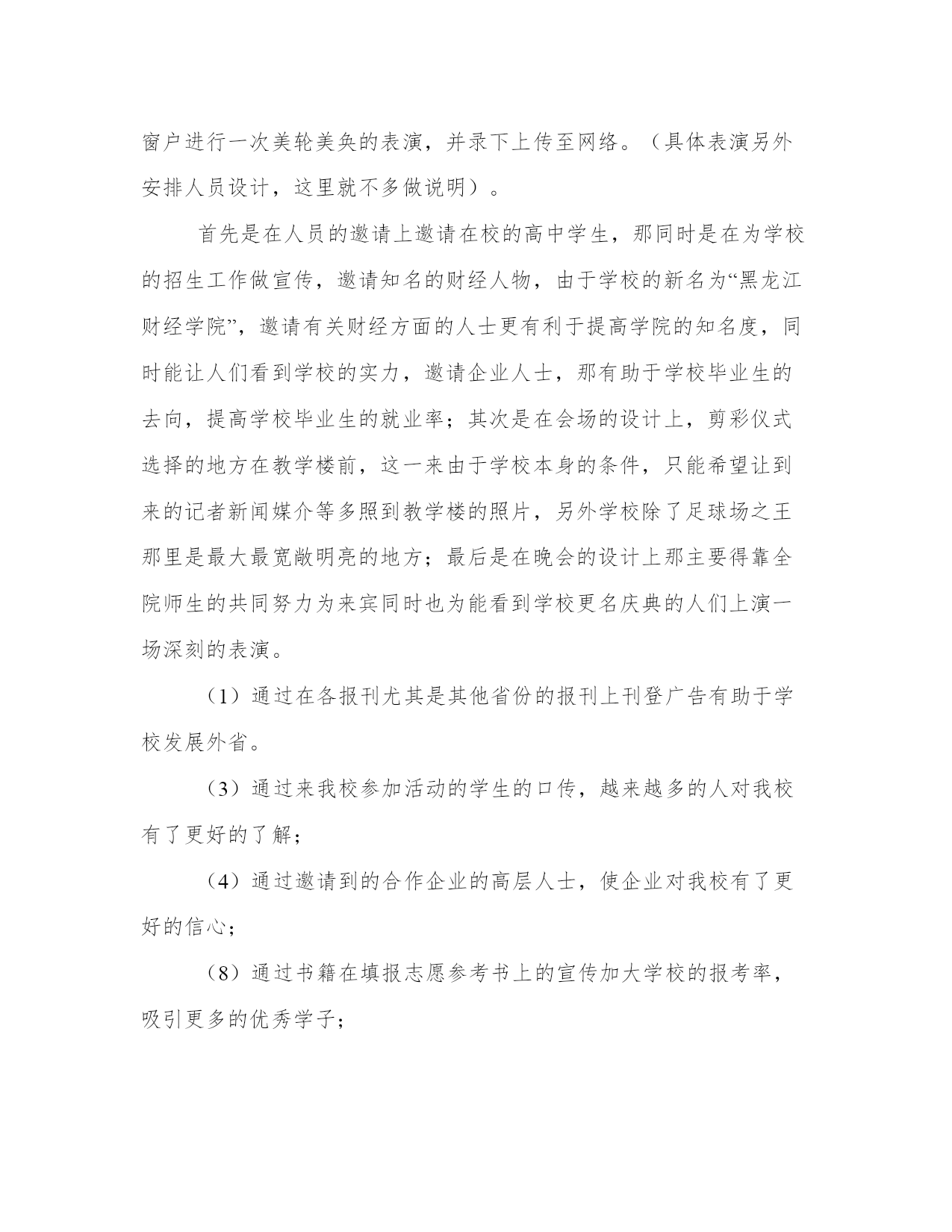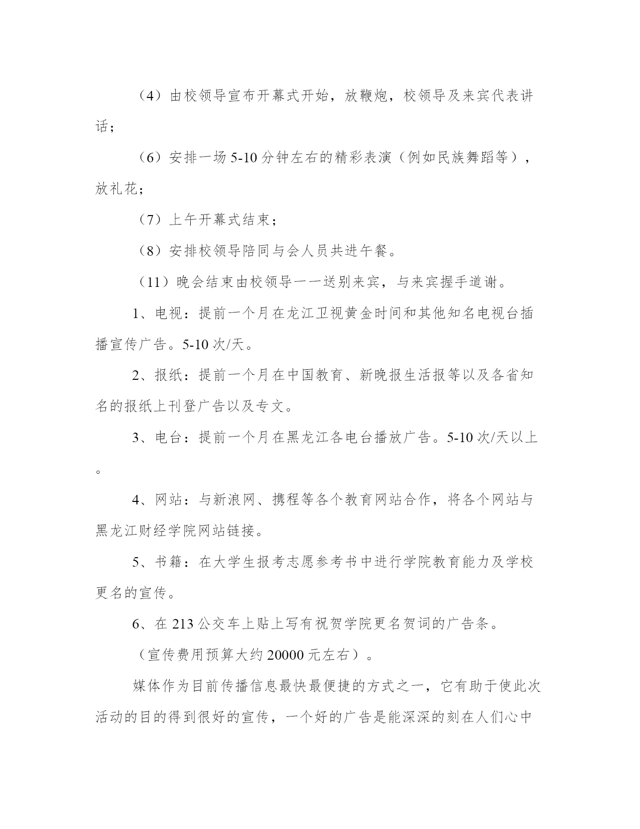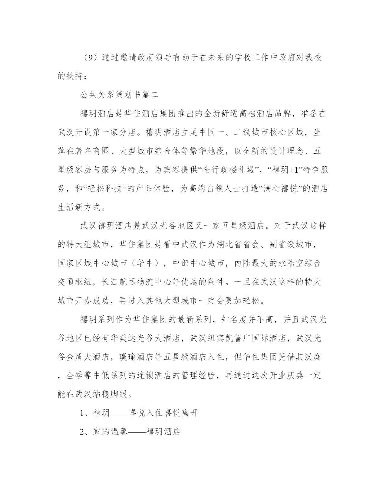 最新公共关系策划书(模板10篇)无论是身处学校还是步入社会,大家都尝试过写作吧,借助写作也可以提高我们的语言组织能力。范文怎么写才能发挥它最大的作用呢?以下是我为大家搜集的优质范文,仅供参考,一起来看看吧公共关系策划书篇一哈尔滨德强商务学院自1999年3月建校以来,经过学院的全体师生齐心协力,在其工作中取得优秀的成绩,20xx年2月,与黑龙江商学院(现哈尔滨商业大学)合作成立黑龙江省第一所公有民办试点高校--黑龙江商学院哈尔滨商务学院,是黑龙江商学院的二级学院。20xx年5月,原黑龙江商学院与黑龙江财政高等专科学校合并,成立了哈尔滨商业大学,经黑教发〔20xx〕289号文件批准,黑龙江商学院哈尔滨商务学院更名为哈尔滨商业大学商务学院。20xx年2月16日,经教育部教发函〔20xx〕17号文批准确认哈尔滨商业大学德强商学务院为普通高等学校举办的独立学院。20xx年9月27日,经教育部教发函〔20xx〕285号文件批准哈尔滨商业大学德强商务学院由独立学院转设为普通民办的本科高校哈尔滨德强商务学院。在国家教育厅及省教育厅领导评估工作中得到认可,本校被许可正式更名为黑龙江财经学院。而且黑龙江财经学院秉承优良的学风,雄厚的师资力量,先进的硬件设施,管理有素的领导团体和高素质的优秀本科学生,为更名黑龙江财经学院奠定了雄厚的基础。1、带动黑龙江财经学院以至东北地区的教育文化的发展,吸引更多优秀人才促进黑龙江财经的发展。2、塑造和传播学院的形象,打响学院的知名度、提高学院的竞争力和影响力,树立黑龙江财经学院的品牌。黑龙江财经学院作为教育机构,我们培养出众多优秀的人才,我们有着优良的师资队伍;我们党建成为典型,引领学生成长;我们基础设施完善,育人环境优美。作为一个仅有着十多年发展历程的高校,我校发展迅速,这也说明了我校整体的教育能力优秀,这离不开校领导的管理和众多师生的共同努力,从而吸引了一批批优秀的学子进入我校学习,也吸引了社会各界人士来我校参加合作。另外,通过学校严格的管理,对全体师生的严格要求,更让黑龙江财经学院有了一个很好的教育和学习的环境,整洁干净卫生的食堂,设备齐全的体育馆,拥有上百万册书籍的图书馆,安全卫生的学生公寓,宽大的排球、篮球、田径足球场等,让在这里学习的学生能够接受更好的教育。这次更名庆典活动将有利于学院在社会在人们的心中树立起知名的形象;树立起校园环境优美、校园师资力量强大、校园教育管理能力优秀等良好的形象;树立起值得学生、家长以及企业等社会各界信赖的形象。1、整体活动策划,分级工作负责,协调合作,务求实效。2、经济效益、环境效益、社会效益相结合。3、活动要具有新颖性、独特性、现实性。由黑龙江财经学院主导,学院的各部门及院系学生会和团总支分工合作,政府、媒体、在校学生以及社会各界力量共同参与。黑龙江财经学院为学子插上翅膀,为国家塑造栋梁。原名:哈尔滨德强商务学院现名:黑龙江财经学院。1、地址:哈尔滨市利民开发区学院路99号(黑龙江财经学院教学楼前的广场上)。2、时间:20xx年9月x日9:00---19:00。3、费用预算:x元(包括:开幕前接待茶水,牌匾、剪刀、彩带、地毯等,音响、礼炮车、礼炮、鞭炮等,另外还有安排领导、媒体以及相关公关活动人员的接送、招待以及午餐等)。4、邀请对象:政府领导、各报社记者、各新闻媒体、家长代表、各兄弟院校的相关领导、校友,以及其他教育机构人员,另外还可在哈尔滨各中学选出一些在校的高三学生邀请他们参加我们的活动。特别邀请对象:如合作或未合作的企业高管、商界知名人士或知名财经人物等。(特别嘉宾希望由校领导亲自出面利用一切可利用资源邀请)。5、活动流程:(1)由工作人员布置好活动场所;(2)安排礼仪小姐接待各位来宾,带领到临时休息场所稍作休息;(3)活动开始前5分钟内带领各位来宾出席开幕式现场;(4)由校领导宣布开幕式开始,放鞭炮,校领导及来宾代表讲话;(6)安排一场5-10分钟左右的精彩表演(例如民族舞蹈等),放礼花;(7)上午开幕式结束;(8)安排校领导陪同与会人员共进午餐。(11)晚会结束由校领导一一送别来宾,与来宾握手道谢。1、电视:提前一个月在龙江卫视黄金时间和其他知名电视台插播宣传广告。5-10次/天。2、报纸:提前一个月在中国教育、新晚报生活报等以及各省知名的报纸上刊登广告以及专文。3、电台:提前一个月在黑龙江各电台播放广告。5-10次/天以上。4、网站:与新浪网、携程等各个教育网站合作,将各个网站与黑龙江财经学院网站链接。5、书籍:在大学生报考志愿参考书中进行学院教育能力及学校更名的宣传。6、在213公交车上贴上写有祝贺学院更名贺词的广告条。(宣传费用预算大约20000元左右)。媒体作为目前传播信息最快
