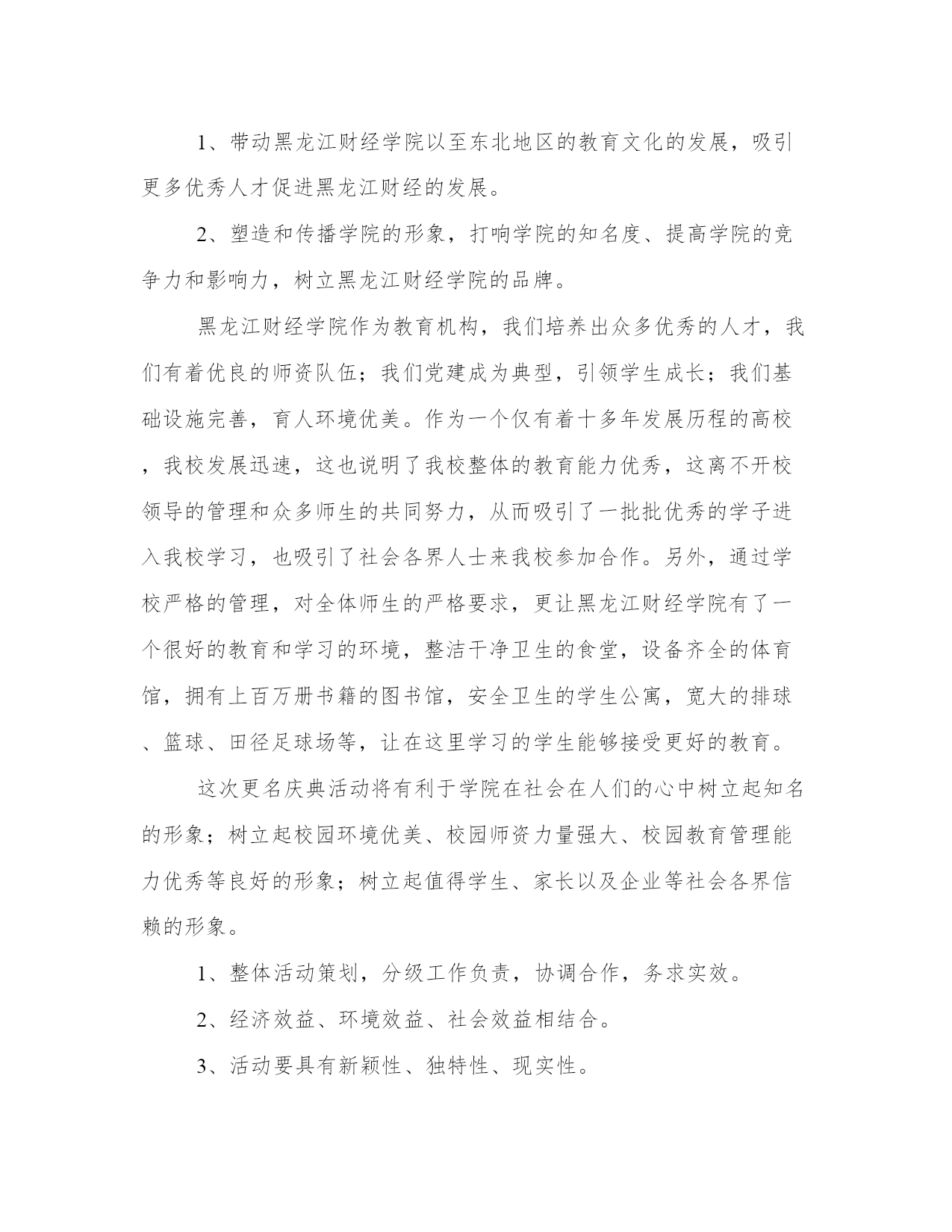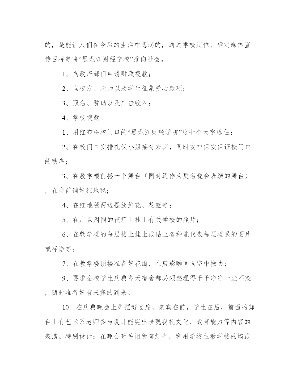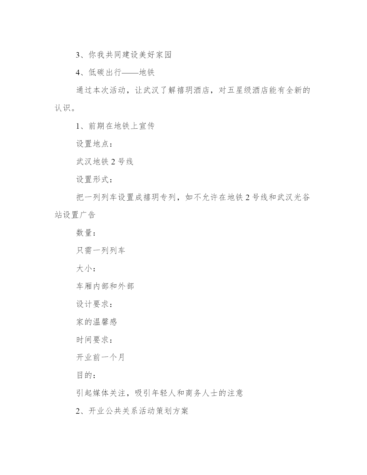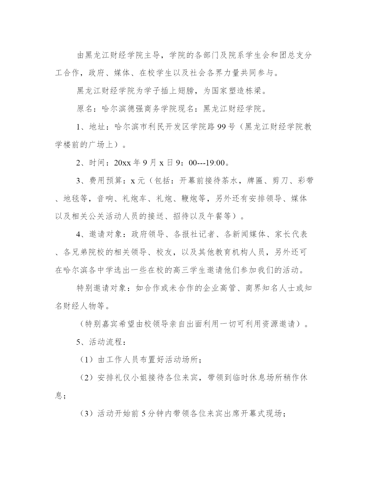 最新公共关系策划书(模板10篇)无论是身处学校还是步入社会,大家都尝试过写作吧,借助写作也可以提高我们的语言组织能力。范文怎么写才能发挥它最大的作用呢?以下是我为大家搜集的优质范文,仅供参考,一起来看看吧公共关系策划书篇一哈尔滨德强商务学院自1999年3月建校以来,经过学院的全体师生齐心协力,在其工作中取得优秀的成绩,20xx年2月,与黑龙江商学院(现哈尔滨商业大学)合作成立黑龙江省第一所公有民办试点高校--黑龙江商学院哈尔滨商务学院,是黑龙江商学院的二级学院。20xx年5月,原黑龙江商学院与黑龙江财政高等专科学校合并,成立了哈尔滨商业大学,经黑教发〔20xx〕289号文件批准,黑龙江商学院哈尔滨商务学院更名为哈尔滨商业大学商务学院。20xx年2月16日,经教育部教发函〔20xx〕17号文批准确认哈尔滨商业大学德强商学务院为普通高等学校举办的独立学院。20xx年9月27日,经教育部教发函〔20xx〕285号文件批准哈尔滨商业大学德强商务学院由独立学院转设为普通民办的本科高校哈尔滨德强商务学院。在国家教育厅及省教育厅领导评估工作中得到认可,本校被许可正式更名为黑龙江财经学院。而且黑龙江财经学院秉承优良的学风,雄厚的师资力量,先进的硬件设施,管理有素的领导团体和高素质的优秀本科学生,为更名黑龙江财经学院奠定了雄厚的基础。1、带动黑龙江财经学院以至东北地区的教育文化的发展,吸引更多优秀人才促进黑龙江财经的发展。2、塑造和传播学院的形象,打响学院的知名度、提高学院的竞争力和影响力,树立黑龙江财经学院的品牌。黑龙江财经学院作为教育机构,我们培养出众多优秀的人才,我们有着优良的师资队伍;我们党建成为典型,引领学生成长;我们基础设施完善,育人环境优美。作为一个仅有着十多年发展历程的高校,我校发展迅速,这也说明了我校整体的教育能力优秀,这离不开校领导的管理和众多师生的共同努力,从而吸引了一批批优秀的学子进入我校学习,也吸引了社会各界人士来我校参加合作。另外,通过学校严格的管理,对全体师生的严格要求,更让黑龙江财经学院有了一个很好的教育和学习的环境,整洁干净卫生的食堂,设备齐全的体育馆,拥有上百万册书籍的图书馆,安全卫生的学生公寓,宽大的排球、篮球、田径足球场等,让在这里学习的学生能够接受更好的教育。这次更名庆典活动将有利于学院在社会在人们的心中树立起知名的形象;树立起校园环境优美、校园师资力量强大、校园教育管理能力优秀等良好的形象;树立起值得学生、家长以及企业等社会各界信赖的形象。1、整体活动策划,分级工作负责,协调合作,务求实效。2、经济效益、环境效益、社会效益相结合。3、活动要具有新颖性、独特性、现实性。由黑龙江财经学院主导,学院的各部门及院系学生会和团总支分工合作,政府、媒体、在校学生以及社会各界力量共同参与。黑龙江财经学院为学子插上翅膀,为国家塑造栋梁。原名:哈尔滨德强商务学院现名:黑龙江财经学院。1、地址:哈尔滨市利民开发区学院路99号(黑龙江财经学院教学楼前的广场上)。2、时间:20xx年9月x日9:00---19:00。3、费用预算:x元(包括:开幕前接待茶水,牌匾、剪刀、彩带、地毯等,音响、礼炮车、礼炮、鞭炮等,另外还有安排领导、媒体以及相关公关活动人员的接送、招待以及午餐等)。4、邀请对象:政府领导、各报社记者、各新闻媒体、家长代表、各兄弟院校的相关领导、校友,以及其他教育机构人员,另外还可在哈尔滨各中学选出一些在校的高三学生邀请他们参加我们的活动。特别邀请对象:如合作或未合作的企业高管、商界知名人士或知名财经人物等。(特别嘉宾希望由校领导亲自出面利用一切可利用资源邀请)。5、活动流程:(1)由工作人员布置好活动场所;(2)安排礼仪小姐接待各位来宾,带领到临时休息场所稍作休息;(3)活动开始前5分钟内带领各位来宾出席开幕式现场;(4)由校领导宣布开幕式开始,放鞭炮,校领导及来宾代表讲话;(6)安排一场5-10分钟左右的精彩表演(例如民族舞蹈等),放礼花;(7)上午开幕式结束;(8)安排校领导陪同与会人员共进午餐。(11)晚会结束由校领导一一送别来宾,与来宾握手道谢。1、电视:提前一个月在龙江卫视黄金时间和其他知名电视台插播宣传广告。5-10次/天。2、报纸:提前一个月在中国教育、新晚报生活报等以及各省知名的报纸上刊登广告以及专文。3、电台:提前一个月在黑龙江各电台播放广告。5-10次/天以上。4、网站:与新浪网、携程等各个教育网站合作,将各个网站与黑龙江财经学院网站链接。5、书籍:在大学生报考志愿参考书中进行学院教育能力及学校更名的宣传。6、在213公交车上贴上写有祝贺学院更名贺词的广告条。(宣传费用预算大约20000元左右)。媒体作为目前传播信息最快
