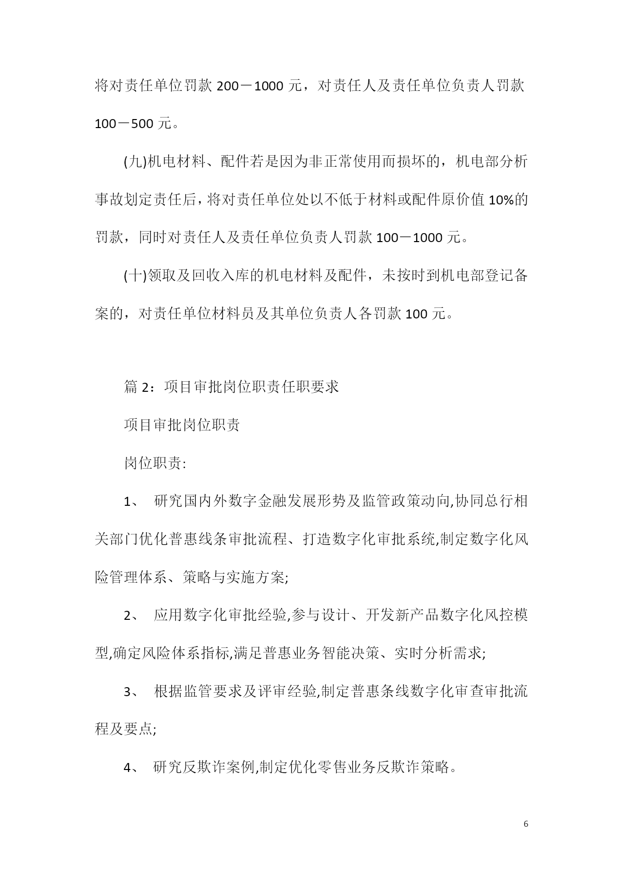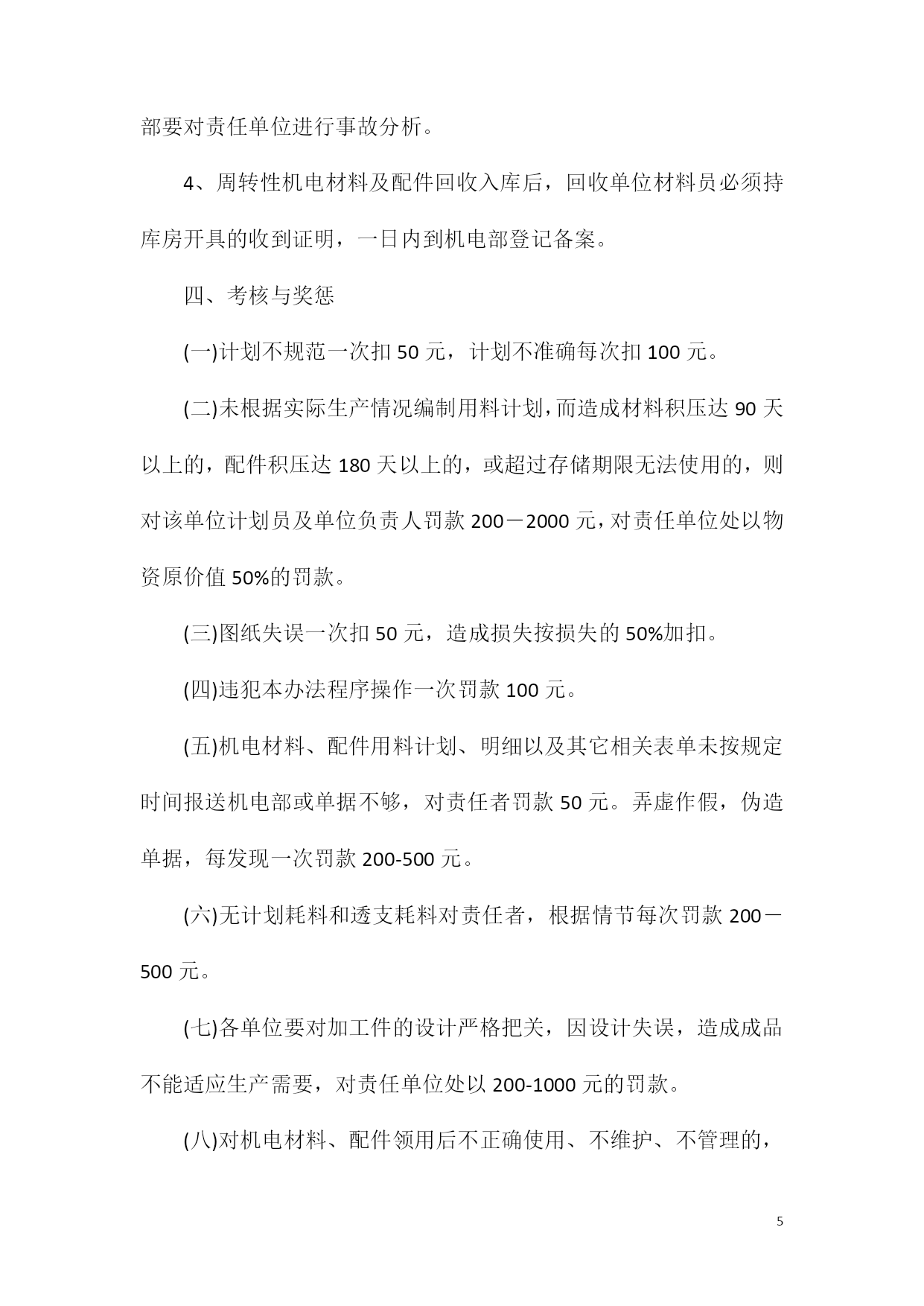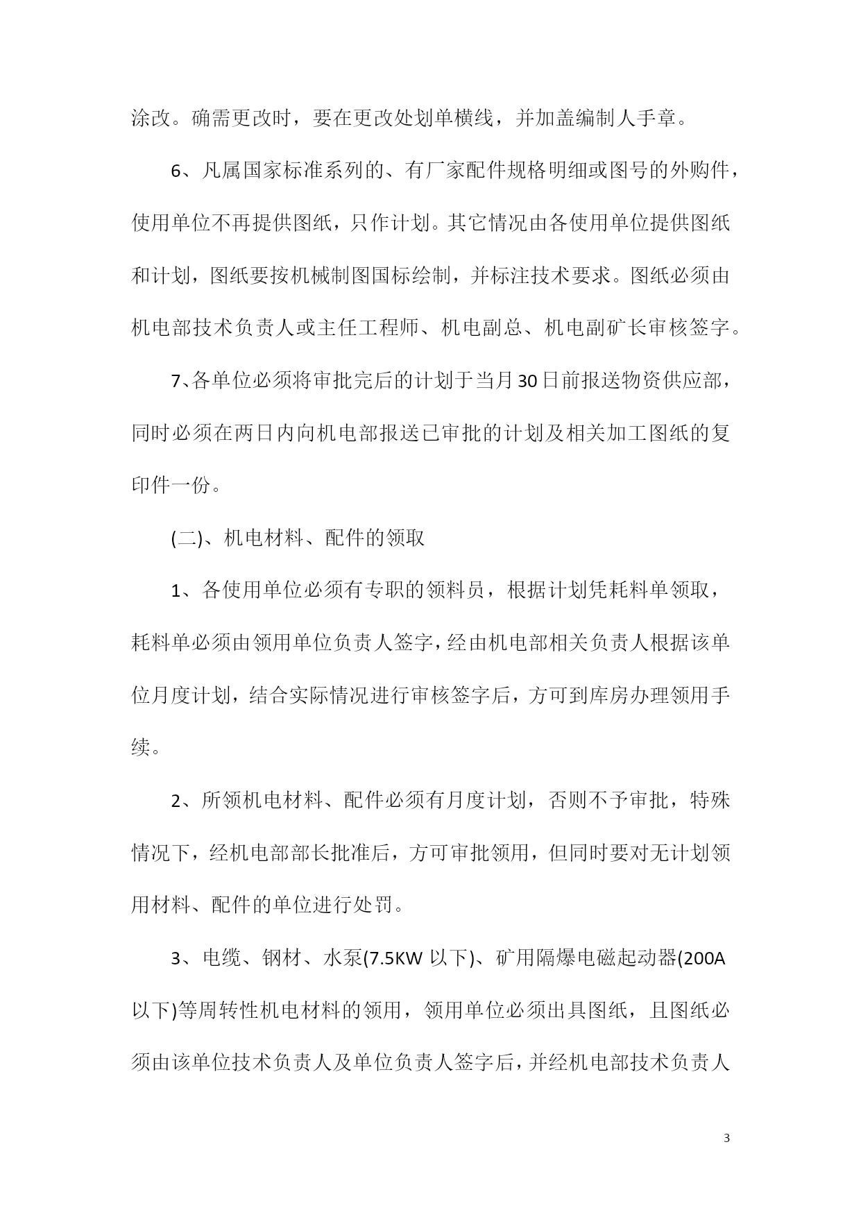 PAGEPAGE13机电材料、配件审批管理制度机电材料、配件审批管理制度之相关制度和职责,为了适应我矿目前的管理体制,使机电材料、配件管理制度化、程序化、高效化,特制定本制度:一、总则机电材料、配件管理是我矿机电管理的一项重要内容,它是从计划、采购、验收、保管、发放至使用报废等...为了适应我矿目前的管理体制,使机电材料、配件管理制度化、程序化、高效化,特制定本制度:一、总则机电材料、配件管理是我矿机电管理的一项重要内容,它是从计划、采购、验收、保管、发放至使用报废等一系列活动的全过程的受控管理,目的是能够满足机电设备在生产过程中的及时维护和检修工作的正常进行。二、职责(一)机电管理部是全矿机电材料、配件管理的牵头单位,负责机电材料和配件的选型、计划的审批、到货的督促与考核、质量问题的裁定和分析事故、修复的鉴定,并对使用情况进行监督考核等工作。(二)各使用单位负责编制月计划,办理耗料单,领取和回收机电材料、配件以及质量问题的信息反馈。(三)物资供应部负责按计划汇总、采购、入库保管、发放、到货验收、质量索赔。(四)计财部对全矿机电配件、材料资金的结算进行管理。三、管理程序(一)机电材料、配件月度计划编制1、各单位的计划必须有专职的计划员编制汇总,于每月27日12:00前报机电管理部审批,若遇周六、周日则周五必须上报;特殊情况下,各单位当月需追加材料、配件计划时,必须于当月15日12:00前报送机电管理部审批。2、机电材料、配件计划要符合生产实际要求,内容要全,必须明确物资的品名、规格型号、单位、单价(计划价)、数量、金额等,配件计划还需明确主机型号、生产厂家及图号等,有编码的必须准确填写对应的编码,如有特殊要求的还需注明生产厂家、质量要求、技术数据或附图纸、样品及到货时间等。3、月度计划要经使用单位分管机电的负责人及单位负责人签字认可并盖单位公章。4、电缆、五小、专用工具、胶带、皮带保护由机电管理部统筹管理。上述五类物资实行报废补充制。5、用料计划和实耗名细要字迹工整、内容齐全,严禁出现勾画涂改。确需更改时,要在更改处划单横线,并加盖编制人手章。6、凡属国家标准系列的、有厂家配件规格明细或图号的外购件,使用单位不再提供图纸,只作计划。其它情况由各使用单位提供图纸和计划,图纸要按机械制图国标绘制,并标注技术要求。图纸必须由机电部技术负责人或主任工程师、机电副总、机电副矿长审核签字。7、各单位必须将审批完后的计划于当月30日前报送物资供应部,同时必须在两日内向机电部报送已审批的计划及相关加工图纸的复印件一份。(二)、机电材料、配件的领取1、各使用单位必须有专职的领料员,根据计划凭耗料单领取,耗料单必须由领用单位负责人签字,经由机电部相关负责人根据该单位月度计划,结合实际情况进行审核签字后,方可到库房办理领用手续。2、所领机电材料、配件必须有月度计划,否则不予审批,特殊情况下,经机电部部长批准后,方可审批领用,但同时要对无计划领用材料、配件的单位进行处罚。3、电缆、钢材、水泵(7.5KW以下)、矿用隔爆电磁起动器(200A以下)等周转性机电材料的领用,领用单位必须出具图纸,且图纸必须由该单位技术负责人及单位负责人签字后,并经机电部技术负责人或主任工程师、机电副总签字后,方可按图领用。4、各单位领用的机电材料及配件,必须在机电部登记备案。5、机电部将不定期对所领机电材料、配件的使用情况进行检查,对机电材料、配件领用后不正确使用、不维护、不管理的,将对责任单位进行处罚。6、各单位材料、配件耗料单的审批时间为,每周一、三、五上午12:00以前,其它时间原则上不审批。若遇周末批料人员不在矿,由机电部当日值班领导审批。7、机电材料具体包括:电缆、胶带、轴承、截齿、五小电器、风水管路、监测监控、立井提升钢丝绳、高压胶管、油脂、设备专用工具等。(四)其它1、使用单位如果发现质量问题要及时填写质量跟踪信息反馈卡,交机电管理部分析事故,不得隐瞒不报。经矿有关部门参加分析鉴定,做出退货、索赔等处理。否则,因质量造成的费用超耗,由使用单位承担,并根据情节给予罚款。2、机电材料、配件如有变更或改进,图纸要经机电管理部技术负责人认可。3、周转性机电材料及所有配件若因非正常使用而损坏的,机电部要对责任单位进行事故分析。4、周转性机电材料及配件回收入库后,回收单位材料员必须持库房开具的收到证明,一日内到机电部登记备案。四、考核与奖惩(一)计划不规范一次扣50元,计划不准确每次扣100元。(二)未根据实际生产情况编制用料计划,而造成材料积压达90天以上的,配件积压达180天以上的,或超过存储期限无法使用的,则对该单位计划员及单位负责人罚款200―2000元,对责任单位处以