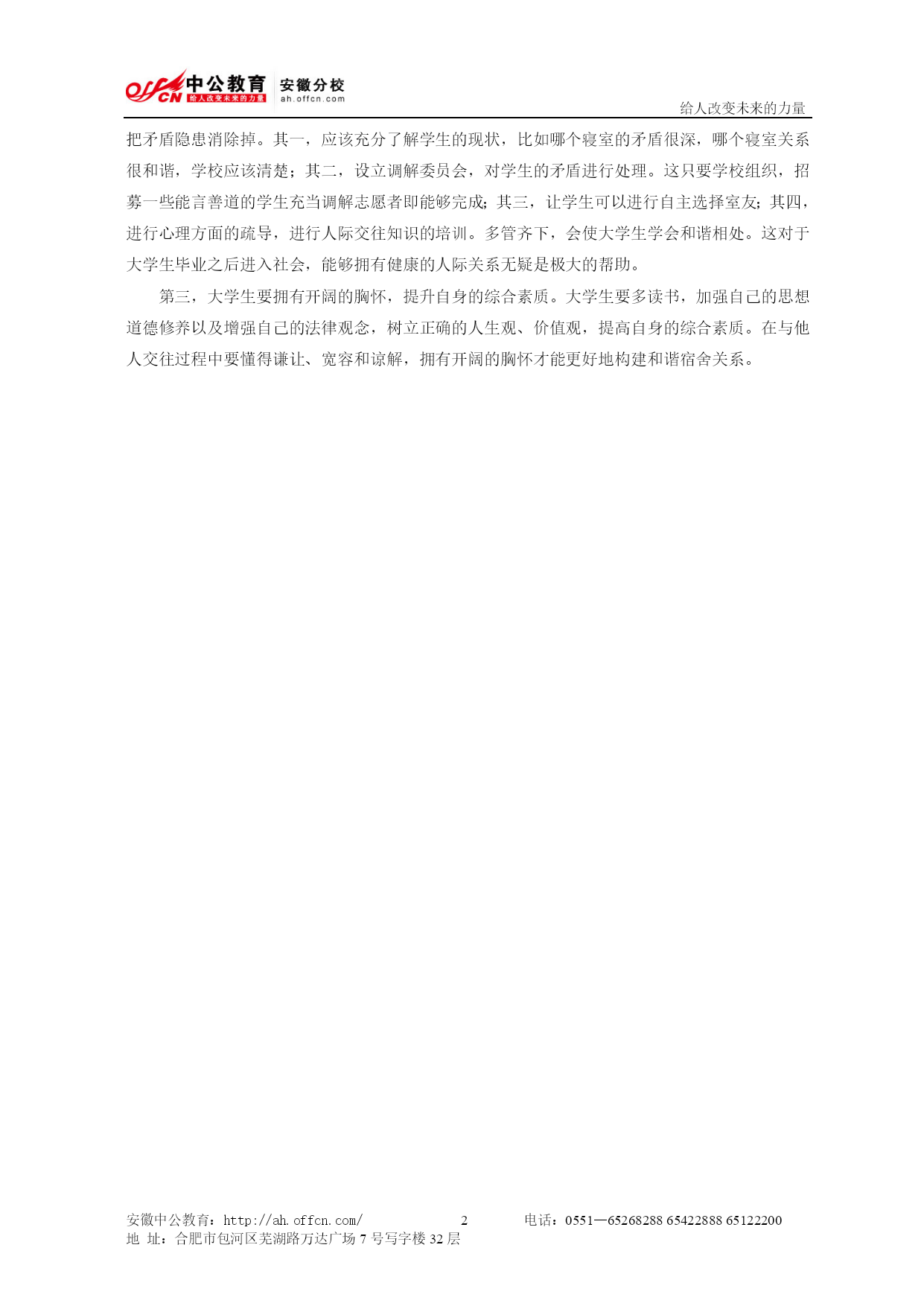 给人改变未来的力量安徽中公教育:http://ah.offcn.com/电话:0551—652682886542288865122200地址:合肥市包河区芜湖路万达广场7号写字楼32层2013年安徽公务员面试:可怕的室友----来源安徽中公教育(HYPERLINK"http://ah.offcn.com/"http://ah.offcn.com/)安徽公务员QQ交流群:122308818【背景链接】近期数所高校相继发生宿舍命案,大学生宿舍关系再度引发关注。一项针对广州大学的1500份学生抽样调查显示,超过一半的学生对宿舍内部人际关系不满意,高校宿舍已成为大学生矛盾集中爆发地。【标准表述】[综合分析]在当今大学校园里,住宿条件越来越好,室友之间的相互沟通却越来越少,而是把更多的时间给了虚拟世界,“每人一张书桌,一台电脑,一部手机,一张床,大家坐在各自桌前,或对着电脑,或打电话、或玩游戏、或发微博,却无暇回过头和室友说一句话”。中公教育版权其一,学生的个人原因。一方面,不同的学生来自不同地域、不同家庭背景,并在生活习惯、作息方式、兴趣爱好、学习成绩等方面存在诸多差异。同住一室,很容易因为一些琐事引发宿舍矛盾。并且现在的大学生多是独生子女,往往以自我为中心,更注重私人空间和权利,而当宿舍的每个学生都在争取自我空间和权利时,互不妥协的结果只能是矛盾重重。另一方面,当代大学生对信息时代的信息崇拜,缩短了人与人之间的情感交流,生活节奏越来越快,感情却越来越浅,焦虑烦恼越来越多,内心自由越来越少,从一定程度上加剧了宿舍的紧张关系。其二,社会风气影响校园。大学已经是准社会,不仅要面对评优、保研、就业等方面的竞争,而且一些贿选、告密、跑关系等社会不正之风也浸染了校园,让很多大学生的是非观、价值观发生了扭曲,造成了人与人之间距离的疏远和感情的淡漠。其结果是“说真话的朋友越来越少、不服气的对手越来越多”,这也是“陌生人宿舍”的重要成因。[措施]对此,中公教育专家建议:第一,父母和老师要重视对学生情商的培养。现在,家长和老师对于孩子们的智商开启、知识的灌输很有一套办法,却往往忽略了对孩子们的情商培养、健康人格的养成,尤其是待人接物等方面的教育,素来欠缺。孩子参加考试,能轻易得高分;但应对人生考卷时,往往不及格——如生活难自立,不懂得与人相处,经不起人生挫折等等。而这些,都需要从入学前的家庭教育开始做起。第二,学校应该积极介入,消除宿舍内的矛盾隐患。只要学校积极介入,可以在很大程度上把矛盾隐患消除掉。其一,应该充分了解学生的现状,比如哪个寝室的矛盾很深,哪个寝室关系很和谐,学校应该清楚;其二,设立调解委员会,对学生的矛盾进行处理。这只要学校组织,招募一些能言善道的学生充当调解志愿者即能够完成;其三,让学生可以进行自主选择室友;其四,进行心理方面的疏导,进行人际交往知识的培训。多管齐下,会使大学生学会和谐相处。这对于大学生毕业之后进入社会,能够拥有健康的人际关系无疑是极大的帮助。第三,大学生要拥有开阔的胸怀,提升自身的综合素质。大学生要多读书,加强自己的思想道德修养以及增强自己的法律观念,树立正确的人生观、价值观,提高自身的综合素质。在与他人交往过程中要懂得谦让、宽容和谅解,拥有开阔的胸怀才能更好地构建和谐宿舍关系。