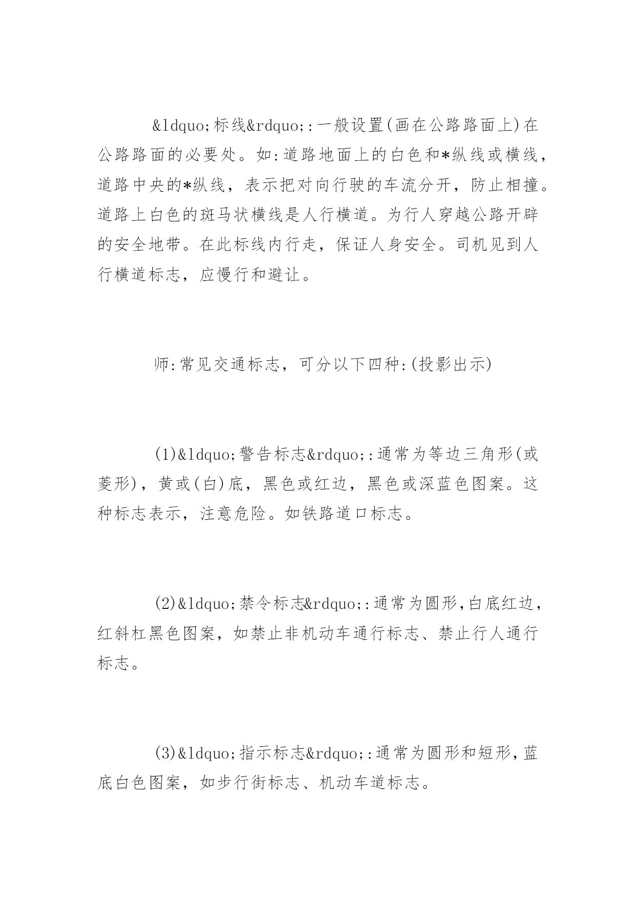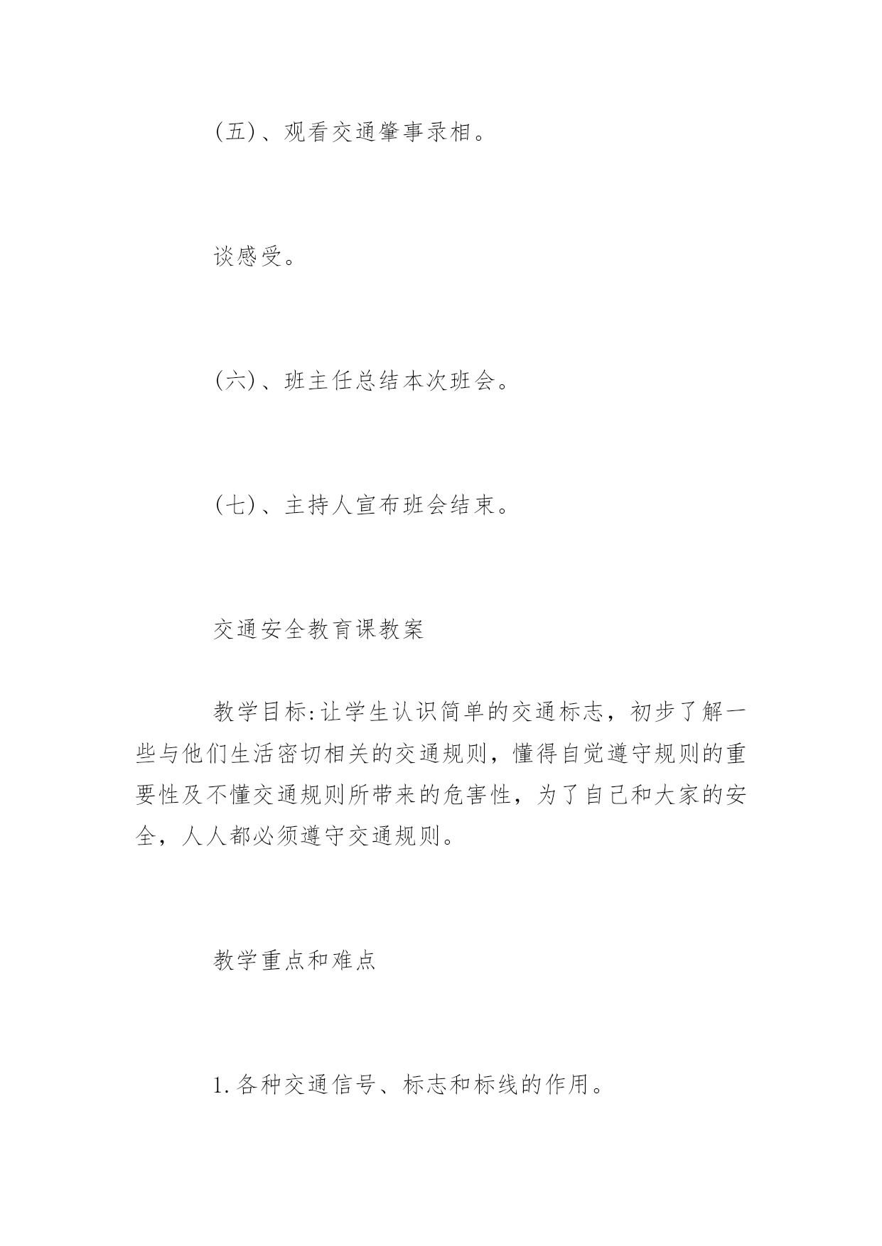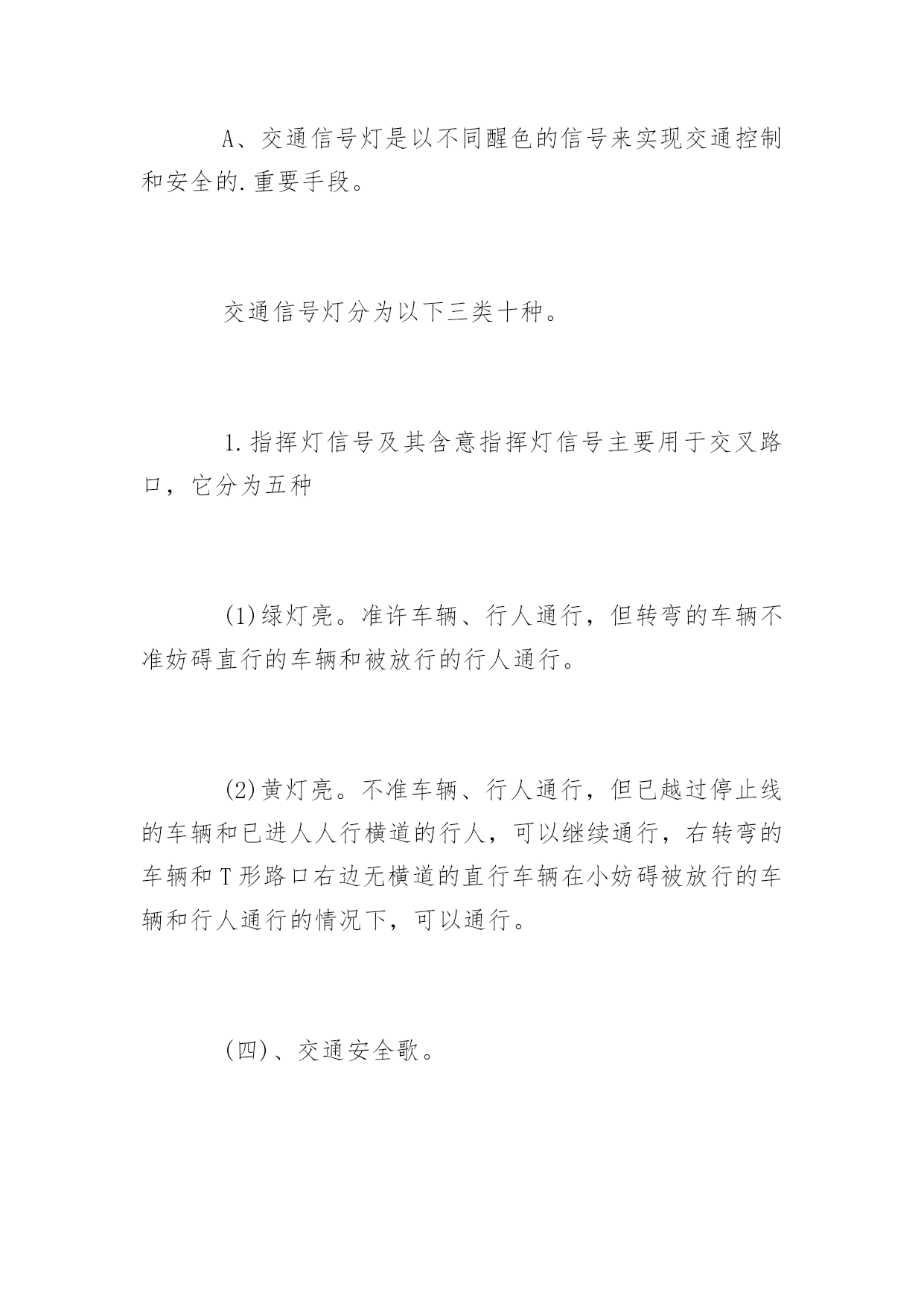 中学交通安全教育教案中学交通安全教育教案交通安全教育是解决交通事故的根本途径。只有有了很好的交通安全知识和自我防卫意识,才能确保交通的安全。以下是小编整理的关于交通安全教育教案的课件,欢迎参考!“交通安全教育”主题班会教案一、班会目的1、通过班会使学生了解生命的可贵,掌握有关的交通安全知识,认清学习目的,增强学生安全意识。2、以“增强交通安全意识,提高自我保护能力”为指导方针,切实加强安全教育与管理,确保学生安全。3、引导学生在活动中认识生命的意义,在自我体验中发挥潜能,丰富自我生命,提升生命意义。进而教育学生关爱生命、尊重生命、敬畏生命、激扬生命、热爱生命、保护生命。4为加强对学生法制与交通安全的教育与管理,使学生增加法制观念,做到这法、知法、守未能确保身心健康,平安完成学业,制定本制度:5通过学习有关安全知识,使学生树立自护、自救观念,形成自护、自救的意识,使学生安全、健康成长。二、班会过程(一)、谈话引入:同学们,我们生活在幸福、温暖的家庭里,受到父母和家人的关心、爱护,似乎并不存在什么危险。但是,家庭生活中仍然有许多事情需要备加注意和小心对待,否则很容易发生危险,酿成事故。在生活中我们应时时刻刻注意安全,如饮食安全、旅游安全、交友安全、用电安全、交通安全等,今天我们就来谈谈交通安全。首先请大家欣赏一段小品《肇祸》)(二)、班会内容:1、小品表演:(主要讲述一个肇事司机逃逸的事件)2、找出小品中的错误。比如打电话报警110,不是119;又比如打电话报警的人应该首先告诉警察出事的具体地点,而不是简单地说:“你们快来,这儿有人被撞了!”3、学生有感而发,谈看小品后的感想。(三)、《行人交通安全规范》知识问答。感谢以上同学的精彩表演,下面我们进入第二个环节--《行人交通安全规范》知识问答。我们实行抢答方式,每答对1题得1分,答错不扣分。《A》、行人过马路的方法:行人过马路有几种方法?(走人行横道,走地下通道,走天桥。)交通标志种类有哪些?有何含义?交通信号有灯光指挥信号,交通指挥棒信号和手势指挥信号三种。A、交通信号灯是以不同醒色的信号来实现交通控制和安全的.重要手段。交通信号灯分为以下三类十种。1.指挥灯信号及其含意指挥灯信号主要用于交叉路口,它分为五种(1)绿灯亮。准许车辆、行人通行,但转弯的车辆不准妨碍直行的车辆和被放行的行人通行。(2)黄灯亮。不准车辆、行人通行,但已越过停止线的车辆和已进人人行横道的行人,可以继续通行,右转弯的车辆和T形路口右边无横道的直行车辆在小妨碍被放行的车辆和行人通行的情况下,可以通行。(四)、交通安全歌。(五)、观看交通肇事录相。谈感受。(六)、班主任总结本次班会。(七)、主持人宣布班会结束。交通安全教育课教案教学目标:让学生认识简单的交通标志,初步了解一些与他们生活密切相关的交通规则,懂得自觉遵守规则的重要性及不懂交通规则所带来的危害性,为了自己和大家的安全,人人都必须遵守交通规则。教学重点和难点1.各种交通信号、标志和标线的作用。2.有关的交通法规。教学过程一、新课导入随着交通运输事业的发展,道路上的车辆越来越多,交通安全问题越来越受到人们的重视。怎样注意交通安全呢?今天我们就来学习。二、认识交通标志1、提问:你知道各种交通信号和交通标志、标线吗?它们有什么作用?2、出示交通标志图片学生分小组讨论。讨论内容:说一说这些交通信号、标志和标线各自的作用。“红绿灯”:是指设在交通道口的交通管制信号。车辆和行人的通行和停止,都由红绿灯的变换来指挥,带有强制性的约束效力。无论车辆和行人都要绝对遵守。我们常说:红灯停、绿灯行,就指出了它的作用。“禁止鸣笛标志”:一般设在医院附近,表示这里需要安静,提醒司机在有这个标志的地方,禁止鸣笛。“道路转弯标志”:一般设在道路的急转弯处,提醒司机,见到这一标志,车辆慢行,前面有弯道。“指路标志”:一般设在道路旁,表示该地的地名。也有的.表示道路前方所到达的地点名称和距离。“标线”:一般设置(画在公路路面上)在公路路面的必要处。如:道路地面上的白色和*纵线或横线,道路中央的*纵线,表示把对向行驶的车流分开,防止相撞。道路上白色的斑马状横线是人行横道。为行人穿越公路开辟的安全地带。在此标线内行走,保证人身安全。司机见到人行横道标志,应慢行和避让。师:常见交通标志,可分以下四种:(投影出示)(1)“警告标志”:通常为等边三角形(或菱形),黄或(白)底,