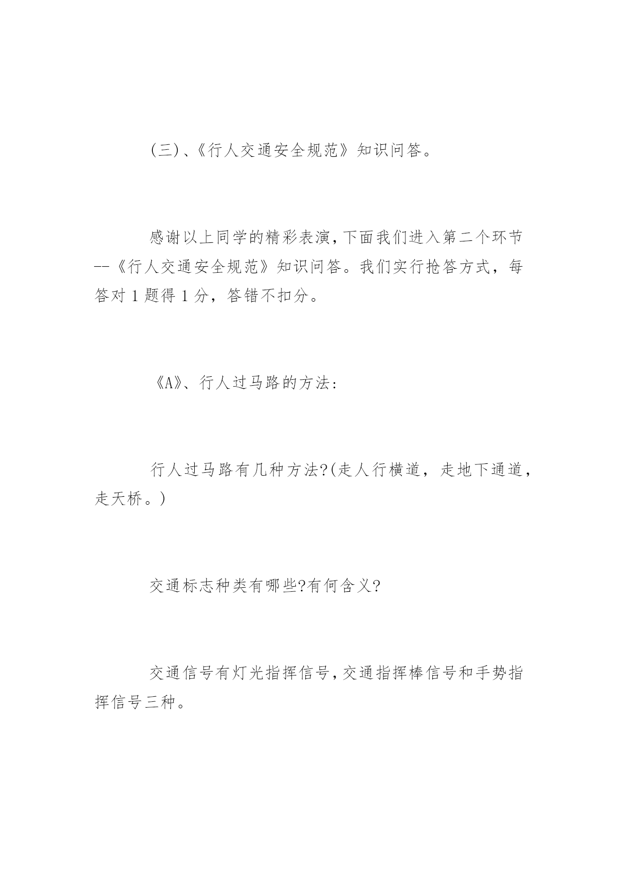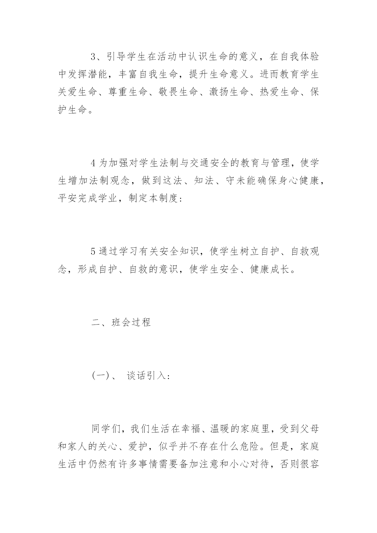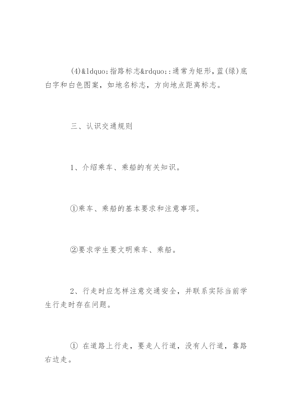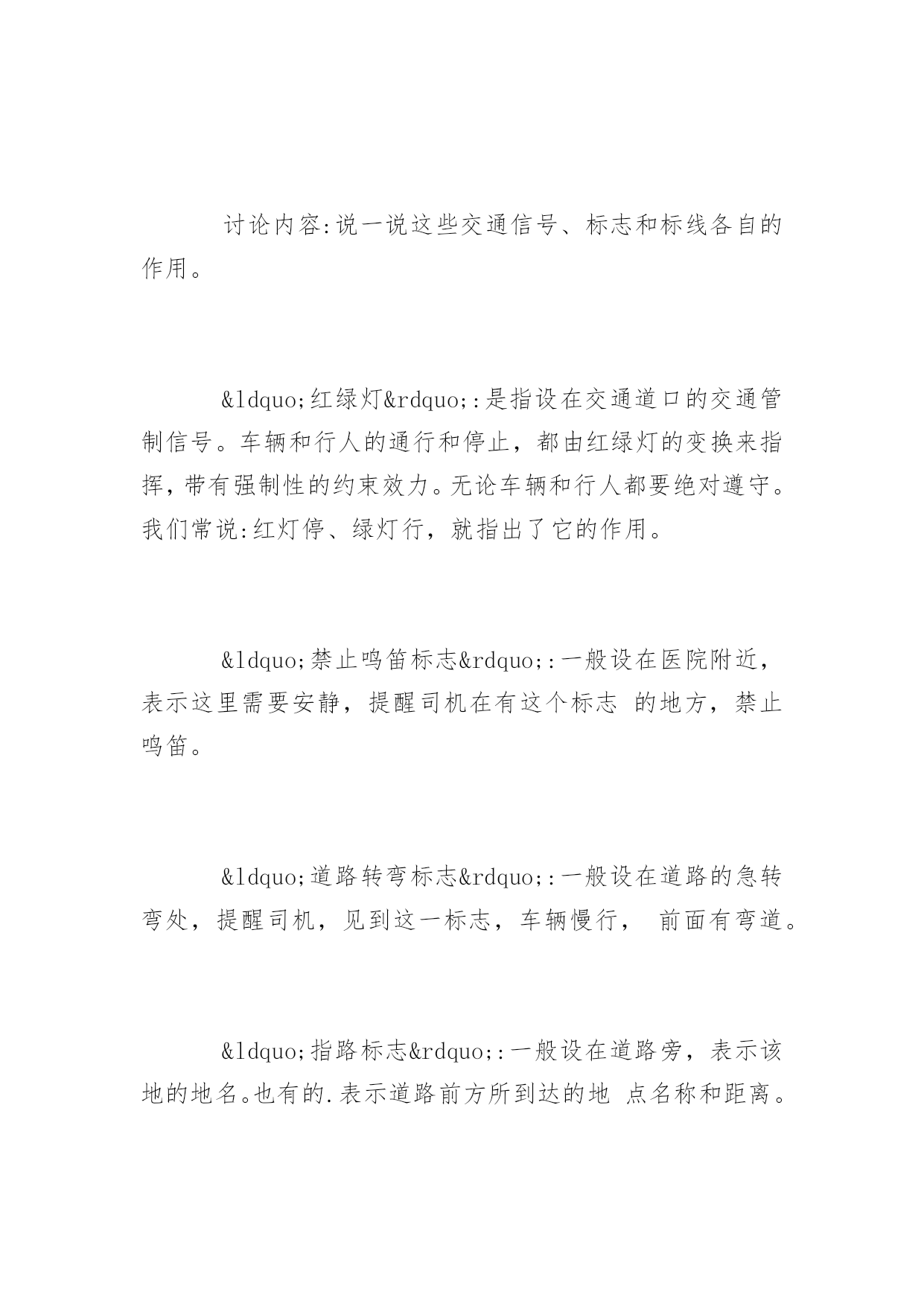 中学交通安全教育教案中学交通安全教育教案交通安全教育是解决交通事故的根本途径。只有有了很好的交通安全知识和自我防卫意识,才能确保交通的安全。以下是小编整理的关于交通安全教育教案的课件,欢迎参考!“交通安全教育”主题班会教案一、班会目的1、通过班会使学生了解生命的可贵,掌握有关的交通安全知识,认清学习目的,增强学生安全意识。2、以“增强交通安全意识,提高自我保护能力”为指导方针,切实加强安全教育与管理,确保学生安全。3、引导学生在活动中认识生命的意义,在自我体验中发挥潜能,丰富自我生命,提升生命意义。进而教育学生关爱生命、尊重生命、敬畏生命、激扬生命、热爱生命、保护生命。4为加强对学生法制与交通安全的教育与管理,使学生增加法制观念,做到这法、知法、守未能确保身心健康,平安完成学业,制定本制度:5通过学习有关安全知识,使学生树立自护、自救观念,形成自护、自救的意识,使学生安全、健康成长。二、班会过程(一)、谈话引入:同学们,我们生活在幸福、温暖的家庭里,受到父母和家人的关心、爱护,似乎并不存在什么危险。但是,家庭生活中仍然有许多事情需要备加注意和小心对待,否则很容易发生危险,酿成事故。在生活中我们应时时刻刻注意安全,如饮食安全、旅游安全、交友安全、用电安全、交通安全等,今天我们就来谈谈交通安全。首先请大家欣赏一段小品《肇祸》)(二)、班会内容:1、小品表演:(主要讲述一个肇事司机逃逸的事件)2、找出小品中的错误。比如打电话报警110,不是119;又比如打电话报警的人应该首先告诉警察出事的具体地点,而不是简单地说:“你们快来,这儿有人被撞了!”3、学生有感而发,谈看小品后的感想。(三)、《行人交通安全规范》知识问答。感谢以上同学的精彩表演,下面我们进入第二个环节--《行人交通安全规范》知识问答。我们实行抢答方式,每答对1题得1分,答错不扣分。《A》、行人过马路的方法:行人过马路有几种方法?(走人行横道,走地下通道,走天桥。)交通标志种类有哪些?有何含义?交通信号有灯光指挥信号,交通指挥棒信号和手势指挥信号三种。A、交通信号灯是以不同醒色的信号来实现交通控制和安全的.重要手段。交通信号灯分为以下三类十种。1.指挥灯信号及其含意指挥灯信号主要用于交叉路口,它分为五种(1)绿灯亮。准许车辆、行人通行,但转弯的车辆不准妨碍直行的车辆和被放行的行人通行。(2)黄灯亮。不准车辆、行人通行,但已越过停止线的车辆和已进人人行横道的行人,可以继续通行,右转弯的车辆和T形路口右边无横道的直行车辆在小妨碍被放行的车辆和行人通行的情况下,可以通行。(四)、交通安全歌。(五)、观看交通肇事录相。谈感受。(六)、班主任总结本次班会。(七)、主持人宣布班会结束。交通安全教育课教案教学目标:让学生认识简单的交通标志,初步了解一些与他们生活密切相关的交通规则,懂得自觉遵守规则的重要性及不懂交通规则所带来的危害性,为了自己和大家的安全,人人都必须遵守交通规则。教学重点和难点1.各种交通信号、标志和标线的作用。2.有关的交通法规。教学过程一、新课导入随着交通运输事业的发展,道路上的车辆越来越多,交通安全问题越来越受到人们的重视。怎样注意交通安全呢?今天我们就来学习。二、认识交通标志1、提问:你知道各种交通信号和交通标志、标线吗?它们有什么作用?2、出示交通标志图片学生分小组讨论。讨论内容:说一说这些交通信号、标志和标线各自的作用。“红绿灯”:是指设在交通道口的交通管制信号。车辆和行人的通行和停止,都由红绿灯的变换来指挥,带有强制性的约束效力。无论车辆和行人都要绝对遵守。我们常说:红灯停、绿灯行,就指出了它的作用。“禁止鸣笛标志”:一般设在医院附近,表示这里需要安静,提醒司机在有这个标志的地方,禁止鸣笛。“道路转弯标志”:一般设在道路的急转弯处,提醒司机,见到这一标志,车辆慢行,前面有弯道。“指路标志”:一般设在道路旁,表示该地的地名。也有的.表示道路前方所到达的地点名称和距离。“标线”:一般设置(画在公路路面上)在公路路面的必要处。如:道路地面上的白色和*纵线或横线,道路中央的*纵线,表示把对向行驶的车流分开,防止相撞。道路上白色的斑马状横线是人行横道。为行人穿越公路开辟的安全地带。在此标线内行走,保证人身安全。司机见到人行横道标志,应慢行和避让。师:常见交通标志,可分以下四种:(投影出示)(1)“警告标志”:通常为等边三角形(或菱形),黄或(白)底,