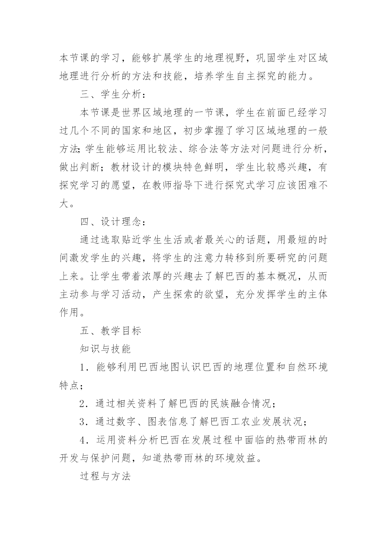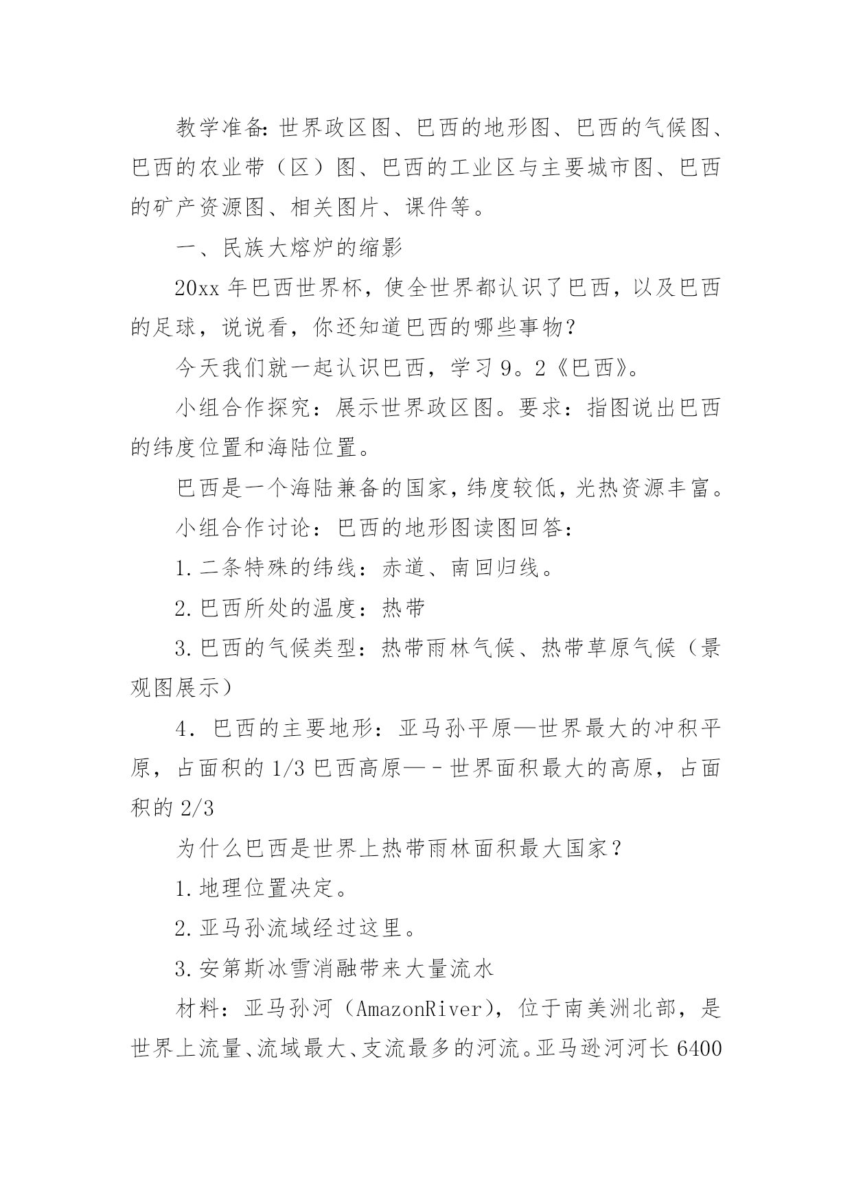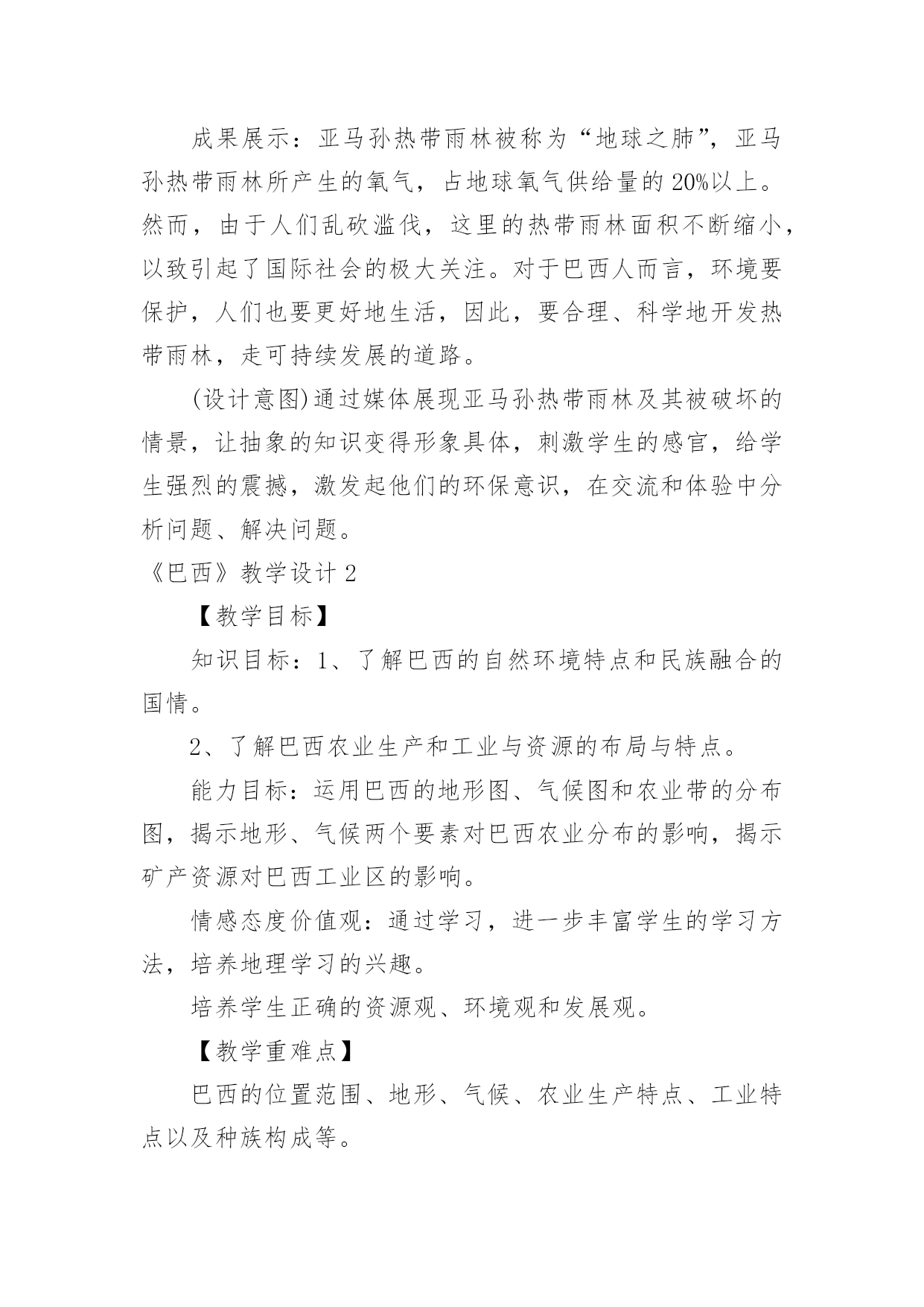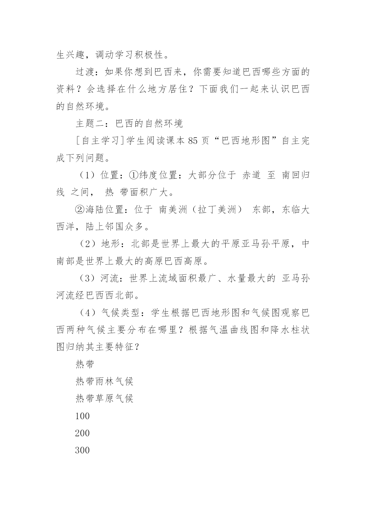 《巴西》教学设计《巴西》教学设计作为一位不辞辛劳的人民教师,编写教学设计是必不可少的,教学设计是根据课程标准的要求和教学对象的特点,将教学诸要素有序安排,确定合适的教学方案的设想和计划。教学设计应该怎么写才好呢?以下是小编精心整理的《巴西》教学设计,供大家参考借鉴,希望可以帮助到有需要的朋友。《巴西》教学设计1一、地理规律:本节课我积极展开地理高效课堂教学模式的构建,坚持以学生为本,使学生能够自主学习、参与合作探究,真正变课堂为学堂,学会从地图中寻找信息,进行正确的图文转化,学习有用的地理知识,树立正确的人地观念。二、教材分析:本节内容是本册教材世界地理分区部分中的最后一个国家案例,共分三个标题:“大量的混血种人的社会”、“发展中的工农业”和“热带雨林的开发与保护”。在说明巴西工业分布与热带雨林开发现状的同时,更加突出了人地关系和谐的思想,各部分内容又安排了相当数量的活动,目的是从学生的兴趣点着手,联系学生实际生活,引起学生探究巴西独特地理现象的兴趣,从而积极参与到教学活动中。通过本节课的学习,能够扩展学生的地理视野,巩固学生对区域地理进行分析的方法和技能,培养学生自主探究的能力。三、学生分析:本节课是世界区域地理的一节课,学生在前面已经学习过几个不同的国家和地区,初步掌握了学习区域地理的一般方法;学生能够运用比较法、综合法等方法对问题进行分析,做出判断;教材设计的模块特色鲜明,学生比较感兴趣,有探究学习的愿望,在教师指导下进行探究式学习应该困难不大。四、设计理念:通过选取贴近学生生活或者最关心的话题,用最短的时间激发学生的兴趣,将学生的注意力转移到所要研究的问题上来。让学生带着浓厚的兴趣去了解巴西的基本概况,从而主动参与学习活动,产生探索的欲望,充分发挥学生的主体作用。五、教学目标知识与技能1.能够利用巴西地图认识巴西的地理位置和自然环境特点;2.通过相关资料了解巴西的民族融合情况;3.通过数字、图表信息了解巴西工农业发展状况;4.运用资料分析巴西在发展过程中面临的热带雨林的开发与保护问题,知道热带雨林的环境效益。过程与方法1.在读图、绘图、填图、析图、讨论、阅读的过程中,认识巴西的地理位置、面积、地形、气候等自然地理特征。2.培养自主学习、合作探究的意识,提高综合分析地理问题的能力,进一步掌握学习国家地理的一般方法。情感、态度、价值观目标1.形成因地制宜和可持续发展的观念,认识环境与人类活动之间的内在联系,树立正确的人地观和可持续发展观。2.主动参与课堂讨论、小组合作,形成积极思考与乐于探究的学习态度。六、重点难点重点:巴西种族、文化特色;热带雨林的作用和问题;人地关系和谐理念。难点:巴西工农业发展与地理环境的关系。教学过程情景导入:我们的主要呼吸器官是肺,如果我们没有了肺我们就会死亡,你知道地球的肺在哪里么?现在地球的肺出现了什么问题?如果地球的肺没有了我们人类结局会怎样?我们能够拯救“地球之肺”吗?让我们一起共同关注巴西,走进拥有“地球之肺”这个神秘而重要的国家。主题一:大量混血种人的社会[自主学习]读“卞卡一家”图,了解有大量混血种人的社会的情况。从图上可以看出,卞卡一家既有白种人,也有黑种人、印第安人和混血种人,有大量的混血种人是不是卞卡家特殊的情况呢?出示图片“巴西的人种构成”,让学生读图认识:巴西白种人所占的比重最大,占一半,其次是黑白混血人,约占40%,黑种人约占6%,印第安人不到1%,还有少数日本人和华人等黄种人。过渡:巴西的这种混血种人特征,对巴西的文化有重要的影响,接下来,以小组为单位,交流展示巴西独特的风俗民情,并探究多元文化对巴西有哪些影响。[合作探究]通过阅读教材、查阅资料,说一说为什么巴西会有许多混血种人?从巴西的代表文化狂欢节和桑巴舞,可以发现葡萄牙、非洲、印第安人的文化印记,这对巴西有什么影响?小组交流讨论,说说自己的看法狂欢节足球桑巴舞成果展示:早期的葡萄牙和西班牙移民与黑种人、印第安人通婚现象比较普遍,他们的后代成为混血种人,在巴西有许多像卞卡一样的家庭。移民来到巴西,带来了不同的文化,与当地文化融合在一起,形成了富有特色的.新的文化形式。世界上还有不同文化融合的实例很多,你还能举例说明吗?学生自由回答。(设计意图)给学生一个自我展示的机会,鼓励学生通过上网搜集、阅读书籍等去获得更多知识,也能进一步激发学生兴趣,调动学习积极性。过渡:如果你想到巴西来,你需要知道巴西哪些方面的资料?会选择在什么地方居住?下面我们一起来认识巴西的自然环境。主题二:巴西的自然环境[自主学习]学生阅读课本85页“巴西地形图”自主完成下列问题。(1)位置:①纬度位置:大部分位于赤道至南回归线之间,热带面积广大。②海陆位置:位于南美洲(拉丁美洲)东部,东临大西洋,陆上邻国众多。(2)地形:北部是世界上最大的平原