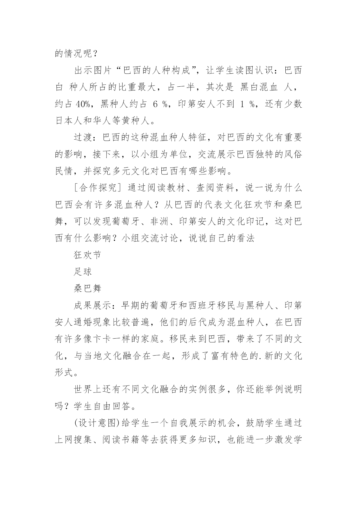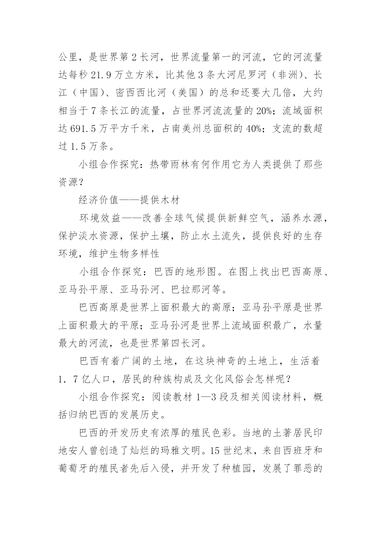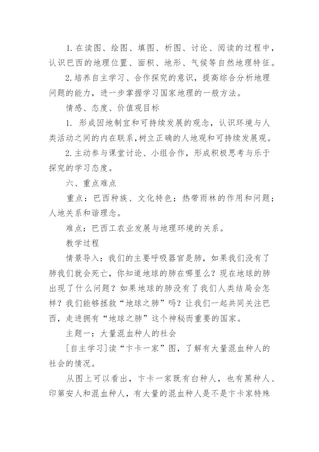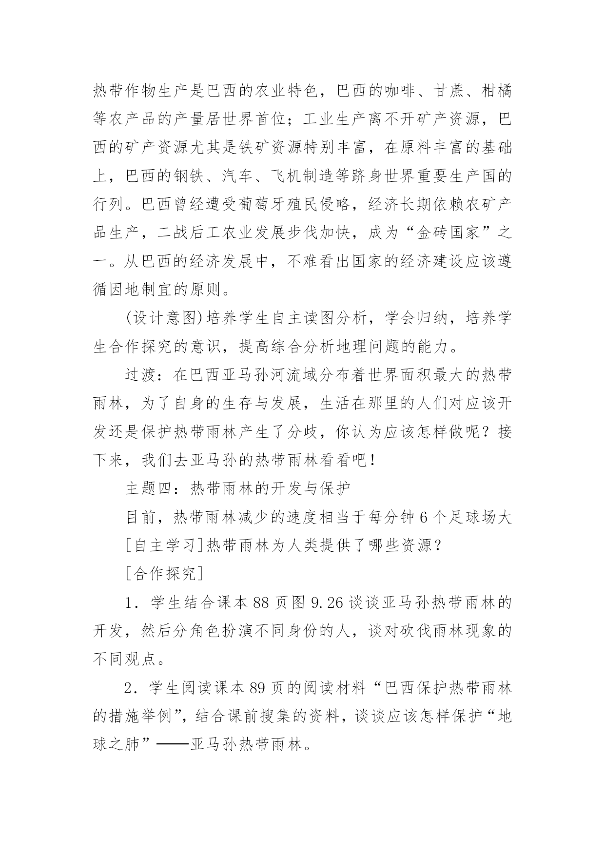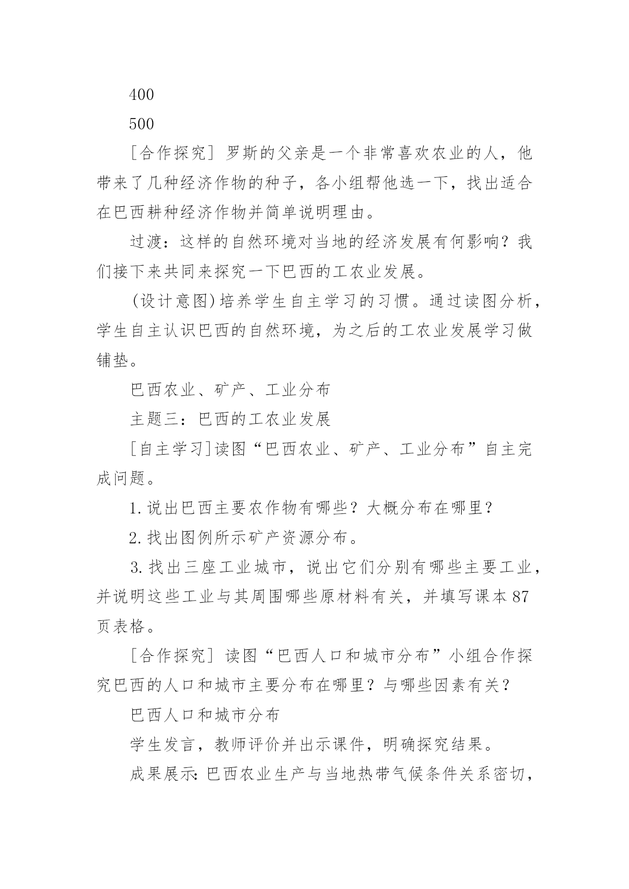 《巴西》教学设计《巴西》教学设计作为一位不辞辛劳的人民教师,编写教学设计是必不可少的,教学设计是根据课程标准的要求和教学对象的特点,将教学诸要素有序安排,确定合适的教学方案的设想和计划。教学设计应该怎么写才好呢?以下是小编精心整理的《巴西》教学设计,供大家参考借鉴,希望可以帮助到有需要的朋友。《巴西》教学设计1一、地理规律:本节课我积极展开地理高效课堂教学模式的构建,坚持以学生为本,使学生能够自主学习、参与合作探究,真正变课堂为学堂,学会从地图中寻找信息,进行正确的图文转化,学习有用的地理知识,树立正确的人地观念。二、教材分析:本节内容是本册教材世界地理分区部分中的最后一个国家案例,共分三个标题:“大量的混血种人的社会”、“发展中的工农业”和“热带雨林的开发与保护”。在说明巴西工业分布与热带雨林开发现状的同时,更加突出了人地关系和谐的思想,各部分内容又安排了相当数量的活动,目的是从学生的兴趣点着手,联系学生实际生活,引起学生探究巴西独特地理现象的兴趣,从而积极参与到教学活动中。通过本节课的学习,能够扩展学生的地理视野,巩固学生对区域地理进行分析的方法和技能,培养学生自主探究的能力。三、学生分析:本节课是世界区域地理的一节课,学生在前面已经学习过几个不同的国家和地区,初步掌握了学习区域地理的一般方法;学生能够运用比较法、综合法等方法对问题进行分析,做出判断;教材设计的模块特色鲜明,学生比较感兴趣,有探究学习的愿望,在教师指导下进行探究式学习应该困难不大。四、设计理念:通过选取贴近学生生活或者最关心的话题,用最短的时间激发学生的兴趣,将学生的注意力转移到所要研究的问题上来。让学生带着浓厚的兴趣去了解巴西的基本概况,从而主动参与学习活动,产生探索的欲望,充分发挥学生的主体作用。五、教学目标知识与技能1.能够利用巴西地图认识巴西的地理位置和自然环境特点;2.通过相关资料了解巴西的民族融合情况;3.通过数字、图表信息了解巴西工农业发展状况;4.运用资料分析巴西在发展过程中面临的热带雨林的开发与保护问题,知道热带雨林的环境效益。过程与方法1.在读图、绘图、填图、析图、讨论、阅读的过程中,认识巴西的地理位置、面积、地形、气候等自然地理特征。2.培养自主学习、合作探究的意识,提高综合分析地理问题的能力,进一步掌握学习国家地理的一般方法。情感、态度、价值观目标1.形成因地制宜和可持续发展的观念,认识环境与人类活动之间的内在联系,树立正确的人地观和可持续发展观。2.主动参与课堂讨论、小组合作,形成积极思考与乐于探究的学习态度。六、重点难点重点:巴西种族、文化特色;热带雨林的作用和问题;人地关系和谐理念。难点:巴西工农业发展与地理环境的关系。教学过程情景导入:我们的主要呼吸器官是肺,如果我们没有了肺我们就会死亡,你知道地球的肺在哪里么?现在地球的肺出现了什么问题?如果地球的肺没有了我们人类结局会怎样?我们能够拯救“地球之肺”吗?让我们一起共同关注巴西,走进拥有“地球之肺”这个神秘而重要的国家。主题一:大量混血种人的社会[自主学习]读“卞卡一家”图,了解有大量混血种人的社会的情况。从图上可以看出,卞卡一家既有白种人,也有黑种人、印第安人和混血种人,有大量的混血种人是不是卞卡家特殊的情况呢?出示图片“巴西的人种构成”,让学生读图认识:巴西白种人所占的比重最大,占一半,其次是黑白混血人,约占40%,黑种人约占6%,印第安人不到1%,还有少数日本人和华人等黄种人。过渡:巴西的这种混血种人特征,对巴西的文化有重要的影响,接下来,以小组为单位,交流展示巴西独特的风俗民情,并探究多元文化对巴西有哪些影响。[合作探究]通过阅读教材、查阅资料,说一说为什么巴西会有许多混血种人?从巴西的代表文化狂欢节和桑巴舞,可以发现葡萄牙、非洲、印第安人的文化印记,这对巴西有什么影响?小组交流讨论,说说自己的看法狂欢节足球桑巴舞成果展示:早期的葡萄牙和西班牙移民与黑种人、印第安人通婚现象比较普遍,他们的后代成为混血种人,在巴西有许多像卞卡一样的家庭。移民来到巴西,带来了不同的文化,与当地文化融合在一起,形成了富有特色的.新的文化形式。世界上还有不同文化融合的实例很多,你还能举例说明吗?学生自由回答。(设计意图)给学生一个自我展示的机会,鼓励学生通过上网搜集、阅读书籍等去获得更多知识,也能进一步激发学生兴趣,调动学习积极性。过渡:如果你想到巴西来,你需要知道巴西哪些方面的资料?会选择在什么地方居住?下面我们一起来认识巴西的自然环境。主题二:巴西的自然环境[自主学习]学生阅读课本85页“巴西地形图”自主完成下列问题。(1)位置:①纬度位置:大部分位于赤道至南回归线之间,热带面积广大。②海陆位置:位于南美洲(拉丁美洲)东部,东临大西洋,陆上邻国众多。(2)地形:北部是世界上最大的平原