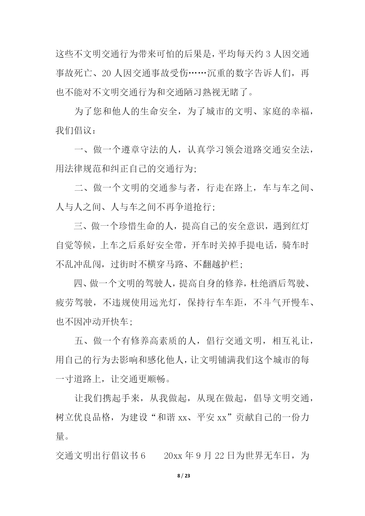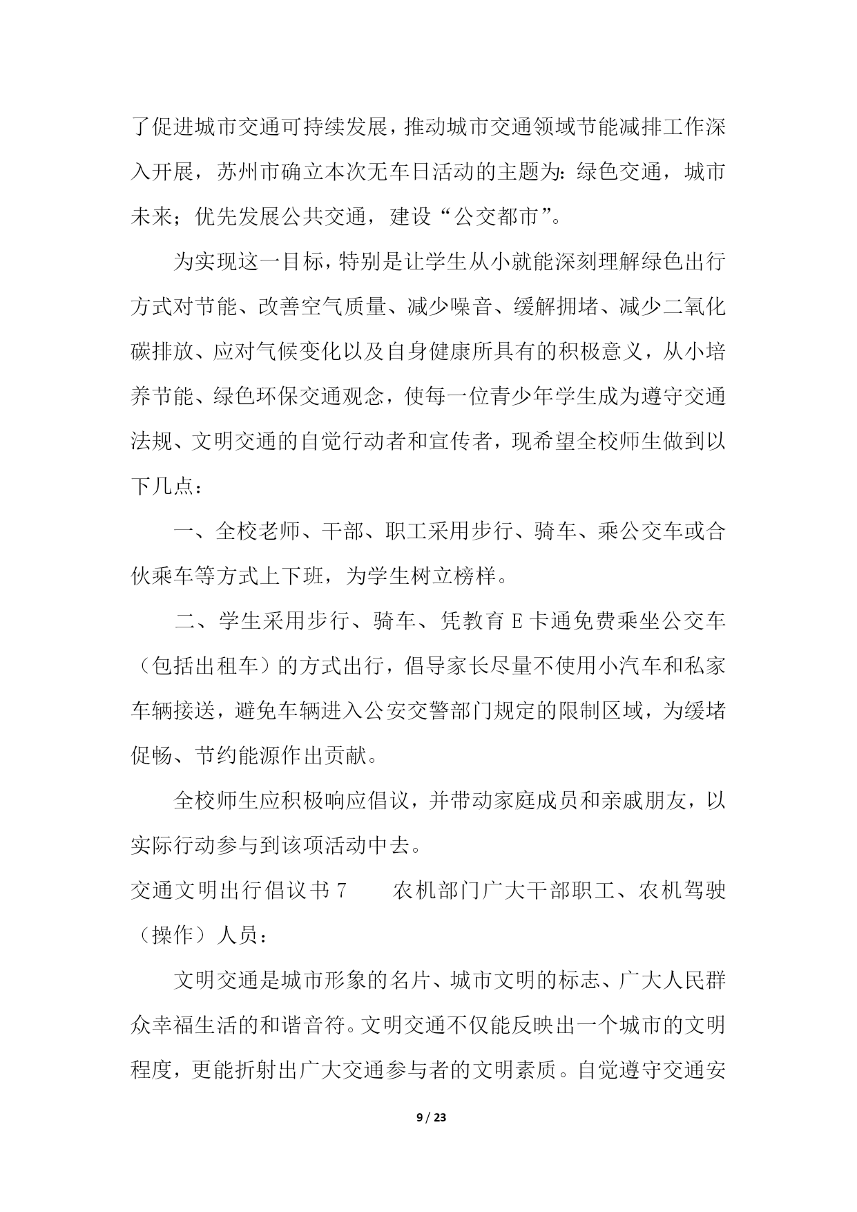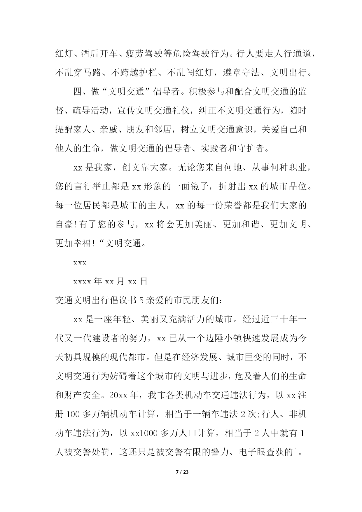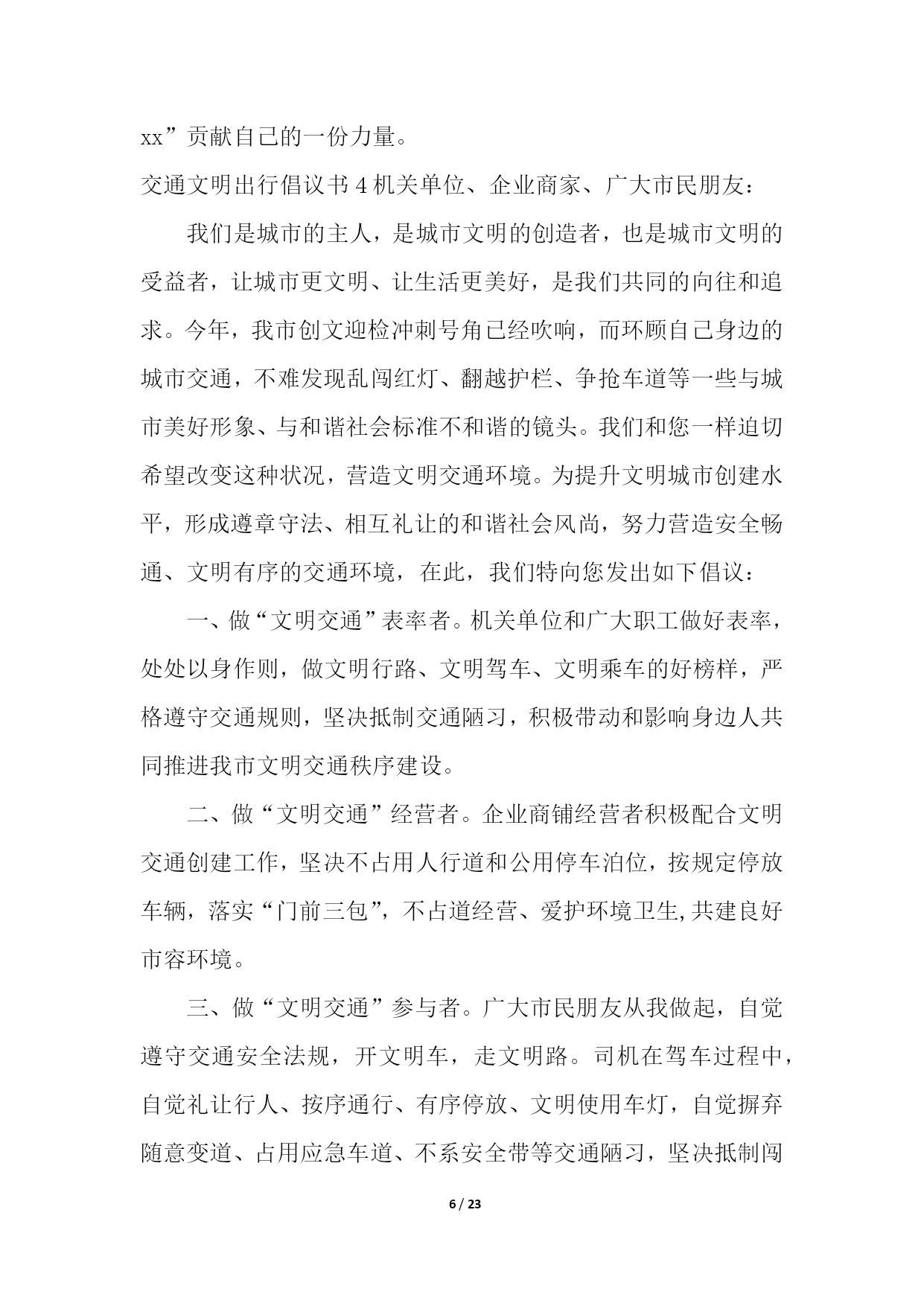 PAGE23/NUMPAGES23交通文明出行倡议书交通文明出行倡议书1尊敬的家长朋友、亲爱的同学们:大家好!为确保学生的出行安全,我校特开展了“文明交通绿色出行”的活动,因此我们倡议同学们认真学习交通安全知识,提高交通安全意识和自我防护能力,同时希望家长朋友规范自己的交通行为,以自身的一言一行引导孩子养成良好的交通习惯。为此,我们倡议全校师生及家长做到以下几点:1、在道路上行走时,要在人行道内行走或靠路边行走。不要在道路两侧嬉戏、追逐或长时间逗留,不要突然横过道路。横过道路时,必须从人行横道、天桥及其他行人过街设施通过;在通过人行横道时,也要注意观察来往车辆,加强自身安全防范。2、通过设有交通信号灯和人行横道的路口时,应当注意观察人行横道指示灯,在绿灯亮时通行;通过没有交通信号灯或人行横道的路口,应注意避让通行的车辆,在没有车辆通行的前提下安全通行。3、横过道路要做到:左看、右看、再左看,三次确认保安全,即;左看,确认近处无驶来车辆;再右看,确认远处无车辆通过;再次左看确认安全,才能迅速安全通过。4、家长要带头并教育自己的孩子不乘坐无牌、无证及无证人员驾驶的机动车、农用车三轮车、电瓶三轮车和拖拉机等交通工具;不乘坐车况差、改装车座和超员、超载的车辆。5、每一名小学生要自觉学习交通安全知识,学会自我保护,并劝告家长文明通行,不酒后驾驶、不超速、不违法超车、不疲劳驾驶、不闯红灯、不乱停乱放,驾驶和乘坐二轮摩托车时须戴好安全头盔。交通的文明需要大家共同建设,文明的交通需要大家共同呵护。让我们携起手来,倡导文明交通,树立文明新风,为创设安全、畅通、和谐、文明的交通环境作出自已应有的贡献!倡议人:六年级全体学生20xx.3.30交通文明出行倡议书2当前,我们美丽的家园——首都北京正在加快“人文北京、科技北京、绿色北京”和中国特色世界城市的建设步伐,为了表达我们广大中小学生对首都美好未来的期盼、憧憬,为建设首都贡献我们的一份力量,值此“绿色出行、文明交通、爱护环境——中韩少年儿童沙福杯绘画大赛”优秀作品展开幕之际,我们谨代表参加本次绘画大赛的一万多名参赛选手向全市未成年人发出“做文明有礼的北京人——”倡议:1.争当文明小宣传员。在学校、家庭、社会积极主动向自己的长辈、亲戚、同学、朋友宣传绿色出行、文明交通的理念,宣传健康环保的出行方式,倡导树立低碳、环保、文明意识,携起手来,共同参与到“绿色出行、文明交通”的行动中来。2.争创绿色出行小标兵。积极参与“绿色出行、文明交通、从我做起”实践活动,开展“半小时绿色出行”行动,和家长一起多走路,多乘坐公共交通工具,或者骑自行车出行,倡导合作乘车,文明驾车,为缓解首都的交通拥堵做贡献。3.争做交通文明小使者。增强交通安全意识,遵守交通规则,文明乘车,做到车辆停稳后有序上下车。安全出行,过马路要走人行横道,不闯红灯,不乱穿马路,骑自行车不抢行猛拐。4.倡导绿色生活新风尚。追求绿色生活方式,积极参加有利于改善北京空气质量的活动。树立节能减排、环保低碳的生活理念,合理购物、适度消费,减少一次性物品的使用;实行垃圾减量、垃圾分类、循环利用,共同建设绿色美丽新北京。亲爱的同学们,我们不仅要用手中的画笔来描绘首都美好的明天,我们更要用实际行动积极参与到“绿色出行”的行动中来。文明交通、从我做起,绿色出行、始于足下。让我们从一点一滴做起,从身边的小事做起,争做文明有礼的北京人,为把我们的首都建设得更加美好贡献我们的一份力量。交通文明出行倡议书3广大市民朋友们:xx是一座美丽而充满活力的海滨城市,是世界驰名的浪漫之都,是全国首批文明城市。在今年全国15个副省级城市公共文明指数调查中,xx作为文明城市的各项指数又一次名列前茅,作为xx市民,我们应该感到骄傲和自豪!城市文明是一个公共的道德范畴,需要我们全体市民共同遵守和把持,需要每一个公民自觉履行从我做起。然而,我们可以清醒地看到,近年来,交通出行文明仍然存在着诸多不尽人意的地方,主要表现在:机动车不按线行驶,争道抢行,逆向行驶;闯红灯、双黄线调头;公共场所机动车随意停放,占用机动车道;接送学生上下学车辆长时间等候占用机动车道;轻微交通事故得不到自行解决长时间占用机动车道,造成交通堵塞;出租汽车争道抢行现象突出;大型货运车辆占用快车道行驶;行人不走人行横道和过街设施,横穿斜穿马路现象比较突出;机动车行驶人行横道不能减速慢行,礼让行人,造成过街行人恐慌等等。这些不文明现象成为造成城市道路交通拥堵的主观因素,与我们这座文明城市显得极不协调。交通是我们生活中不可缺少的一部分,交通文明是城市文明极为重要的组成部分,交通文明的程度不仅能反映出一个城市的文明程度,更能折射出广大市民的文明素质。共建文明的交通环境,不仅是全市各部门的共同任务,而且还是每一个市民
