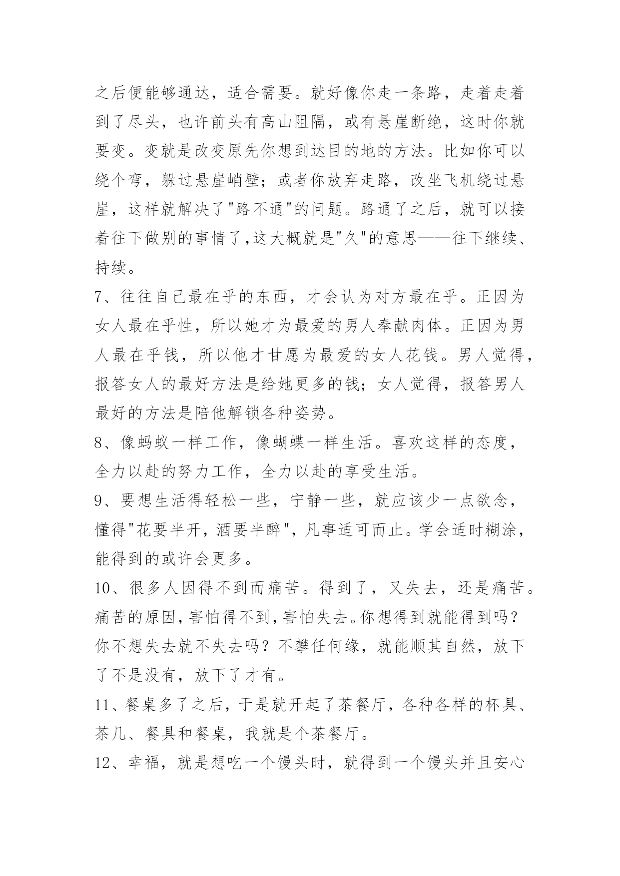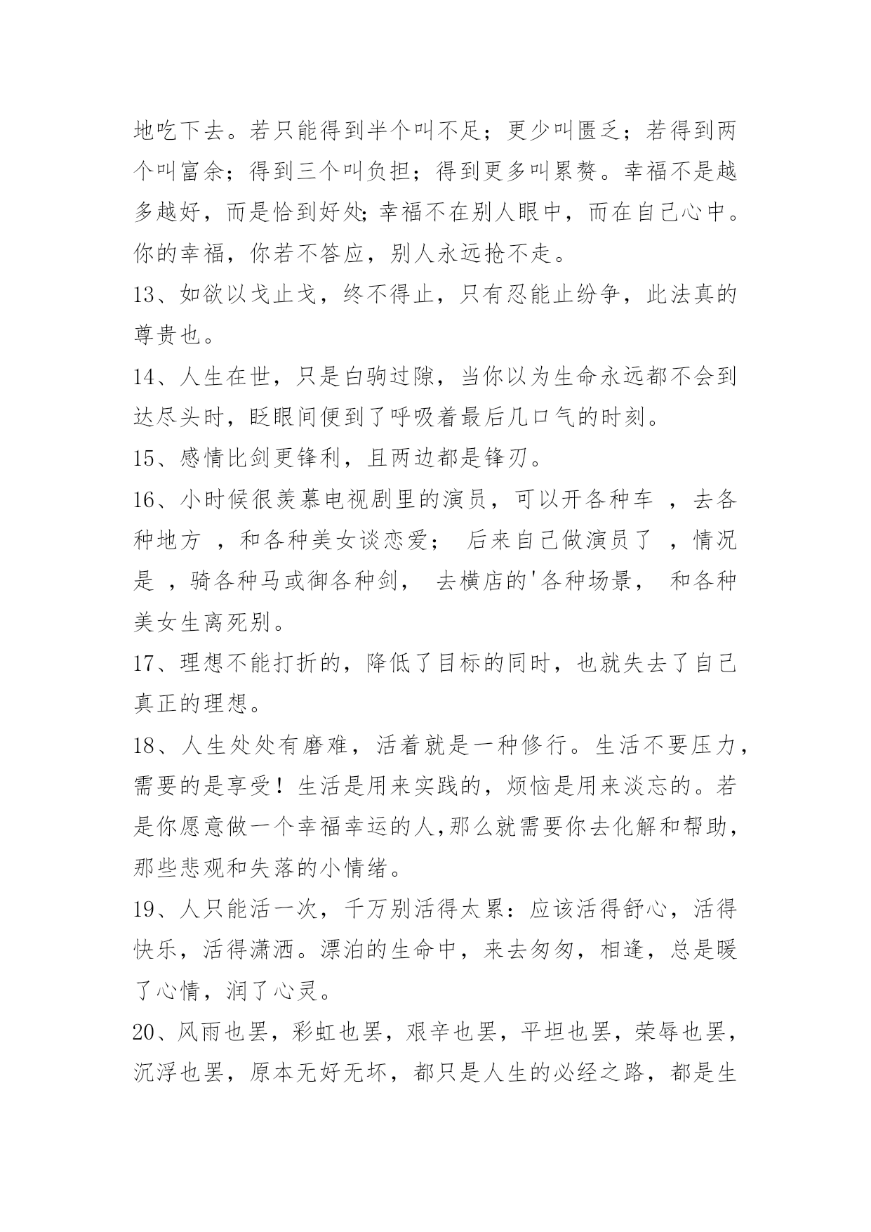人生的哲理语录30条【必备】人生的哲理语录30条不要随随便便的爱了。因为有一种单身叫"宁缺勿滥",有一种单身只为等待某人。下面是小编为大家收集的人生的哲理语录30条,欢迎阅读与收藏。1、人生是没有什么常态可言的,世事总是在不断地变化之中。将成败看得更加轻松一些,不管是悲是喜,这一切都将过去。失败了只不过是从头再来,成功了,也要更进一步。2、[真理无私]真正的美是属于所有人的,任何人都没有强据为已有的权利。太阳是照所有人的,空气是让所有人呼吸的,大路是给所有人走的。假如因为自己起来得早,第一个看见太阳升起,喊了一嗓子"太阳升起来了",便认为自己拥有专利,硬要向人收"日照费",是不是太霸道了呢?3、别拿自己的人生和他人做比较,你根本不清楚他们的人生是怎么一回事。除了你,没有人在主宰你的快乐。别人怎么看你根本不关你的事。每一天都出门,奇迹在四处等着。永远选择快乐地生活。善待每一个人。4、人和人相处,应常常借用对方的眼睛看彼此的世界,更可去除我执。5、有人说人生是一场梦,有人说人生是一出戏,我说人生是一首多情的诗。6、当事物发展到极点、穷尽的时候,就必须求变化,变化之后便能够通达,适合需要。就好像你走一条路,走着走着到了尽头,也许前头有高山阻隔,或有悬崖断绝,这时你就要变。变就是改变原先你想到达目的地的方法。比如你可以绕个弯,躲过悬崖峭壁;或者你放弃走路,改坐飞机绕过悬崖,这样就解决了"路不通"的问题。路通了之后,就可以接着往下做别的事情了,这大概就是"久"的意思——往下继续、持续。7、往往自己最在乎的东西,才会认为对方最在乎。正因为女人最在乎性,所以她才为最爱的男人奉献肉体。正因为男人最在乎钱,所以他才甘愿为最爱的女人花钱。男人觉得,报答女人的最好方法是给她更多的钱;女人觉得,报答男人最好的方法是陪他解锁各种姿势。8、像蚂蚁一样工作,像蝴蝶一样生活。喜欢这样的态度,全力以赴的努力工作,全力以赴的享受生活。9、要想生活得轻松一些,宁静一些,就应该少一点欲念,懂得"花要半开,酒要半醉",凡事适可而止。学会适时糊涂,能得到的或许会更多。10、很多人因得不到而痛苦。得到了,又失去,还是痛苦。痛苦的原因,害怕得不到,害怕失去。你想得到就能得到吗?你不想失去就不失去吗?不攀任何缘,就能顺其自然,放下了不是没有,放下了才有。11、餐桌多了之后,于是就开起了茶餐厅,各种各样的杯具、茶几、餐具和餐桌,我就是个茶餐厅。12、幸福,就是想吃一个馒头时,就得到一个馒头并且安心地吃下去。若只能得到半个叫不足;更少叫匮乏;若得到两个叫富余;得到三个叫负担;得到更多叫累赘。幸福不是越多越好,而是恰到好处;幸福不在别人眼中,而在自己心中。你的幸福,你若不答应,别人永远抢不走。13、如欲以戈止戈,终不得止,只有忍能止纷争,此法真的尊贵也。14、人生在世,只是白驹过隙,当你以为生命永远都不会到达尽头时,眨眼间便到了呼吸着最后几口气的时刻。15、感情比剑更锋利,且两边都是锋刃。16、小时候很羡慕电视剧里的演员,可以开各种车,去各种地方,和各种美女谈恋爱;后来自己做演员了,情况是,骑各种马或御各种剑,去横店的'各种场景,和各种美女生离死别。17、理想不能打折的,降低了目标的同时,也就失去了自己真正的理想。18、人生处处有磨难,活着就是一种修行。生活不要压力,需要的是享受!生活是用来实践的,烦恼是用来淡忘的。若是你愿意做一个幸福幸运的人,那么就需要你去化解和帮助,那些悲观和失落的小情绪。19、人只能活一次,千万别活得太累:应该活得舒心,活得快乐,活得潇洒。漂泊的生命中,来去匆匆,相逢,总是暖了心情,润了心灵。20、风雨也罢,彩虹也罢,艰辛也罢,平坦也罢,荣辱也罢,沉浮也罢,原本无好无坏,都只是人生的必经之路,都是生命需要去品尝的滋味,酸甜苦辣只是心的分别。一切苦或乐的感受,一切悲或喜的经历,最后都将成为云烟,都将回归空的本来面目。21、记住恩,忘掉恨,你的人生才有意义。「恩」让你觉得一切皆可贵,「恨」只会让你旧疾复发,终至使你形成另一种伤害。22、所有少年时期经历过的一草一木,在任何时候都会非常亲切地保留在一个人的记忆中,并且一想起来就叫人甜蜜得鼻子发酸。——路遥《人生》23、做人要立好志,发好愿。24、生活中有许多我们始料不及的事情,很多时候,面对那些原本以为过不去的坎,面对那些一时无法接受的事,我们能做的只是的等这一阵过去。相信这一夜的痛哭过后,还有新的早晨。25、有时候,我们越来越强烈而想嚐試的灵魂会被封闭,在我们越来越狭窄而从众的生活模式里面,慢慢失去了生命原有的丰富可能性。然后,我们的灵魂就会生病。26、有先于死亡的死,也有超出一个人生活界限的生。我们和虚无的真正分办界线,不是死亡,而是活动的停止。27、人生,总会与许多人,事,物有着交点,但在相交之后,更多的