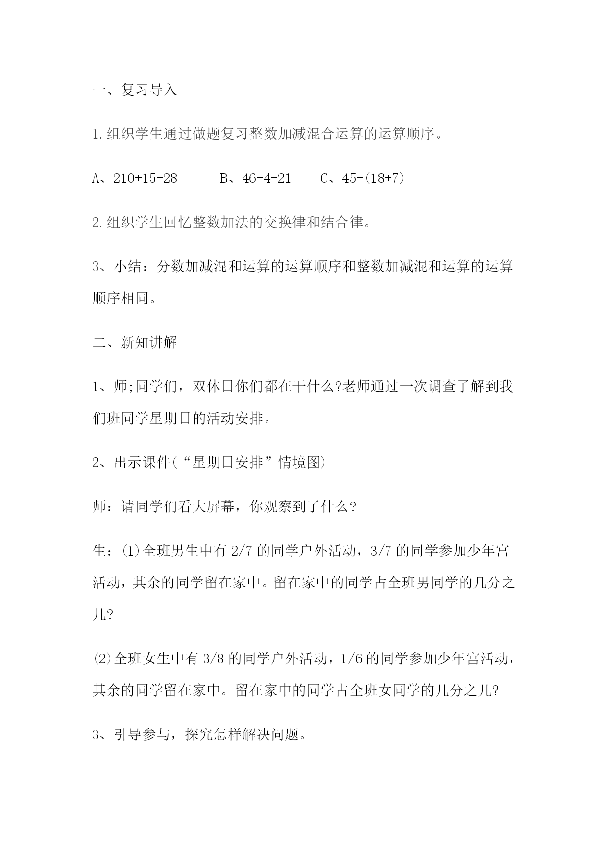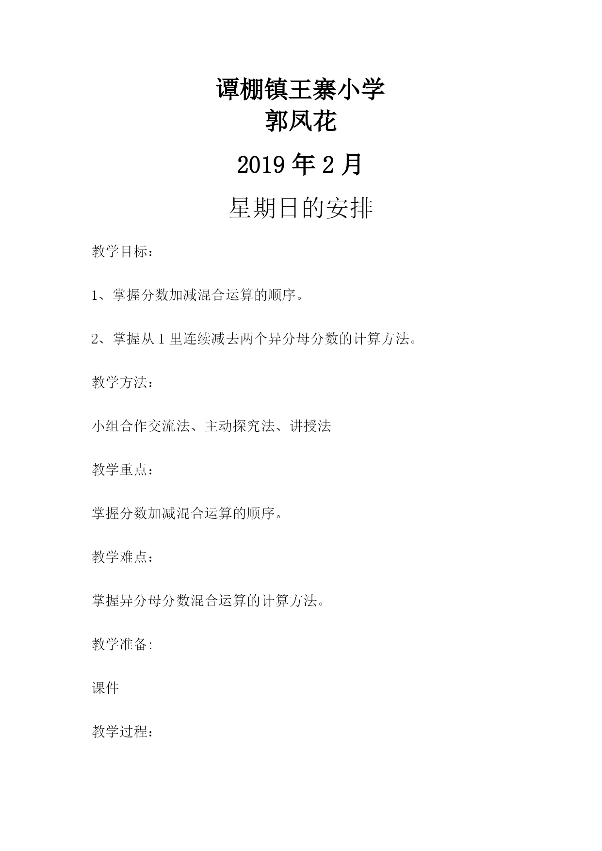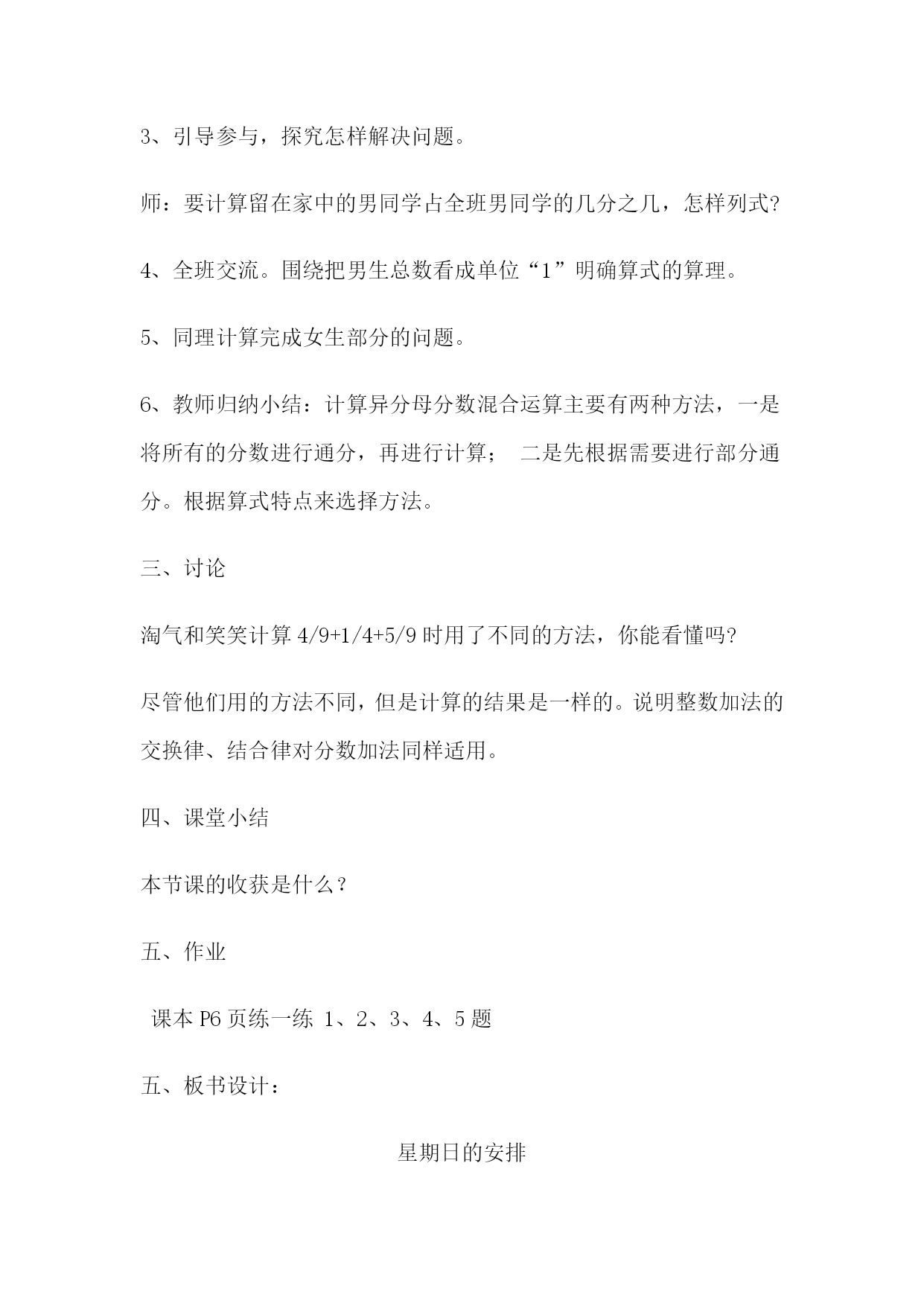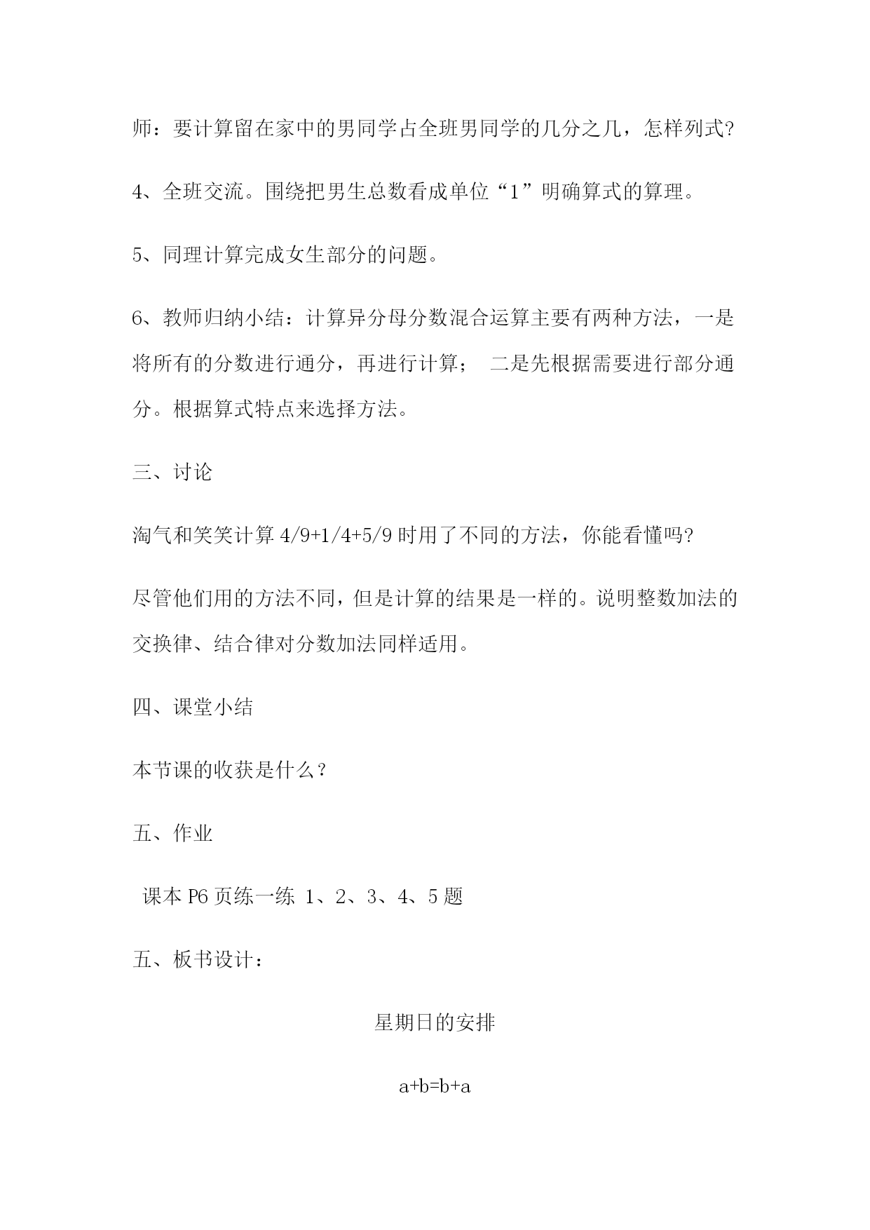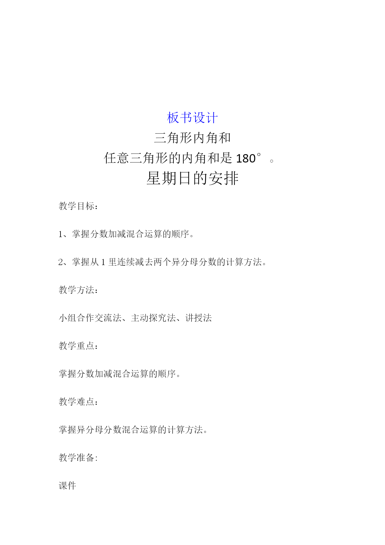 《三角形的内角和》教学设计故事导入数学王国里的三角形兄弟:锐角三角形、直角三角形、钝角三角形最近为了谁的内角和大争吵不休!引入概念------内角,内角和,解释概念,揭示主题(板书:三角形内角和)动手操作,获得知识出示教具——直角三角板请学生说出各个内角(90°60°30°)内角和为180°.自然引出其他类型的三角形的内角.合作学习,获得知识量一量,算一算呈现教具(三种三角形+活动记录表格),同桌之间,测量,记录,计算不同类型的三角形内角和,允许有小误差。明确:任意三角形的内角和是180°。拼一拼通过把三角形(教具,随机发给每桌不同类型的三角形)的各个内角撕下来,能拼成一个平角,进一步验证刚才的结论。师生小结:无论是锐角三角形,直角三角形,钝角三角形,内角和都是180°。(板书:任意三角形内角和是180°)运用知识,解决问题练习一:已知三角形的两个内角,求另一个内角的和(4个小题)。练习二:将一个三角形分成两个小三角形,小三角形的内角和是多少,说出你的理由.练习三:运用三角形内角和知识解决生活中的问题,已知等腰三角形风筝的一个底角,求出它的顶角。练习四:课外拓展——将一个三角形剪去一个内角,它的内角和是多少?运用今天的知识解决这个问题或者留作下节课再讨论,为下节课学习四边形的内角和做铺垫。小结今天你有什么收获?作业布置练习十六第1,2题板书设计三角形内角和任意三角形的内角和是180°。星期日的安排教学目标:1、掌握分数加减混合运算的顺序。2、掌握从1里连续减去两个异分母分数的计算方法。教学方法:小组合作交流法、主动探究法、讲授法教学重点:掌握分数加减混合运算的顺序。教学难点:掌握异分母分数混合运算的计算方法。教学准备:课件教学过程:一、复习导入1.组织学生通过做题复习整数加减混合运算的运算顺序。A、210+15-28B、46-4+21C、45-(18+7)2.组织学生回忆整数加法的交换律和结合律。3、小结:分数加减混和运算的运算顺序和整数加减混和运算的运算顺序相同。二、新知讲解1、师;同学们,双休日你们都在干什么?老师通过一次调查了解到我们班同学星期日的活动安排。2、出示课件(“星期日安排”情境图)师:请同学们看大屏幕,你观察到了什么?生:(1)全班男生中有2/7的同学户外活动,3/7的同学参加少年宫活动,其余的同学留在家中。留在家中的同学占全班男同学的几分之几?(2)全班女生中有3/8的同学户外活动,1/6的同学参加少年宫活动,其余的同学留在家中。留在家中的同学占全班女同学的几分之几?3、引导参与,探究怎样解决问题。师:要计算留在家中的男同学占全班男同学的几分之几,怎样列式?4、全班交流。围绕把男生总数看成单位“1”明确算式的算理。5、同理计算完成女生部分的问题。6、教师归纳小结:计算异分母分数混合运算主要有两种方法,一是将所有的分数进行通分,再进行计算;二是先根据需要进行部分通分。根据算式特点来选择方法。三、讨论淘气和笑笑计算4/9+1/4+5/9时用了不同的方法,你能看懂吗?尽管他们用的方法不同,但是计算的结果是一样的。说明整数加法的交换律、结合律对分数加法同样适用。四、课堂小结本节课的收获是什么?五、作业课本P6页练一练1、2、3、4、5题五、板书设计:星期日的安排a+b=b+a(a+b)+c=a+(b+c)六、课后反思:《星期日的安排》教学设计谭棚镇王寨小学郭凤花2019年2月星期日的安排教学目标:1、掌握分数加减混合运算的顺序。2、掌握从1里连续减去两个异分母分数的计算方法。教学方法:小组合作交流法、主动探究法、讲授法教学重点:掌握分数加减混合运算的顺序。教学难点:掌握异分母分数混合运算的计算方法。教学准备:课件教学过程:一、复习导入1.组织学生通过做题复习整数加减混合运算的运算顺序。A、210+15-28B、46-4+21C、45-(18+7)2.组织学生回忆整数加法的交换律和结合律。3、小结:分数加减混和运算的运算顺序和整数加减混和运算的运算顺序相同。二、新知讲解1、师;同学们,双休日你们都在干什么?老师通过一次调查了解到我们班同学星期日的活动安排。2、出示课件(“星期日安排”情境图)师:请同学们看大屏幕,你观察到了什么?生:(1)全班男生中有2/7的同学户外活动,3/7的同学参加少年宫活动,其余的同学留在家中。留在家中的同学占全班男同学的几分之几?(2)全班女生中有3/8的同学户外活动,1/6的同学参加少年宫活动,其余的同学留在家中。留在家中的同学占全班女同学的几分之几?3、引导参与,探究怎样解决