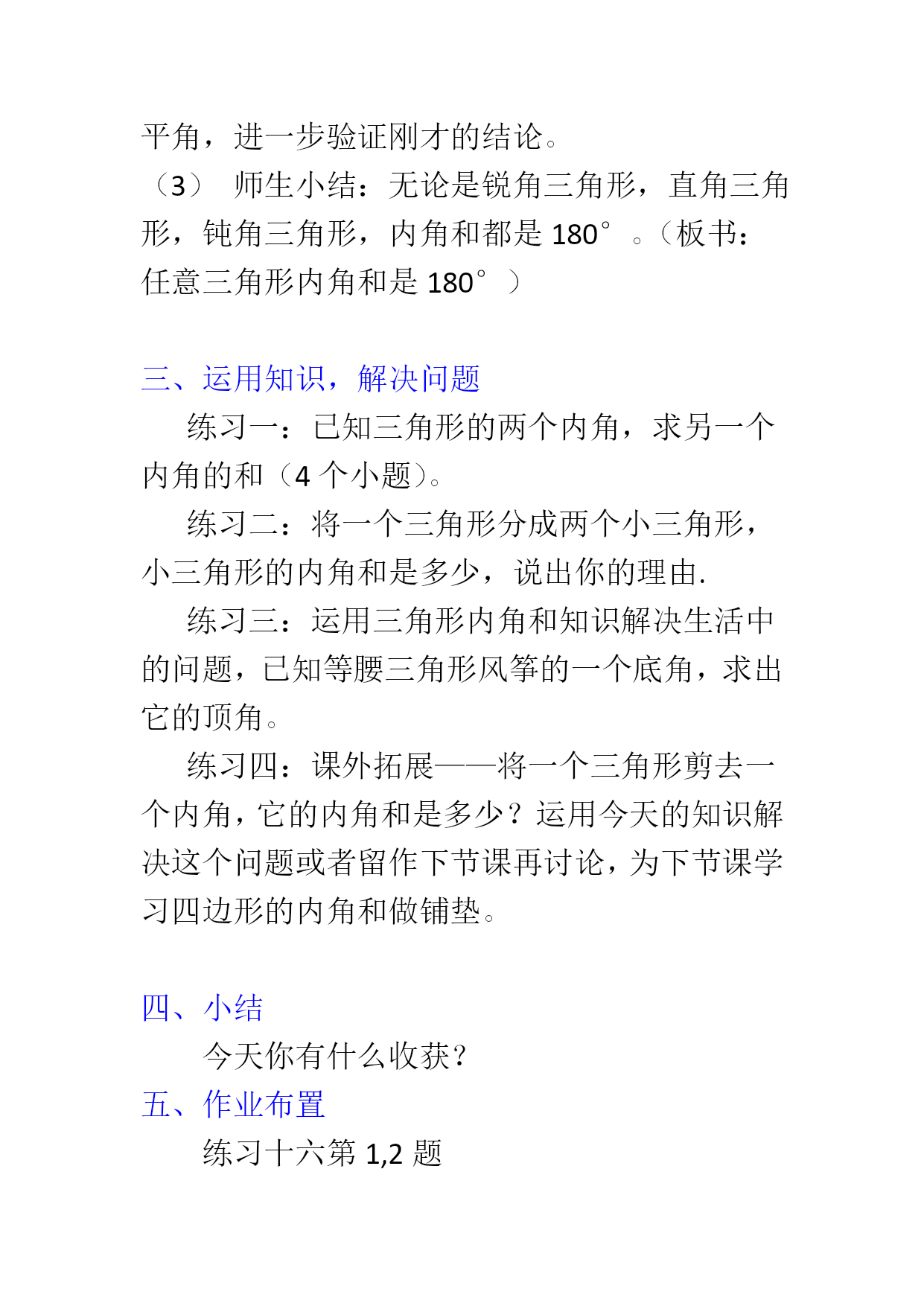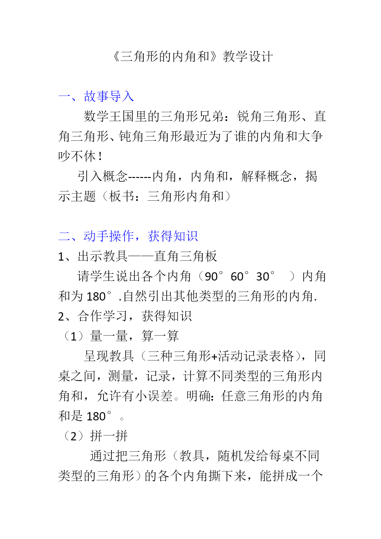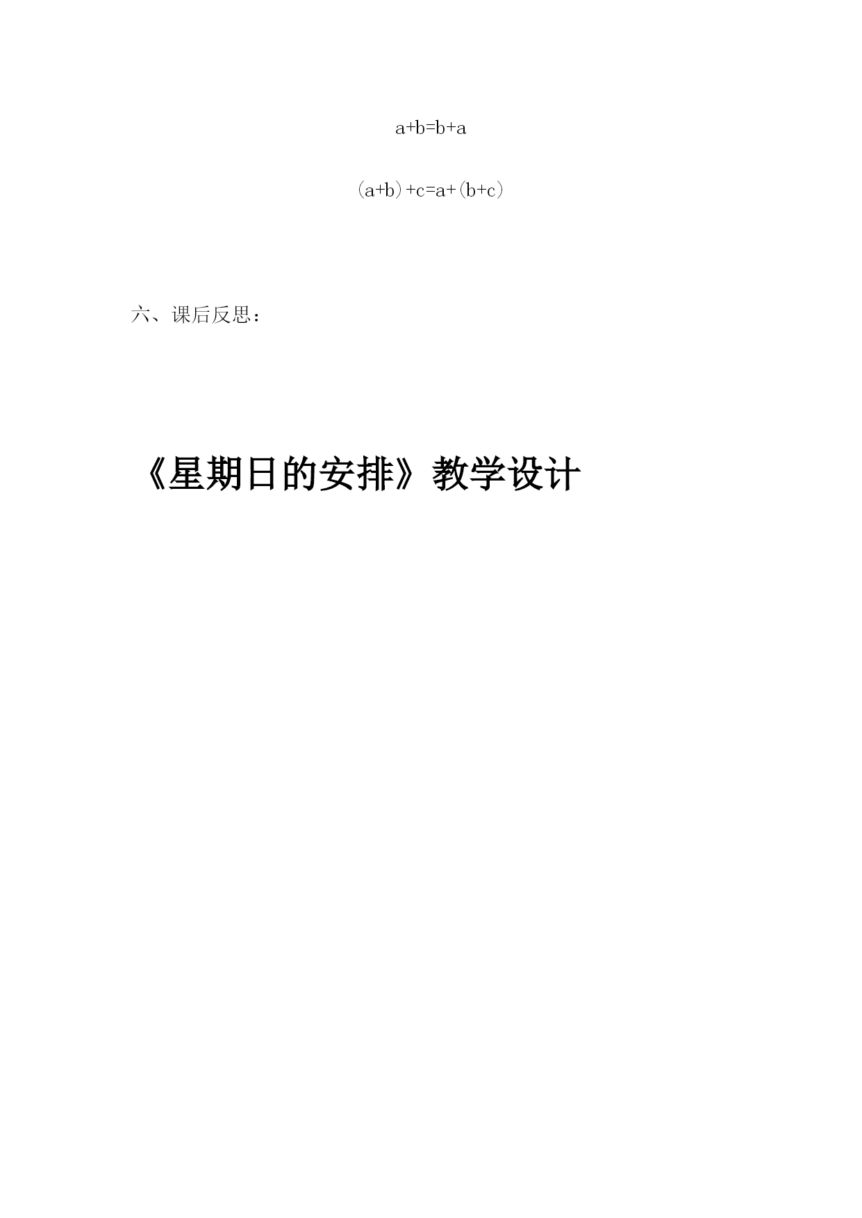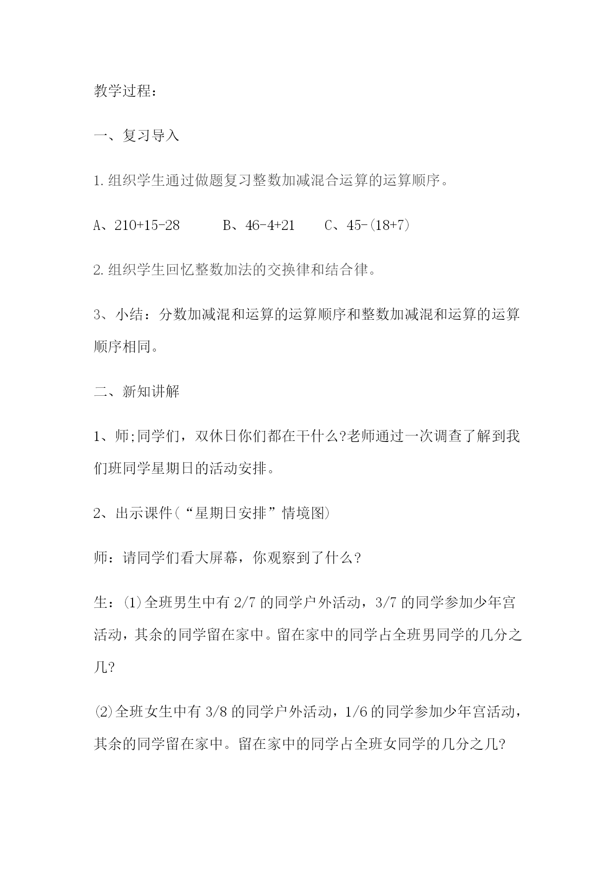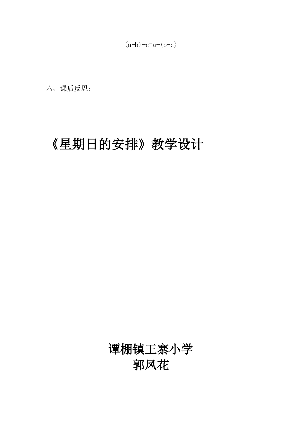 《三角形的内角和》教学设计故事导入数学王国里的三角形兄弟:锐角三角形、直角三角形、钝角三角形最近为了谁的内角和大争吵不休!引入概念------内角,内角和,解释概念,揭示主题(板书:三角形内角和)动手操作,获得知识出示教具——直角三角板请学生说出各个内角(90°60°30°)内角和为180°.自然引出其他类型的三角形的内角.合作学习,获得知识量一量,算一算呈现教具(三种三角形+活动记录表格),同桌之间,测量,记录,计算不同类型的三角形内角和,允许有小误差。明确:任意三角形的内角和是180°。拼一拼通过把三角形(教具,随机发给每桌不同类型的三角形)的各个内角撕下来,能拼成一个平角,进一步验证刚才的结论。师生小结:无论是锐角三角形,直角三角形,钝角三角形,内角和都是180°。(板书:任意三角形内角和是180°)运用知识,解决问题练习一:已知三角形的两个内角,求另一个内角的和(4个小题)。练习二:将一个三角形分成两个小三角形,小三角形的内角和是多少,说出你的理由.练习三:运用三角形内角和知识解决生活中的问题,已知等腰三角形风筝的一个底角,求出它的顶角。练习四:课外拓展——将一个三角形剪去一个内角,它的内角和是多少?运用今天的知识解决这个问题或者留作下节课再讨论,为下节课学习四边形的内角和做铺垫。小结今天你有什么收获?作业布置练习十六第1,2题板书设计三角形内角和任意三角形的内角和是180°。星期日的安排教学目标:1、掌握分数加减混合运算的顺序。2、掌握从1里连续减去两个异分母分数的计算方法。教学方法:小组合作交流法、主动探究法、讲授法教学重点:掌握分数加减混合运算的顺序。教学难点:掌握异分母分数混合运算的计算方法。教学准备:课件教学过程:一、复习导入1.组织学生通过做题复习整数加减混合运算的运算顺序。A、210+15-28B、46-4+21C、45-(18+7)2.组织学生回忆整数加法的交换律和结合律。3、小结:分数加减混和运算的运算顺序和整数加减混和运算的运算顺序相同。二、新知讲解1、师;同学们,双休日你们都在干什么?老师通过一次调查了解到我们班同学星期日的活动安排。2、出示课件(“星期日安排”情境图)师:请同学们看大屏幕,你观察到了什么?生:(1)全班男生中有2/7的同学户外活动,3/7的同学参加少年宫活动,其余的同学留在家中。留在家中的同学占全班男同学的几分之几?(2)全班女生中有3/8的同学户外活动,1/6的同学参加少年宫活动,其余的同学留在家中。留在家中的同学占全班女同学的几分之几?3、引导参与,探究怎样解决问题。师:要计算留在家中的男同学占全班男同学的几分之几,怎样列式?4、全班交流。围绕把男生总数看成单位“1”明确算式的算理。5、同理计算完成女生部分的问题。6、教师归纳小结:计算异分母分数混合运算主要有两种方法,一是将所有的分数进行通分,再进行计算;二是先根据需要进行部分通分。根据算式特点来选择方法。三、讨论淘气和笑笑计算4/9+1/4+5/9时用了不同的方法,你能看懂吗?尽管他们用的方法不同,但是计算的结果是一样的。说明整数加法的交换律、结合律对分数加法同样适用。四、课堂小结本节课的收获是什么?五、作业课本P6页练一练1、2、3、4、5题五、板书设计:星期日的安排a+b=b+a(a+b)+c=a+(b+c)六、课后反思:《星期日的安排》教学设计谭棚镇王寨小学郭凤花2019年2月星期日的安排教学目标:1、掌握分数加减混合运算的顺序。2、掌握从1里连续减去两个异分母分数的计算方法。教学方法:小组合作交流法、主动探究法、讲授法教学重点:掌握分数加减混合运算的顺序。教学难点:掌握异分母分数混合运算的计算方法。教学准备:课件教学过程:一、复习导入1.组织学生通过做题复习整数加减混合运算的运算顺序。A、210+15-28B、46-4+21C、45-(18+7)2.组织学生回忆整数加法的交换律和结合律。3、小结:分数加减混和运算的运算顺序和整数加减混和运算的运算顺序相同。二、新知讲解1、师;同学们,双休日你们都在干什么?老师通过一次调查了解到我们班同学星期日的活动安排。2、出示课件(“星期日安排”情境图)师:请同学们看大屏幕,你观察到了什么?生:(1)全班男生中有2/7的同学户外活动,3/7的同学参加少年宫活动,其余的同学留在家中。留在家中的同学占全班男同学的几分之几?(2)全班女生中有3/8的同学户外活动,1/6的同学参加少年宫活动,其余的同学留在家中。留在家中的同学占全班女同学的几分之几?3、引导参与,探究怎样解决