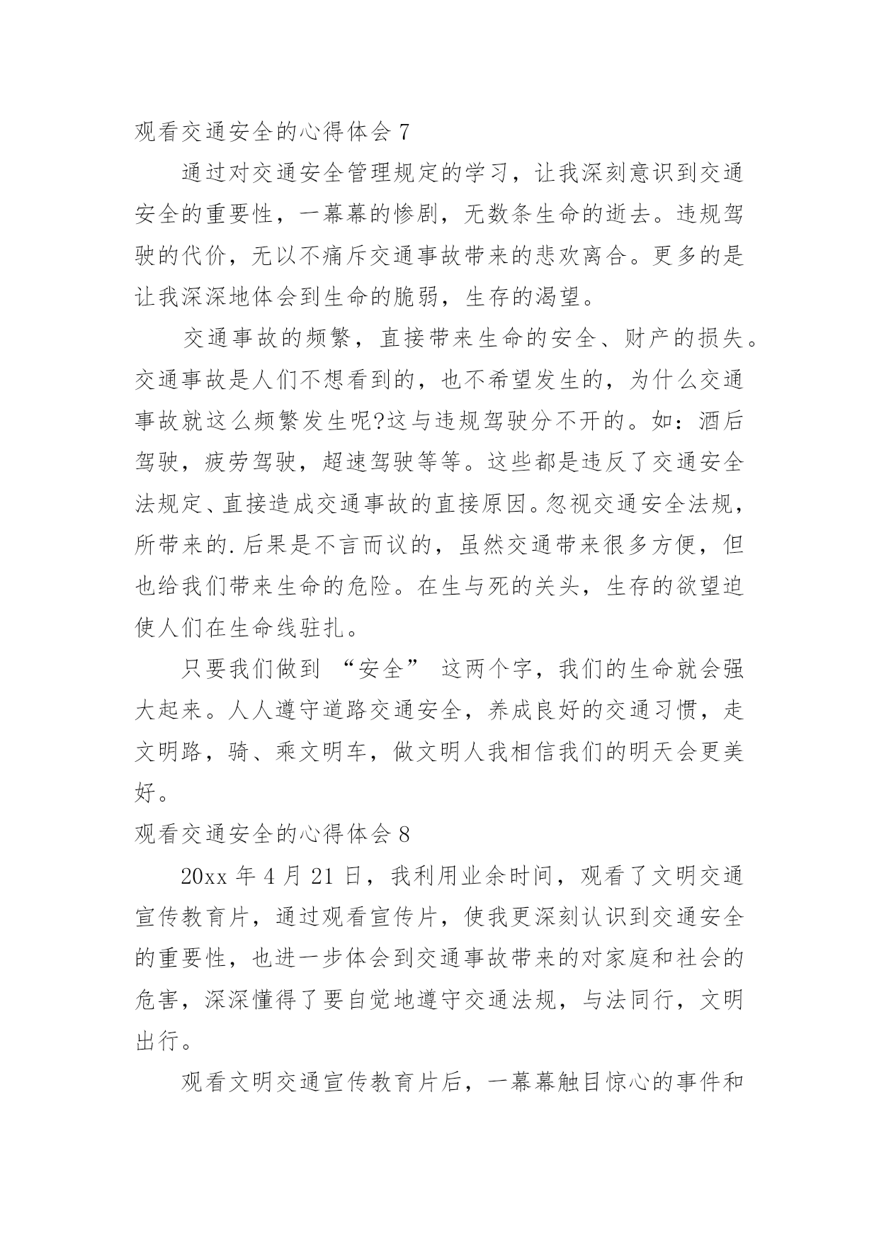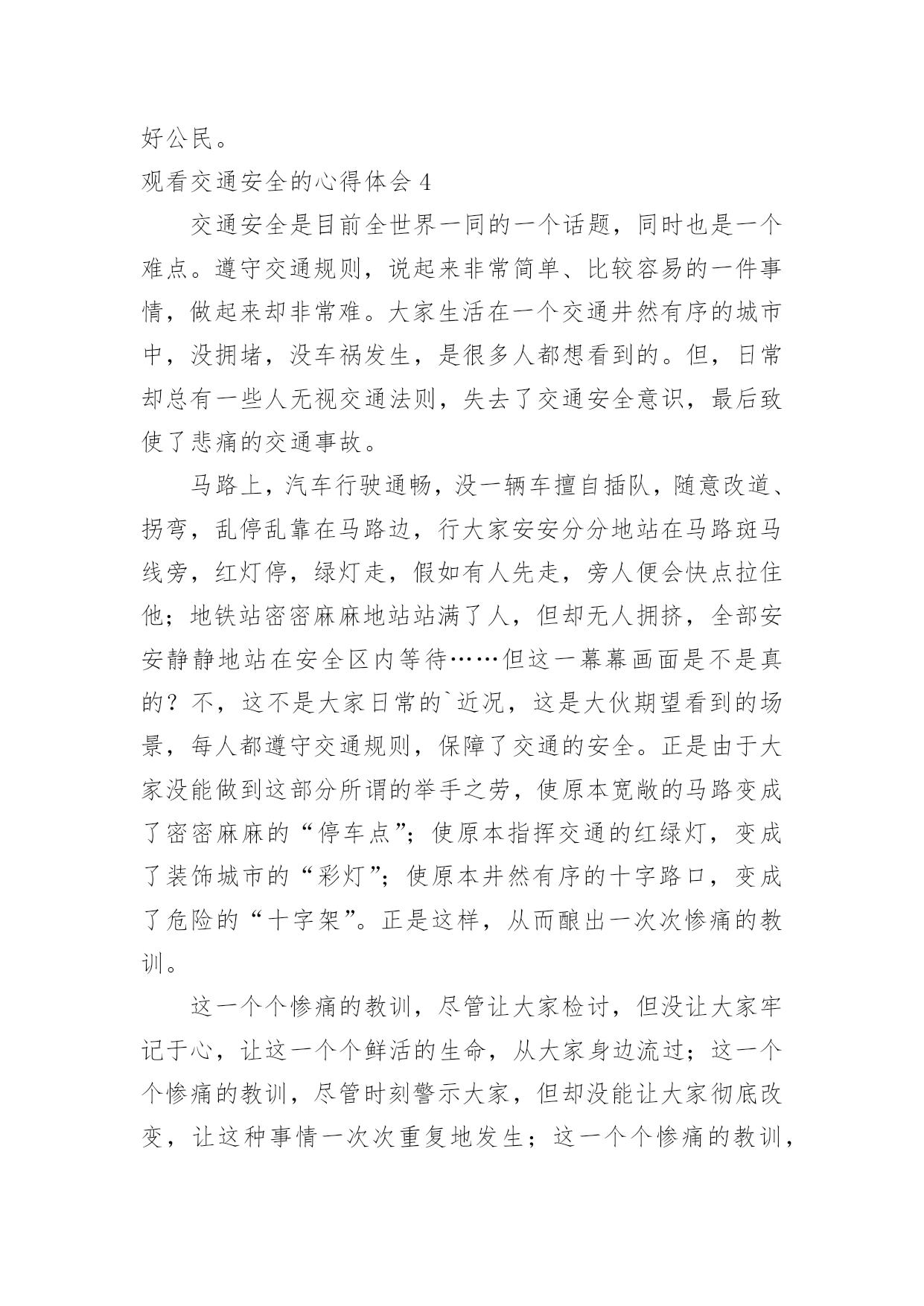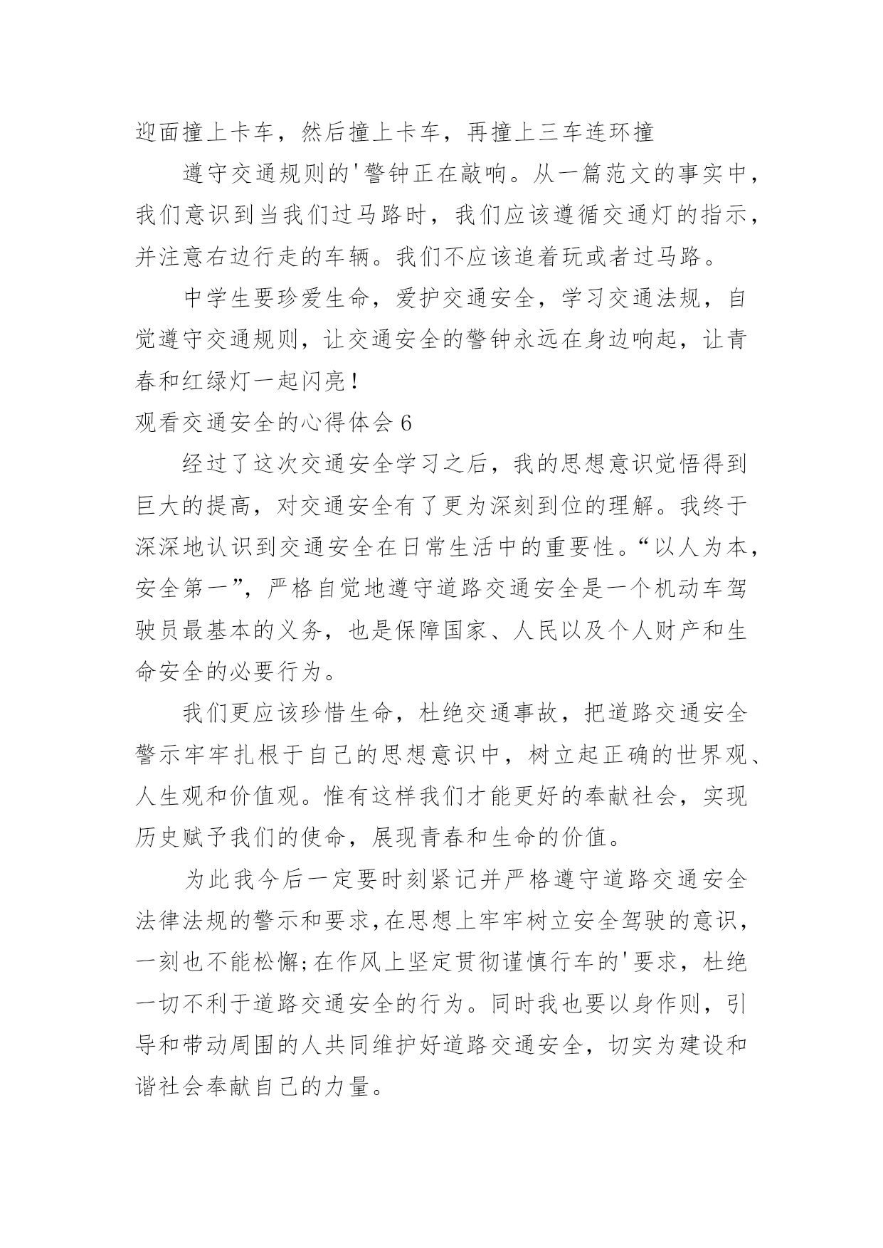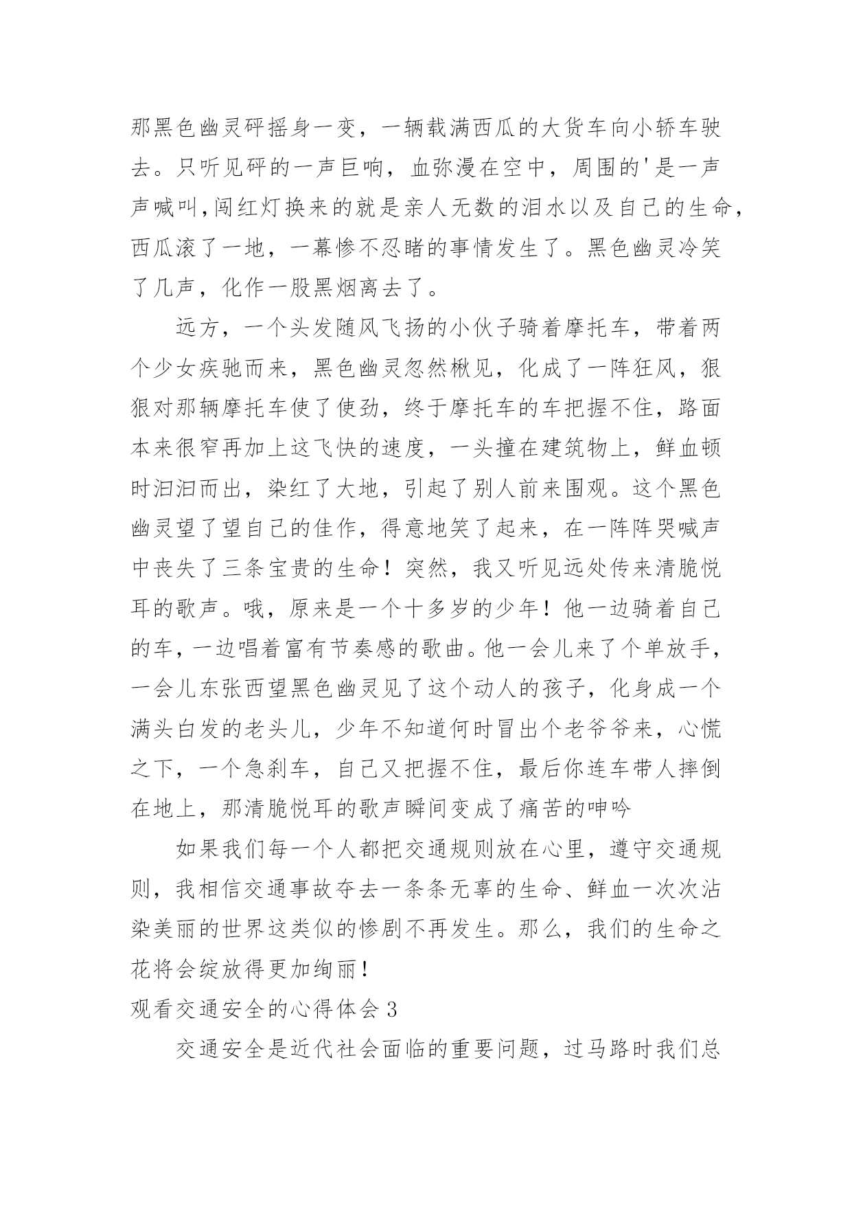 观看交通安全的心得体会观看交通安全的心得体会在平日里,心中难免会有一些新的想法,将其记录在心得体会里,让自己铭记于心,这样有利于培养我们思考的习惯。那么写心得体会要注意的内容有什么呢?下面是小编收集整理的观看交通安全的心得体会,欢迎阅读,希望大家能够喜欢。观看交通安全的心得体会1今天,是第_个全国中小学生安全教育日,今年安全教育日的主题是“强化安全意识,提升安全素养”。今天,也是我们学校开展安全教育的一个新的起点。我今天演讲的题目是《提高安全意识,预防意外伤害》同学们!开学一个多月来,我们学校开展了形式多样的安全教育:5次国旗下的安全演讲,三次主题班会,一次安全演练。我们深深地感受到了“安全为天,预防为主”的重要,我们牢固地树立了“珍爱生命,安全第一”的意识,我们渐渐感觉到了“强化安全管理,共建和谐校园”的迫切。同学们!当我们一直以为平安的校园环境中没有必要谈安全,当我们一直把安全教育作为一场游戏,当我们对提高安全意识嗤之以鼻时,我们是否意识到我们的周围仍然存在着让我们不远看到的很多隐患呢?我们依然看到有的同学不到灶房打饭,却整天购买着小食、零食、三无食品,在花着家长辛勤工作的血汗钱,在培养着自己奢侈浪费的不良习惯,在损害着自己的健康地同时,也在威胁着自己的.生命安全。我们依然看到有的同学没有良好的卫生习惯,不仅不注重自身的卫生,而且不讲究公共卫生,在学校开展的宿舍楼卫生综合治理中,依然是不叠被子,不扫地,不倒垃圾,依然是宿舍脏水满地,卫生区废纸乱扔。在春季传染病流行的季节,在无声的传染着同学,埋下了疾病流传的隐患。我们依然看到有的同学在宿舍里,在楼道里抽烟,在教室里乱拉电线,乱充电,甚至有的同学放假还到野外点火抽烟,在全国上下把预防森林火灾作为一项重中之重的工作,把野外点火造成重大损失的列为刑事案件的时候,还在不以为然、麻木不仁。我们依然看到有的同学放假还要到河道、水库去钓鱼、游泳,在给自己的生命健康悄悄的埋下了隐患。同学们!从平遥的学生溺水事件到云南的学生食物中毒事件,一件件血的事实告诉我们安全是一个不容回避、不容忽视、不容远离的话题,一个个鲜活的生命提醒我们生命需要每一时、每一刻的万分珍重、认真呵护,一个个触目惊心的案例教育我们必须提高安全意识,必须加强自我保护,必须增强自我保护能力。同学们!在安全面前我们还有什么推脱与拒绝呢,在生命面前我们还有什么不能做到呢?假如我们不能保持一个优美的卫生环境,一个良好的饮食习惯,一个拒绝抽烟、拒绝玩火的行为,一个不到水库、沟渠玩水的意识,我们还谈什么伟大的理想与高尚的信念呢?我们还怎么为母校留下美好的记忆,为父母洒下希望的种子,为自己撑起一片安全的蓝天呢?同学们!让我们携起手来为创造一个平安、美丽、文明的昔阳职中而共同努力吧!观看交通安全的心得体会2生命,它如鲜花般绚丽。生命之花是刚强的,因为它能克服任何困难;它又是一棵弱不禁风的小草那么脆弱,稍不注意就会从你手中溜走,只有安全才是最重要的,它能照亮我们的人生,让生命之花永远绽放。它仿佛又是一条纽带,联系着我们的生死。而有人一失足成千古恨,不注意安全夺去了宝贵的生命!遵守交通安全是文明出行的表现,唯有遵守才能使生命绽放光彩。反过来,要是不遵守,它就会是一个黑色幽灵,黑色幽灵会千方百计想办法将你的生命视为己有,让你得到血的教训,提醒别人。每当我听见那刺耳尖锐的刹车声,看见那鲜红恐怖的血液,我不禁打了个寒颤,脑子总是回想起这几个案例,这些案例是这样的:午后,在三叉路口,一辆红色轿车疯狂地在高速公路上飞驰着,一个挺帅的年轻人倾斜着身子坐在驾驶室内,一手把着方向盘,一手拿着手机,似乎在津津有味的谈些什麽。红灯亮了,小轿车一如既往地向前奔着。刹那间,那黑色幽灵砰摇身一变,一辆载满西瓜的大货车向小轿车驶去。只听见砰的一声巨响,血弥漫在空中,周围的'是一声声喊叫,闯红灯换来的就是亲人无数的泪水以及自己的生命,西瓜滚了一地,一幕惨不忍睹的事情发生了。黑色幽灵冷笑了几声,化作一股黑烟离去了。远方,一个头发随风飞扬的小伙子骑着摩托车,带着两个少女疾驰而来,黑色幽灵忽然楸见,化成了一阵狂风,狠狠对那辆摩托车使了使劲,终于摩托车的车把握不住,路面本来很窄再加上这飞快的速度,一头撞在建筑物上,鲜血顿时汩汩而出,染红了大地,引起了别人前来围观。这个黑色幽灵望了望自己的佳作,得意地笑了起来,在一阵阵哭喊声中丧失了三条宝贵的生命!突然,我又听见远处传来清脆悦耳的歌声。哦,原来是一个十多岁的少年!他一边骑着自己的车,一边唱着富有节奏感的歌曲。他一会儿来了个单放手,一会儿东张西望黑色幽灵见了这个动人的孩子,化身成一个满头白发的老头儿,少年不知道何时冒出个老爷爷来,心慌之下,一个急刹车,自己又把握不住,最后你连车带人摔倒在地上,那清脆悦耳的歌声瞬间变成了痛苦的呻吟如果