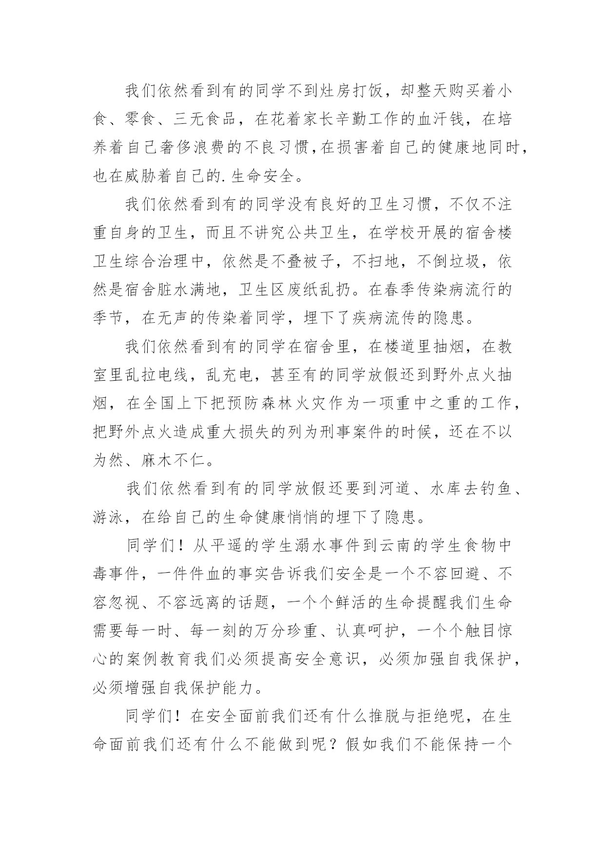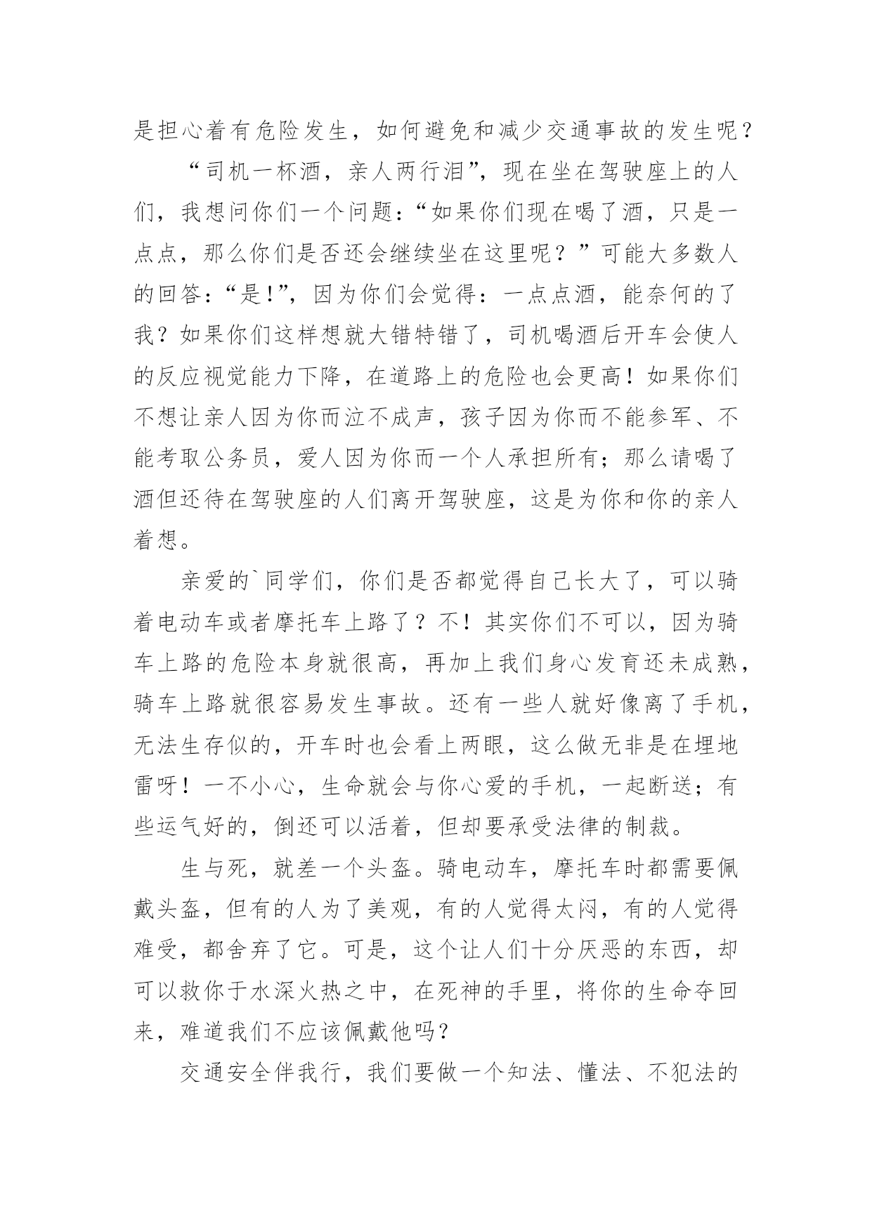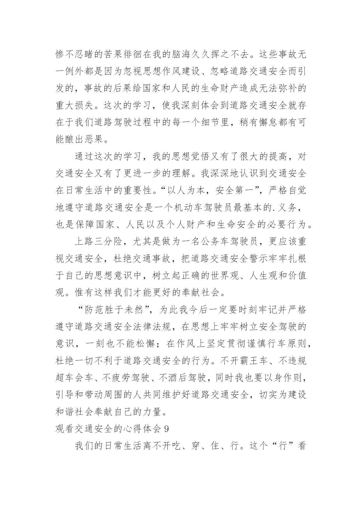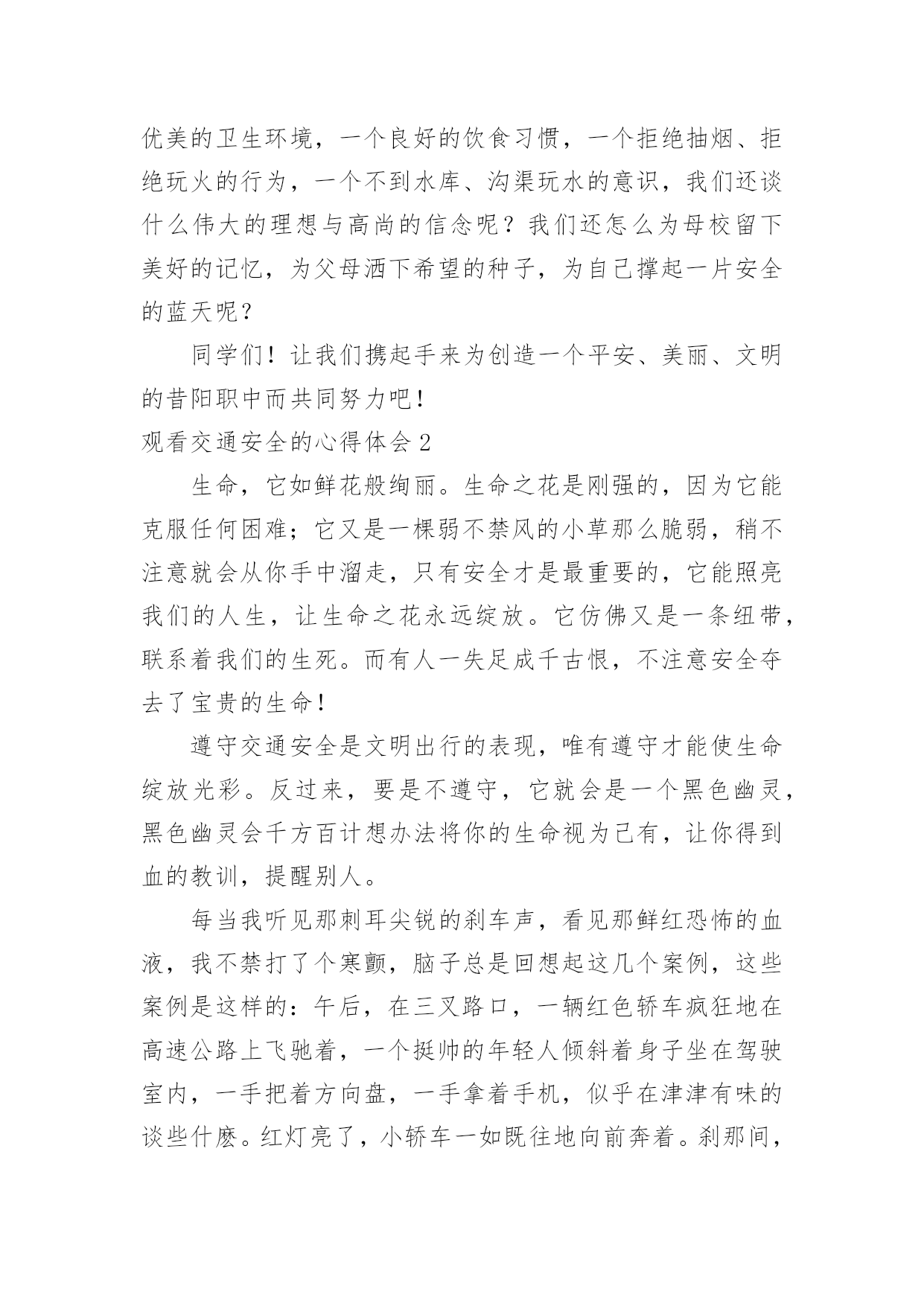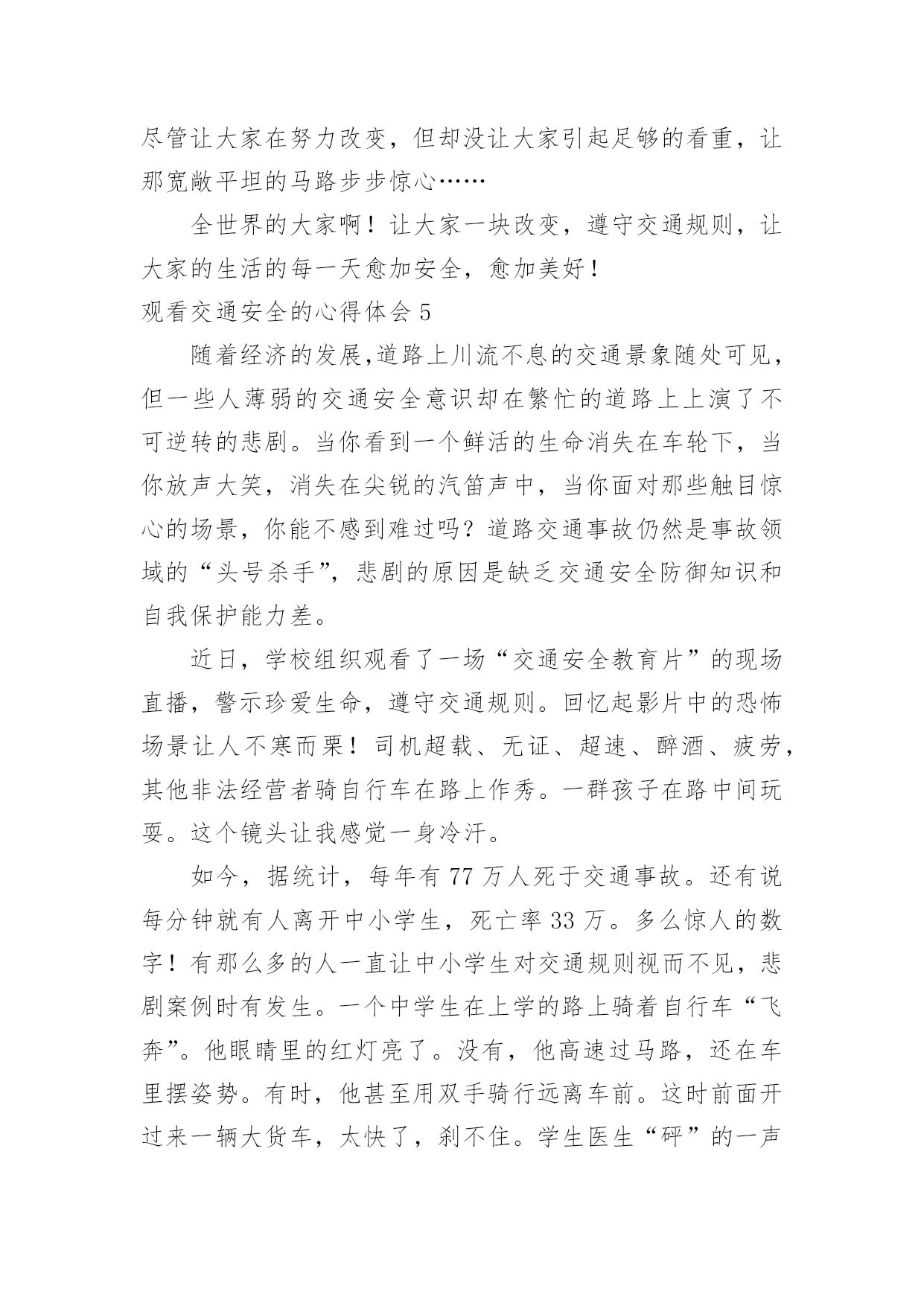 观看交通安全的心得体会观看交通安全的心得体会在平日里,心中难免会有一些新的想法,将其记录在心得体会里,让自己铭记于心,这样有利于培养我们思考的习惯。那么写心得体会要注意的内容有什么呢?下面是小编收集整理的观看交通安全的心得体会,欢迎阅读,希望大家能够喜欢。观看交通安全的心得体会1今天,是第_个全国中小学生安全教育日,今年安全教育日的主题是“强化安全意识,提升安全素养”。今天,也是我们学校开展安全教育的一个新的起点。我今天演讲的题目是《提高安全意识,预防意外伤害》同学们!开学一个多月来,我们学校开展了形式多样的安全教育:5次国旗下的安全演讲,三次主题班会,一次安全演练。我们深深地感受到了“安全为天,预防为主”的重要,我们牢固地树立了“珍爱生命,安全第一”的意识,我们渐渐感觉到了“强化安全管理,共建和谐校园”的迫切。同学们!当我们一直以为平安的校园环境中没有必要谈安全,当我们一直把安全教育作为一场游戏,当我们对提高安全意识嗤之以鼻时,我们是否意识到我们的周围仍然存在着让我们不远看到的很多隐患呢?我们依然看到有的同学不到灶房打饭,却整天购买着小食、零食、三无食品,在花着家长辛勤工作的血汗钱,在培养着自己奢侈浪费的不良习惯,在损害着自己的健康地同时,也在威胁着自己的.生命安全。我们依然看到有的同学没有良好的卫生习惯,不仅不注重自身的卫生,而且不讲究公共卫生,在学校开展的宿舍楼卫生综合治理中,依然是不叠被子,不扫地,不倒垃圾,依然是宿舍脏水满地,卫生区废纸乱扔。在春季传染病流行的季节,在无声的传染着同学,埋下了疾病流传的隐患。我们依然看到有的同学在宿舍里,在楼道里抽烟,在教室里乱拉电线,乱充电,甚至有的同学放假还到野外点火抽烟,在全国上下把预防森林火灾作为一项重中之重的工作,把野外点火造成重大损失的列为刑事案件的时候,还在不以为然、麻木不仁。我们依然看到有的同学放假还要到河道、水库去钓鱼、游泳,在给自己的生命健康悄悄的埋下了隐患。同学们!从平遥的学生溺水事件到云南的学生食物中毒事件,一件件血的事实告诉我们安全是一个不容回避、不容忽视、不容远离的话题,一个个鲜活的生命提醒我们生命需要每一时、每一刻的万分珍重、认真呵护,一个个触目惊心的案例教育我们必须提高安全意识,必须加强自我保护,必须增强自我保护能力。同学们!在安全面前我们还有什么推脱与拒绝呢,在生命面前我们还有什么不能做到呢?假如我们不能保持一个优美的卫生环境,一个良好的饮食习惯,一个拒绝抽烟、拒绝玩火的行为,一个不到水库、沟渠玩水的意识,我们还谈什么伟大的理想与高尚的信念呢?我们还怎么为母校留下美好的记忆,为父母洒下希望的种子,为自己撑起一片安全的蓝天呢?同学们!让我们携起手来为创造一个平安、美丽、文明的昔阳职中而共同努力吧!观看交通安全的心得体会2生命,它如鲜花般绚丽。生命之花是刚强的,因为它能克服任何困难;它又是一棵弱不禁风的小草那么脆弱,稍不注意就会从你手中溜走,只有安全才是最重要的,它能照亮我们的人生,让生命之花永远绽放。它仿佛又是一条纽带,联系着我们的生死。而有人一失足成千古恨,不注意安全夺去了宝贵的生命!遵守交通安全是文明出行的表现,唯有遵守才能使生命绽放光彩。反过来,要是不遵守,它就会是一个黑色幽灵,黑色幽灵会千方百计想办法将你的生命视为己有,让你得到血的教训,提醒别人。每当我听见那刺耳尖锐的刹车声,看见那鲜红恐怖的血液,我不禁打了个寒颤,脑子总是回想起这几个案例,这些案例是这样的:午后,在三叉路口,一辆红色轿车疯狂地在高速公路上飞驰着,一个挺帅的年轻人倾斜着身子坐在驾驶室内,一手把着方向盘,一手拿着手机,似乎在津津有味的谈些什麽。红灯亮了,小轿车一如既往地向前奔着。刹那间,那黑色幽灵砰摇身一变,一辆载满西瓜的大货车向小轿车驶去。只听见砰的一声巨响,血弥漫在空中,周围的'是一声声喊叫,闯红灯换来的就是亲人无数的泪水以及自己的生命,西瓜滚了一地,一幕惨不忍睹的事情发生了。黑色幽灵冷笑了几声,化作一股黑烟离去了。远方,一个头发随风飞扬的小伙子骑着摩托车,带着两个少女疾驰而来,黑色幽灵忽然楸见,化成了一阵狂风,狠狠对那辆摩托车使了使劲,终于摩托车的车把握不住,路面本来很窄再加上这飞快的速度,一头撞在建筑物上,鲜血顿时汩汩而出,染红了大地,引起了别人前来围观。这个黑色幽灵望了望自己的佳作,得意地笑了起来,在一阵阵哭喊声中丧失了三条宝贵的生命!突然,我又听见远处传来清脆悦耳的歌声。哦,原来是一个十多岁的少年!他一边骑着自己的车,一边唱着富有节奏感的歌曲。他一会儿来了个单放手,一会儿东张西望黑色幽灵见了这个动人的孩子,化身成一个满头白发的老头儿,少年不知道何时冒出个老爷爷来,心慌之下,一个急刹车,自己又把握不住,最后你连车带人摔倒在地上,那清脆悦耳的歌声瞬间变成了痛苦的呻吟如果