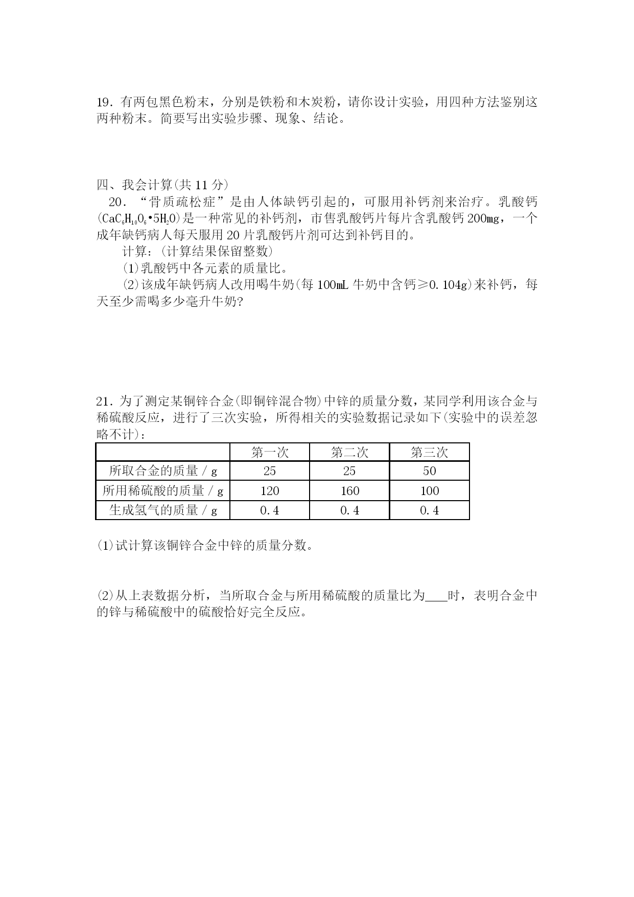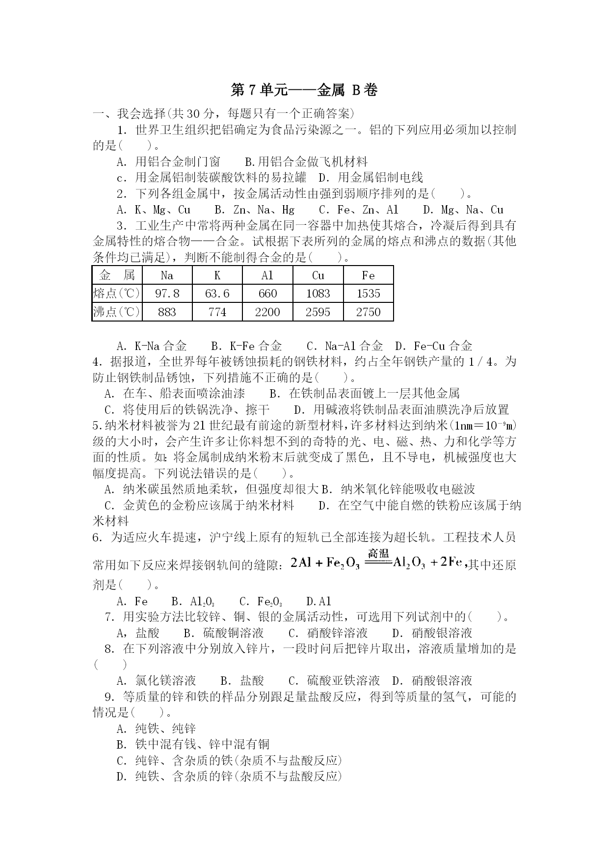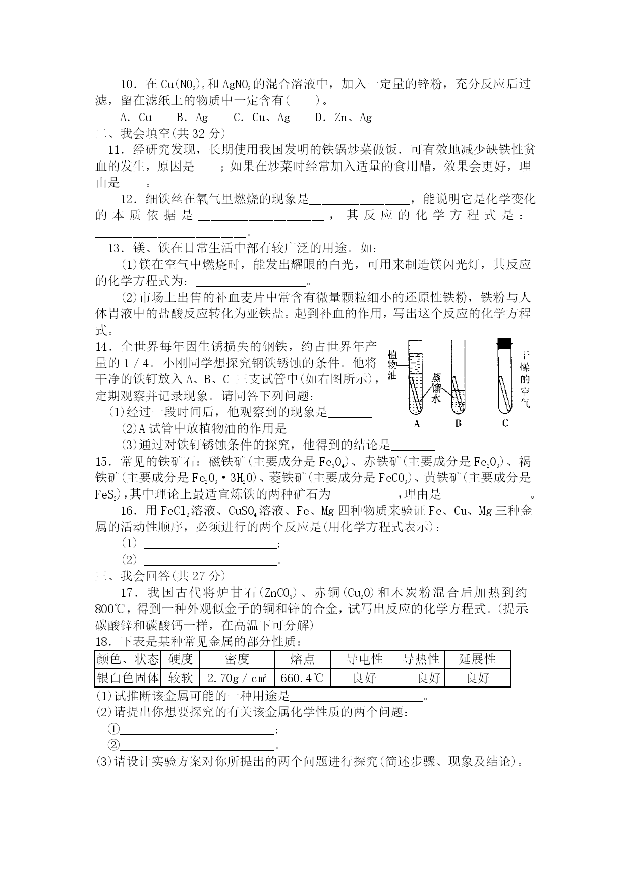 第7单元——金属B卷一、我会选择(共30分,每题只有一个正确答案)1.世界卫生组织把铝确定为食品污染源之一。铝的下列应用必须加以控制的是()。A.用铝合金制门窗B.用铝合金做飞机材料c.用金属铝制装碳酸饮料的易拉罐D.用金属铝制电线2.下列各组金属中,按金属活动性由强到弱顺序排列的是()。A.K、Mg、CuB.Zn、Na、HgC.Fe、Zn、AlD.Mg、Na、Cu3.工业生产中常将两种金属在同一容器中加热使其熔合,冷凝后得到具有金属特性的熔合物——合金。试根据下表所列的金属的熔点和沸点的数据(其他条件均已满足),判断不能制得合金的是()。金属NaKAlCuFe熔点(℃)97.863.666010831535沸点(℃)883774220025952750A.K-Na合金B.K-Fe合金C.Na-Al合金D.Fe-Cu合金4.据报道,全世界每年被锈蚀损耗的钢铁材料,约占全年钢铁产量的1/4。为防止钢铁制品锈蚀,下列措施不正确的是()。A.在车、船表面喷涂油漆B.在铁制品表面镀上一层其他金属C.将使用后的铁锅洗净、擦干D.用碱液将铁制品表面油膜洗净后放置5.纳米材料被誉为2l世纪最有前途的新型材料,许多材料达到纳米(1nm=10-9m)级的大小时,会产生许多让你料想不到的奇特的光、电、磁、热、力和化学等方面的性质。如:将金属制成纳米粉末后就变成了黑色,且不导电,机械强度也大幅度提高。下列说法错误的是()。A.纳米碳虽然质地柔软,但强度却很大B.纳米氧化锌能吸收电磁波C.金黄色的金粉应该属于纳米材料D.在空气中能自燃的铁粉应该属于纳米材料6.为适应火车提速,沪宁线上原有的短轨已全部连接为超长轨。工程技术人员常用如下反应来焊接钢轨间的缝隙:其中还原剂是()。A.FeB.Al203C.Fe203D.Al7.用实验方法比较锌、铜、银的金属活动性,可选用下列试剂中的()。A,盐酸B.硫酸铜溶液C.硝酸锌溶液D.硝酸银溶液8.在下列溶液中分别放入锌片,一段时问后把锌片取出,溶液质量增加的是()A.氯化镁溶液B.盐酸C.硫酸亚铁溶液D.硝酸银溶液9.等质量的锌和铁的样品分别跟足量盐酸反应,得到等质量的氢气,可能的情况是()。A.纯铁、纯锌B.铁中混有钱、锌中混有铜C.纯锌、含杂质的铁(杂质不与盐酸反应)D.纯铁、含杂质的锌(杂质不与盐酸反应)10.在Cu(NO3)2和AgNO3的混合溶液中,加入一定量的锌粉,充分反应后过滤,留在滤纸上的物质中一定含有()。A.CuB.AgC.Cu、AgD.Zn、Ag二、我会填空(共32分)11.经研究发现,长期使用我国发明的铁锅炒菜做饭.可有效地减少缺铁性贫血的发生,原因是____;如果在炒菜时经常加入适量的食用醋,效果会更好,理由是____。12.细铁丝在氧气里燃烧的现象是________________,能说明它是化学变化的本质依据是____________________,其反应的化学方程式是:________________________。13.镁、铁在日常生活中部有较广泛的用途。如:(1)镁在空气中燃烧时,能发出耀眼的白光,可用来制造镁闪光灯,其反应的化学方程式为:____________________。(2)市场上出售的补血麦片中常含有微量颗粒细小的还原性铁粉,铁粉与人体胃液中的盐酸反应转化为亚铁盐。起到补血的作用,写出这个反应的化学方程式。________________________14.全世界每年因生锈损失的钢铁,约占世界年产量的1/4。小刚同学想探究钢铁锈蚀的条件。他将干净的铁钉放入A、B、C三支试管中(如右图所示),定期观察并记录现象。请同答下列问题:(1)经过一段时间后,他观察到的现象是________(2)A试管中放植物油的作用是________(3)通过对铁钉锈蚀条件的探究,他得到的结论是________15.常见的铁矿石:磁铁矿(主要成分是Fe304)、赤铁矿(主要成分是Fe203)、褐铁矿(主要成分是Fe203·3H2O)、菱铁矿(主要成分是FeCO3)、黄铁矿(主要成分是FeS2),其中理论上最适宜炼铁的两种矿石为____________,理由是________________。16.用FeCl2溶液、CuS04溶液、Fe、Mg四种物质来验证Fe、Cu、Mg三种金属的活动性顺序,必须进行的两个反应是(用化学方程式表示):(1)________________________;(2)________________________。三、我会回答(共27分)17.我国古代将炉甘石(ZnC03)、赤铜(Cu20)和木炭粉混合后加热到约800℃,得到一种外观似金子的铜和锌的合金,试写出反应的化