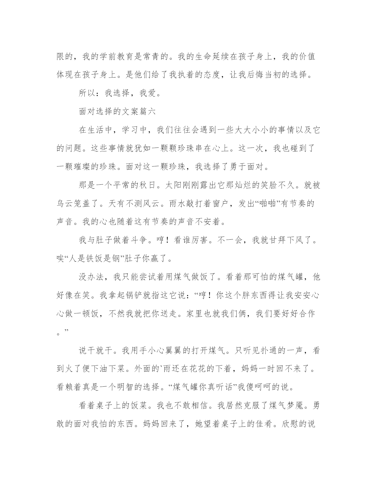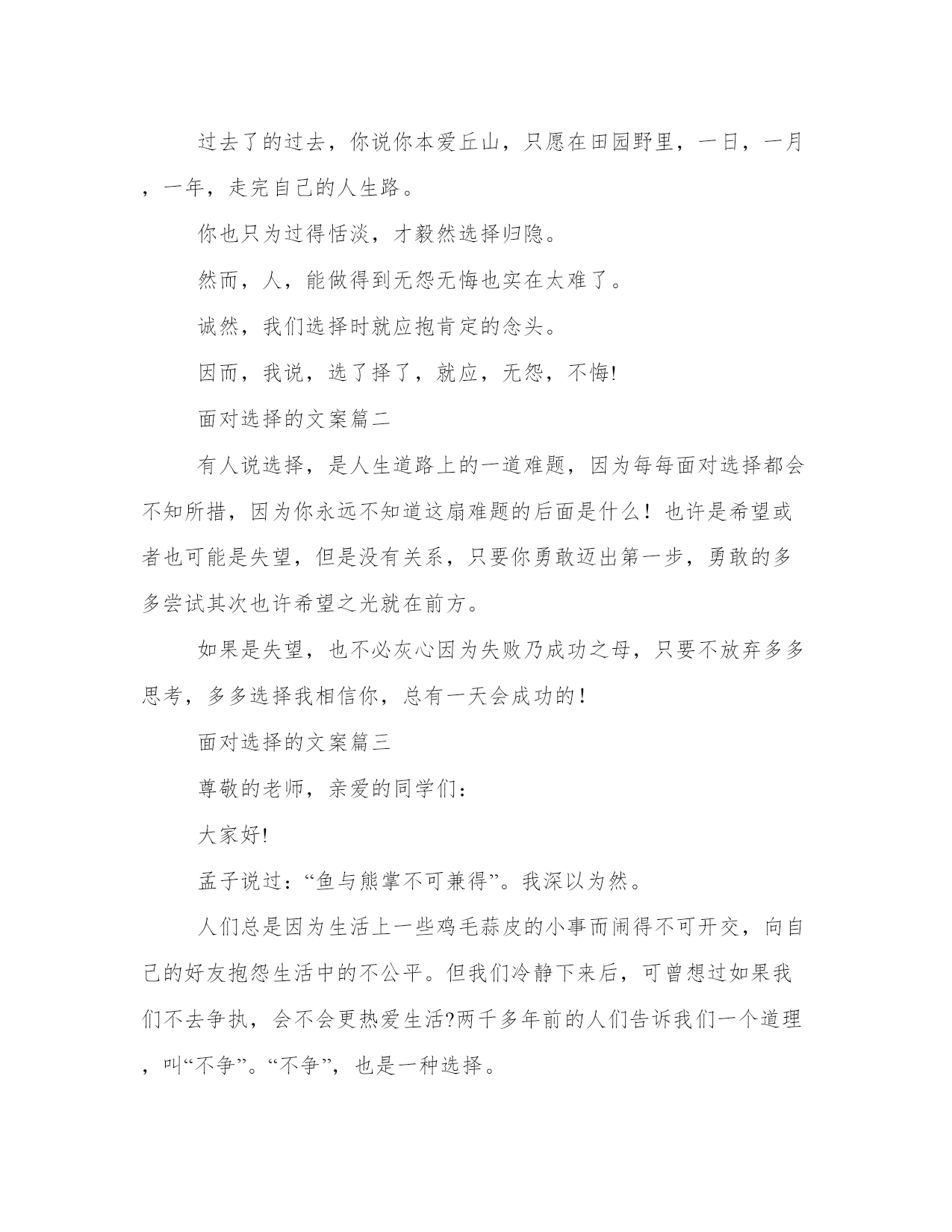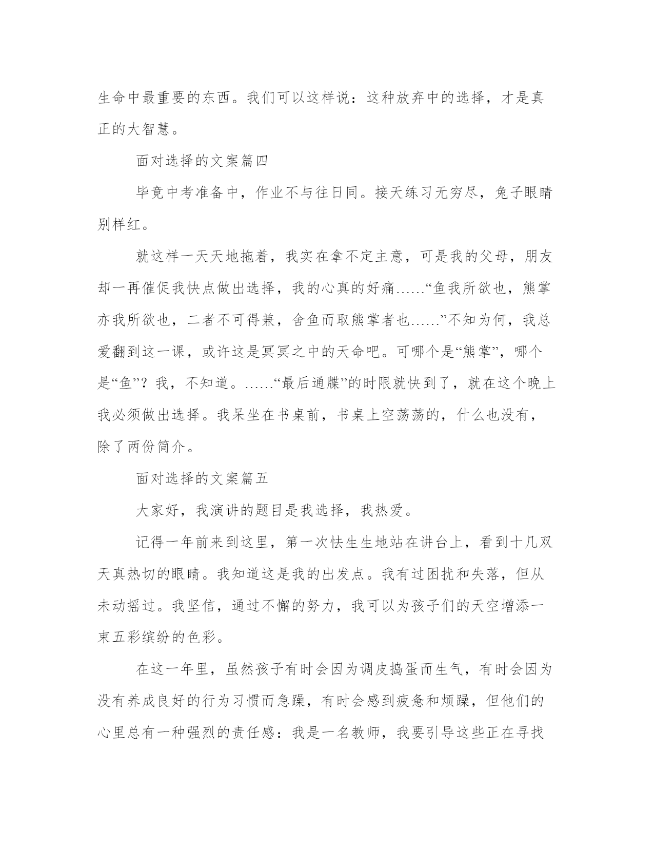 2023年面对选择的文案(精选17篇)在日常的学习、工作、生活中,肯定对各类范文都很熟悉吧。范文书写有哪些要求呢?我们怎样才能写好一篇范文呢?这里我整理了一些优秀的范文,希望对大家有所帮助,下面我们就来了解一下吧。面对选择的文案篇一人生面对着太多的选择,选择时却又犹豫不决。谁人如你--庄周,选择了淡泊,淡泊一切,与道合而为一。你甘于淡泊,乐于平淡,自得于平淡,只愿在梦中化蝶而逍遥,只愿随那盘旋而上的鹏者浮游于田地。世人笑你疯癫,而你淡漠的眼神却摄人无语,世人安能知你当初的选择是疯是癫?谁人如你--苏武,选择了孤独,却始终无怨无悔。你甘于孤独,乐于孤独,自得于孤独,只愿为朝廷抛头颅,洒热血,只愿为国家挨刀斧、下汤锅。岁月悠悠,不知历尽多少冷暖;悠悠岁月,不知熬尽多少孤独。孤独选择的你,选择孤独的你,当然,无怨无悔。谁人又如你--陶潜,选择了归隐,回归自然。你甘于归隐,乐于归隐,自得于归隐,只愿与世无争,过得恬淡。过去了的过去,你说你本爱丘山,只愿在田园野里,一日,一月,一年,走完自己的人生路。你也只为过得恬淡,才毅然选择归隐。然而,人,能做得到无怨无悔也实在太难了。诚然,我们选择时就应抱肯定的念头。因而,我说,选了择了,就应,无怨,不悔!面对选择的文案篇二有人说选择,是人生道路上的一道难题,因为每每面对选择都会不知所措,因为你永远不知道这扇难题的后面是什么!也许是希望或者也可能是失望,但是没有关系,只要你勇敢迈出第一步,勇敢的多多尝试其次也许希望之光就在前方。如果是失望,也不必灰心因为失败乃成功之母,只要不放弃多多思考,多多选择我相信你,总有一天会成功的!面对选择的文案篇三尊敬的老师,亲爱的同学们:大家好!孟子说过:“鱼与熊掌不可兼得”。我深以为然。人们总是因为生活上一些鸡毛蒜皮的小事而闹得不可开交,向自己的好友抱怨生活中的不公平。但我们冷静下来后,可曾想过如果我们不去争执,会不会更热爱生活?两千多年前的人们告诉我们一个道理,叫“不争”。“不争”,也是一种选择。人们不能只追求眼前的名利,而要关注自身的修养。富贵繁华只是过往烟云,高贵的精神却能闪烁永恒。诗仙李白曾在朝做官,却看不惯官官相护、尔虞我诈的现状,遂隐身山林,遍游名山大川,写出千古名句:“安能摧眉折腰事权贵,是我不得开心颜!”这是一种选择的快乐。司马迁的史记被文豪鲁迅赞为“千古之绝唱,无韵之离骚”,可谁曾想过,他曾经是多么痛苦。他因上书直言而惨遭宫刑,这在普通人眼里是奇耻大辱,可父亲的遗愿让他生的希望压过一切耻辱和伤痛,在大家充满歧视的眼光中顽强地活了下去,终成一家之言,洋洋洒洒数十万字,为后人考证留下珍贵的财富。这是一种选择的境界。无数夏明瀚式的革命先烈,面对敌人的威逼利诱而坚贞不屈,高唱“砍头不要紧,只要主义真。杀了夏明瀚,还有后来人”英勇就义。这是一种选择的信念。战斗英雄董存瑞、黄继光,为了保护更多战友,为了夺取战斗的胜利,他们毫不犹豫地舍身炸碉堡、堵枪眼。这是一种选择的忠诚。在救灾抢险和见义勇为中,许多勇士为了保护人民群众的生命安全,“明知山有虎,偏向虎山行”。这是一种选择的胆识。选择并不意味着放弃,它只是“获得”的另一种诠释。我们在选择时放弃了,也是为了选择更重要的东西。在奋斗和绝望之间,在正义和邪恶之间,在道德和金钱之间,我们无疑要选择前者,它才是我们生命中最重要的东西。我们可以这样说:这种放弃中的选择,才是真正的大智慧。面对选择的文案篇四毕竟中考准备中,作业不与往日同。接天练习无穷尽,兔子眼睛别样红。就这样一天天地拖着,我实在拿不定主意,可是我的父母,朋友却一再催促我快点做出选择,我的心真的好痛……“鱼我所欲也,熊掌亦我所欲也,二者不可得兼,舍鱼而取熊掌者也……”不知为何,我总爱翻到这一课,或许这是冥冥之中的天命吧。可哪个是“熊掌”,哪个是“鱼”?我,不知道。……“最后通牒”的时限就快到了,就在这个晚上我必须做出选择。我呆坐在书桌前,书桌上空荡荡的,什么也没有,除了两份简介。面对选择的文案篇五大家好,我演讲的题目是我选择,我热爱。记得一年前来到这里,第一次怯生生地站在讲台上,看到十几双天真热切的眼睛。我知道这是我的出发点。我有过困扰和失落,但从未动摇过。我坚信,通过不懈的努力,我可以为孩子们的天空增添一束五彩缤纷的色彩。在这一年里,虽然孩子有时会因为调皮捣蛋而生气,有时会因为没有养成良好的行为习惯而急躁,有时会感到疲惫和烦躁,但他们的心里总有一种强烈的责任感:我是一名教师,我要引导这些正在寻找梦想的孩子,在他们的心里写下一部最美丽的书。与孩子朝夕相处,我总会想到两个字,那就是“如果我是个孩子。如果是我的孩子,这种情绪让我对孩子少了抱怨,多了宽容;要求少,理解多;少一份指责,多一份尊