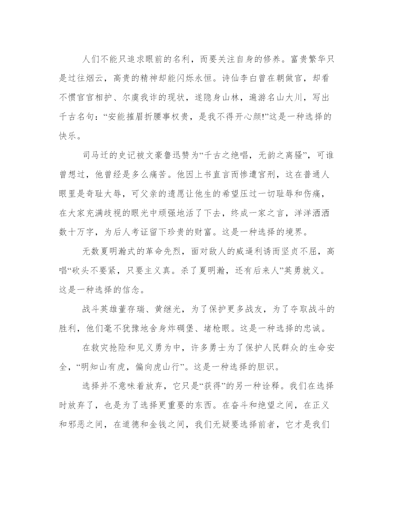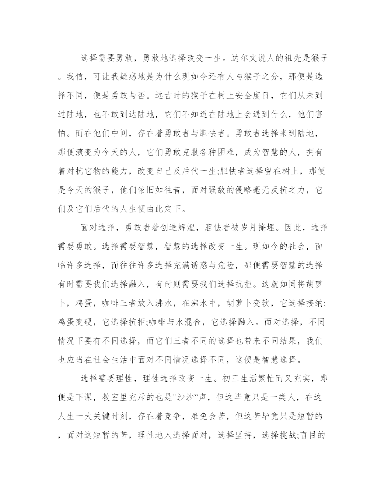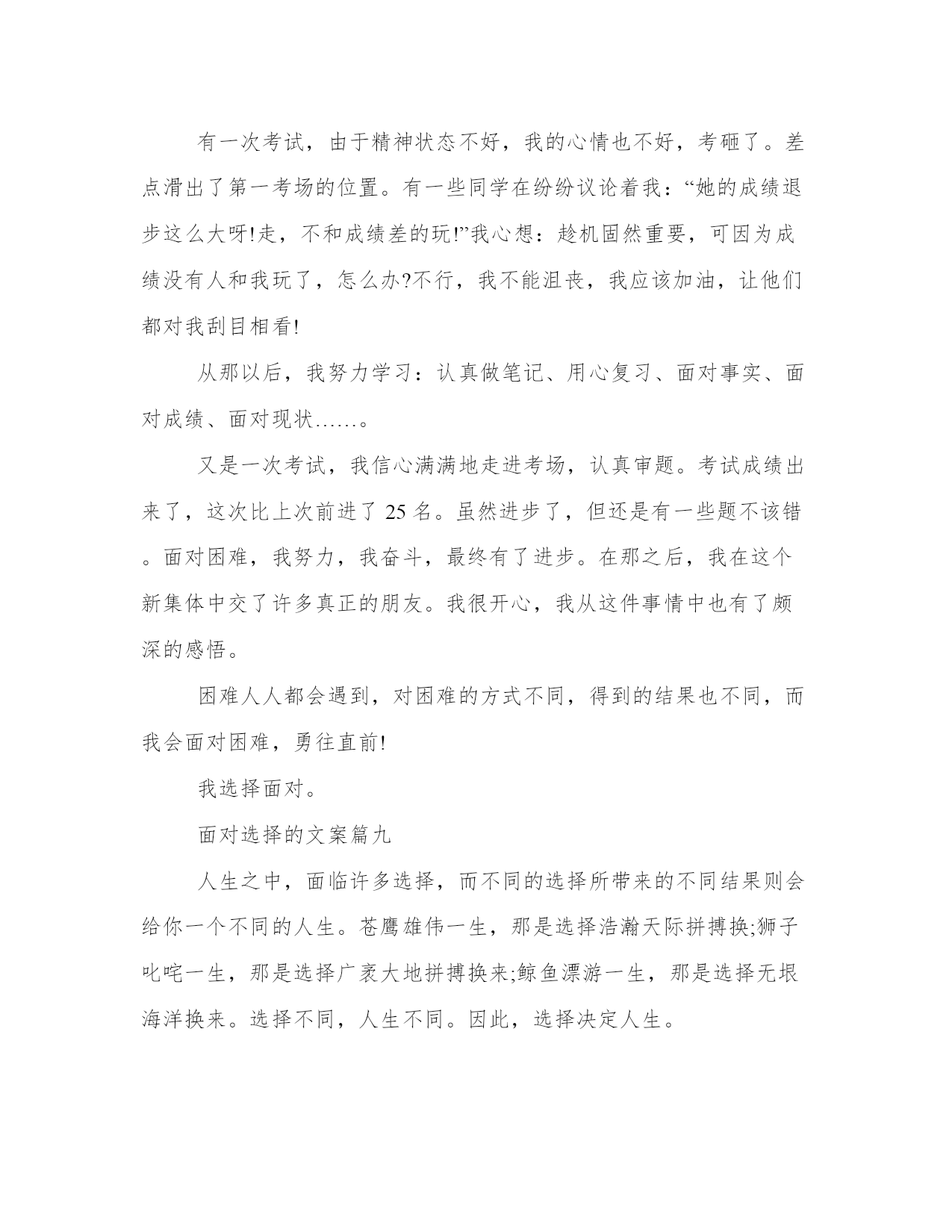 2023年面对选择的文案(精选17篇)在日常的学习、工作、生活中,肯定对各类范文都很熟悉吧。范文书写有哪些要求呢?我们怎样才能写好一篇范文呢?这里我整理了一些优秀的范文,希望对大家有所帮助,下面我们就来了解一下吧。面对选择的文案篇一人生面对着太多的选择,选择时却又犹豫不决。谁人如你--庄周,选择了淡泊,淡泊一切,与道合而为一。你甘于淡泊,乐于平淡,自得于平淡,只愿在梦中化蝶而逍遥,只愿随那盘旋而上的鹏者浮游于田地。世人笑你疯癫,而你淡漠的眼神却摄人无语,世人安能知你当初的选择是疯是癫?谁人如你--苏武,选择了孤独,却始终无怨无悔。你甘于孤独,乐于孤独,自得于孤独,只愿为朝廷抛头颅,洒热血,只愿为国家挨刀斧、下汤锅。岁月悠悠,不知历尽多少冷暖;悠悠岁月,不知熬尽多少孤独。孤独选择的你,选择孤独的你,当然,无怨无悔。谁人又如你--陶潜,选择了归隐,回归自然。你甘于归隐,乐于归隐,自得于归隐,只愿与世无争,过得恬淡。过去了的过去,你说你本爱丘山,只愿在田园野里,一日,一月,一年,走完自己的人生路。你也只为过得恬淡,才毅然选择归隐。然而,人,能做得到无怨无悔也实在太难了。诚然,我们选择时就应抱肯定的念头。因而,我说,选了择了,就应,无怨,不悔!面对选择的文案篇二有人说选择,是人生道路上的一道难题,因为每每面对选择都会不知所措,因为你永远不知道这扇难题的后面是什么!也许是希望或者也可能是失望,但是没有关系,只要你勇敢迈出第一步,勇敢的多多尝试其次也许希望之光就在前方。如果是失望,也不必灰心因为失败乃成功之母,只要不放弃多多思考,多多选择我相信你,总有一天会成功的!面对选择的文案篇三尊敬的老师,亲爱的同学们:大家好!孟子说过:“鱼与熊掌不可兼得”。我深以为然。人们总是因为生活上一些鸡毛蒜皮的小事而闹得不可开交,向自己的好友抱怨生活中的不公平。但我们冷静下来后,可曾想过如果我们不去争执,会不会更热爱生活?两千多年前的人们告诉我们一个道理,叫“不争”。“不争”,也是一种选择。人们不能只追求眼前的名利,而要关注自身的修养。富贵繁华只是过往烟云,高贵的精神却能闪烁永恒。诗仙李白曾在朝做官,却看不惯官官相护、尔虞我诈的现状,遂隐身山林,遍游名山大川,写出千古名句:“安能摧眉折腰事权贵,是我不得开心颜!”这是一种选择的快乐。司马迁的史记被文豪鲁迅赞为“千古之绝唱,无韵之离骚”,可谁曾想过,他曾经是多么痛苦。他因上书直言而惨遭宫刑,这在普通人眼里是奇耻大辱,可父亲的遗愿让他生的希望压过一切耻辱和伤痛,在大家充满歧视的眼光中顽强地活了下去,终成一家之言,洋洋洒洒数十万字,为后人考证留下珍贵的财富。这是一种选择的境界。无数夏明瀚式的革命先烈,面对敌人的威逼利诱而坚贞不屈,高唱“砍头不要紧,只要主义真。杀了夏明瀚,还有后来人”英勇就义。这是一种选择的信念。战斗英雄董存瑞、黄继光,为了保护更多战友,为了夺取战斗的胜利,他们毫不犹豫地舍身炸碉堡、堵枪眼。这是一种选择的忠诚。在救灾抢险和见义勇为中,许多勇士为了保护人民群众的生命安全,“明知山有虎,偏向虎山行”。这是一种选择的胆识。选择并不意味着放弃,它只是“获得”的另一种诠释。我们在选择时放弃了,也是为了选择更重要的东西。在奋斗和绝望之间,在正义和邪恶之间,在道德和金钱之间,我们无疑要选择前者,它才是我们生命中最重要的东西。我们可以这样说:这种放弃中的选择,才是真正的大智慧。面对选择的文案篇四毕竟中考准备中,作业不与往日同。接天练习无穷尽,兔子眼睛别样红。就这样一天天地拖着,我实在拿不定主意,可是我的父母,朋友却一再催促我快点做出选择,我的心真的好痛……“鱼我所欲也,熊掌亦我所欲也,二者不可得兼,舍鱼而取熊掌者也……”不知为何,我总爱翻到这一课,或许这是冥冥之中的天命吧。可哪个是“熊掌”,哪个是“鱼”?我,不知道。……“最后通牒”的时限就快到了,就在这个晚上我必须做出选择。我呆坐在书桌前,书桌上空荡荡的,什么也没有,除了两份简介。面对选择的文案篇五大家好,我演讲的题目是我选择,我热爱。记得一年前来到这里,第一次怯生生地站在讲台上,看到十几双天真热切的眼睛。我知道这是我的出发点。我有过困扰和失落,但从未动摇过。我坚信,通过不懈的努力,我可以为孩子们的天空增添一束五彩缤纷的色彩。在这一年里,虽然孩子有时会因为调皮捣蛋而生气,有时会因为没有养成良好的行为习惯而急躁,有时会感到疲惫和烦躁,但他们的心里总有一种强烈的责任感:我是一名教师,我要引导这些正在寻找梦想的孩子,在他们的心里写下一部最美丽的书。与孩子朝夕相处,我总会想到两个字,那就是“如果我是个孩子。如果是我的孩子,这种情绪让我对孩子少了抱怨,多了宽容;要求少,理解多;少一份指责,多一份尊