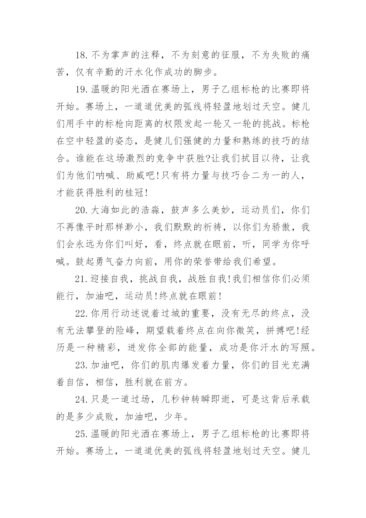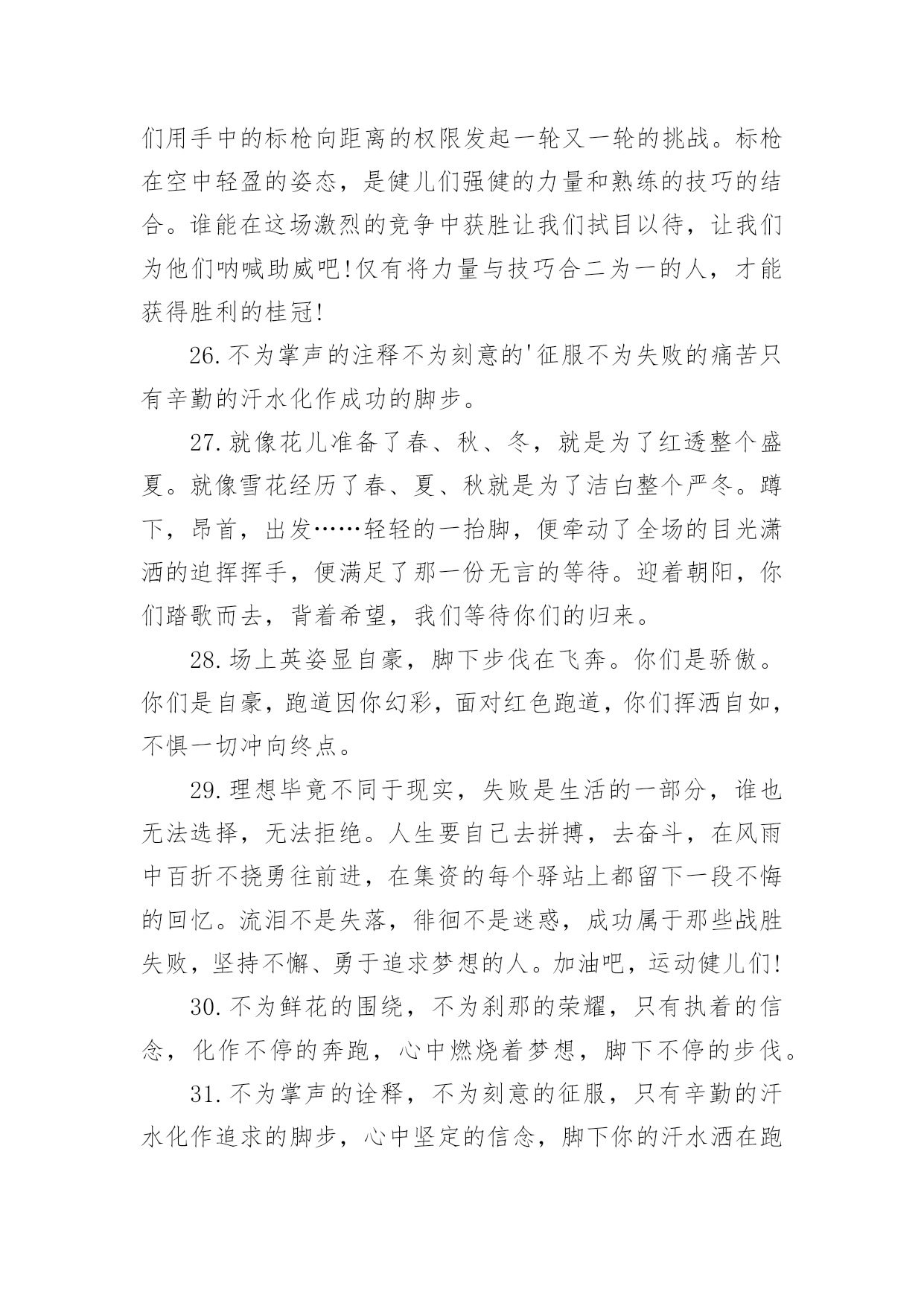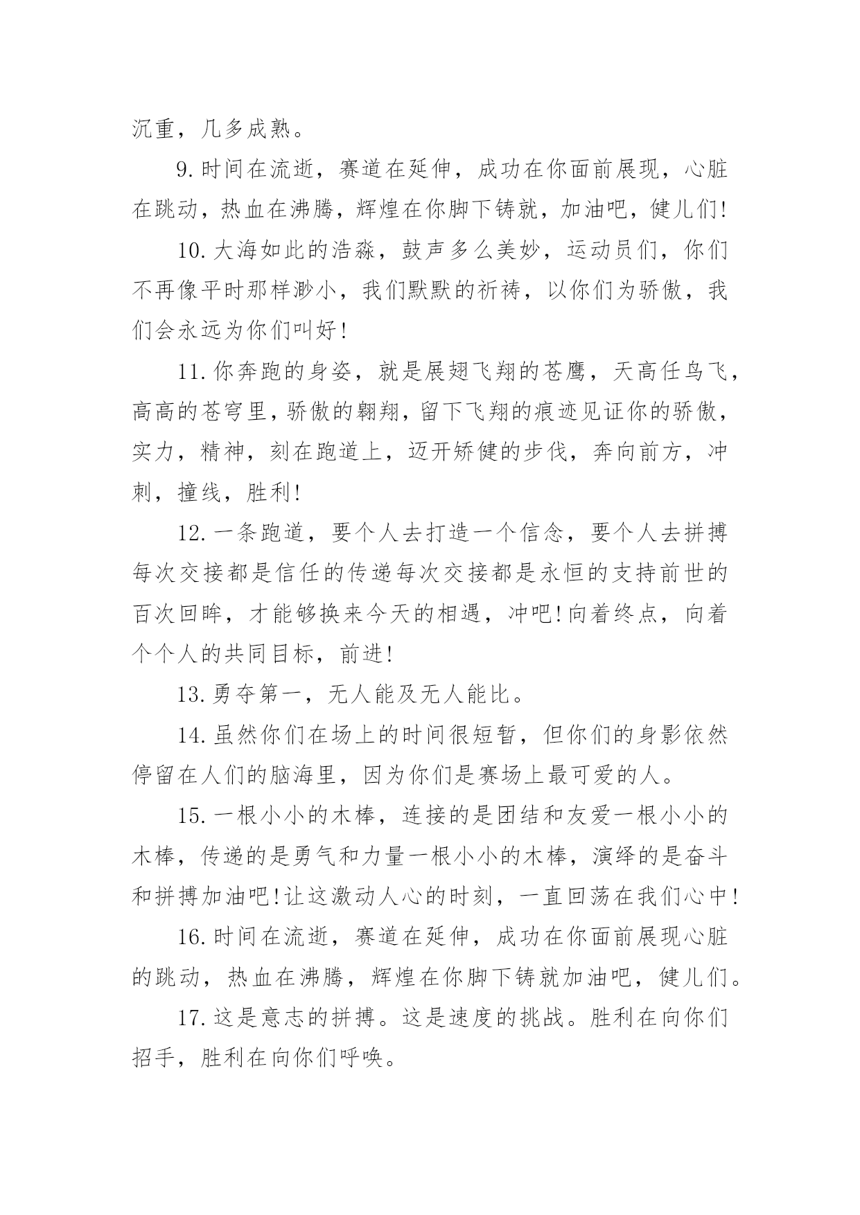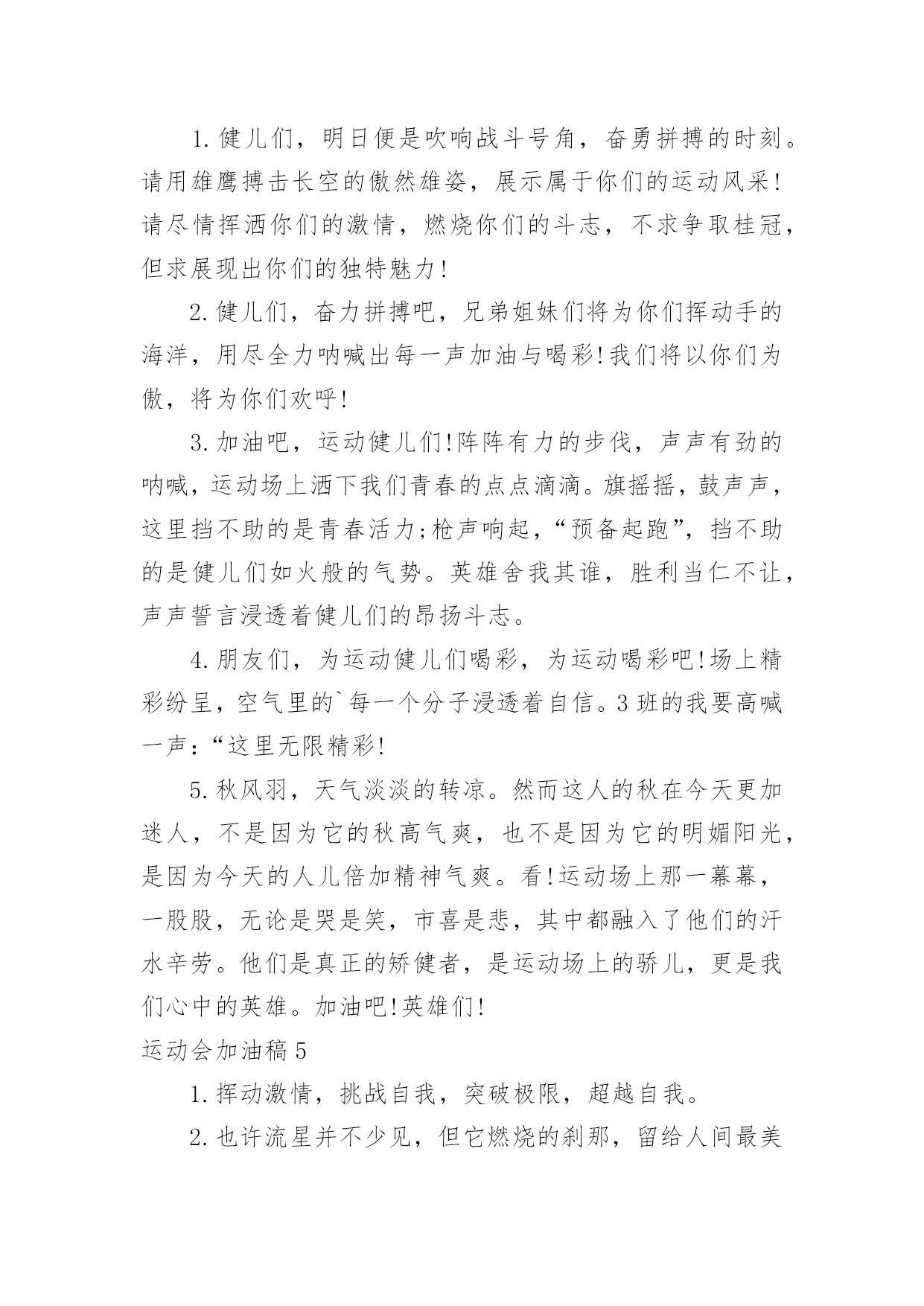 运动会加油稿运动会加油稿在社会发展不断提速的今天,很多地方都会使用到加油稿,加油稿有着正向的鼓动作用。那要怎么写好加油稿呢?以下是小编整理的运动会加油稿,欢迎大家分享。运动会加油稿1期望是种子,就该有绿色的自信;期望是种子,就该有金色的梦想。不要躺在封闭的暖房,怕什么秋日薄薄的风霜,既然已走上了运动场,心里就不要多想。跑道已洒满阳光,不要羞涩,不要紧张,听秋雁在空中为你歌唱,快去拾取片片金黄,充满信心,就有期望。力棒带着你摩擦出的火光,暖了我的`手。在急讯中,我们眼光在煞那间传递的是永恒,是团结,是友爱,你的吼震撼了你我他,牵动着你我他的心弦,让我们共同演绎这扣人心弦的激情飞荡。让我们共同为集体,我们大家的心,供一份热,点一盏温馨暖人的灯,4×100迸发的是无穷的力量,温暖的是我们的家,演绎的是团结友爱。运动会加油稿21、有多少次挥汗如雨,伤痛曾添满记忆,只因为始终相信,去拼搏才能胜利。总在鼓舞自己,要成功就得努力。热血在赛场沸腾,巨人在赛场升起。相信自己,你将赢得胜利,创造奇迹;相信自己,梦想在你手中,这是你的天地。当一切过去,你们将是第一。相信自己,你们将超越极限,超越自己!相信自己,加油吧,健儿们,相信你自己。2、让你们的身影在运动场上留下优美的风景线,让你们的雄心壮志在运动场上发挥的淋漓尽致。3、一根小小的`木棒,连接的是团结和友爱;一根小小的木棒,传递的是勇气和力量;一根小小的木棒,演绎的是奋斗和拼搏;加油吧!让这激动人心的时刻,一直回荡在我们心中!4、深深的呼吸,等待你的是艰难的1500米。相信胜利会属于你们。但在这征途上,需要你勇敢的心去面对。我们在为你加油,你是否听到了我们发自心中的呐喊?困难和胜利都在向你招手,去呀,快去呀,不要犹豫。快去击败困难、快去夺取胜利!相信你会送给我们一个汗水浸湿的微笑!5、生活中,我们每天都在尝试;我们走向成功,品味失败,走过心灵的阴雨晴空。运动员们,不要放弃尝试,无论失败与否,重要的是你勇于参与的精神,付出的背后是胜利;无论是否成功,我们永远赞美你,你们永远是我们的骄傲。运动会加油稿3踏着激昂的乐点,你们展示自信的'风采;迈着昂扬的步伐,你们彰显必胜的气概绿茵场是你们的舞台,红跑道是你们的主场你们用意气风发的笑容向世界宣告胜利的归属,昔有男儿佩吴钩,关山夜取五十州,今有吾辈显身手,赛场驰骋拔头筹。运动会加油稿41.健儿们,明日便是吹响战斗号角,奋勇拼搏的时刻。请用雄鹰搏击长空的傲然雄姿,展示属于你们的运动风采!请尽情挥洒你们的激情,燃烧你们的斗志,不求争取桂冠,但求展现出你们的独特魅力!2.健儿们,奋力拼搏吧,兄弟姐妹们将为你们挥动手的海洋,用尽全力呐喊出每一声加油与喝彩!我们将以你们为傲,将为你们欢呼!3.加油吧,运动健儿们!阵阵有力的步伐,声声有劲的呐喊,运动场上洒下我们青春的点点滴滴。旗摇摇,鼓声声,这里挡不助的是青春活力;枪声响起,“预备起跑”,挡不助的是健儿们如火般的气势。英雄舍我其谁,胜利当仁不让,声声誓言浸透着健儿们的昂扬斗志。4.朋友们,为运动健儿们喝彩,为运动喝彩吧!场上精彩纷呈,空气里的`每一个分子浸透着自信。3班的我要高喊一声:“这里无限精彩!5.秋风羽,天气淡淡的转凉。然而这人的秋在今天更加迷人,不是因为它的秋高气爽,也不是因为它的明媚阳光,是因为今天的人儿倍加精神气爽。看!运动场上那一幕幕,一股股,无论是哭是笑,市喜是悲,其中都融入了他们的汗水辛劳。他们是真正的矫健者,是运动场上的骄儿,更是我们心中的英雄。加油吧!英雄们!运动会加油稿51.挥动激情,挑战自我,突破极限,超越自我。2.也许流星并不少见,但它燃烧的刹那,留给人间最美丽的回忆!也许笑脸并不少见,但胜利的喜悦,总会留给世界精彩的一瞬!是的,那些曾经美妙的东西只有短短的一瞬间,但那却把最辉煌的一刻留给了人间。胜利,是每个人所追求的,胜利的喜悦,是胜利与重新开始的转折,胜利是新的开始!3.大海如此的浩淼,鼓声多么美妙,运动员们,你们不再像平时那样渺小,我们默默的祈祷,以你们为骄傲,我们会永远为你们叫好。4.生活中,我们每天都在尝试;我们走向成功,品味失败,走过心灵的阴雨晴空。运动员们,不要放弃尝试,无论失败与否,重要的是你勇于参与的精神,付出的背后是胜利;无论是否成功,我们永远赞美你,你们永远是我们的骄傲。5.真心祝愿机会是什么?是不可错过的刹那间。呐喊是什么?是为那刹那间的真心祝愿。加油加油你肯定听到了那一声声呐喊你肯定看到了那双双期待的眼睛你肯定感受到了那发自内心的祝愿。6.你们挥舞着充满力量的双臂看着实心球化成美丽的弧线我着实在心里佩服你们你们抛出了自己的水平。7.心中坚定的信念,脚下沉稳的步伐,你用行动告诉我们一个不变之理,没有走不完的路,没有过不了的山,成功正在终点冲着你高高的招手,用