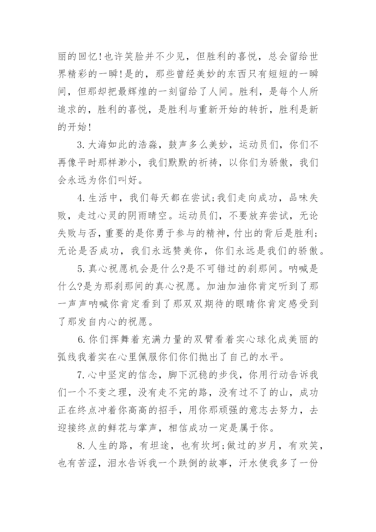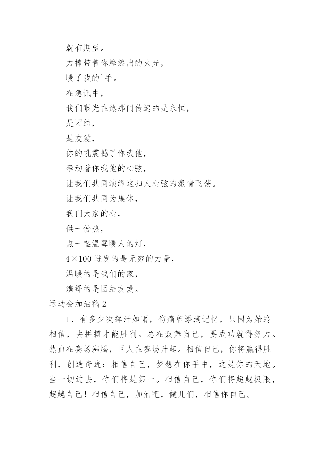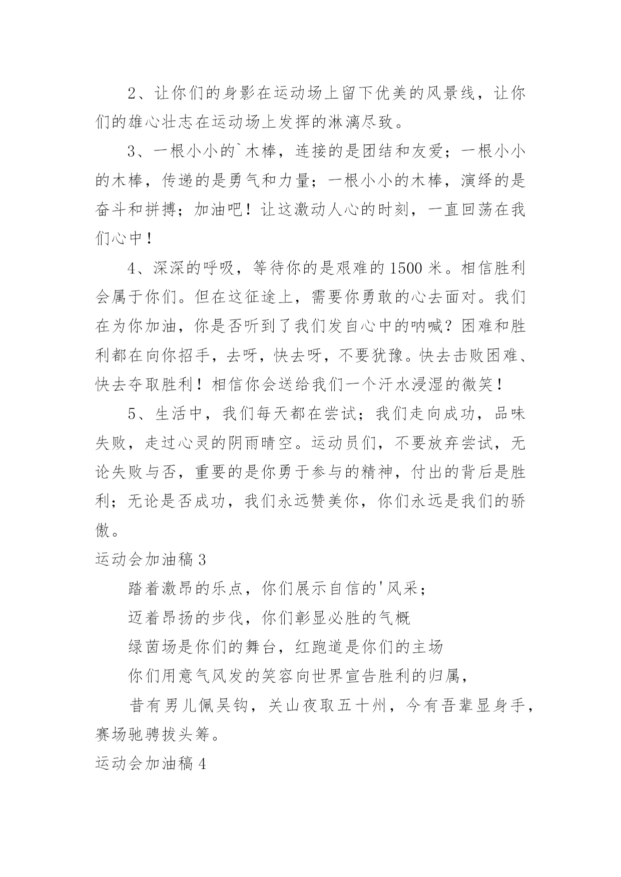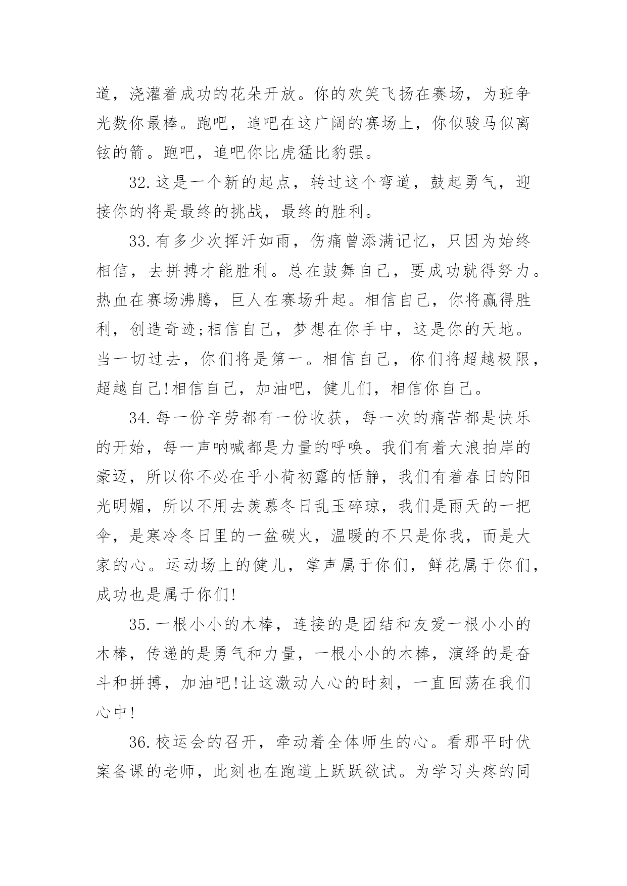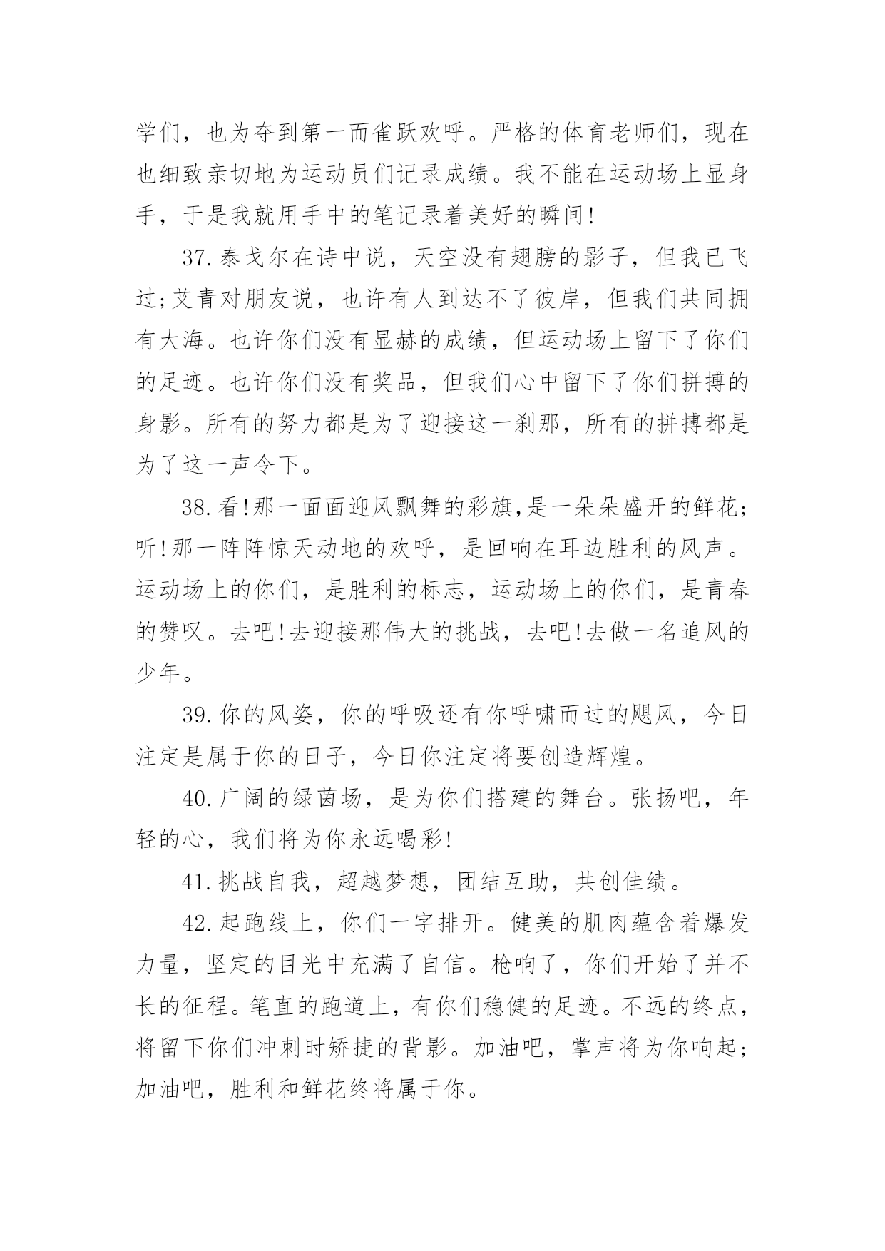 运动会加油稿运动会加油稿在社会发展不断提速的今天,很多地方都会使用到加油稿,加油稿有着正向的鼓动作用。那要怎么写好加油稿呢?以下是小编整理的运动会加油稿,欢迎大家分享。运动会加油稿1期望是种子,就该有绿色的自信;期望是种子,就该有金色的梦想。不要躺在封闭的暖房,怕什么秋日薄薄的风霜,既然已走上了运动场,心里就不要多想。跑道已洒满阳光,不要羞涩,不要紧张,听秋雁在空中为你歌唱,快去拾取片片金黄,充满信心,就有期望。力棒带着你摩擦出的火光,暖了我的`手。在急讯中,我们眼光在煞那间传递的是永恒,是团结,是友爱,你的吼震撼了你我他,牵动着你我他的心弦,让我们共同演绎这扣人心弦的激情飞荡。让我们共同为集体,我们大家的心,供一份热,点一盏温馨暖人的灯,4×100迸发的是无穷的力量,温暖的是我们的家,演绎的是团结友爱。运动会加油稿21、有多少次挥汗如雨,伤痛曾添满记忆,只因为始终相信,去拼搏才能胜利。总在鼓舞自己,要成功就得努力。热血在赛场沸腾,巨人在赛场升起。相信自己,你将赢得胜利,创造奇迹;相信自己,梦想在你手中,这是你的天地。当一切过去,你们将是第一。相信自己,你们将超越极限,超越自己!相信自己,加油吧,健儿们,相信你自己。2、让你们的身影在运动场上留下优美的风景线,让你们的雄心壮志在运动场上发挥的淋漓尽致。3、一根小小的`木棒,连接的是团结和友爱;一根小小的木棒,传递的是勇气和力量;一根小小的木棒,演绎的是奋斗和拼搏;加油吧!让这激动人心的时刻,一直回荡在我们心中!4、深深的呼吸,等待你的是艰难的1500米。相信胜利会属于你们。但在这征途上,需要你勇敢的心去面对。我们在为你加油,你是否听到了我们发自心中的呐喊?困难和胜利都在向你招手,去呀,快去呀,不要犹豫。快去击败困难、快去夺取胜利!相信你会送给我们一个汗水浸湿的微笑!5、生活中,我们每天都在尝试;我们走向成功,品味失败,走过心灵的阴雨晴空。运动员们,不要放弃尝试,无论失败与否,重要的是你勇于参与的精神,付出的背后是胜利;无论是否成功,我们永远赞美你,你们永远是我们的骄傲。运动会加油稿3踏着激昂的乐点,你们展示自信的'风采;迈着昂扬的步伐,你们彰显必胜的气概绿茵场是你们的舞台,红跑道是你们的主场你们用意气风发的笑容向世界宣告胜利的归属,昔有男儿佩吴钩,关山夜取五十州,今有吾辈显身手,赛场驰骋拔头筹。运动会加油稿41.健儿们,明日便是吹响战斗号角,奋勇拼搏的时刻。请用雄鹰搏击长空的傲然雄姿,展示属于你们的运动风采!请尽情挥洒你们的激情,燃烧你们的斗志,不求争取桂冠,但求展现出你们的独特魅力!2.健儿们,奋力拼搏吧,兄弟姐妹们将为你们挥动手的海洋,用尽全力呐喊出每一声加油与喝彩!我们将以你们为傲,将为你们欢呼!3.加油吧,运动健儿们!阵阵有力的步伐,声声有劲的呐喊,运动场上洒下我们青春的点点滴滴。旗摇摇,鼓声声,这里挡不助的是青春活力;枪声响起,“预备起跑”,挡不助的是健儿们如火般的气势。英雄舍我其谁,胜利当仁不让,声声誓言浸透着健儿们的昂扬斗志。4.朋友们,为运动健儿们喝彩,为运动喝彩吧!场上精彩纷呈,空气里的`每一个分子浸透着自信。3班的我要高喊一声:“这里无限精彩!5.秋风羽,天气淡淡的转凉。然而这人的秋在今天更加迷人,不是因为它的秋高气爽,也不是因为它的明媚阳光,是因为今天的人儿倍加精神气爽。看!运动场上那一幕幕,一股股,无论是哭是笑,市喜是悲,其中都融入了他们的汗水辛劳。他们是真正的矫健者,是运动场上的骄儿,更是我们心中的英雄。加油吧!英雄们!运动会加油稿51.挥动激情,挑战自我,突破极限,超越自我。2.也许流星并不少见,但它燃烧的刹那,留给人间最美丽的回忆!也许笑脸并不少见,但胜利的喜悦,总会留给世界精彩的一瞬!是的,那些曾经美妙的东西只有短短的一瞬间,但那却把最辉煌的一刻留给了人间。胜利,是每个人所追求的,胜利的喜悦,是胜利与重新开始的转折,胜利是新的开始!3.大海如此的浩淼,鼓声多么美妙,运动员们,你们不再像平时那样渺小,我们默默的祈祷,以你们为骄傲,我们会永远为你们叫好。4.生活中,我们每天都在尝试;我们走向成功,品味失败,走过心灵的阴雨晴空。运动员们,不要放弃尝试,无论失败与否,重要的是你勇于参与的精神,付出的背后是胜利;无论是否成功,我们永远赞美你,你们永远是我们的骄傲。5.真心祝愿机会是什么?是不可错过的刹那间。呐喊是什么?是为那刹那间的真心祝愿。加油加油你肯定听到了那一声声呐喊你肯定看到了那双双期待的眼睛你肯定感受到了那发自内心的祝愿。6.你们挥舞着充满力量的双臂看着实心球化成美丽的弧线我着实在心里佩服你们你们抛出了自己的水平。7.心中坚定的信念,脚下沉稳的步伐,你用行动告诉我们一个不变之理,没有走不完的路,没有过不了的山,成功正在终点冲着你高高的招手,用