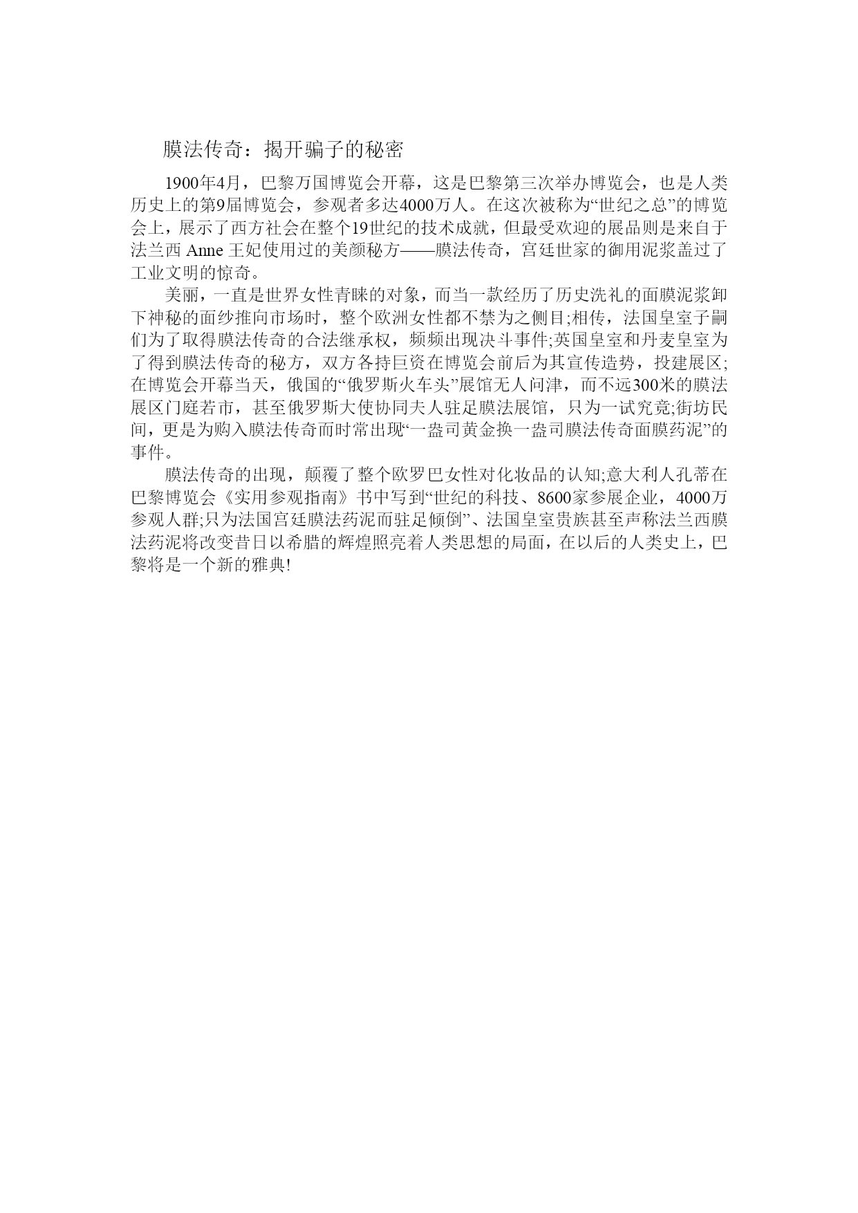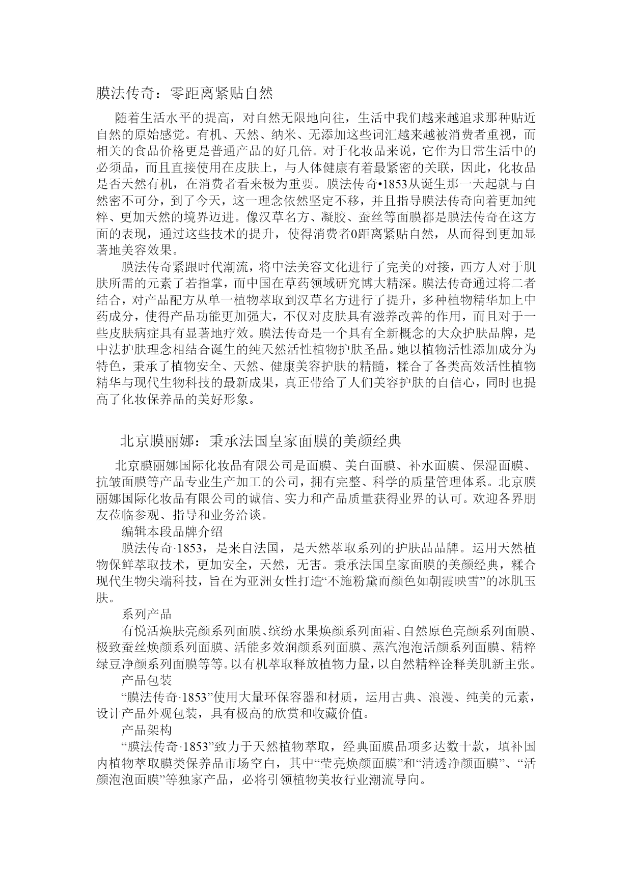 膜法传奇:零距离紧贴自然随着生活水平的提高,对自然无限地向往,生活中我们越来越追求那种贴近自然的原始感觉。有机、天然、纳米、无添加这些词汇越来越被消费者重视,而相关的食品价格更是普通产品的好几倍。对于化妆品来说,它作为日常生活中的必须品,而且直接使用在皮肤上,与人体健康有着最紧密的关联,因此,化妆品是否天然有机,在消费者看来极为重要。膜法传奇•1853从诞生那一天起就与自然密不可分,到了今天,这一理念依然坚定不移,并且指导膜法传奇向着更加纯粹、更加天然的境界迈进。像汉草名方、凝胶、蚕丝等面膜都是膜法传奇在这方面的表现,通过这些技术的提升,使得消费者0距离紧贴自然,从而得到更加显著地美容效果。膜法传奇紧跟时代潮流,将中法美容文化进行了完美的对接,西方人对于肌肤所需的元素了若指掌,而中国在草药领域研究博大精深。膜法传奇通过将二者结合,对产品配方从单一植物萃取到汉草名方进行了提升,多种植物精华加上中药成分,使得产品功能更加强大,不仅对皮肤具有滋养改善的作用,而且对于一些皮肤病症具有显著地疗效。膜法传奇是一个具有全新概念的大众护肤品牌,是中法护肤理念相结合诞生的纯天然活性植物护肤圣品。她以植物活性添加成分为特色,秉承了植物安全、天然、健康美容护肤的精髓,糅合了各类高效活性植物精华与现代生物科技的最新成果,真正带给了人们美容护肤的自信心,同时也提高了化妆保养品的美好形象。北京膜丽娜:秉承法国皇家面膜的美颜经典北京膜丽娜国际化妆品有限公司是面膜、美白面膜、补水面膜、保湿面膜、抗皱面膜等产品专业生产加工的公司,拥有完整、科学的质量管理体系。北京膜丽娜国际化妆品有限公司的诚信、实力和产品质量获得业界的认可。欢迎各界朋友莅临参观、指导和业务洽谈。编辑本段品牌介绍膜法传奇·1853,是来自法国,是天然萃取系列的护肤品品牌。运用天然植物保鲜萃取技术,更加安全,天然,无害。秉承法国皇家面膜的美颜经典,糅合现代生物尖端科技,旨在为亚洲女性打造“不施粉黛而颜色如朝霞映雪”的冰肌玉肤。系列产品有悦活焕肤亮颜系列面膜、缤纷水果焕颜系列面霜、自然原色亮颜系列面膜、极致蚕丝焕颜系列面膜、活能多效润颜系列面膜、蒸汽泡泡活颜系列面膜、精粹绿豆净颜系列面膜等等。以有机萃取释放植物力量,以自然精粹诠释美肌新主张。产品包装“膜法传奇·1853”使用大量环保容器和材质,运用古典、浪漫、纯美的元素,设计产品外观包装,具有极高的欣赏和收藏价值。产品架构“膜法传奇·1853”致力于天然植物萃取,经典面膜品项多达数十款,填补国内植物萃取膜类保养品市场空白,其中“莹亮焕颜面膜”和“清透净颜面膜”、“活颜泡泡面膜”等独家产品,必将引领植物美妆行业潮流导向。膜法传奇:揭开骗子的秘密1900年4月,巴黎万国博览会开幕,这是巴黎第三次举办博览会,也是人类历史上的第9届博览会,参观者多达4000万人。在这次被称为“世纪之总”的博览会上,展示了西方社会在整个19世纪的技术成就,但最受欢迎的展品则是来自于法兰西Anne王妃使用过的美颜秘方——膜法传奇,宫廷世家的御用泥浆盖过了工业文明的惊奇。美丽,一直是世界女性青睐的对象,而当一款经历了历史洗礼的面膜泥浆卸下神秘的面纱推向市场时,整个欧洲女性都不禁为之侧目;相传,法国皇室子嗣们为了取得膜法传奇的合法继承权,频频出现决斗事件;英国皇室和丹麦皇室为了得到膜法传奇的秘方,双方各持巨资在博览会前后为其宣传造势,投建展区;在博览会开幕当天,俄国的“俄罗斯火车头”展馆无人问津,而不远300米的膜法展区门庭若市,甚至俄罗斯大使协同夫人驻足膜法展馆,只为一试究竟;街坊民间,更是为购入膜法传奇而时常出现“一盎司黄金换一盎司膜法传奇面膜药泥”的事件。膜法传奇的出现,颠覆了整个欧罗巴女性对化妆品的认知;意大利人孔蒂在巴黎博览会《实用参观指南》书中写到“世纪的科技、8600家参展企业,4000万参观人群;只为法国宫廷膜法药泥而驻足倾倒”、法国皇室贵族甚至声称法兰西膜法药泥将改变昔日以希腊的辉煌照亮着人类思想的局面,在以后的人类史上,巴黎将是一个新的雅典!