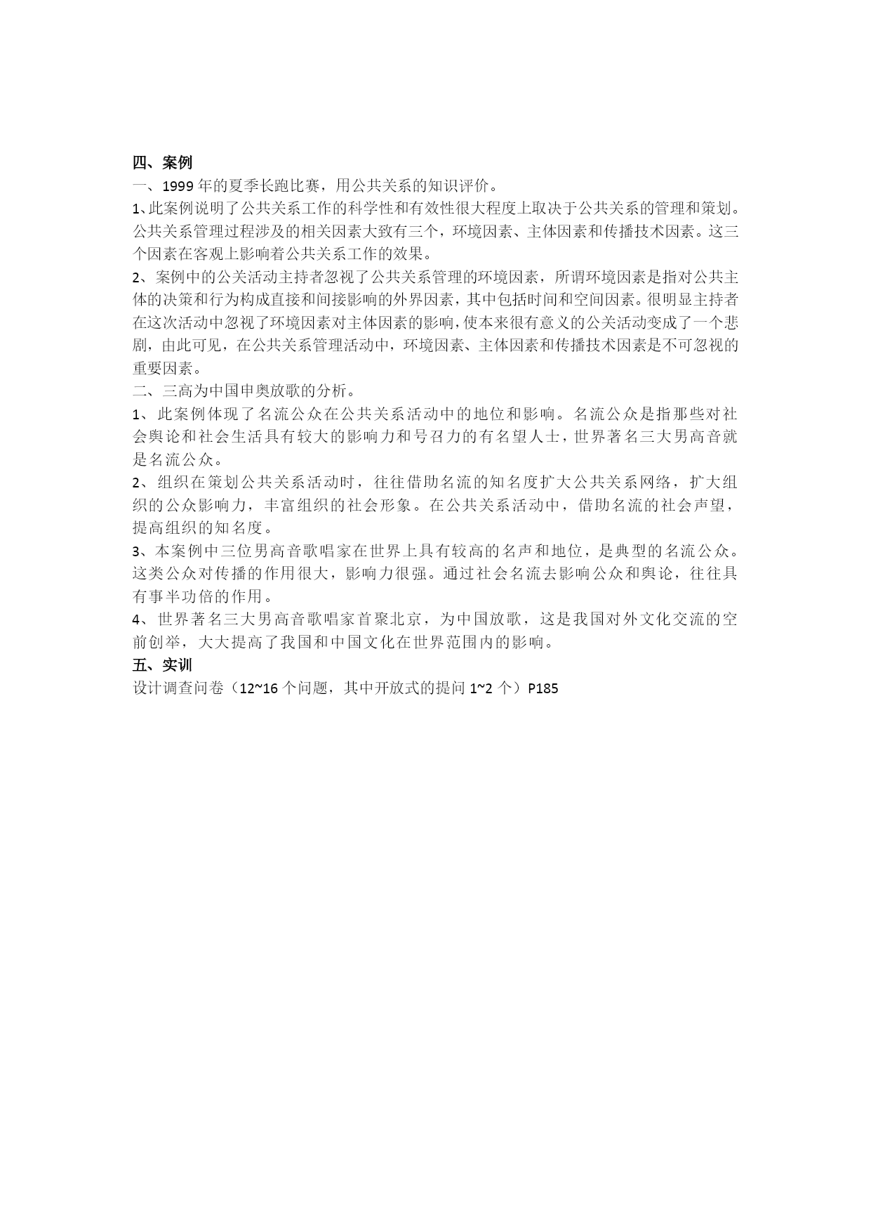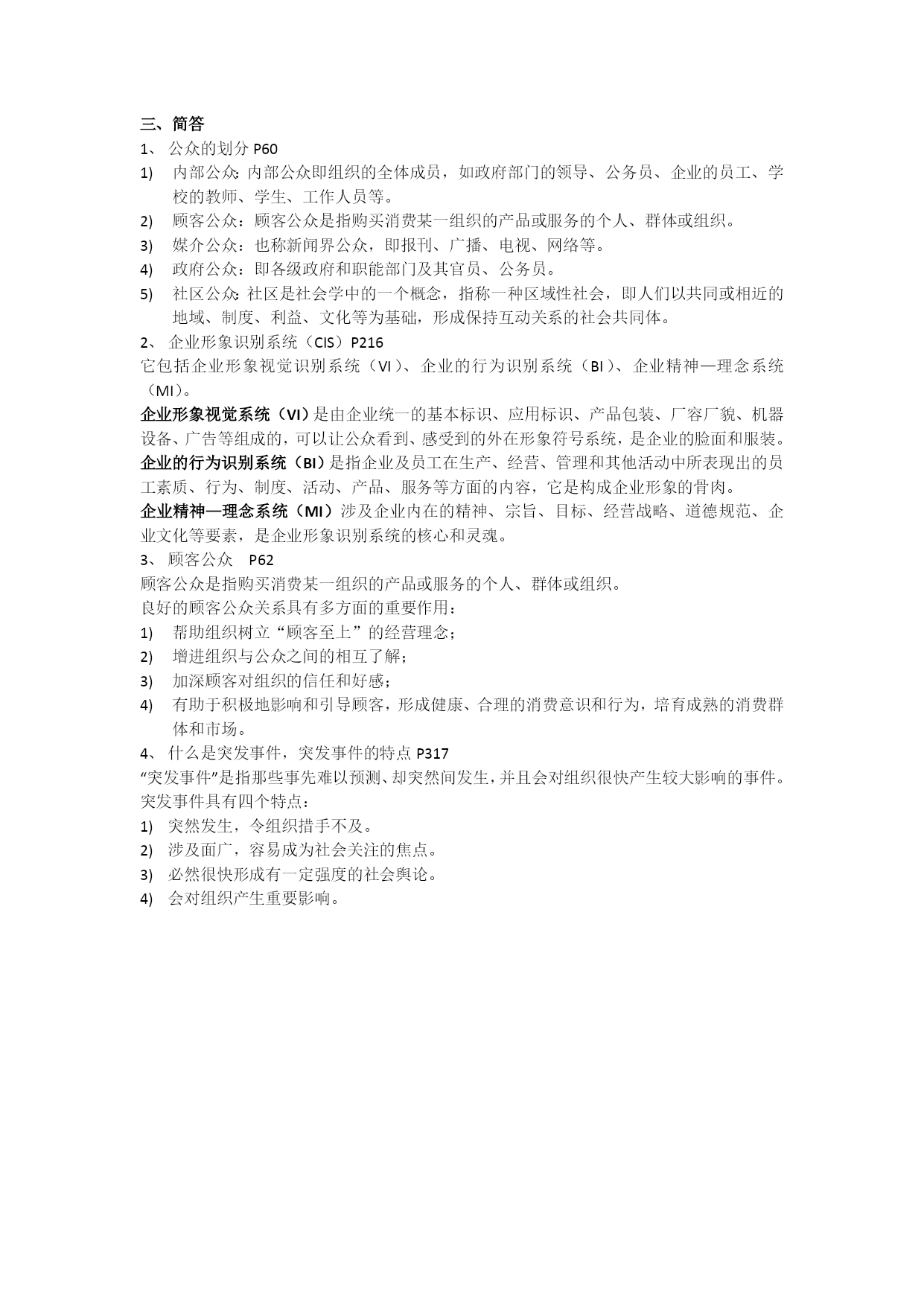 公共关系学考试重点填空企业文化的核心:价值观公共关系之父:艾维·李卡特利普、森特、布鲁姆:《公共关系教程》P81《有效公共关系》作者:卡特利普、森特公关人员交往的距离:122~365CMP129公关人员如何做到把话说对:P123eq\o\ac(○,1)、称谓eq\o\ac(○,2)、语法eq\o\ac(○,3)、逻辑eq\o\ac(○,4)、正确丰富的常识和相关专业知识公共关系意识P85eq\o\ac(○,1)、感恩意识eq\o\ac(○,2)、责任意识eq\o\ac(○,3)、服务意识eq\o\ac(○,4)、沟通意识eq\o\ac(○,5)、形象意识eq\o\ac(○,6)、诚实意识。8、传播的要素P110发送者、信息、媒介、接受者9、公共人员必须具备的四种能力:P351eq\o\ac(○,1)、分析、策划能力;eq\o\ac(○,2)、组织、管理能力;eq\o\ac(○,3)、交际、传播和写作能力;eq\o\ac(○,4)、运用计算机和网络的能力。10、组织与公众的关系是主体与主体之间以利益为纽带、以信息为媒介而形成的联系,即利益主体主体。P43信息11、公共关系工作在本质上属于组织传播。P11312、公共关系工作的特征P106eq\o\ac(○,1)、以组织的自我完善为前提eq\o\ac(○,2)、以真实、真诚为原则eq\o\ac(○,3)、以协调利益为基础eq\o\ac(○,4)、以信息沟通为主要手段eq\o\ac(○,5)、以组织的和谐发展为目的13、公共关系工作者的职业道德要求:P350eq\o\ac(○,1)、公正、负责;eq\o\ac(○,2)、诚实、客观;eq\o\ac(○,3)、注重职业形象和信誉14、公共关系的传播模式P113宣传模式;公共信息模式;双向不平衡模式;双向平衡模式15、传播的主要方式P111自我传播;人际传播;群体传播;大众传播;组织传播16、公关调研常用的方法P183访谈法;观察法;问卷法;文献法;网络调查法17、抽样调查P182简单随机抽样;分类抽样;等距抽样;多段抽样;非随机抽样二、名词解释1、组织传播P113组织传播是以特定的组织为主体,在组织内部或在受组织影响的环境范围内进行的传播,承担着组织内部、组织与其外部环境之间的信息交流和沟通任务。2、人际传播P112人际传播是指个人之间进行的“一对一”直接的信息交流、沟通方式,是形成人际交往、人际关系的主要手段。3、公共关系P83(居延安、纪华强)4、组织形象P177三、简答公众的划分P60内部公众:内部公众即组织的全体成员,如政府部门的领导、公务员、企业的员工、学校的教师、学生、工作人员等。顾客公众:顾客公众是指购买消费某一组织的产品或服务的个人、群体或组织。媒介公众:也称新闻界公众,即报刊、广播、电视、网络等。政府公众:即各级政府和职能部门及其官员、公务员。社区公众:社区是社会学中的一个概念,指称一种区域性社会,即人们以共同或相近的地域、制度、利益、文化等为基础,形成保持互动关系的社会共同体。企业形象识别系统(CIS)P216它包括企业形象视觉识别系统(VI)、企业的行为识别系统(BI)、企业精神—理念系统(MI)。企业形象视觉系统(VI)是由企业统一的基本标识、应用标识、产品包装、厂容厂貌、机器设备、广告等组成的,可以让公众看到、感受到的外在形象符号系统,是企业的脸面和服装。企业的行为识别系统(BI)是指企业及员工在生产、经营、管理和其他活动中所表现出的员工素质、行为、制度、活动、产品、服务等方面的内容,它是构成企业形象的骨肉。企业精神—理念系统(MI)涉及企业内在的精神、宗旨、目标、经营战略、道德规范、企业文化等要素,是企业形象识别系统的核心和灵魂。顾客公众P62顾客公众是指购买消费某一组织的产品或服务的个人、群体或组织。良好的顾客公众关系具有多方面的重要作用:帮助组织树立“顾客至上”的经营理念;增进组织与公众之间的相互了解;加深顾客对组织的信任和好感;有助于积极地影响和引导顾客,形成健康、合理的消费意识和行为,培育成熟的消费群体和市场。什么是突发事件,突发事件的特点P317“突发事件”是指那些事先难以预测、却突然间发生,并且会对组织很快产生较大影响的事件。突发事件具有四个特点:突然发生,令组织措手不及。涉及面广,容易成为社会关注的焦点。必然很快形成有一定强度的社会舆论。会对组织产生重要影响。四、案例一、1999年的夏季长跑比赛,用公共关系的知识
