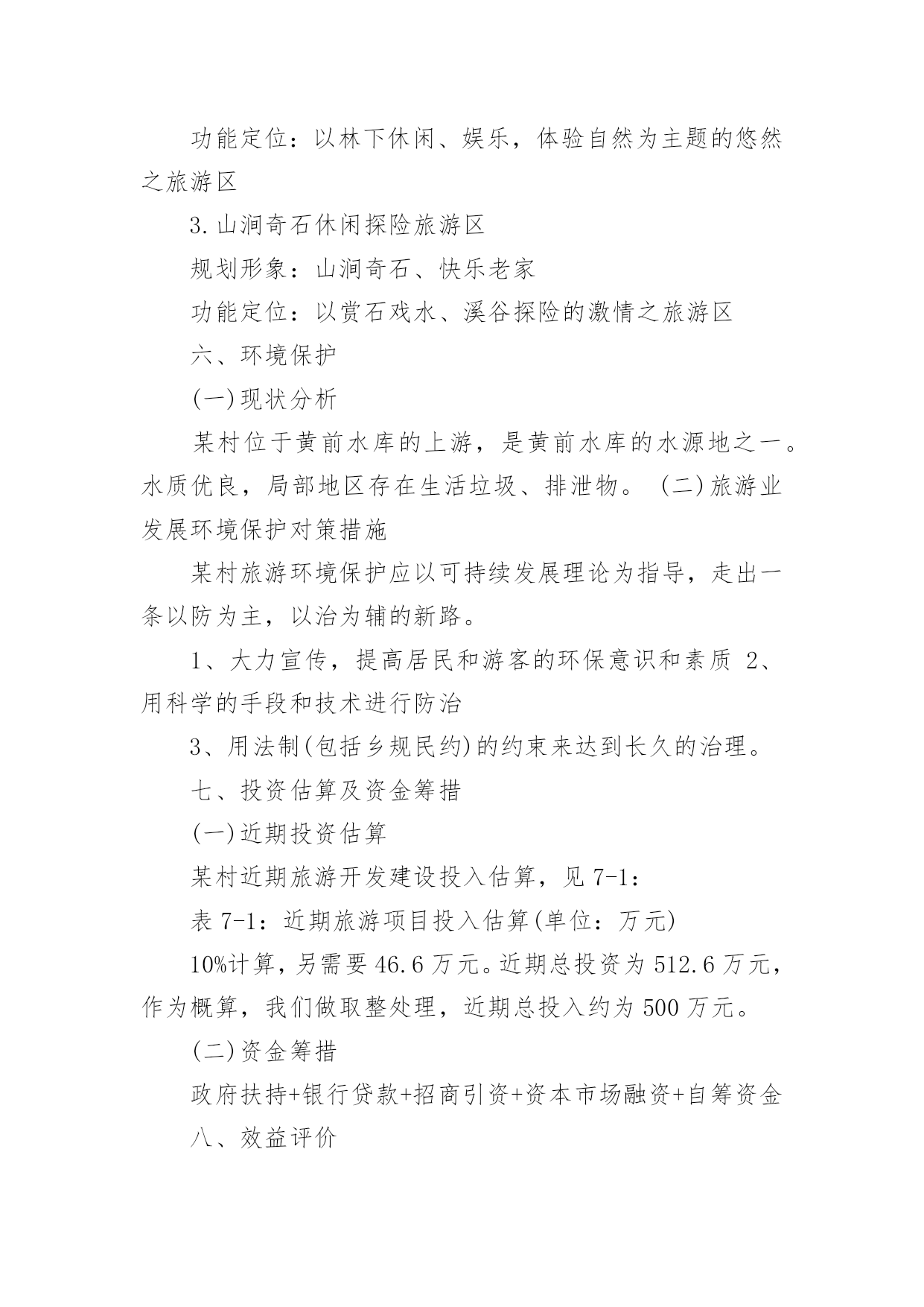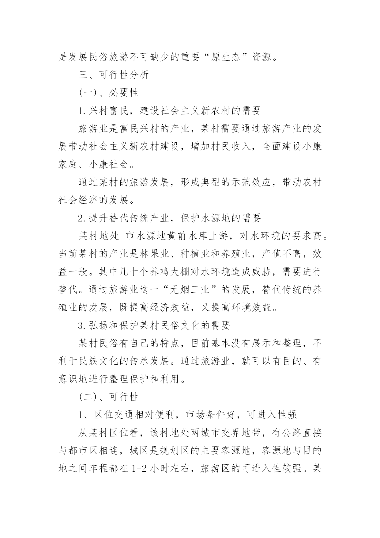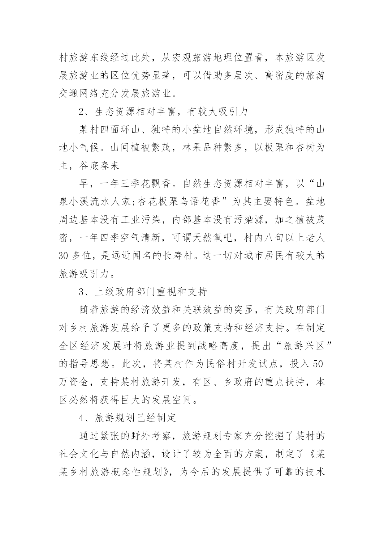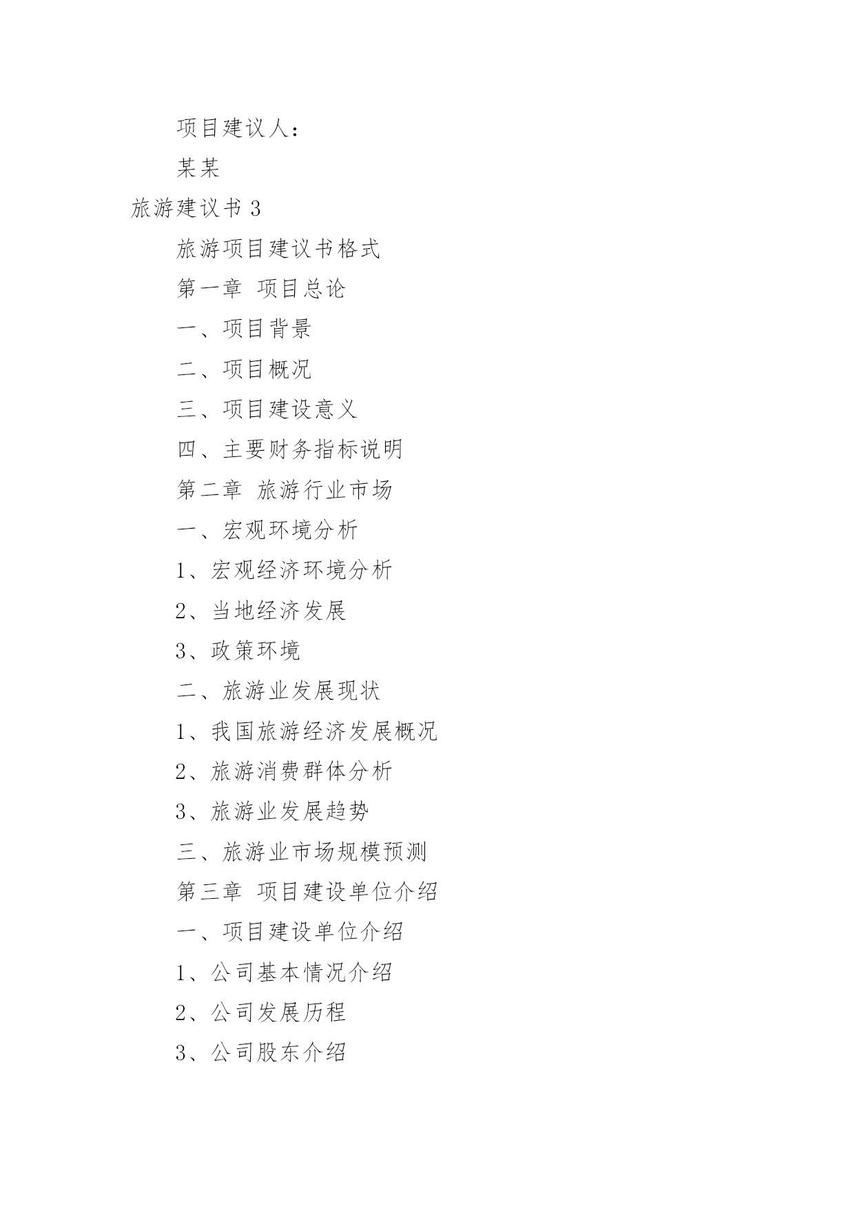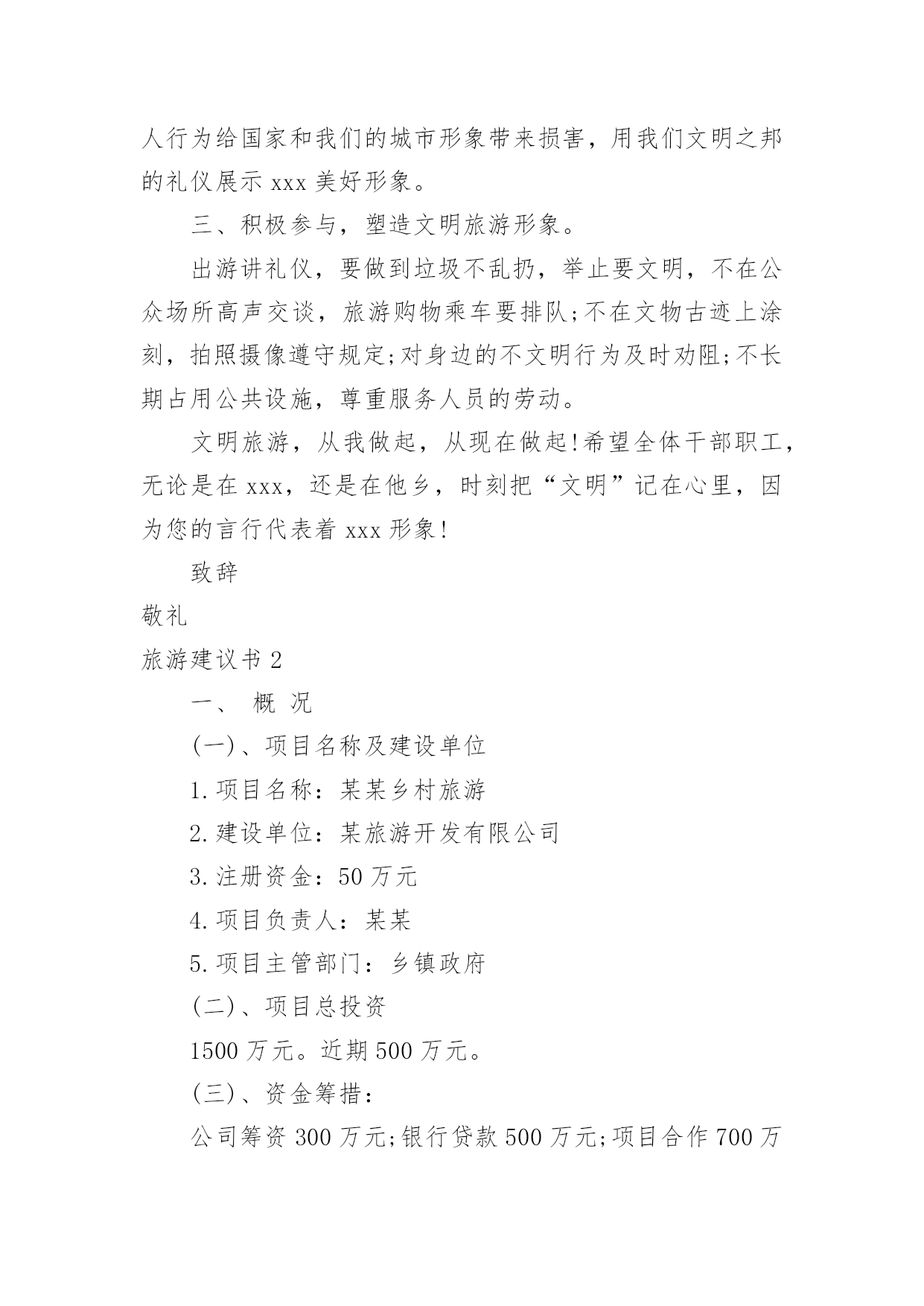 旅游建议书旅游建议书随着社会一步步向前发展,我们都跟建议书有着直接或间接的联系,建议书是就某项工作提出某种建议时使用的一种常用书信,也叫意见书。如何写一份恰当的建议书呢?以下是小编为大家收集的旅游建议书,欢迎阅读,希望大家能够喜欢。旅游建议书1xxx全体干部职工:xxx市正在创建全国文明城市,倡导文明旅游,是提升我市创建全国文明城市水平的重大举措。为此,我院向全体干部职工发出建议:一、加强学习,提高文明旅游素质。认真学习公民基本道德规范,学习文明礼仪,严格遵守《中国公民国内旅游行为公约》,切实掌握《中国公民出境旅游行动指南》;要识别不文明行为的各种表现,明辨旅游活动中的是非、美丑,不断提升思想道德水平,在旅游活动中,“多看美景,不刻美名”。二、入乡随俗,尊重各地风俗习惯。尊重其他国家,其他地区,其他民族,其他宗教的文化习俗,避免因文化差异而导致的“不文明”行为,不要让个人行为给国家和我们的城市形象带来损害,用我们文明之邦的礼仪展示xxx美好形象。三、积极参与,塑造文明旅游形象。出游讲礼仪,要做到垃圾不乱扔,举止要文明,不在公众场所高声交谈,旅游购物乘车要排队;不在文物古迹上涂刻,拍照摄像遵守规定;对身边的不文明行为及时劝阻;不长期占用公共设施,尊重服务人员的劳动。文明旅游,从我做起,从现在做起!希望全体干部职工,无论是在xxx,还是在他乡,时刻把“文明”记在心里,因为您的言行代表着xxx形象!致辞敬礼旅游建议书2一、概况(一)、项目名称及建设单位1.项目名称:某某乡村旅游2.建设单位:某旅游开发有限公司3.注册资金:50万元4.项目负责人:某某5.项目主管部门:乡镇政府(二)、项目总投资1500万元。近期500万元。(三)、资金筹措:公司筹资300万元;银行贷款500万元;项目合作700万元。(四)、建设期限三至六年(五)、编制单位某某规划设计院二、某村基本情况某村位于某乡的最南端,北临下港乡村,东接镇、西靠镇。距市中心约35公里。全村总面积为2200亩,人口2226人,8个生产组,13个自然村,438户人家。民风纯朴,社会治安很好。主要经济来源为种植业、养殖业和外出务工。该村人均收入3400多元,在全乡处于中上游水平。主要产业是林果业,占总产值的70%左右,其中板栗占50%,杏占20%。养蚕户70多户,已初步形成规模产业。目前,村子引山泉入户,家家户户用上了自来水。某村空气洁净、负离子含量高、食品和饮用水无污染,是人们理想的居住地。该村共有人口976人,其中80岁以上的老人30多位,90多岁的老人6位,是有名的长寿村。本区域小梯田众多,田内种植粮食作物,田边种植杏、花椒、板栗、核桃等经济林木。农林间作,很有特点。自给自足的田园经济是本区域最典型特色。家家都有小菜园,且以分布在房前屋后最多。这里的蔬菜不打药,不施化肥,是名副其实的绿色蔬菜。石磨、碾子分布较多,是村民加工食物的主要工具。也是发展民俗旅游不可缺少的重要“原生态”资源。三、可行性分析(一)、必要性1.兴村富民,建设社会主义新农村的需要旅游业是富民兴村的产业,某村需要通过旅游产业的发展带动社会主义新农村建设,增加村民收入,全面建设小康家庭、小康社会。通过某村的旅游发展,形成典型的示范效应,带动农村社会经济的发展。2.提升替代传统产业,保护水源地的需要某村地处市水源地黄前水库上游,对水环境的要求高。当前某村的产业是林果业、种植业和养殖业,产值不高,效益一般。其中几十个养鸡大棚对水环境造成威胁,需要进行替代。通过旅游业这一“无烟工业”的发展,替代传统的养殖业的发展,既提高经济效益,又提高环境效益。3.弘扬和保护某村民俗文化的需要某村民俗有自己的特点,目前基本没有展示和整理,不利于民族文化的传承发展。通过旅游业,就可以有目的、有意识地进行整理保护和利用。(二)、可行性1、区位交通相对便利,市场条件好,可进入性强从某村区位看,该村地处两城市交界地带,有公路直接与都市区相连,城区是规划区的主要客源地,客源地与目的地之间车程都在1-2小时左右,旅游区的可进入性较强。某村旅游东线经过此处,从宏观旅游地理位置看,本旅游区发展旅游业的区位优势显著,可以借助多层次、高密度的旅游交通网络充分发展旅游业。2、生态资源相对丰富,有较大吸引力某村四面环山、独特的小盆地自然环境,形成独特的山地小气候。山间植被繁茂,林果品种繁多,以板栗和杏树为主,谷底春来早,一年三季花飘香。自然生态资源相对丰富,以“山泉小溪流水人家;杏花板栗鸟语花香”为其主要特色。盆地周边基本没有工业污染,内部基本没有污染源,加之植被茂密,一年四季空气清新,可谓天然氧吧,村内八旬以上老人30多位,是远近闻名的长寿村。这一切对城市居民有较大的旅游吸引力。3、上级政府部门重视和支持随着旅游的经济效益和关联效益的突显,有关政府部门对